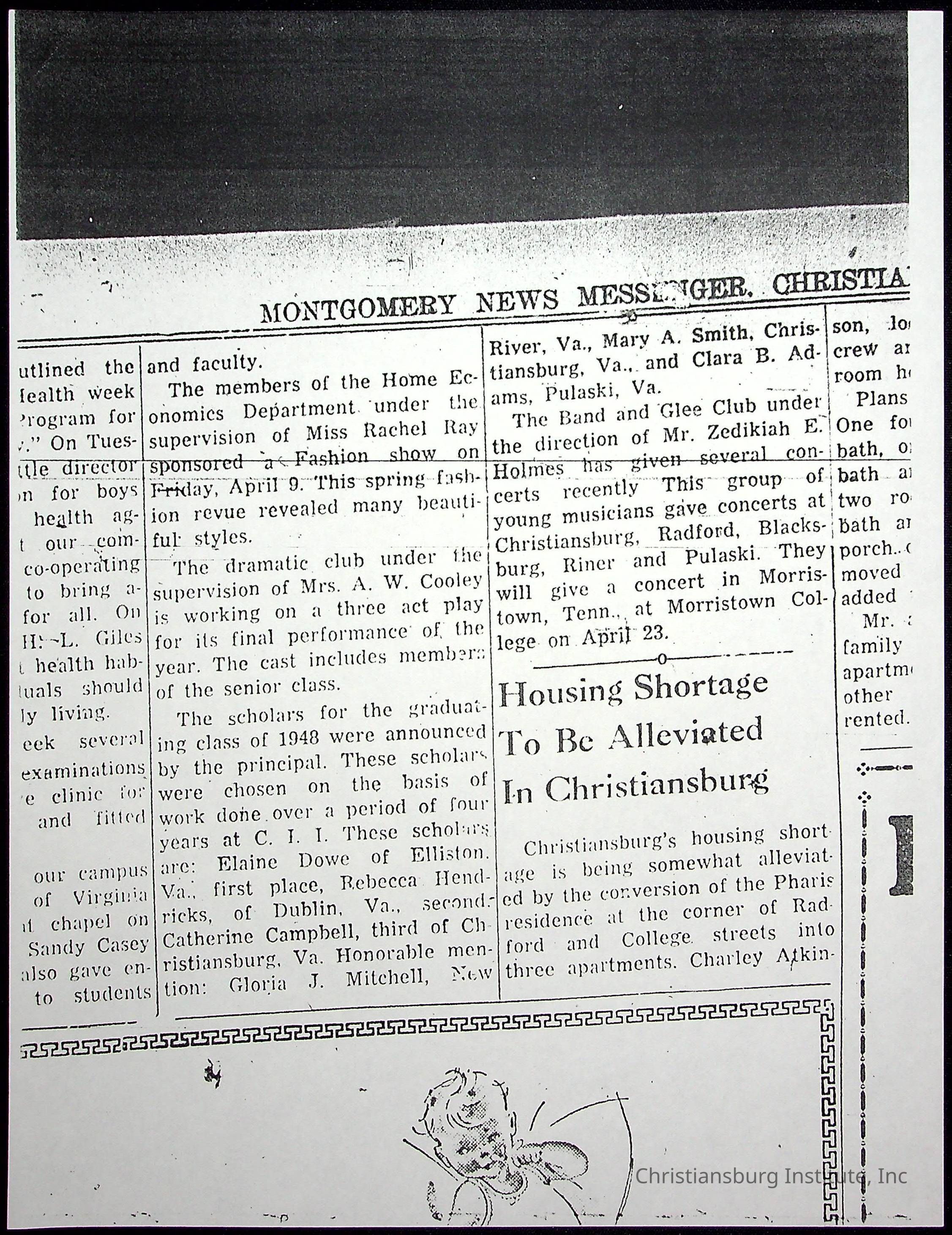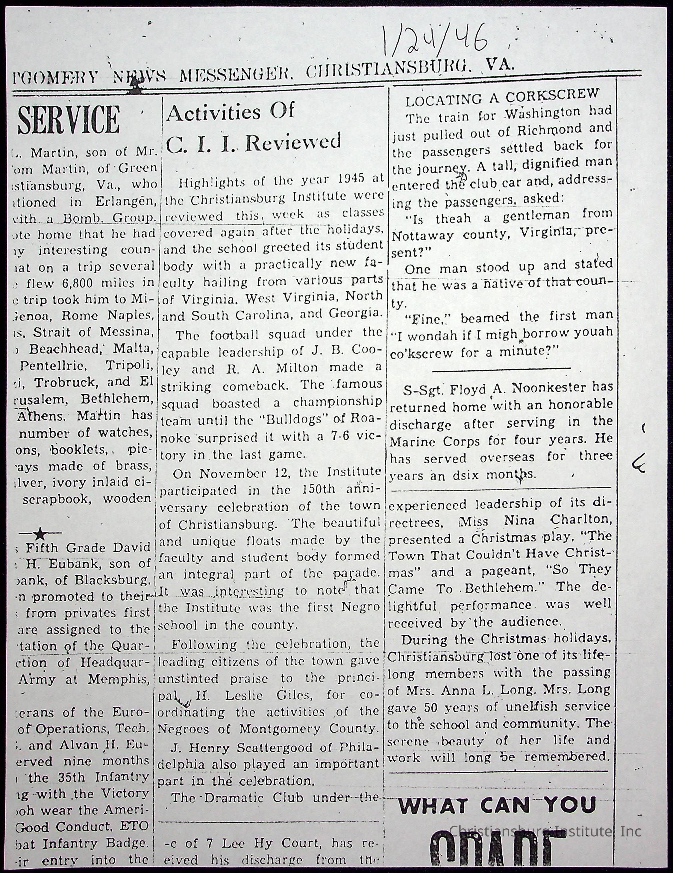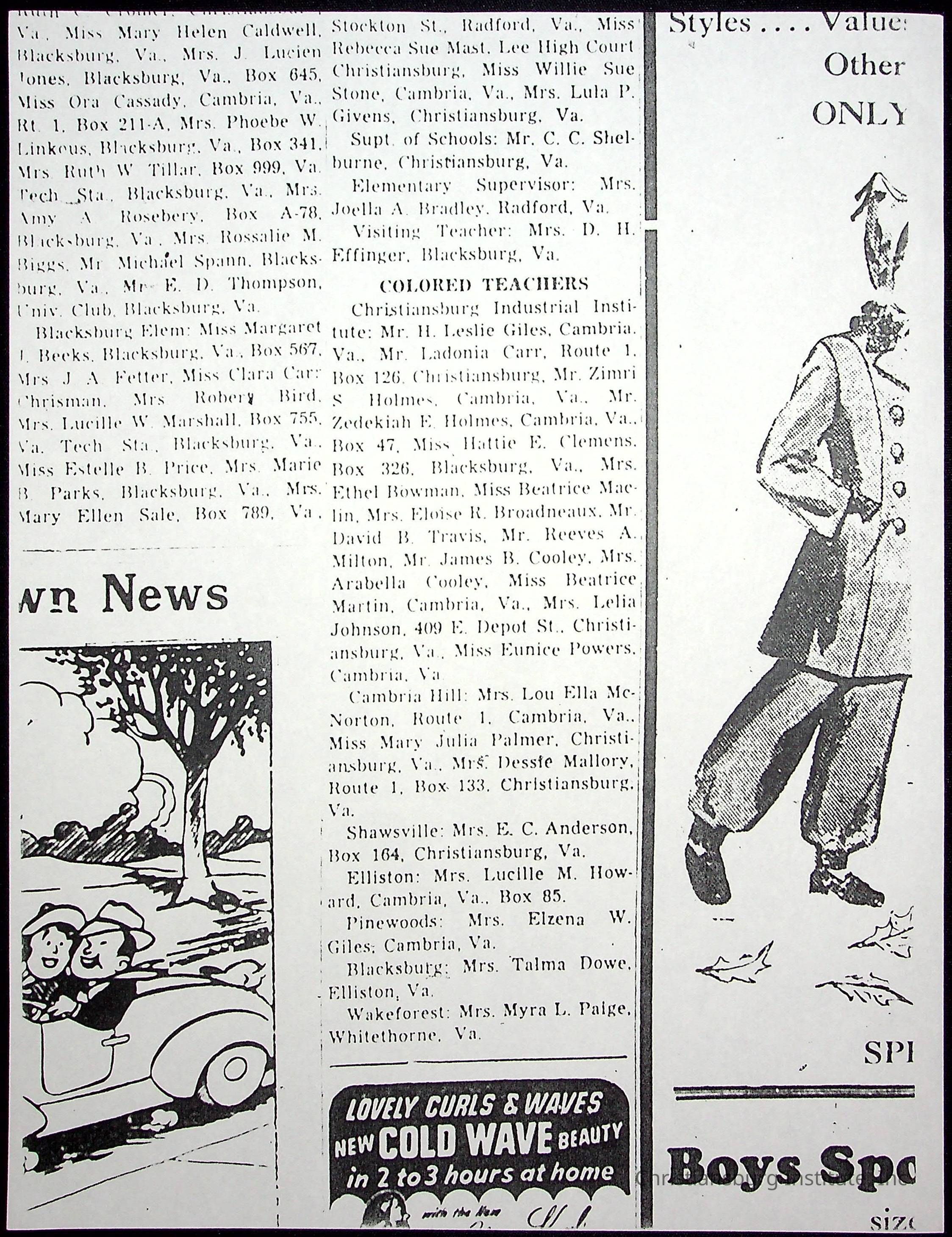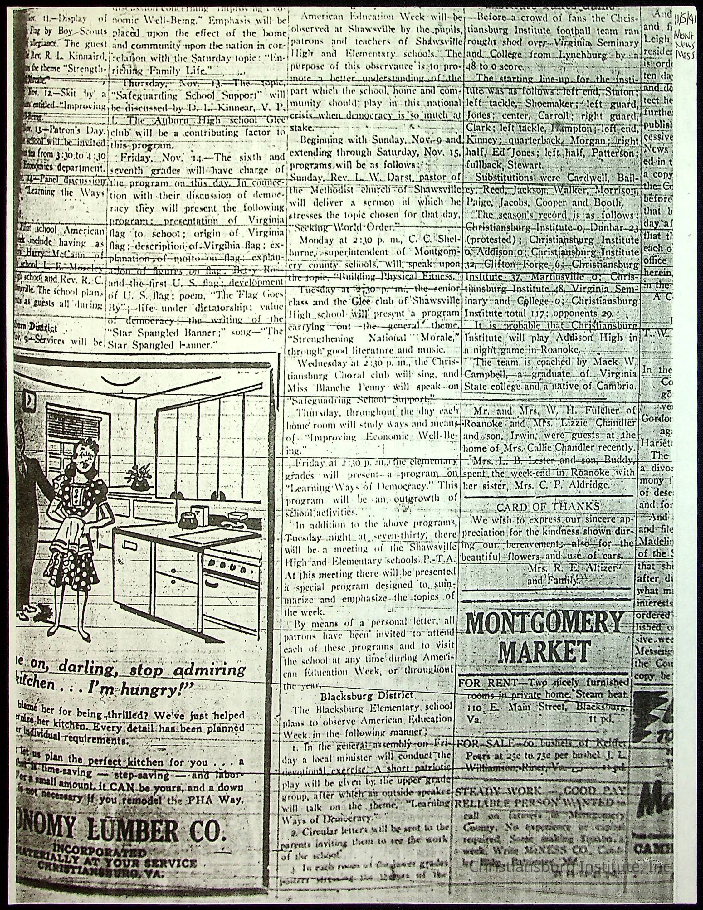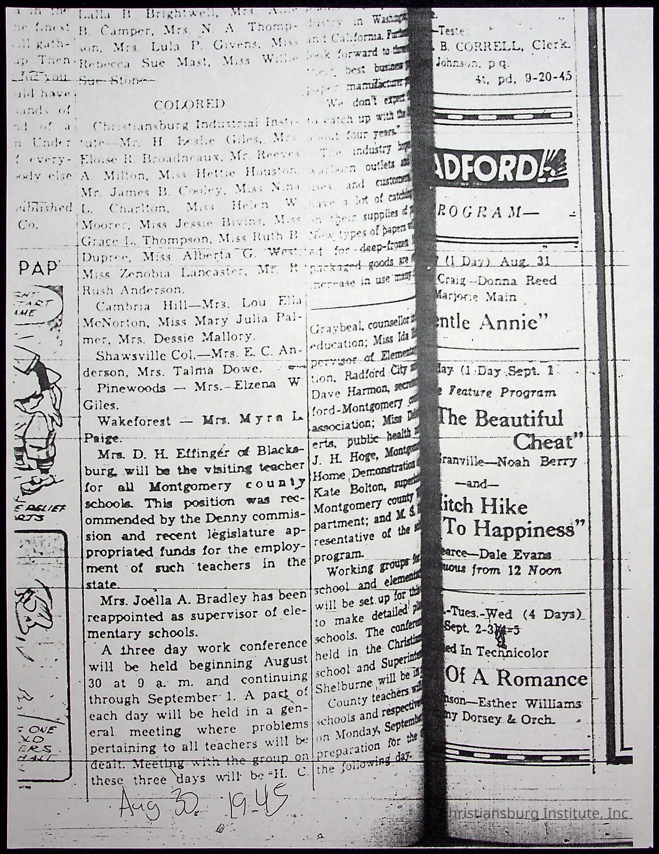A collection of newspaper articles that feature stories about Christiansburg Institute and other Montgomery County schools dates range from 1941 through 1948. These articles come from various newspapers.Date(s) of Creation
