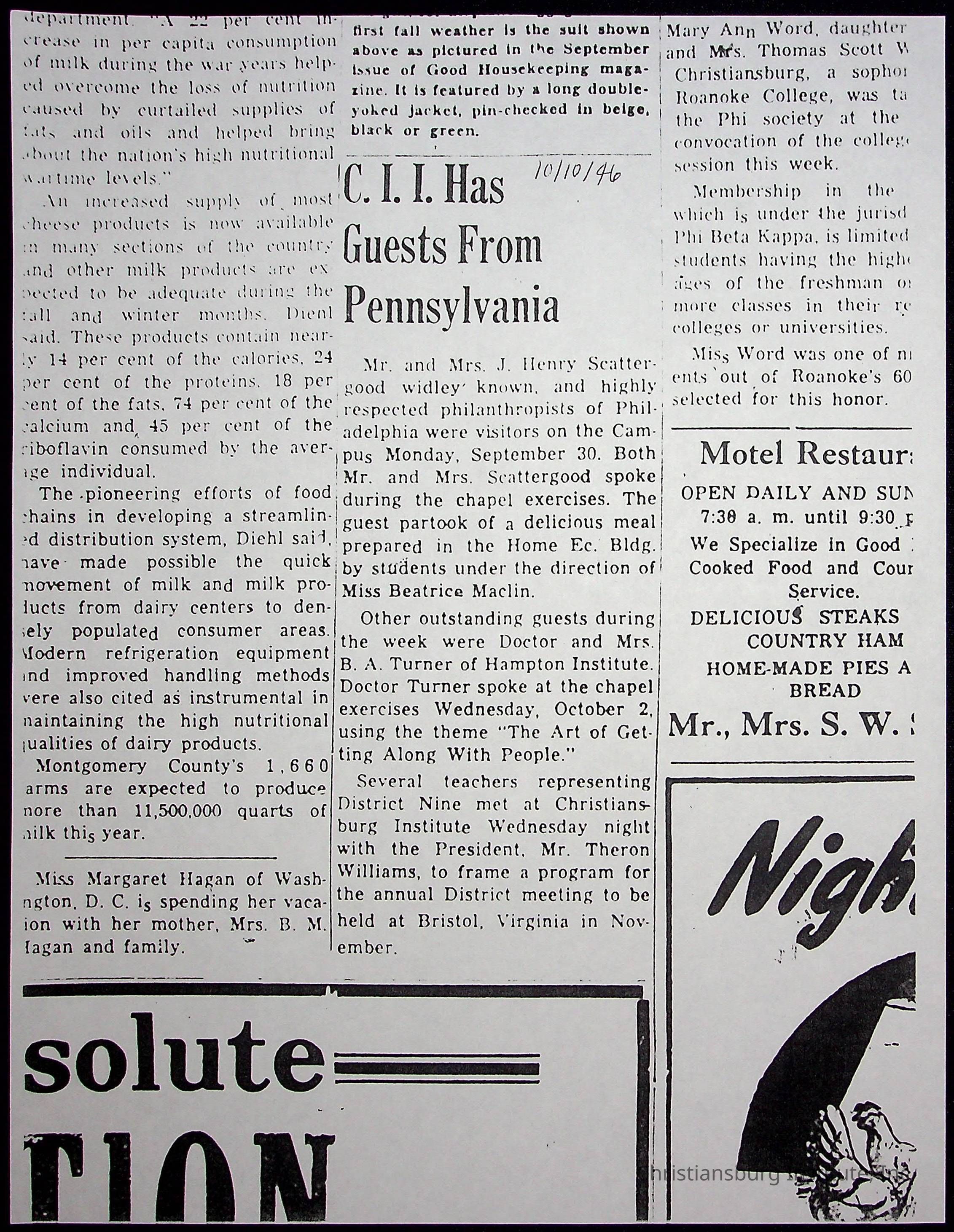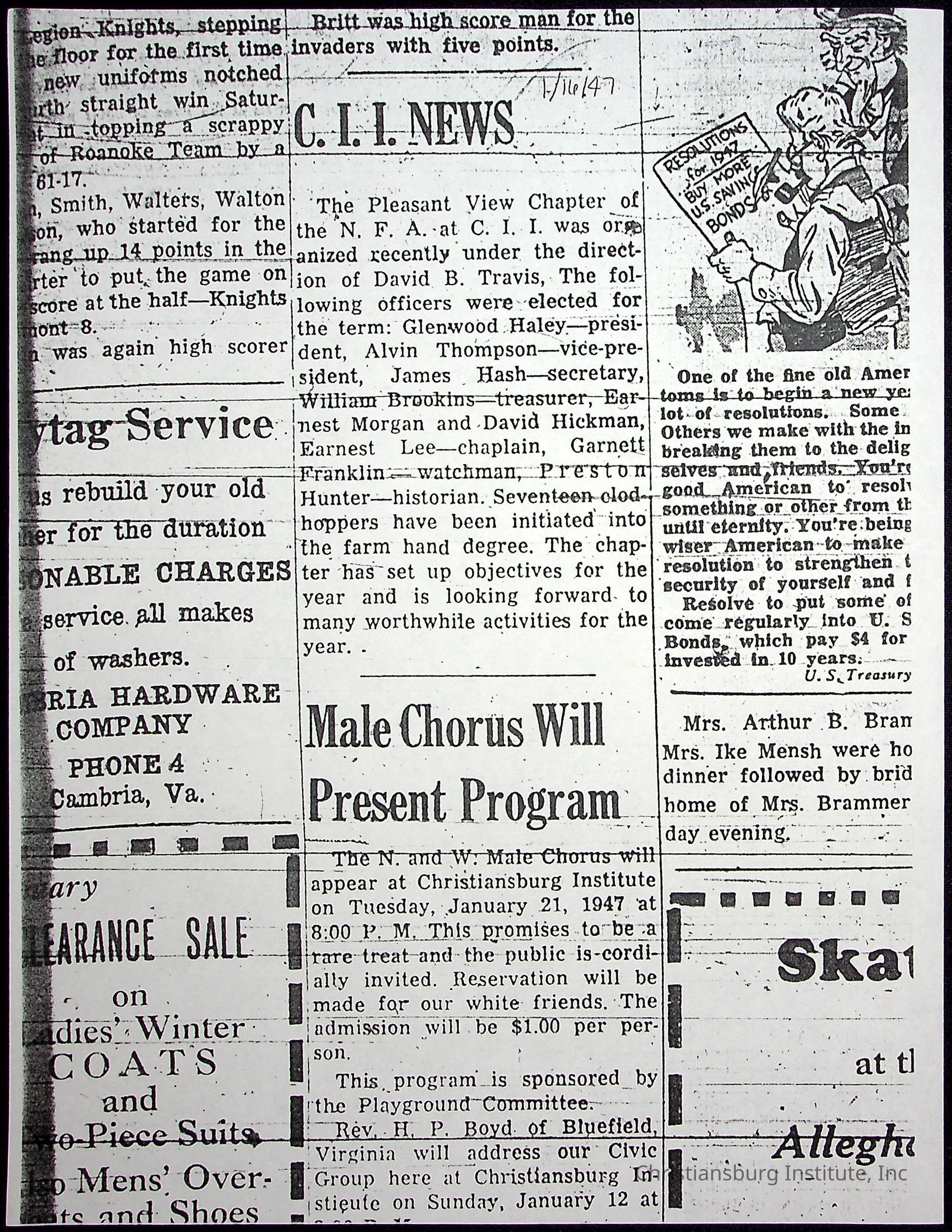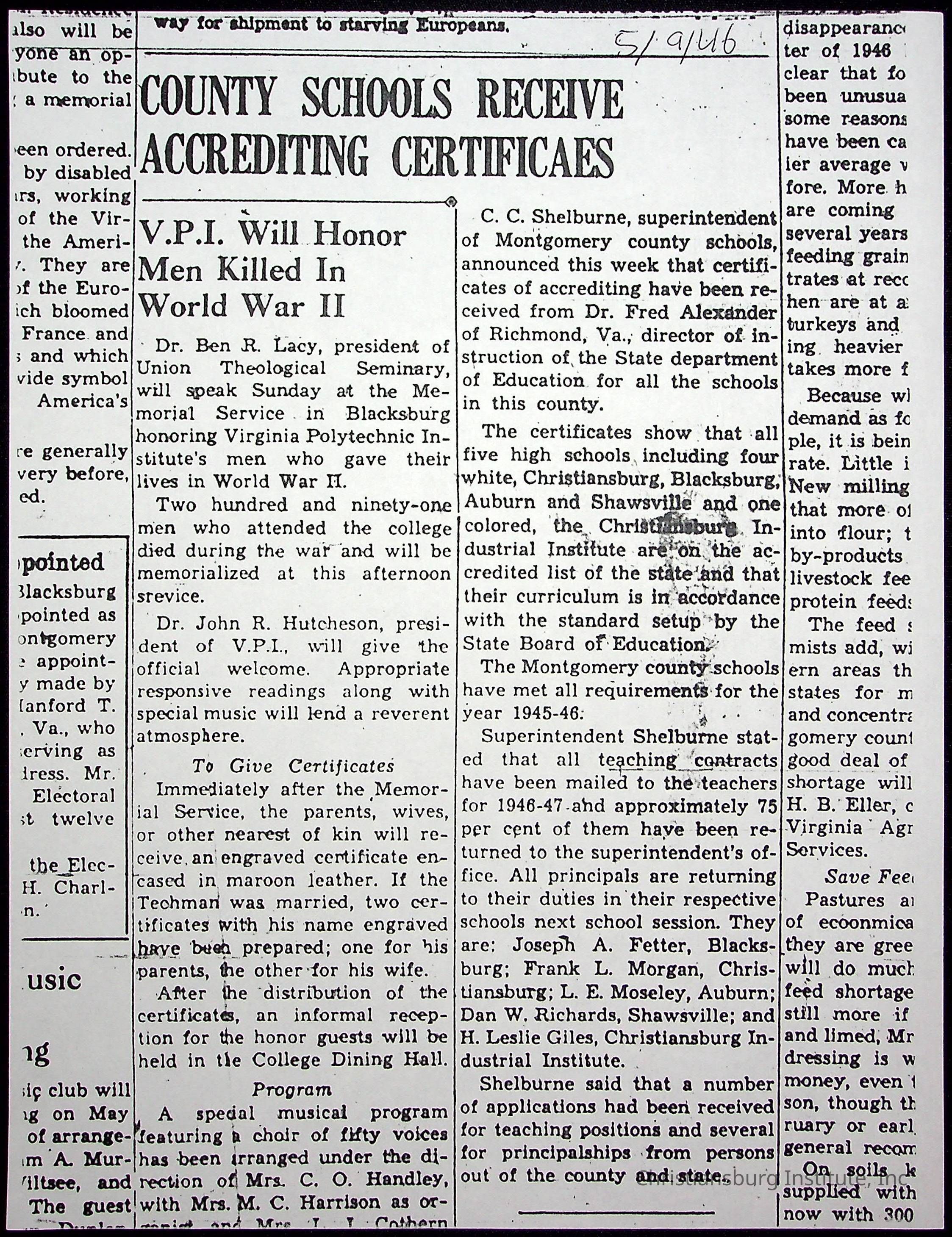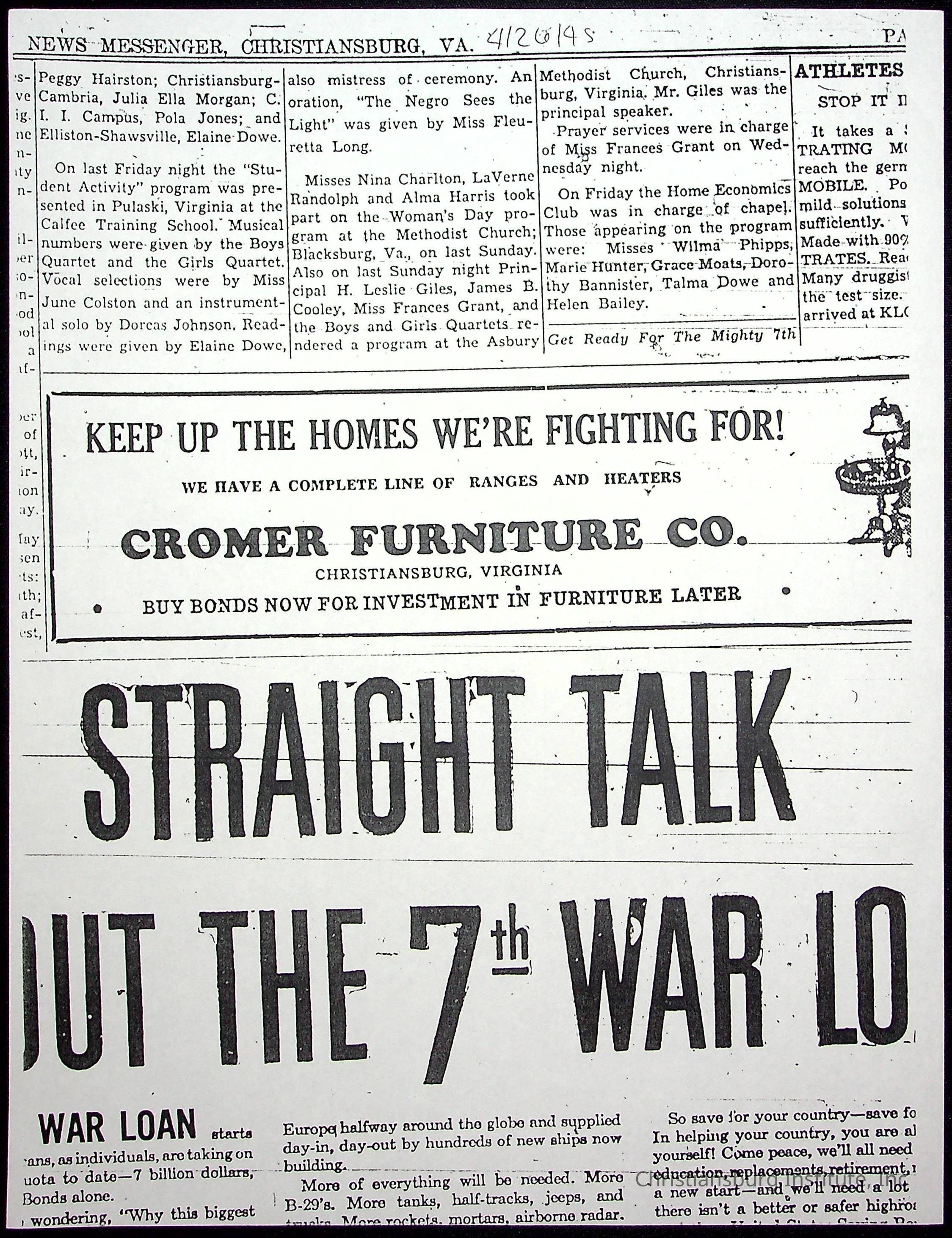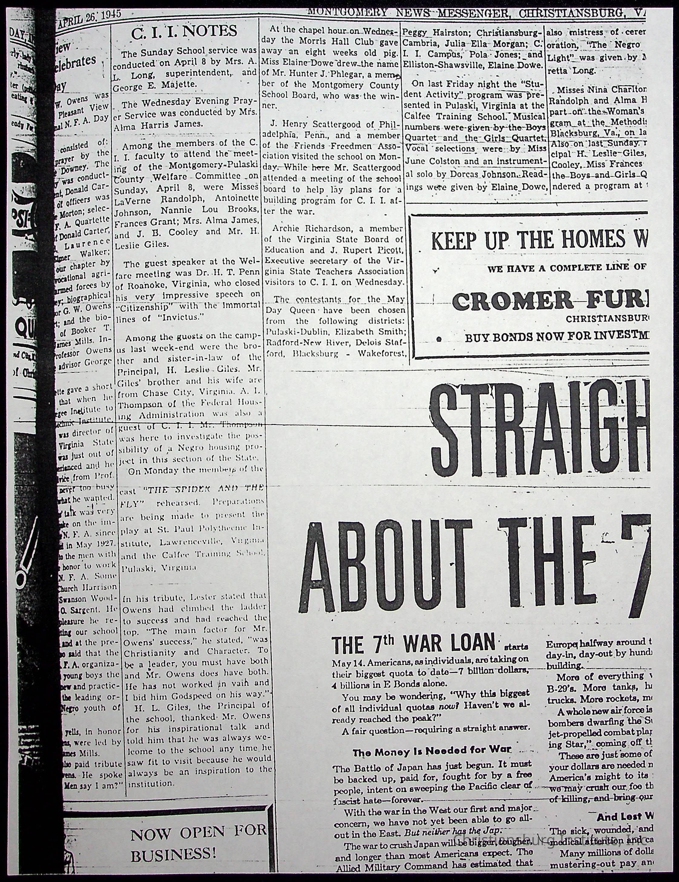A collection of newspaper articles that feature stories about Christiansburg Institute and other Montgomery County schools dates range from 1941 through 1948. These articles come from various newspapers.Date(s) of Creation