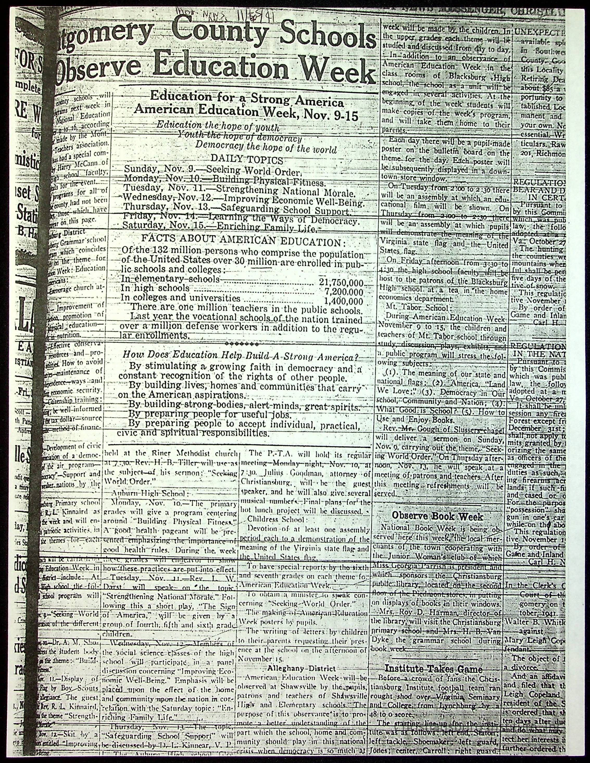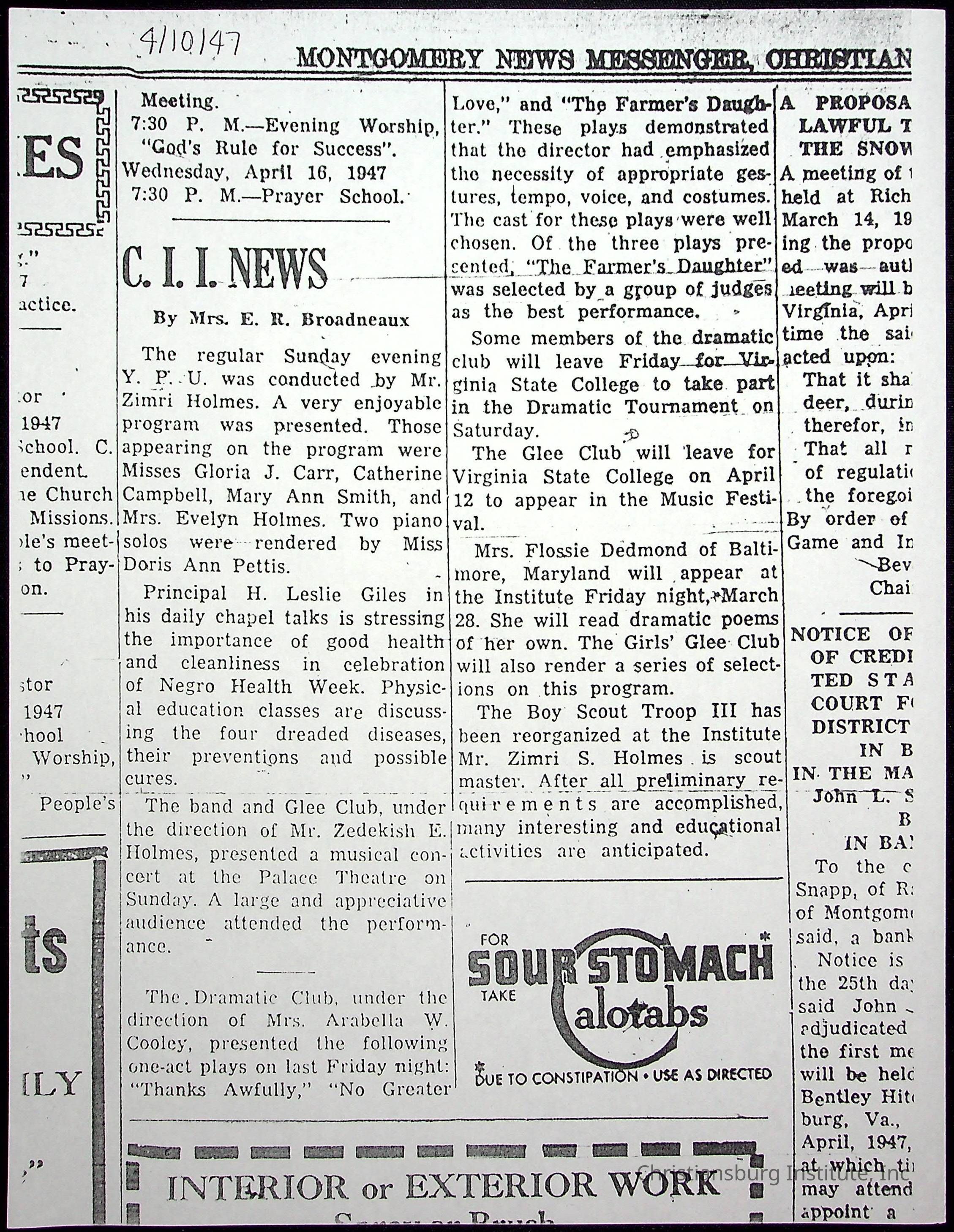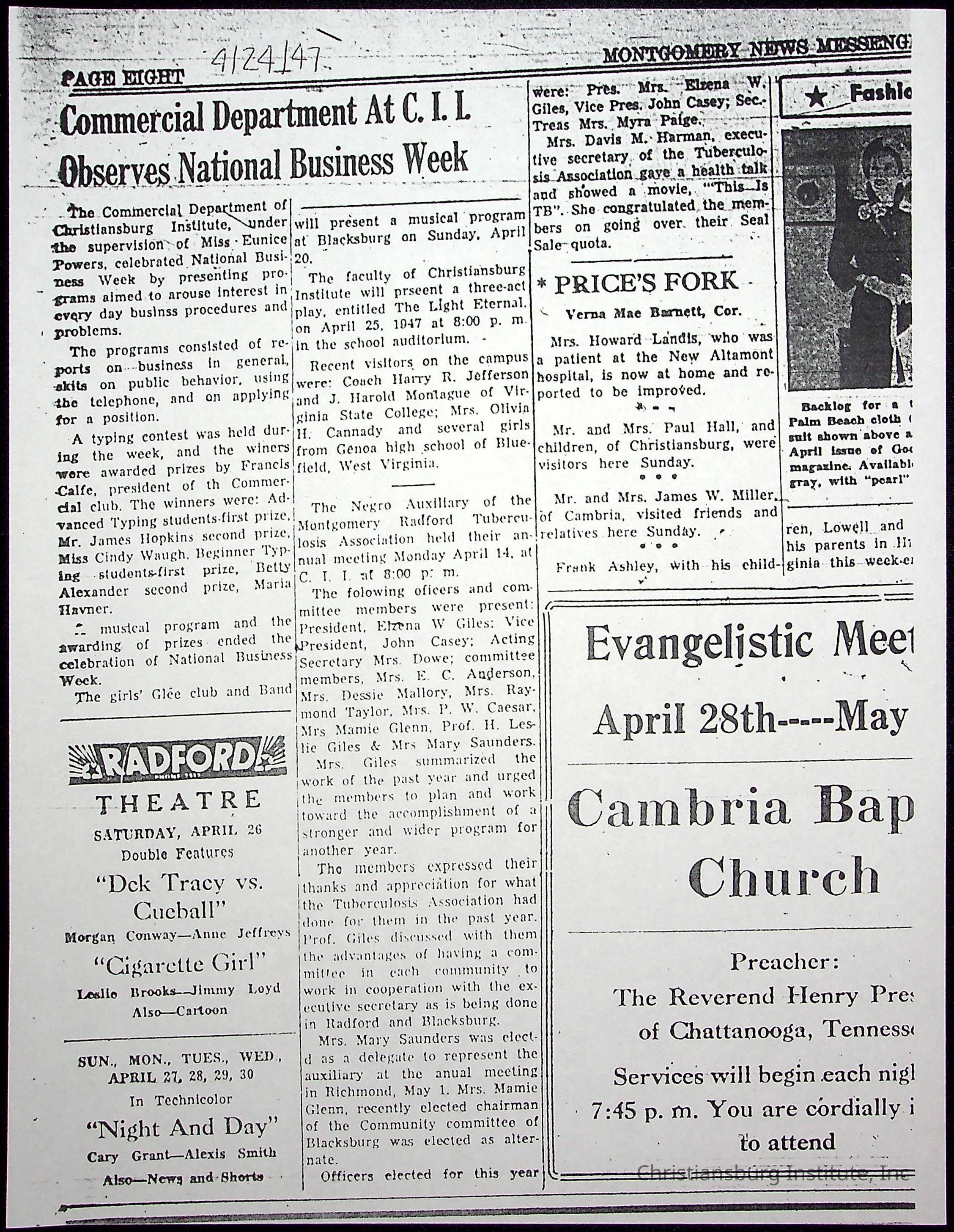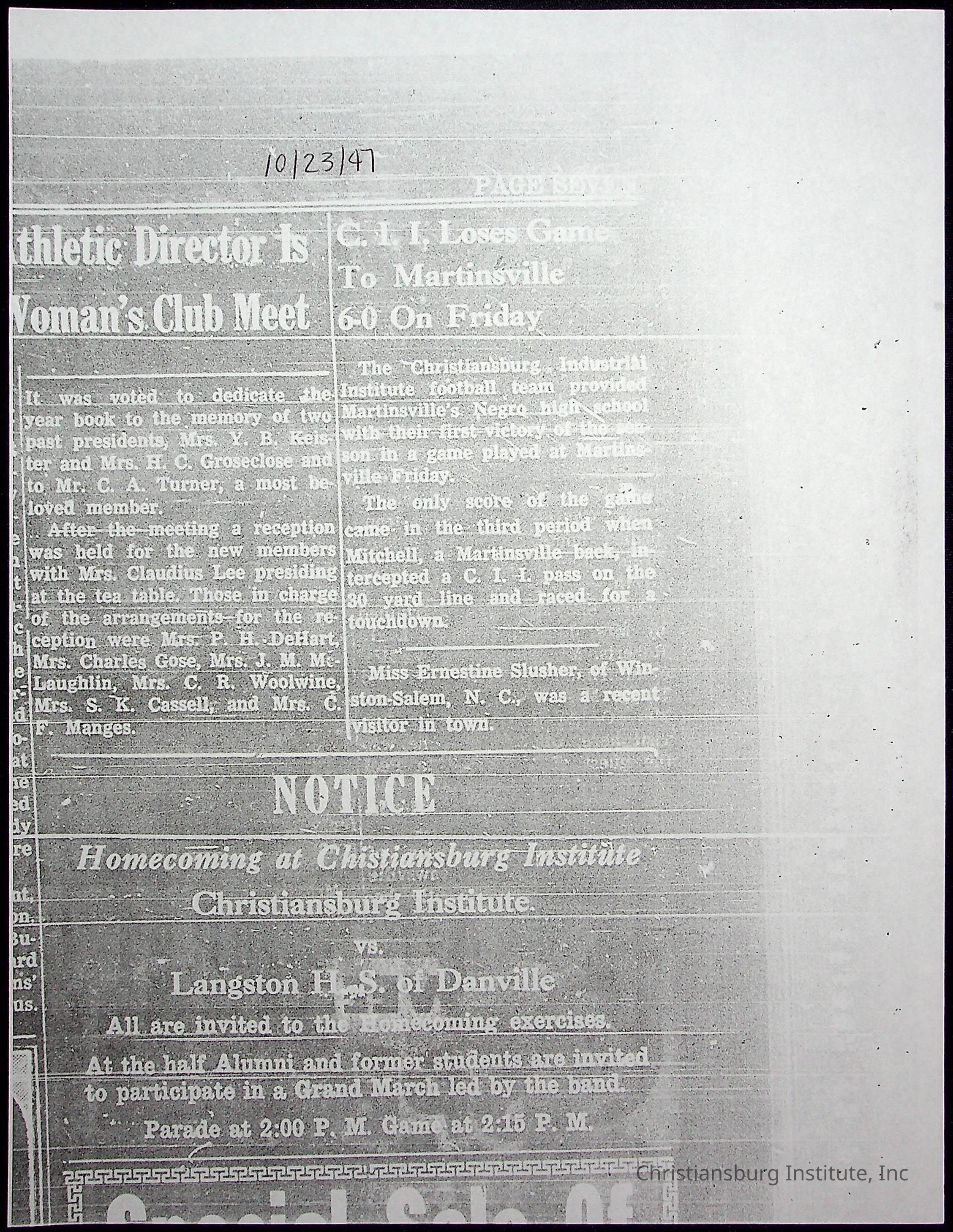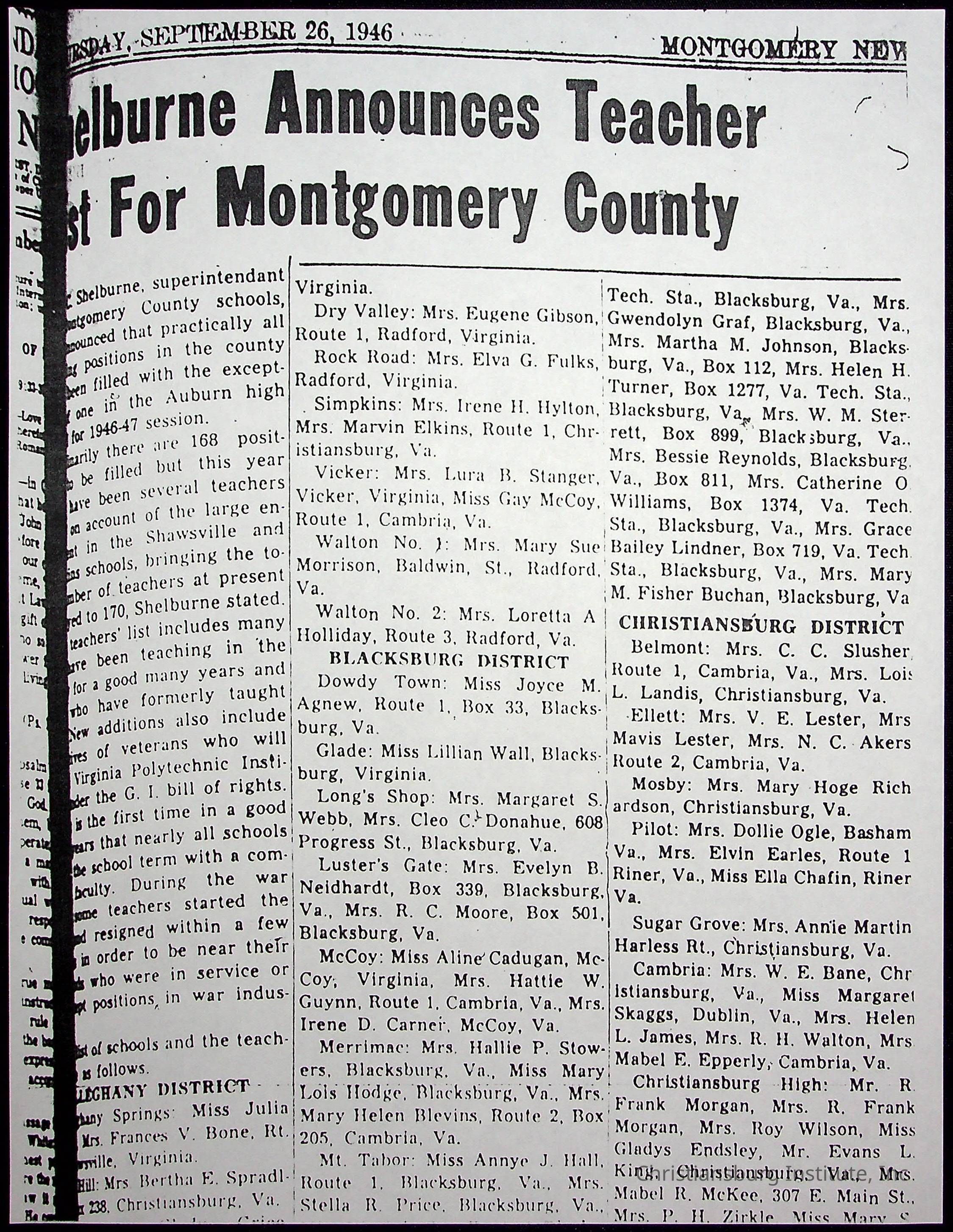 A collection of newspaper articles that feature stories about Christiansburg Institute and other Montgomery County schools dates range from 1941 through 1948. These articles come from various newspapers.Date(s) of Creation