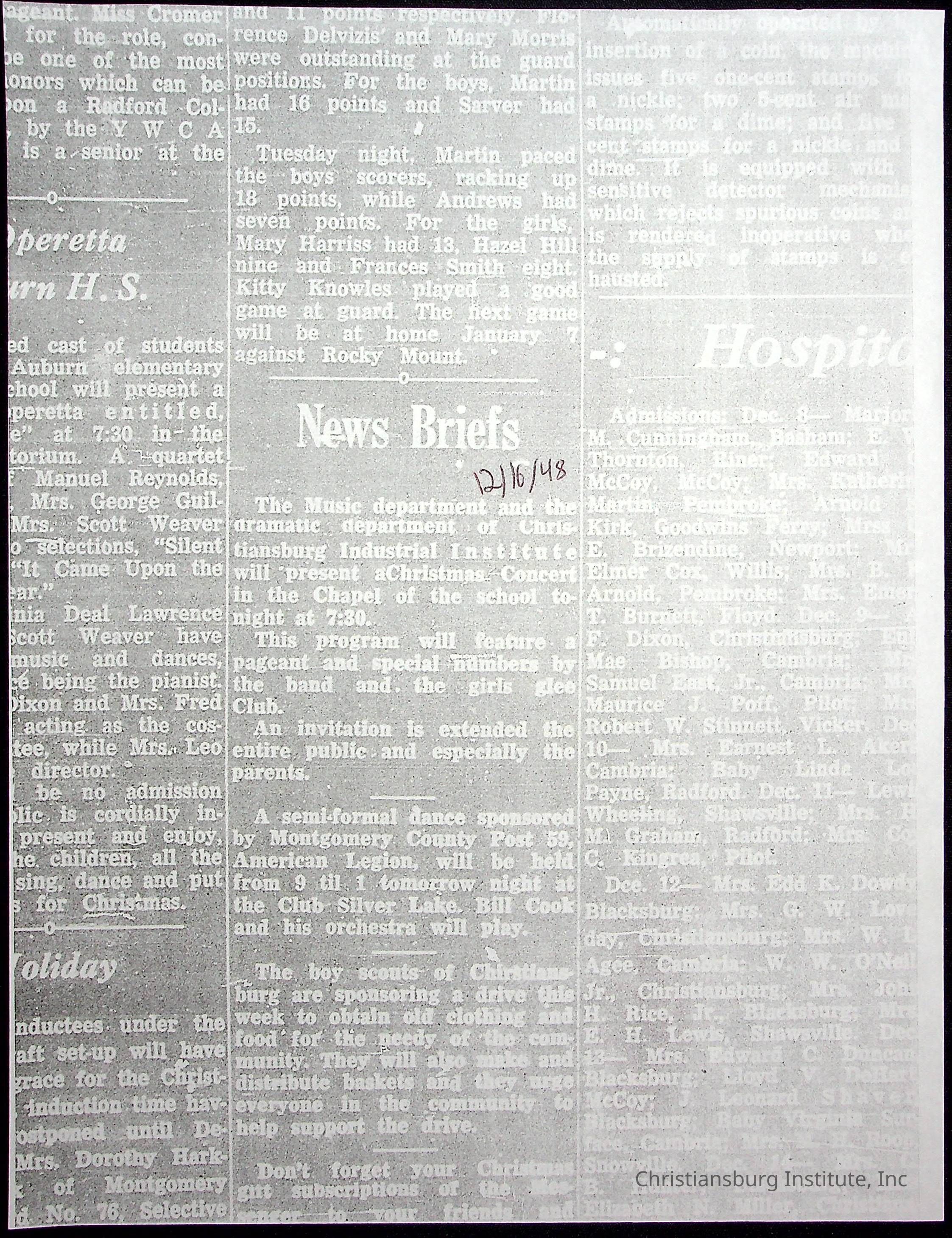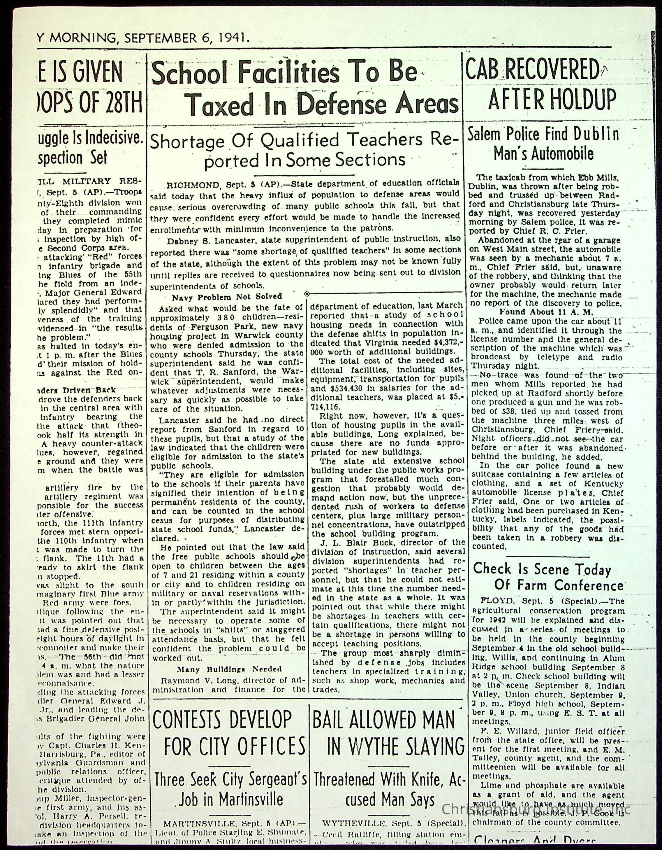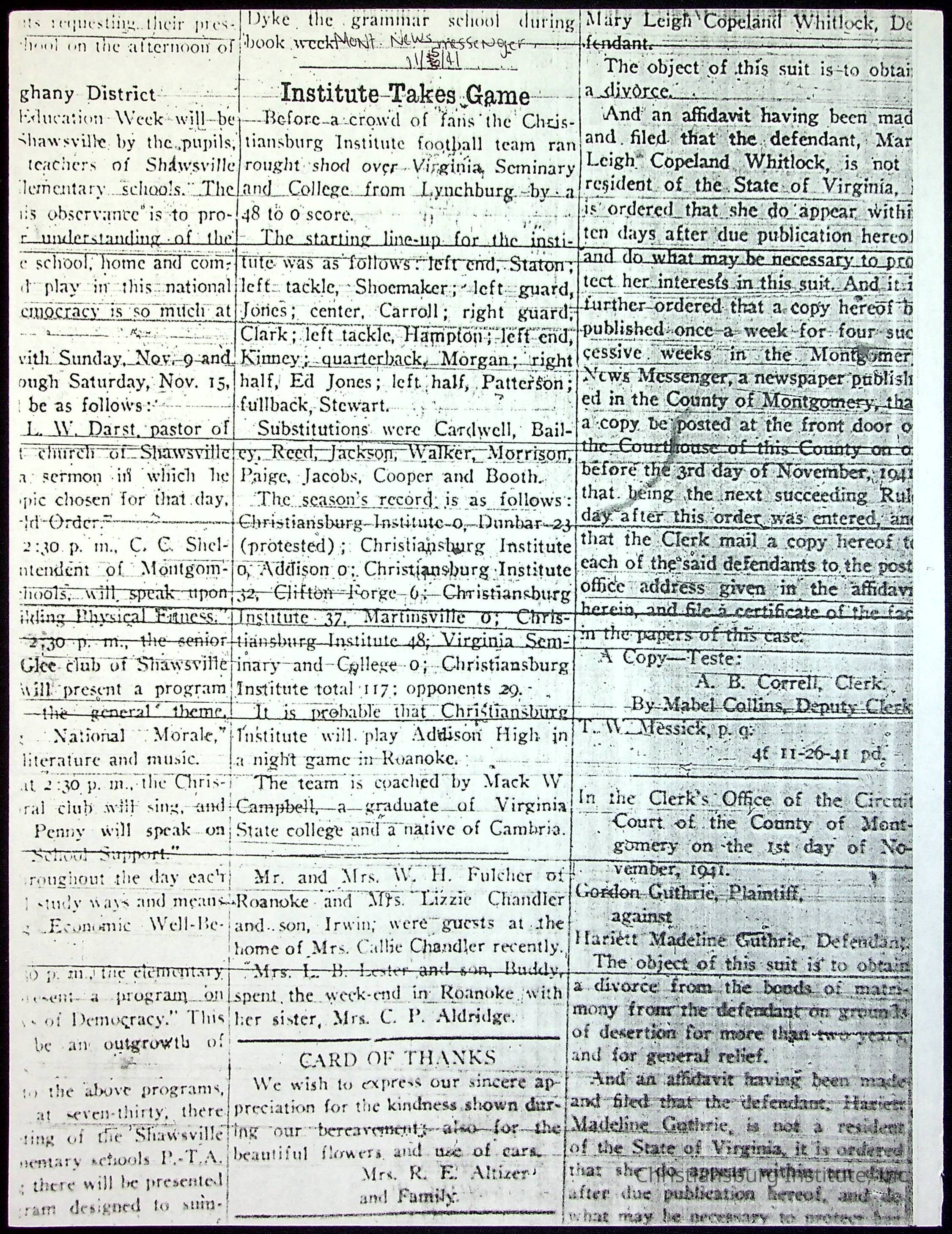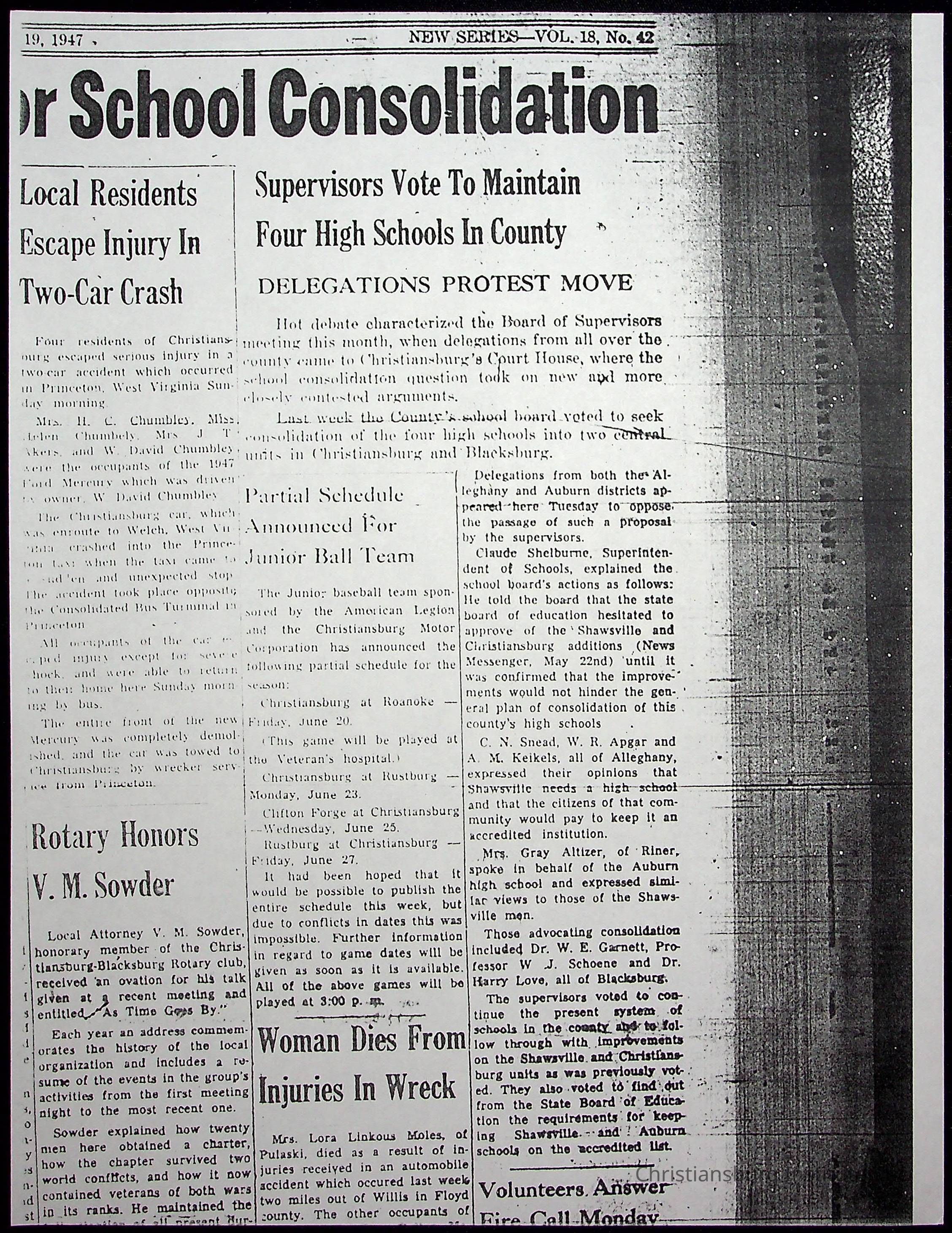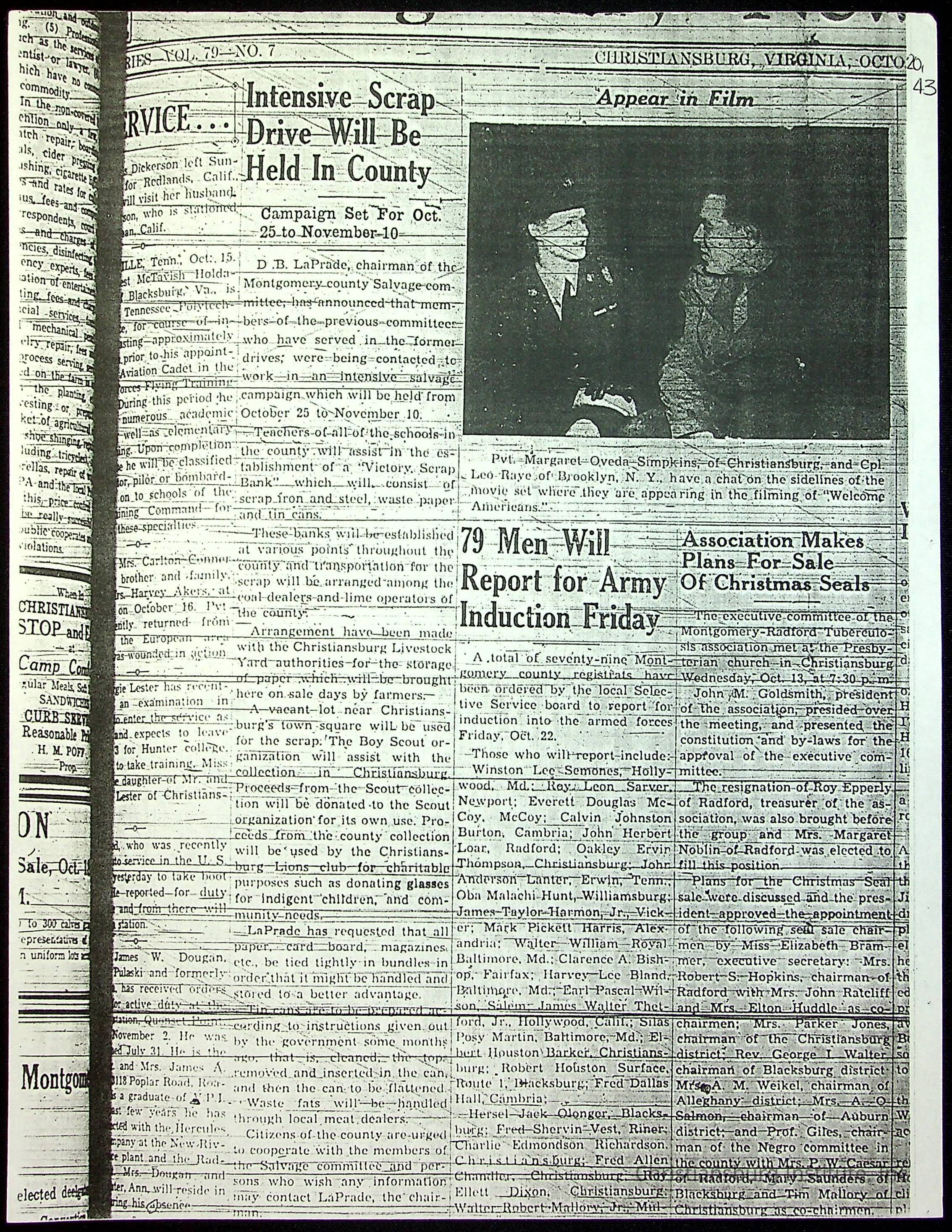 A collection of newspaper articles that feature stories about Christiansburg Institute and other Montgomery County schools dates range from 1941 through 1948. These articles come from various newspapers.Date(s) of Creation