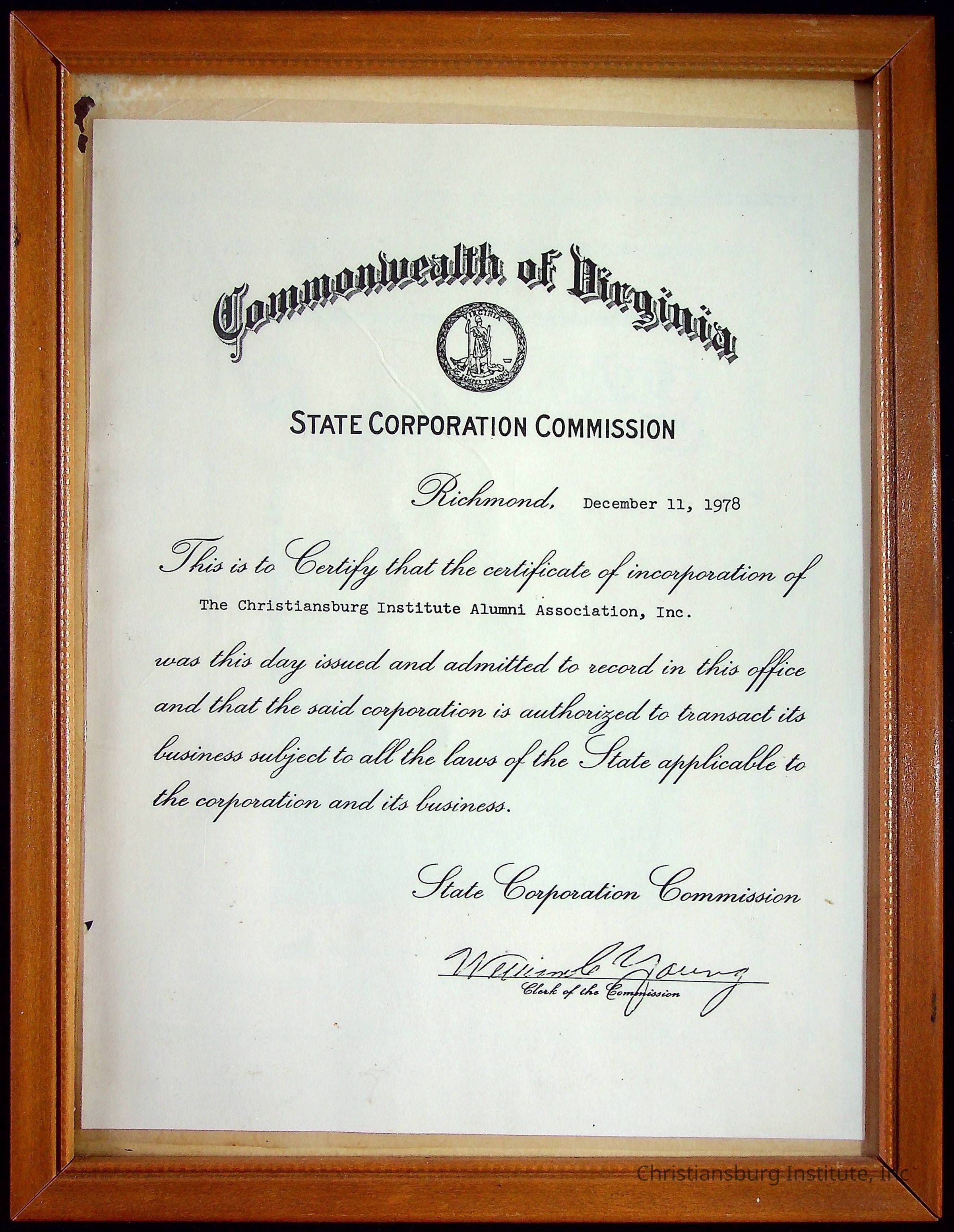 The certificate of incorporation for the Christiansburg Institute Alumni Association issued by the Commonwealth of Virginia state corporation commission dated December 11th, 1978.