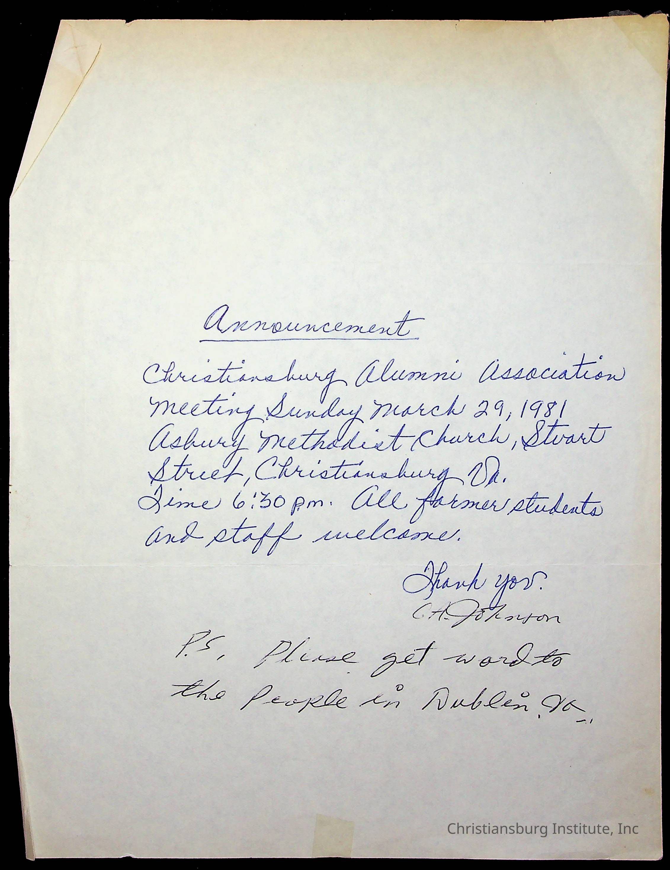 Copyright has been assigned to Christiansburg Institute Museum & Archives by Amanda DeHart. For permission to publish materials created by the donor, contact CIMA@christiansburginstitute.com. Materials not created by Amanda DeHart may still be under copyright.