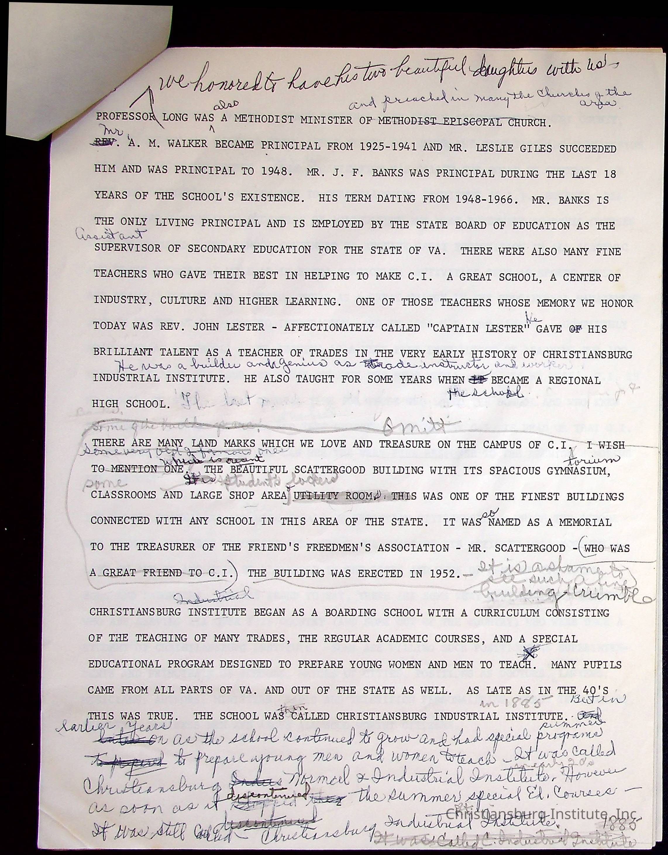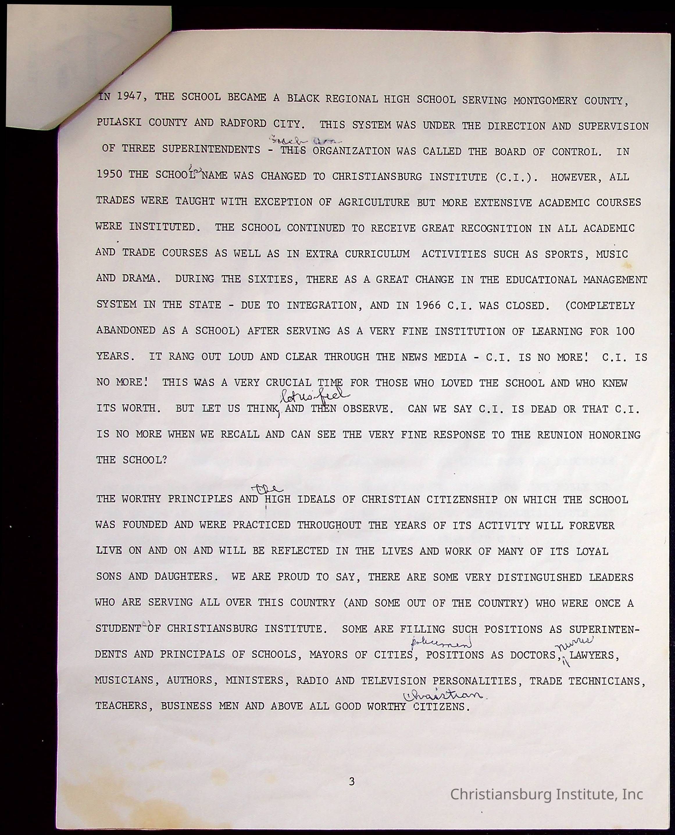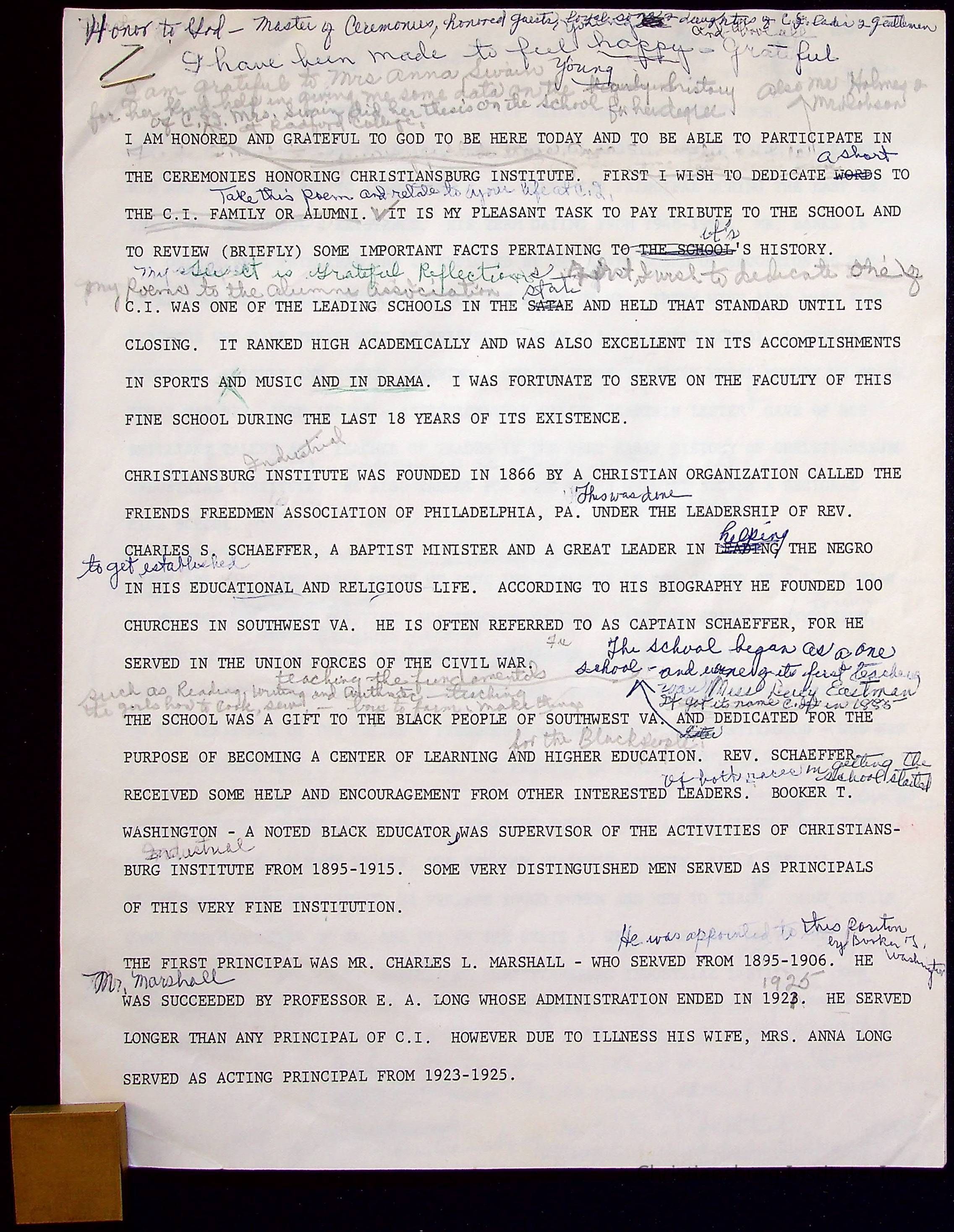 A typed speech presented at the Christiansburg Institute Alumni Association reunion, written and spoken by former Christiansburg Institute teacher, Viola Charlton, undated.Collection