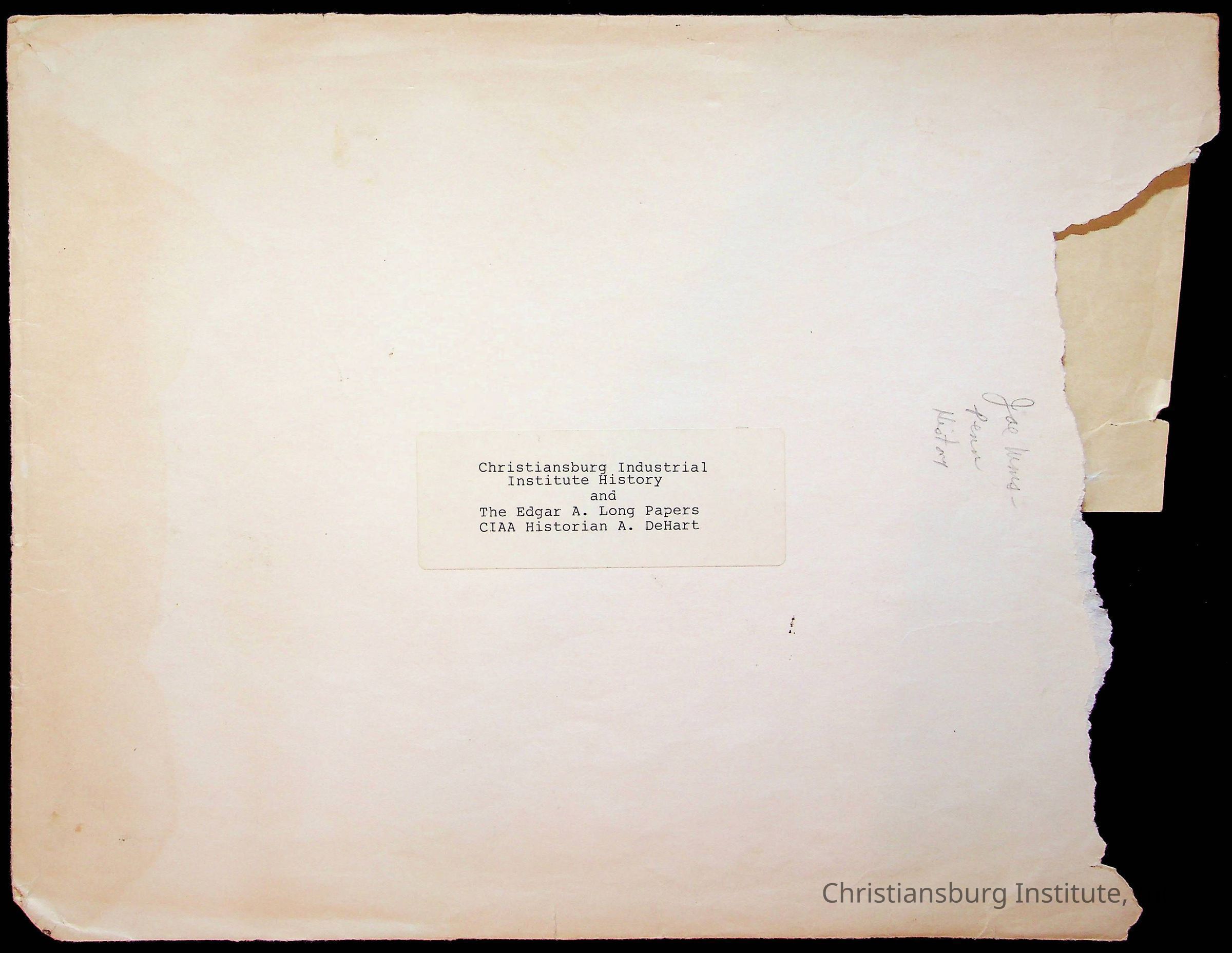 An envelope that contained the Edgar A. Long papers and the Christiansburg Industrial Institute History organized by the Christiansburg Institute Alumni Association historian, Amanda DeHart, undated.General Notes