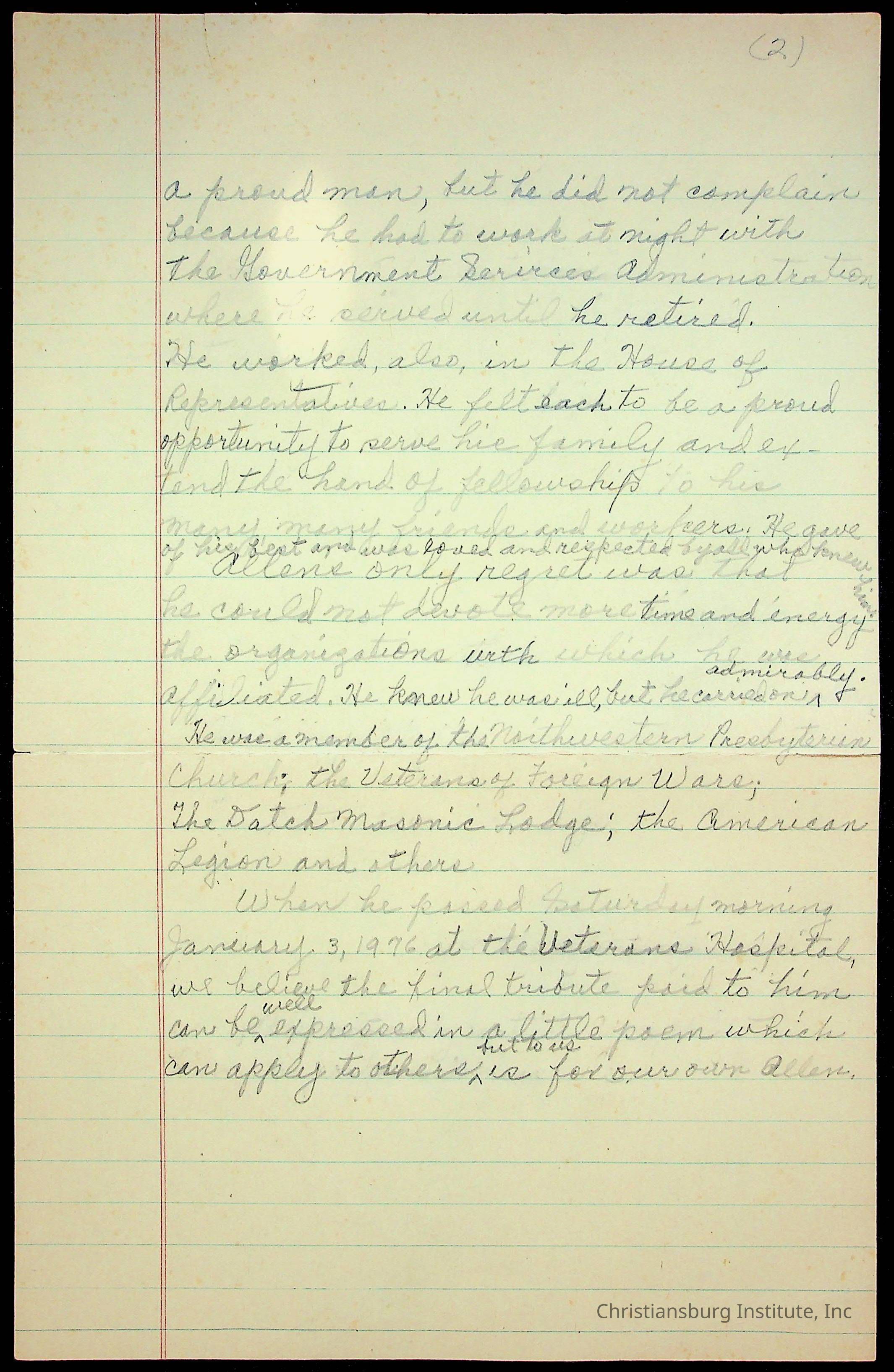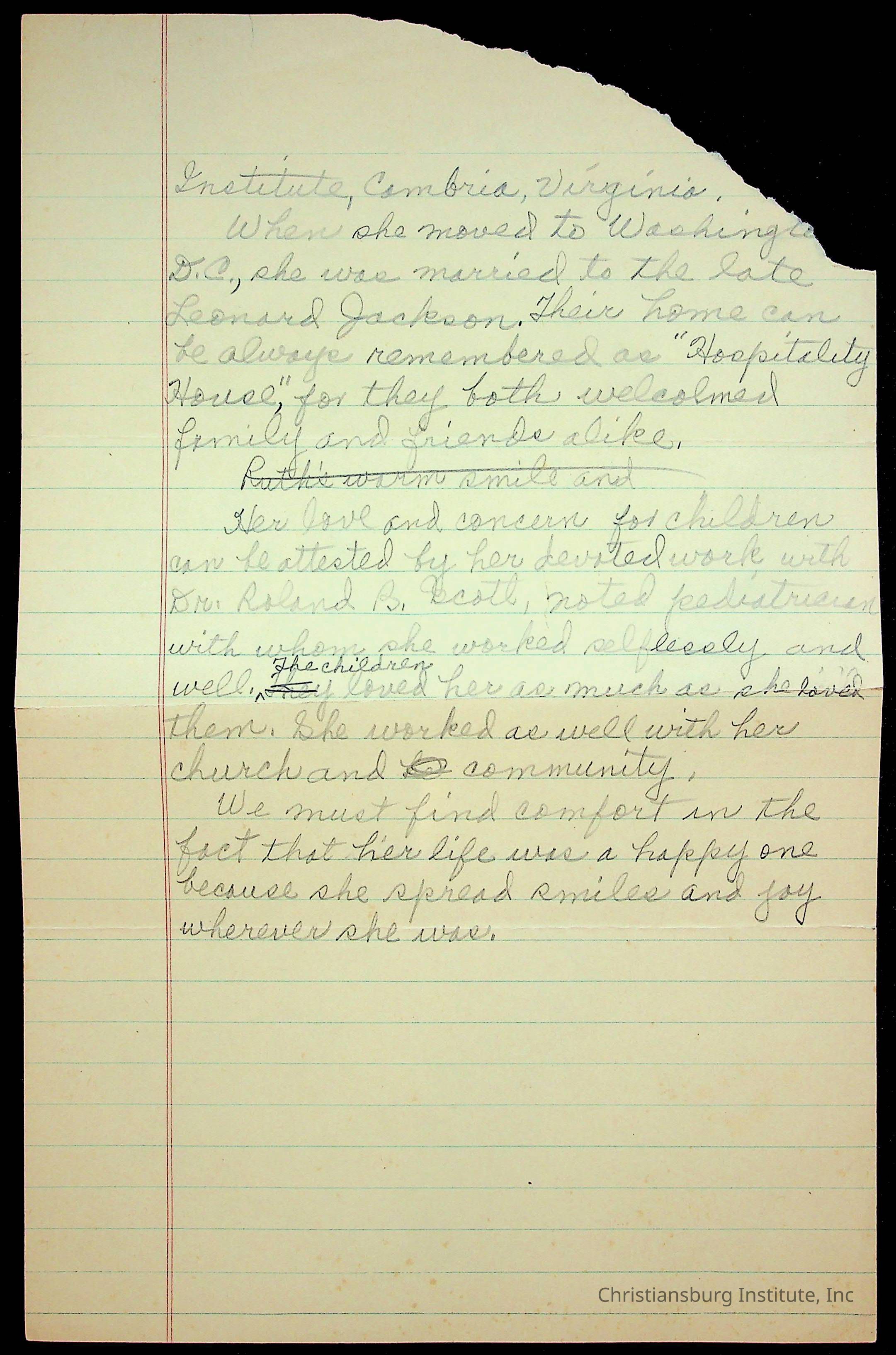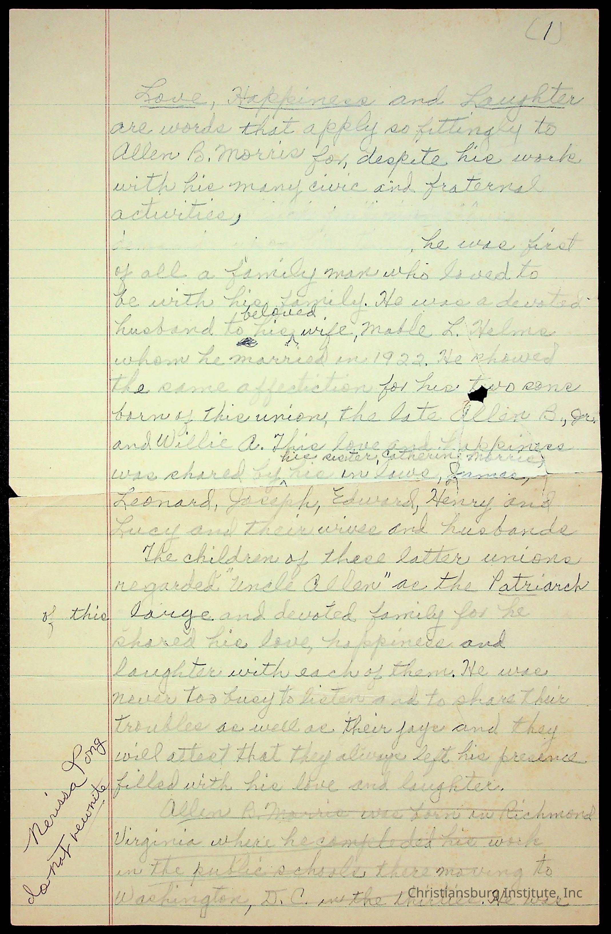 Speech notes about love, happiness, and laughter and Christiansburg Institute, written by Amanda DeHart, undated.Collection