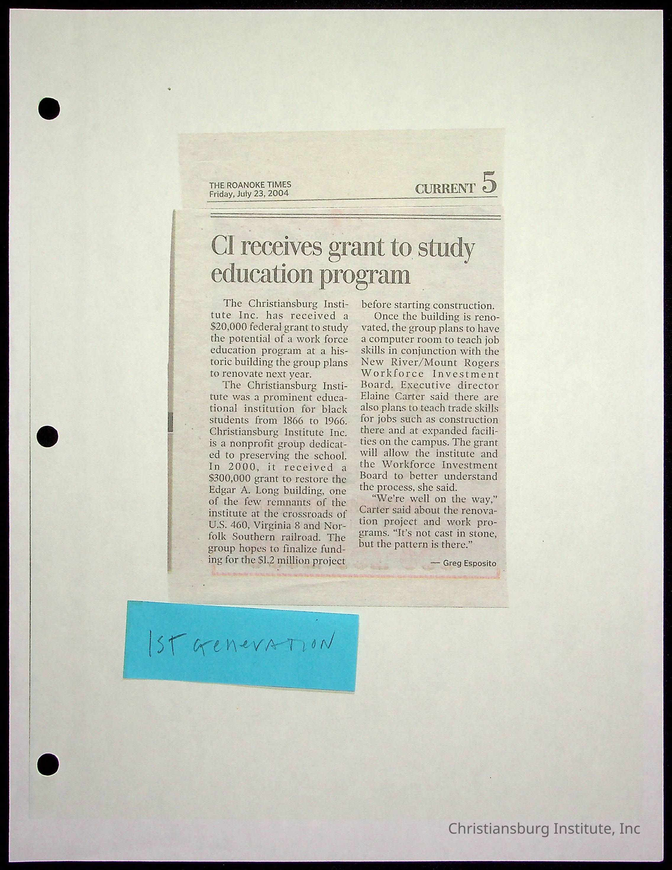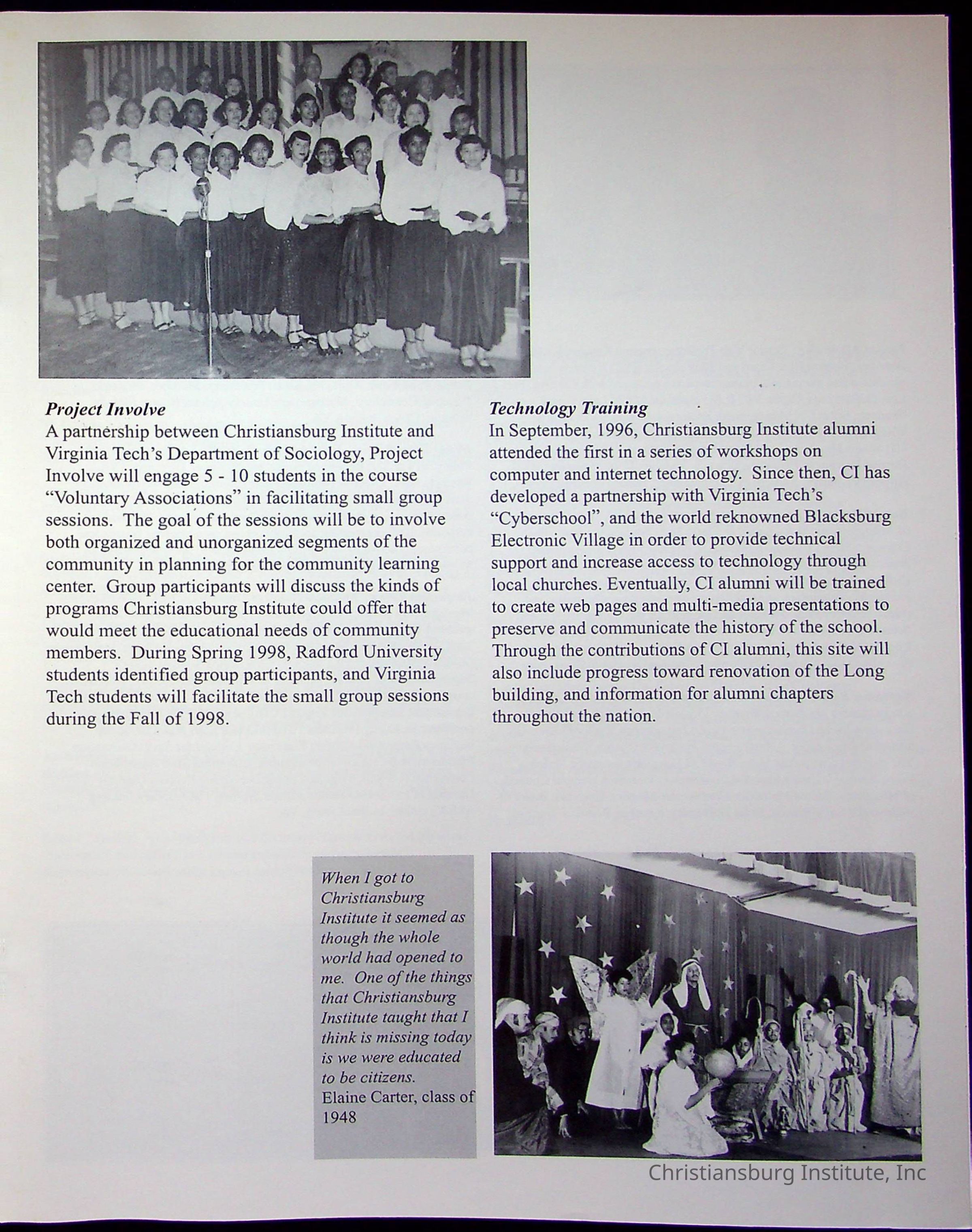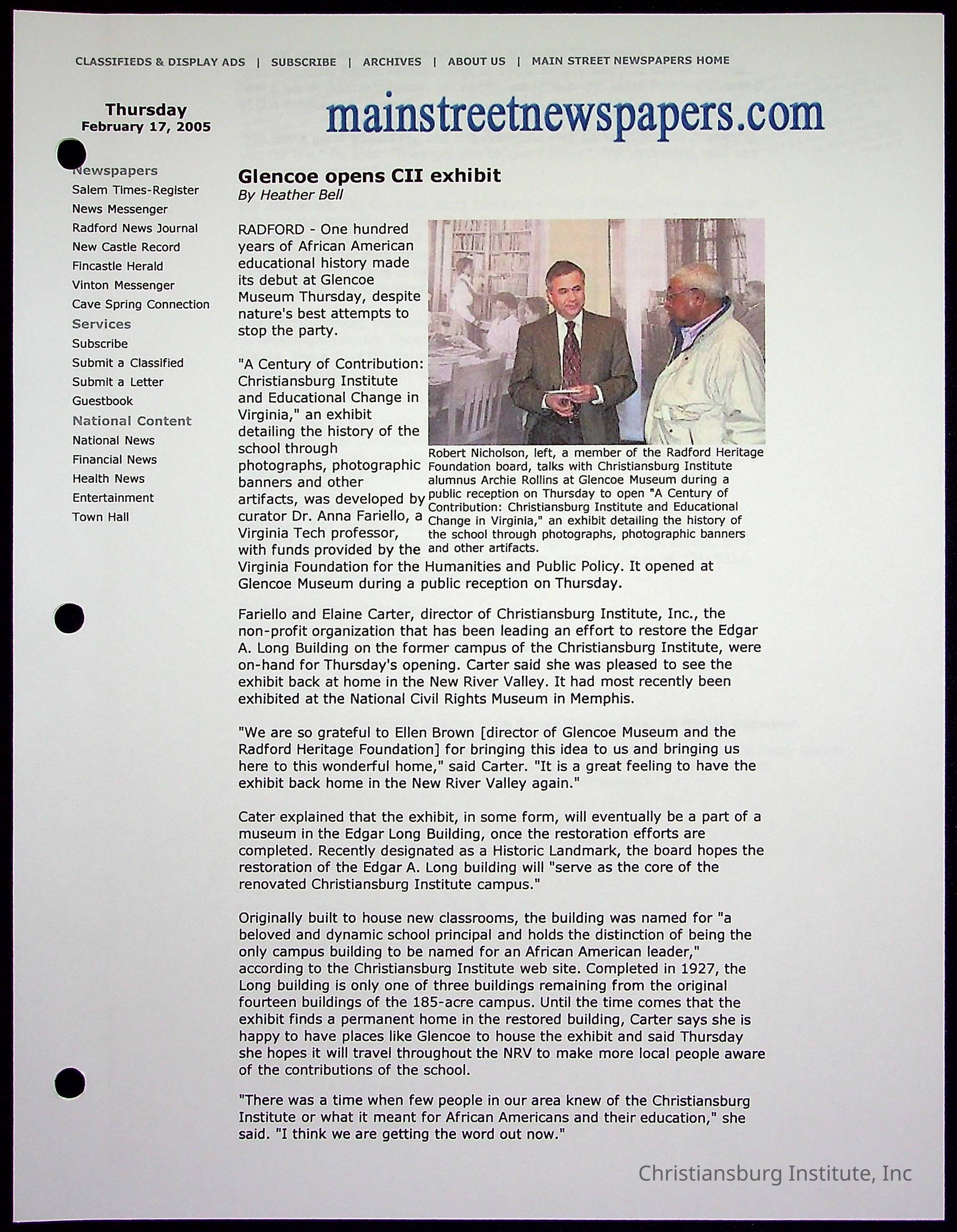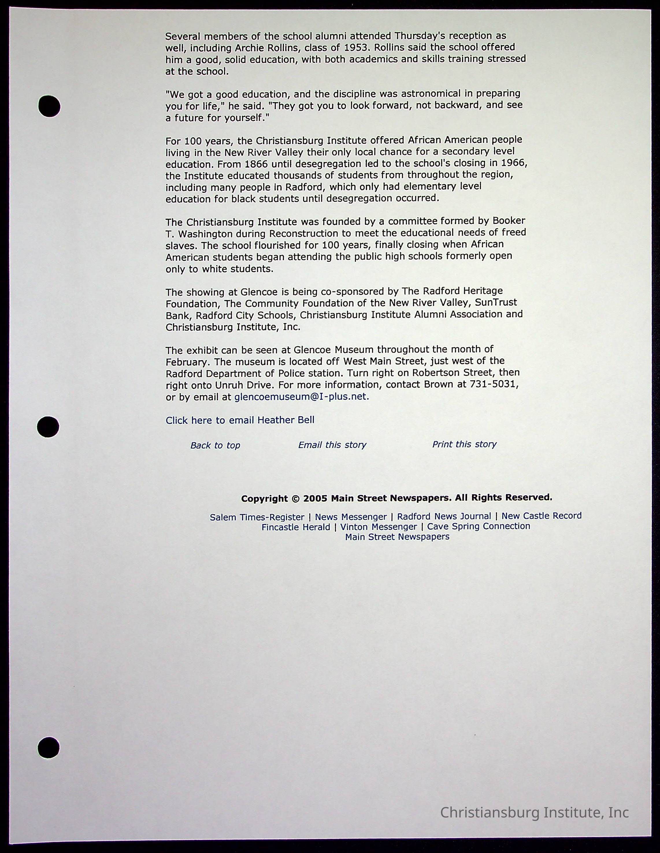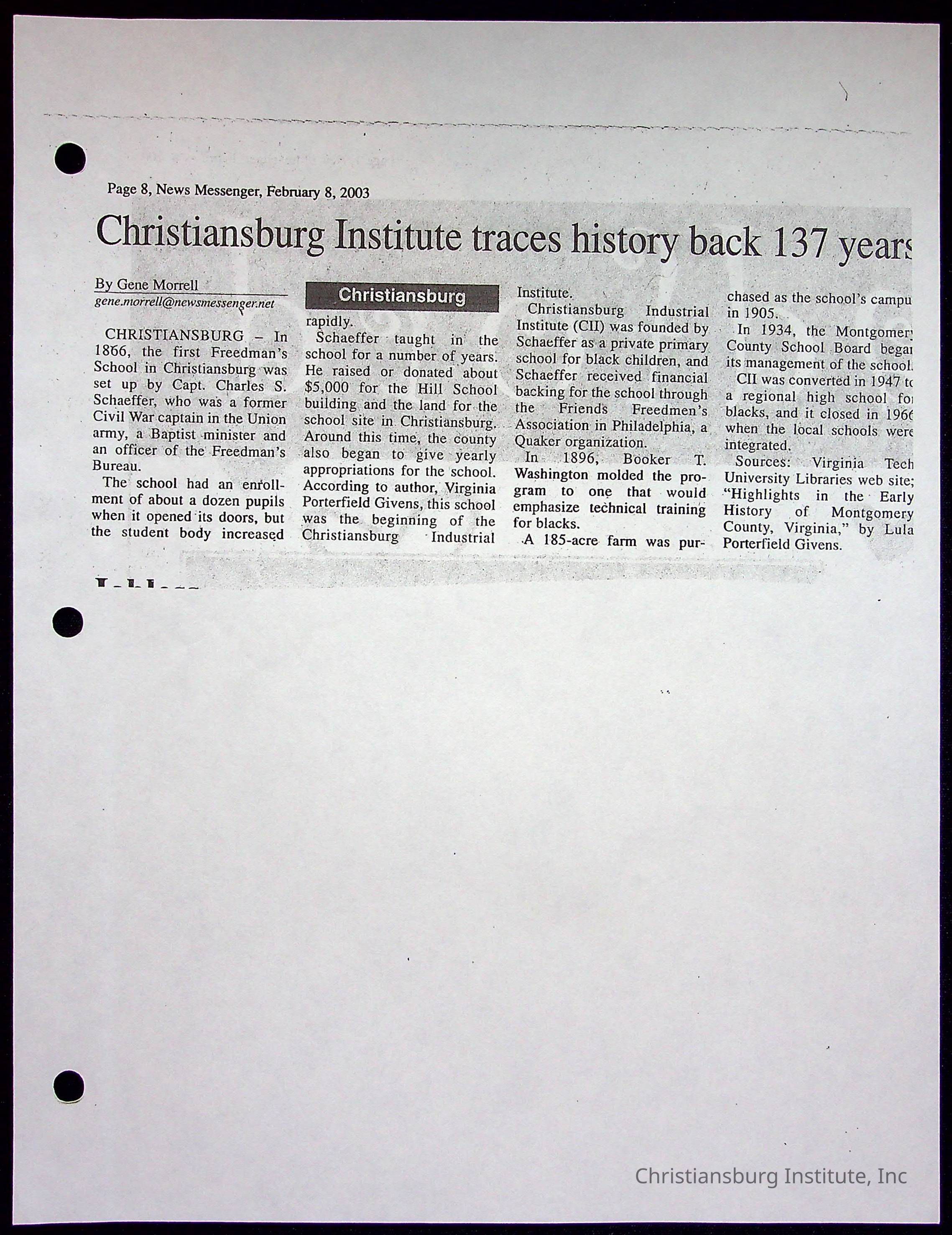 A collection of press materials and publications that feature Christiansburg Institute Inc, dates range from the year 1992 to 2004.Creator