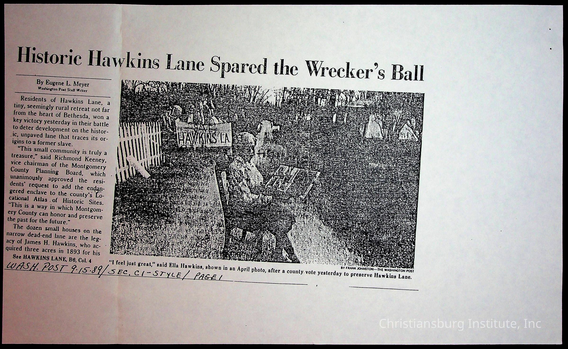 A scanned copy of a newspaper clipping titled 'Historic Hawkins Lane Spared the Wrecker's Ball' written by Eugene L. Meyer. Scanned by Elizabeth Fine circa 1990.