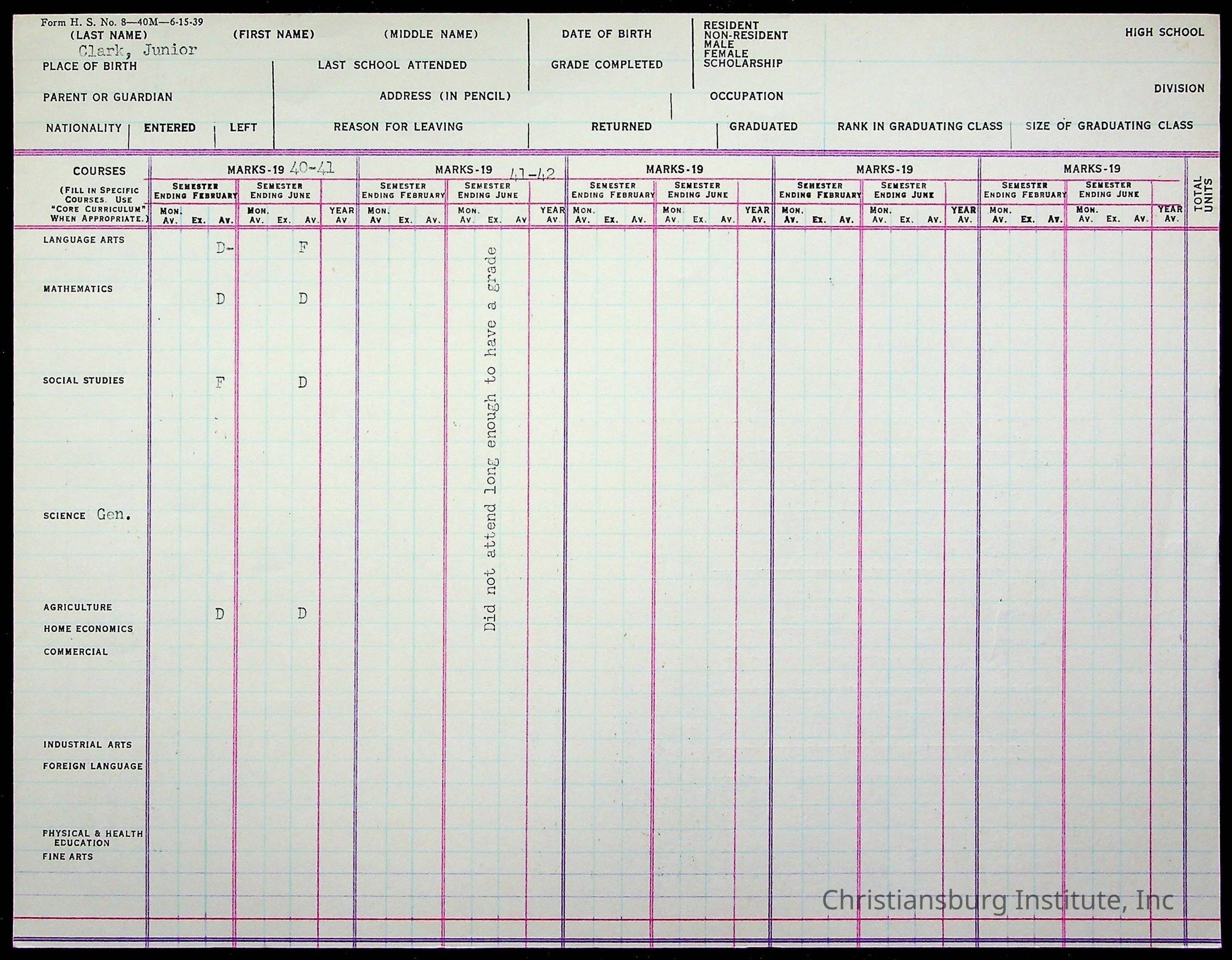 The student file for the Christiansburg Institute student, Junior Clark circa 1940s.