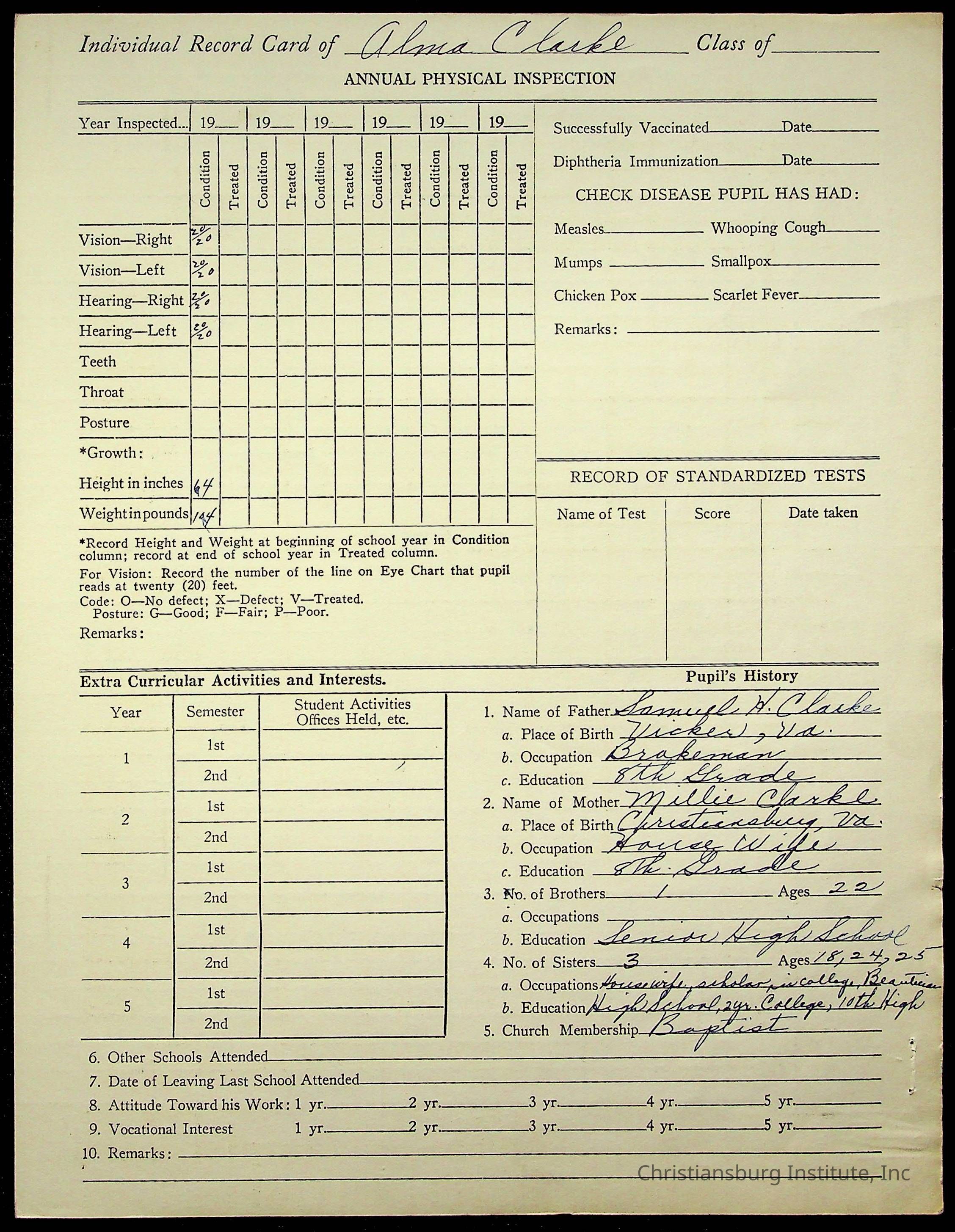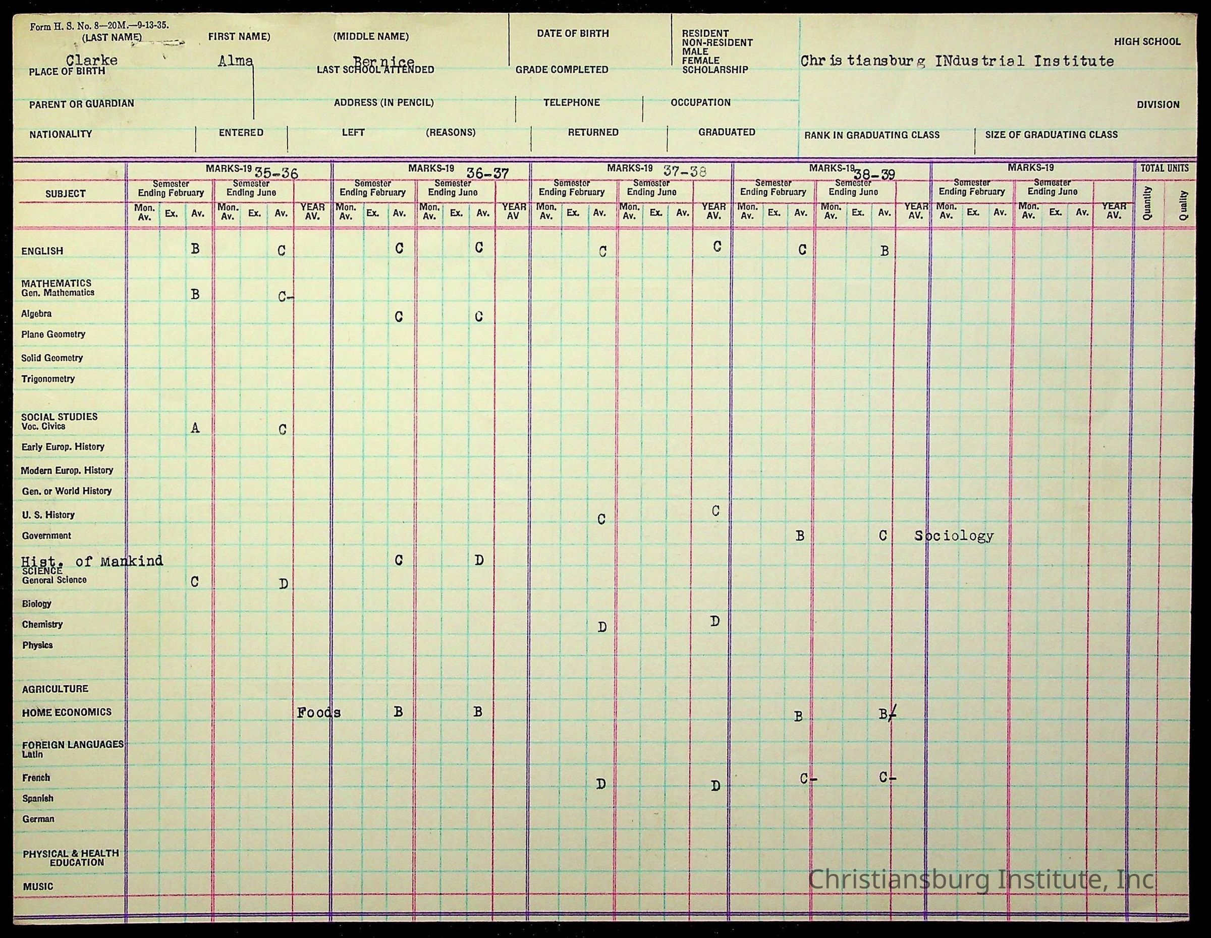 The student file for the Christiansburg Institute student, Alma Bernice Clarke circa 1930s.