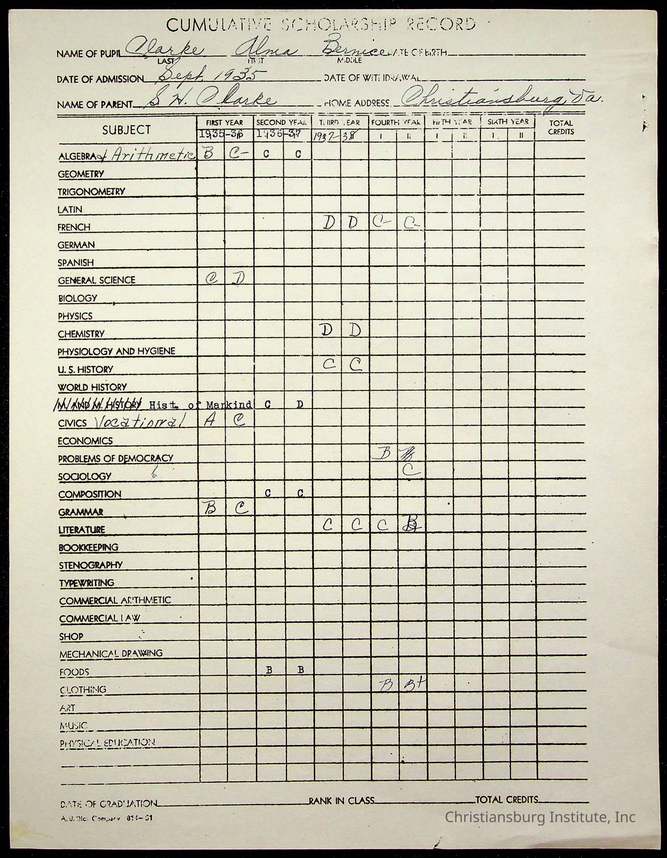 Montgomery County Public Schools, Christiansburg Institute, Clarke, Alma Bernice