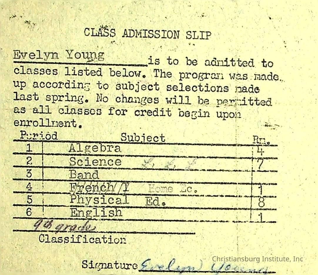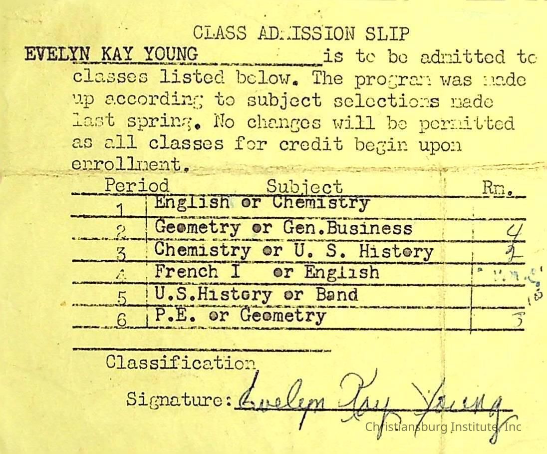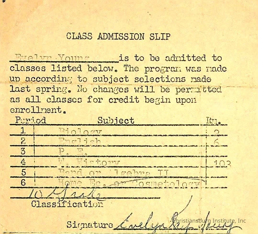 A class admission slip for Evelyn Young from Christiansburg Institute, circa 1960s.Creator