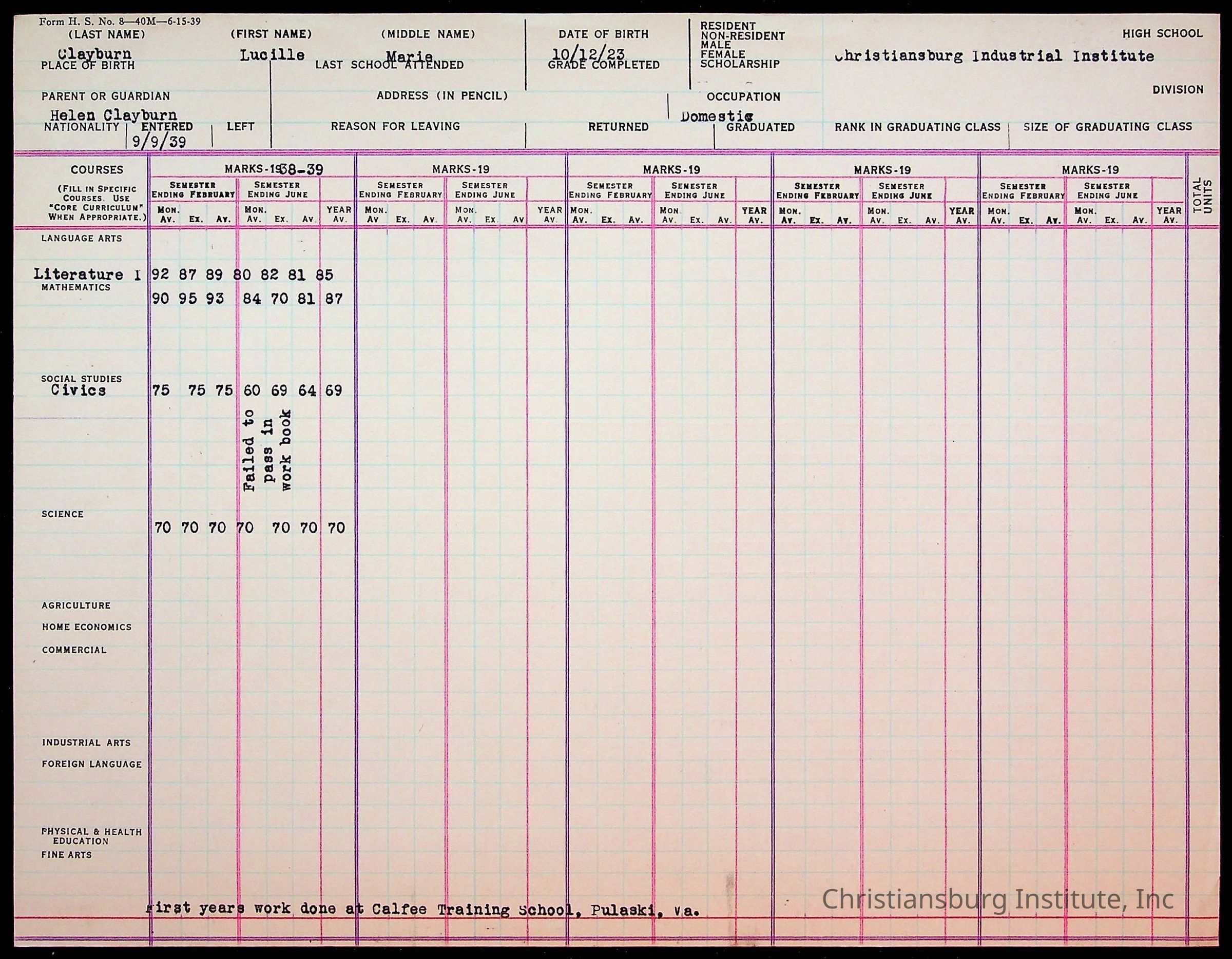 Christiansburg Institute, Montgomery County Public Schools, Clayburn, Lucille Marie