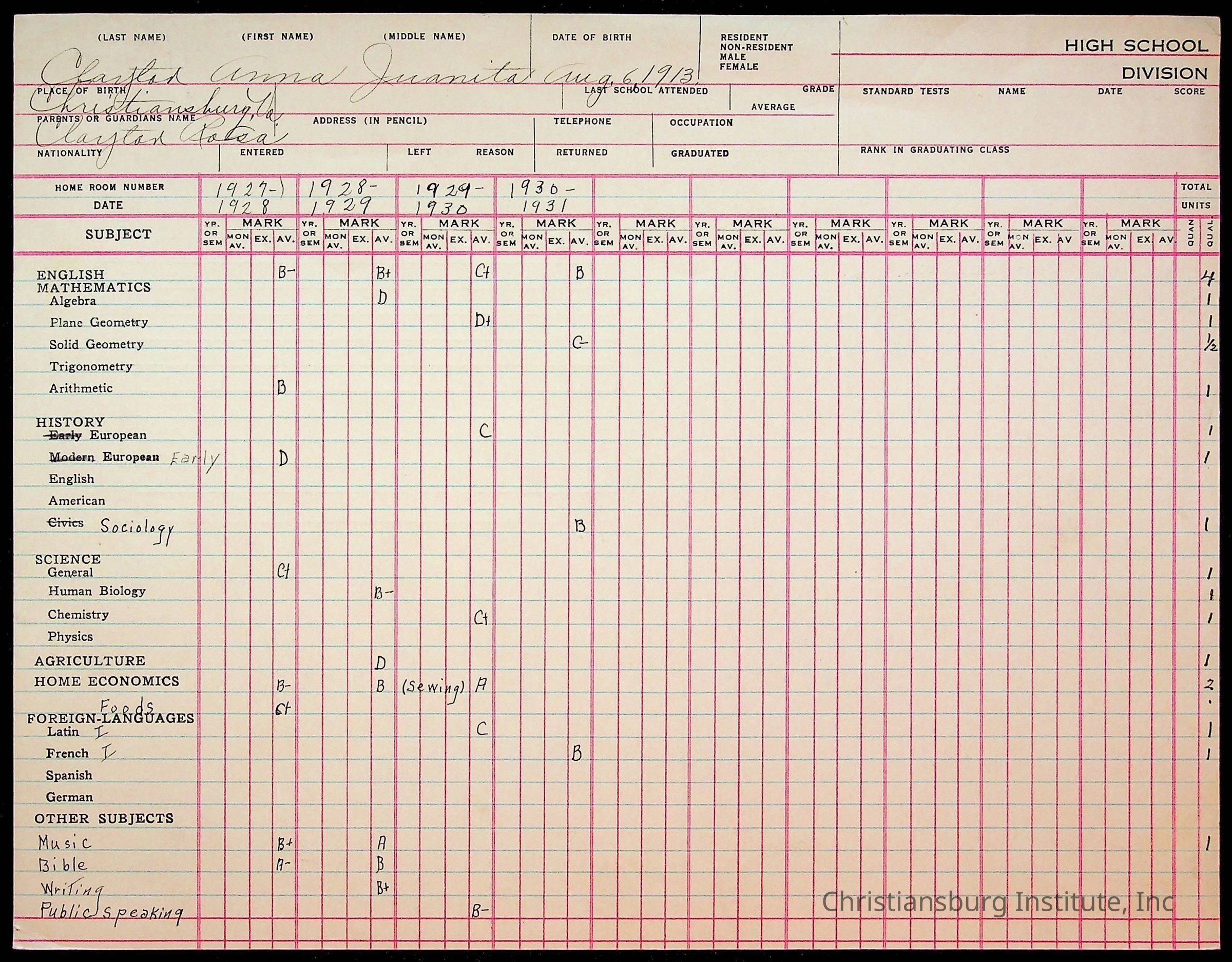 Montgomery County Public Schools, Christiansburg Institute, Clayton, Anna Juanita