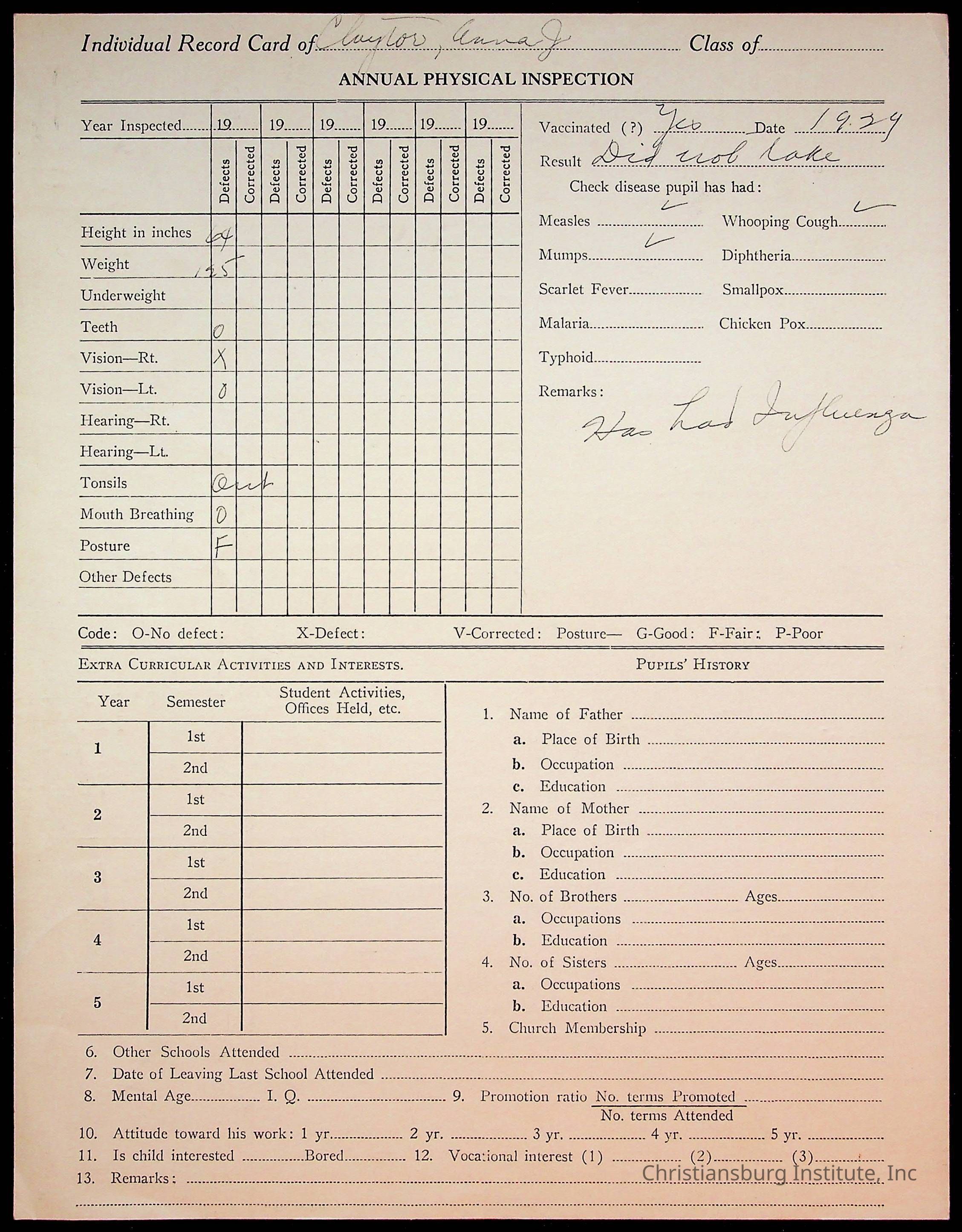 The student file for the Christiansburg Institute student, Anna Juanita Clayton circa 1920s.