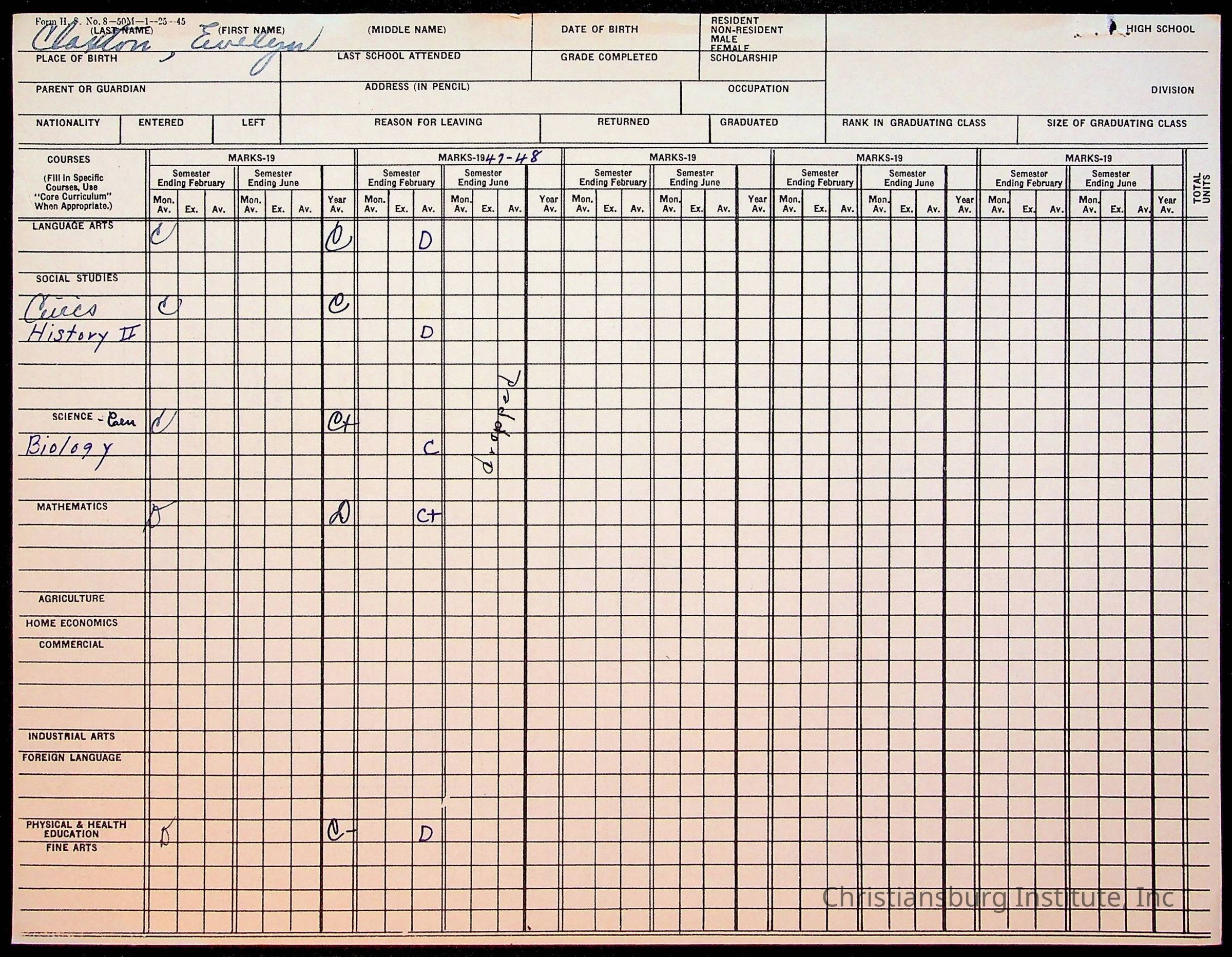 The student file for the Christiansburg Institute student, Evelyn Clayton circa 1940s.