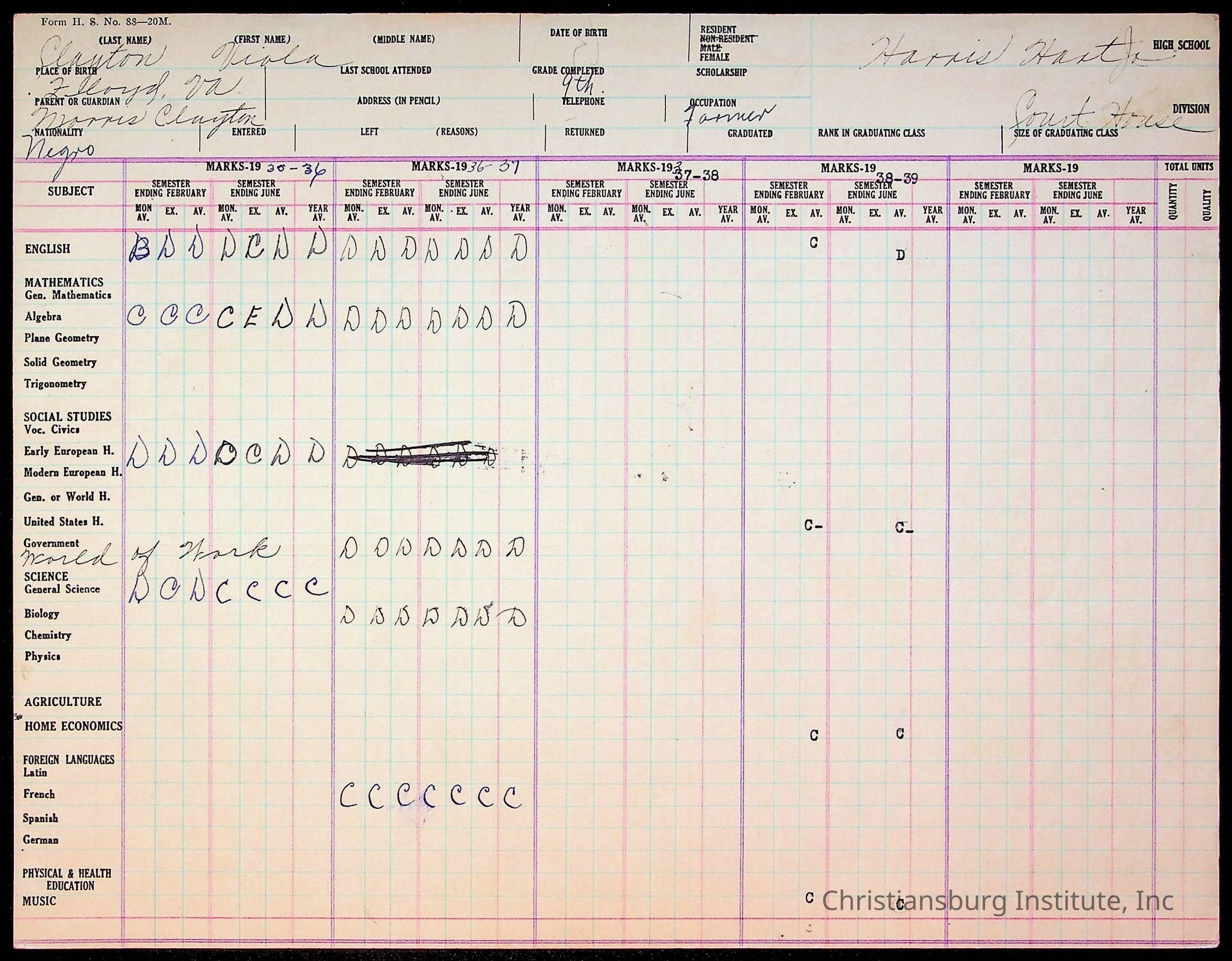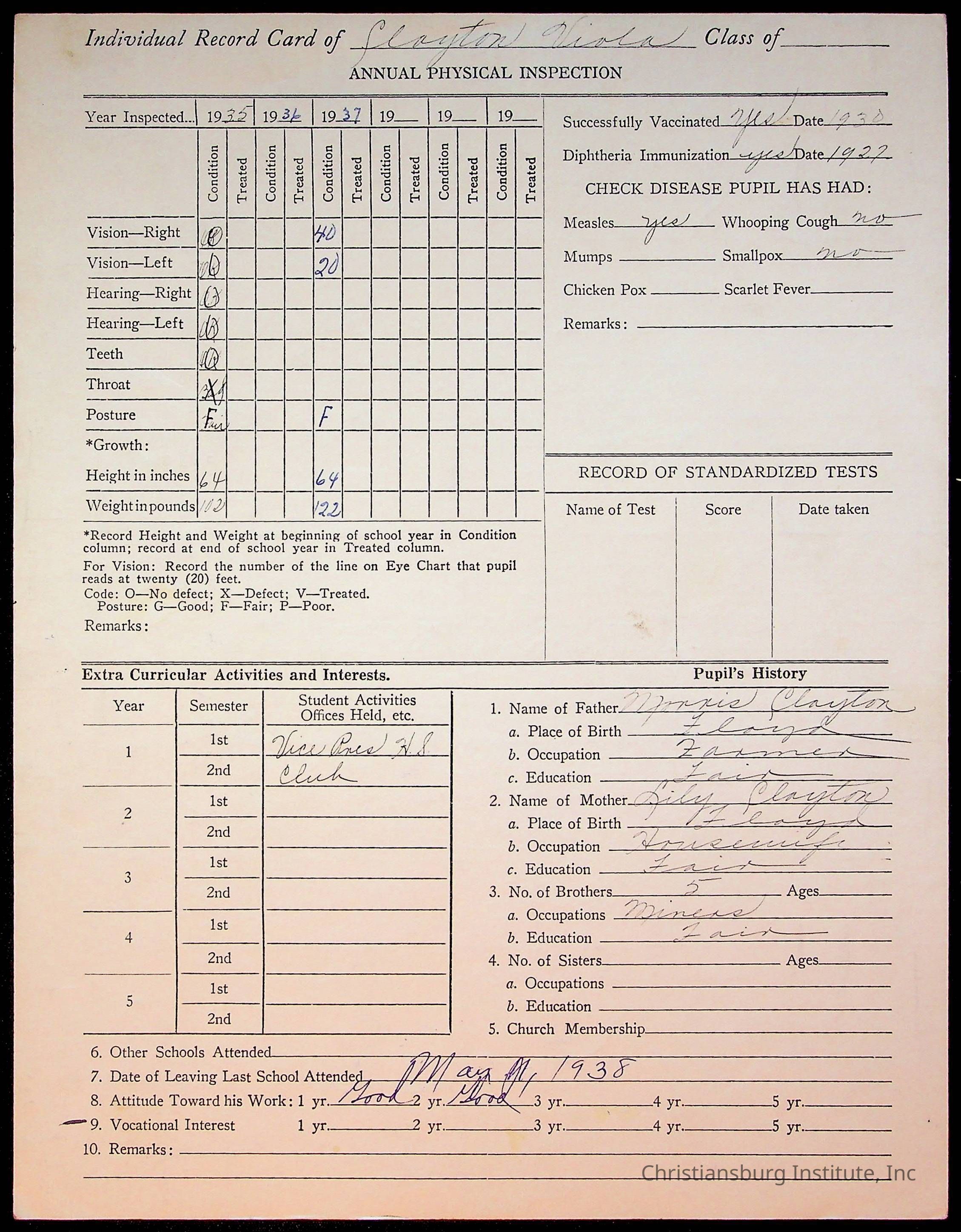 The student file for the Christiansburg Institute student, Viola Clayton circa 1930s.