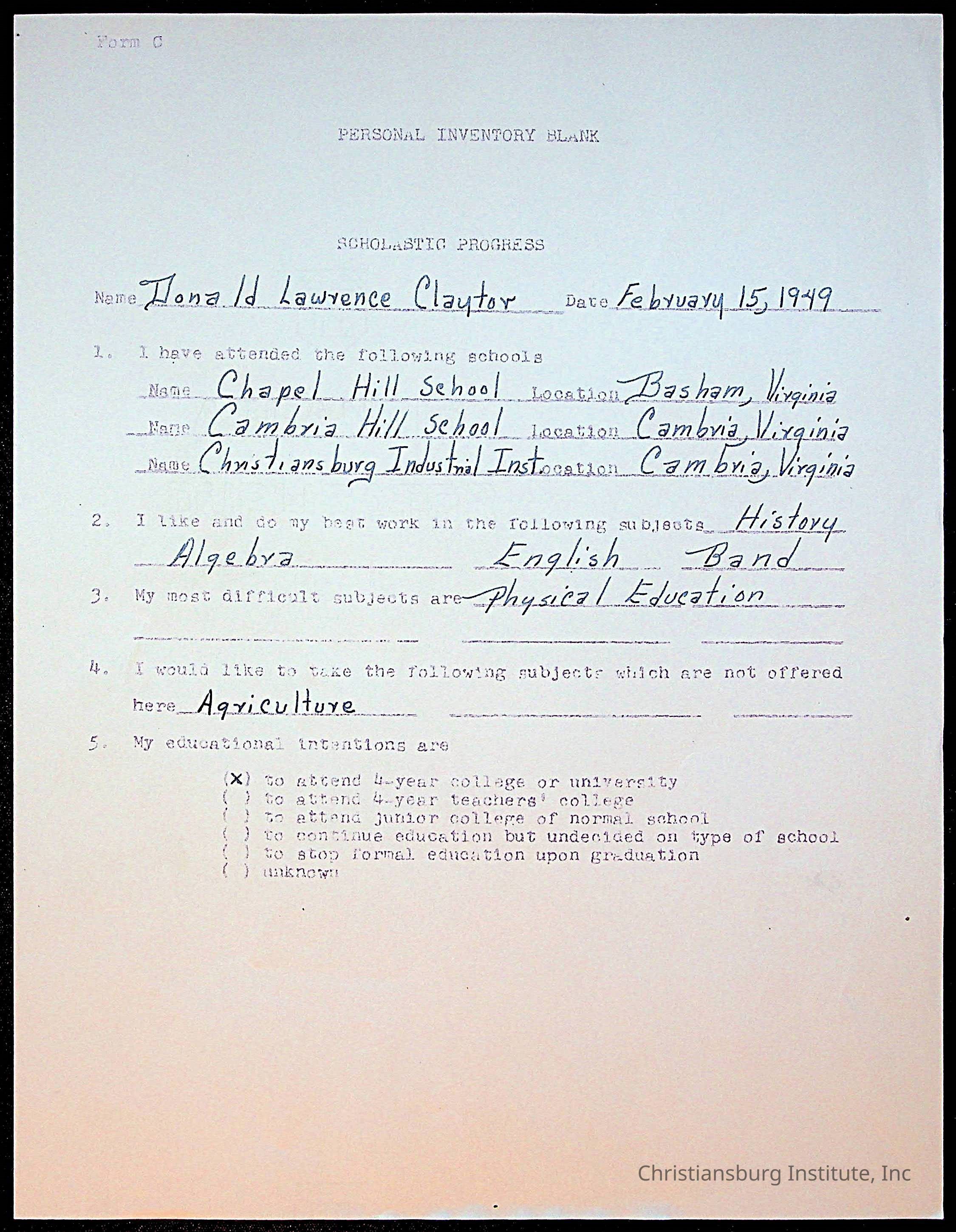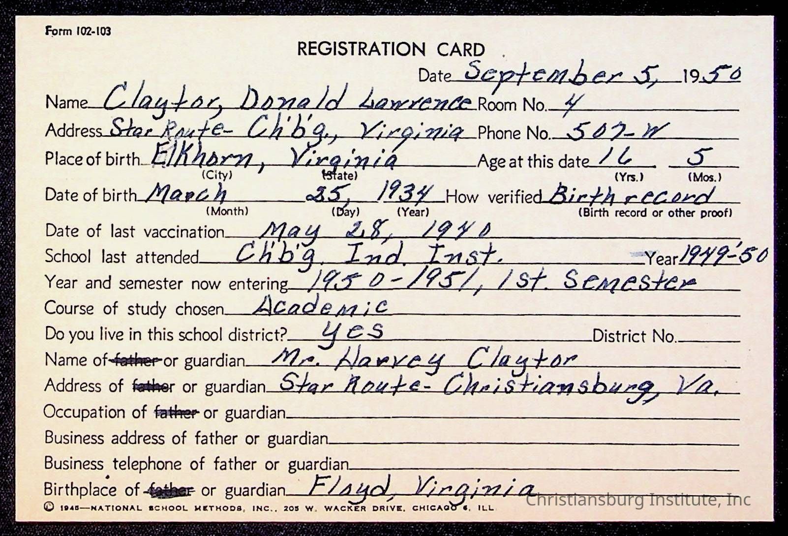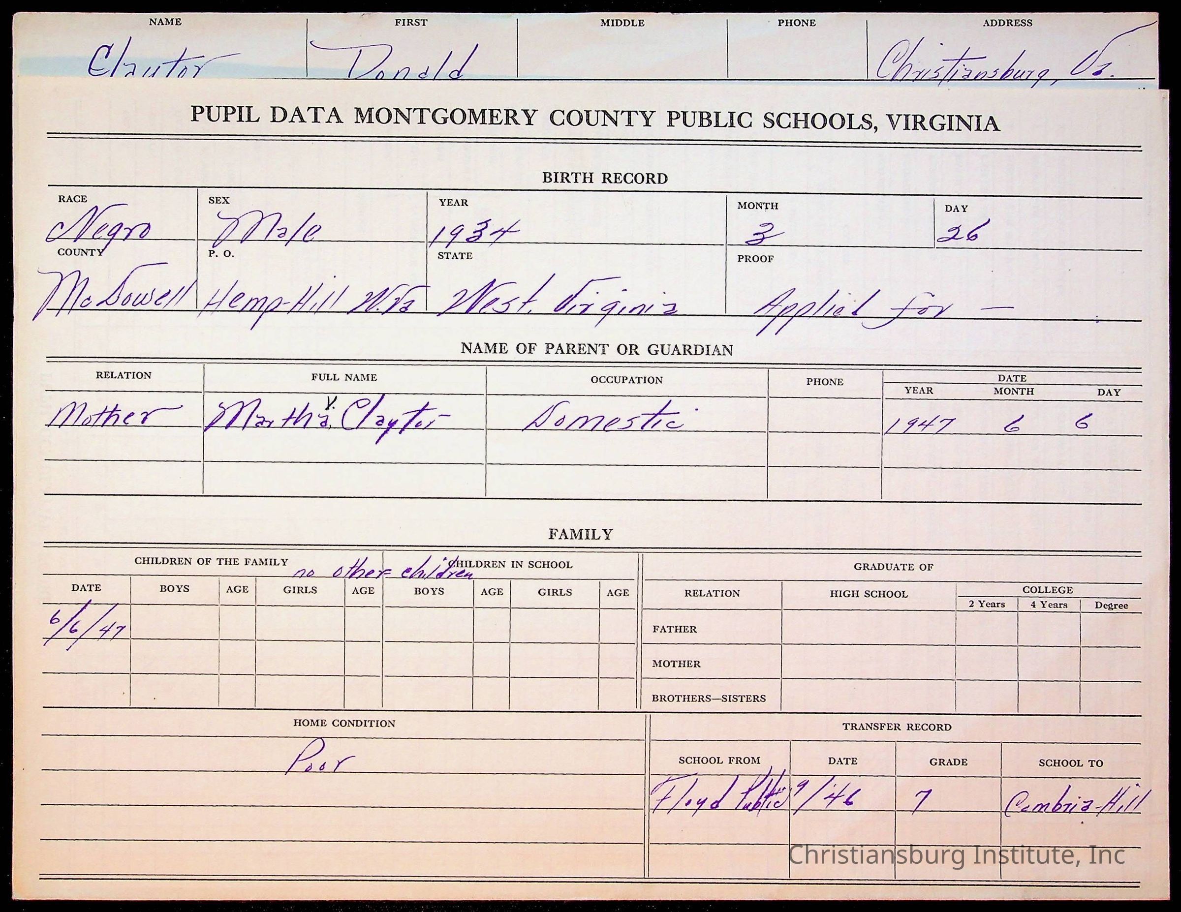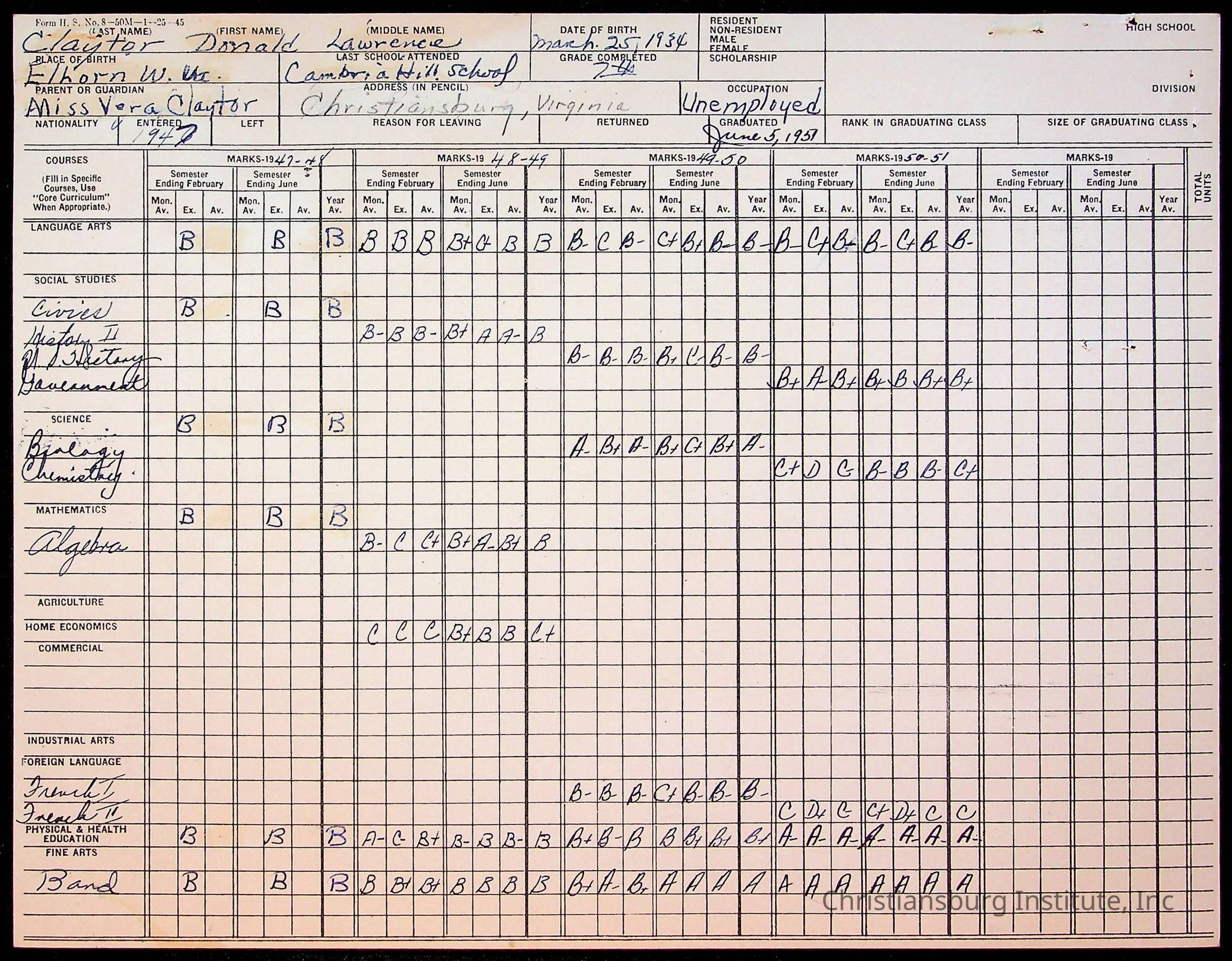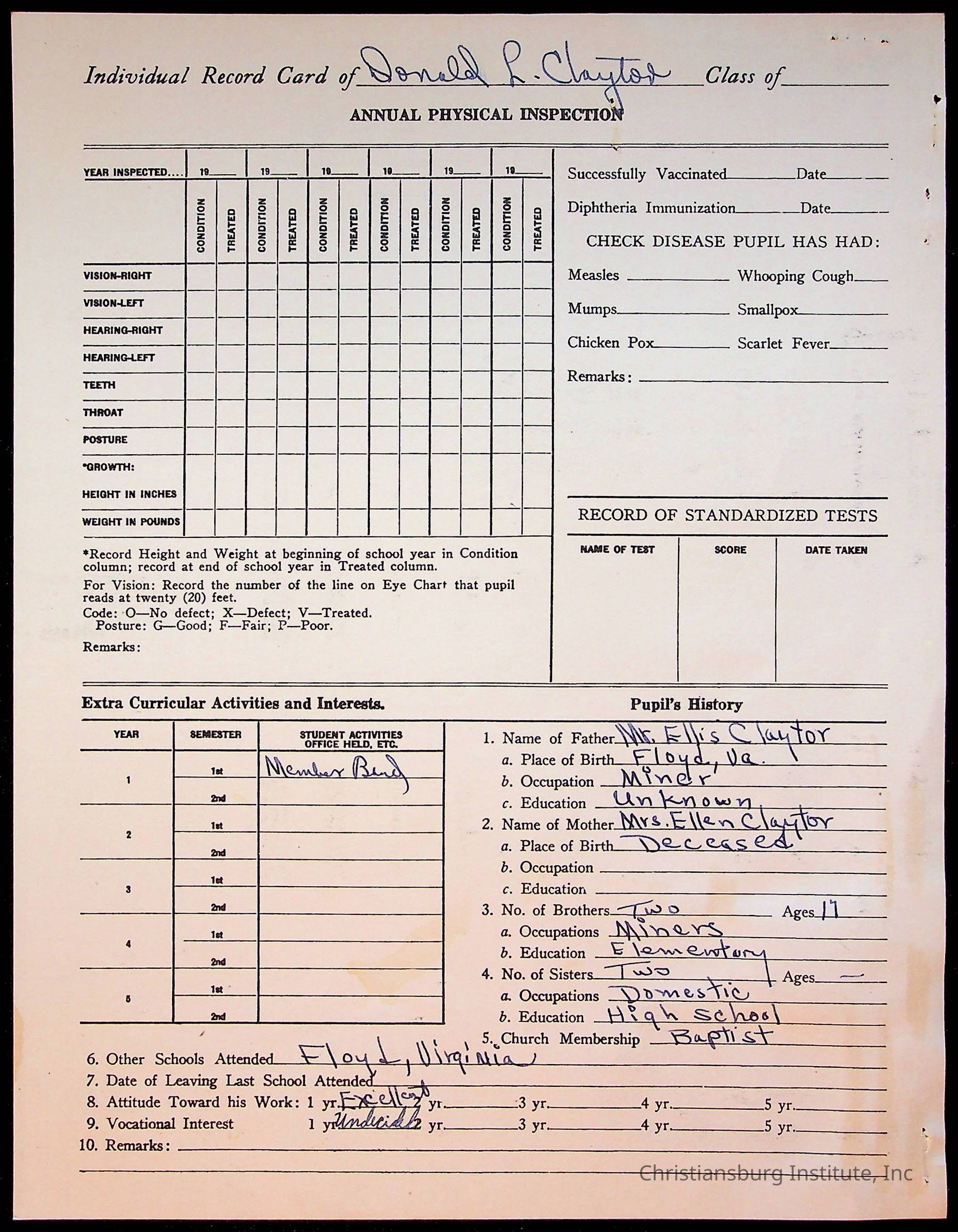 The student file for the Christiansburg Institute student, Donald L. Claytor circa 1940s.