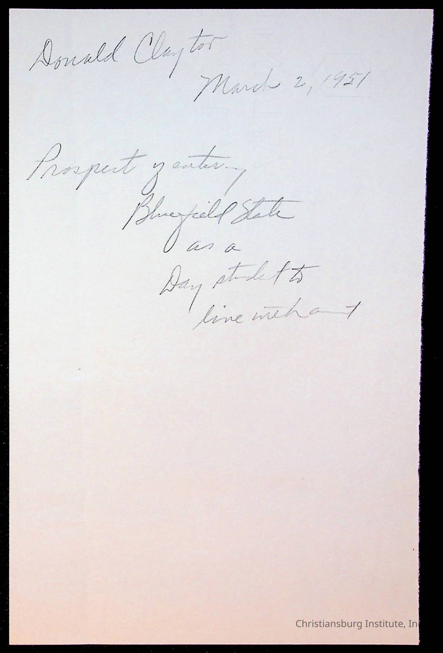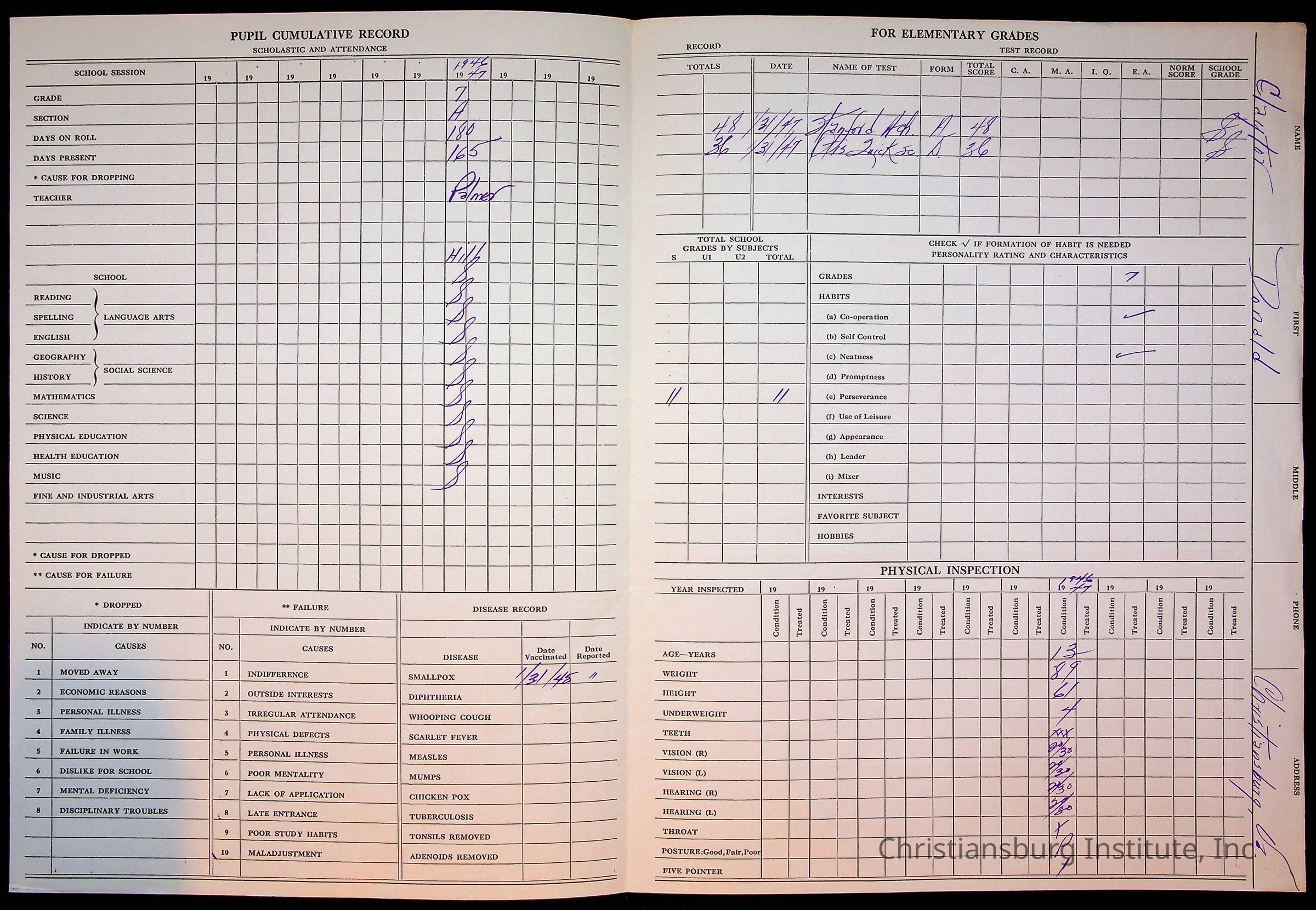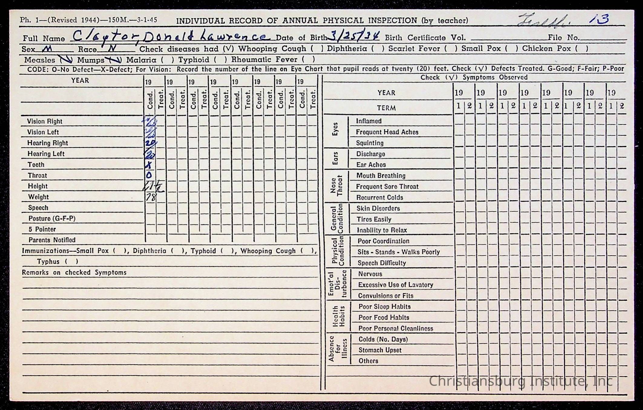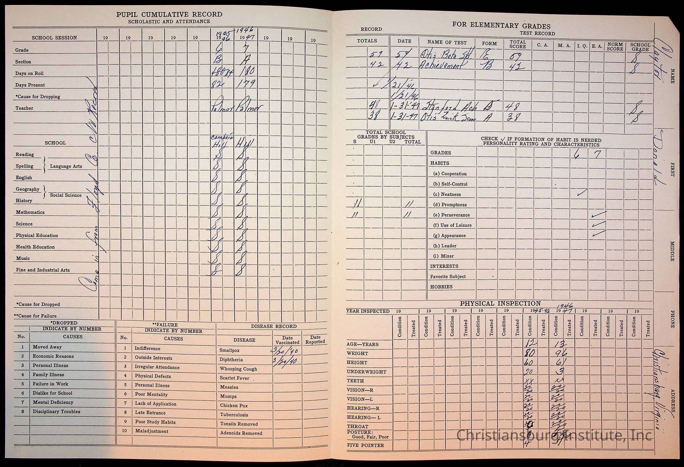 The student file for the Christiansburg Institute student, Donald L. Claytor circa 1940s.