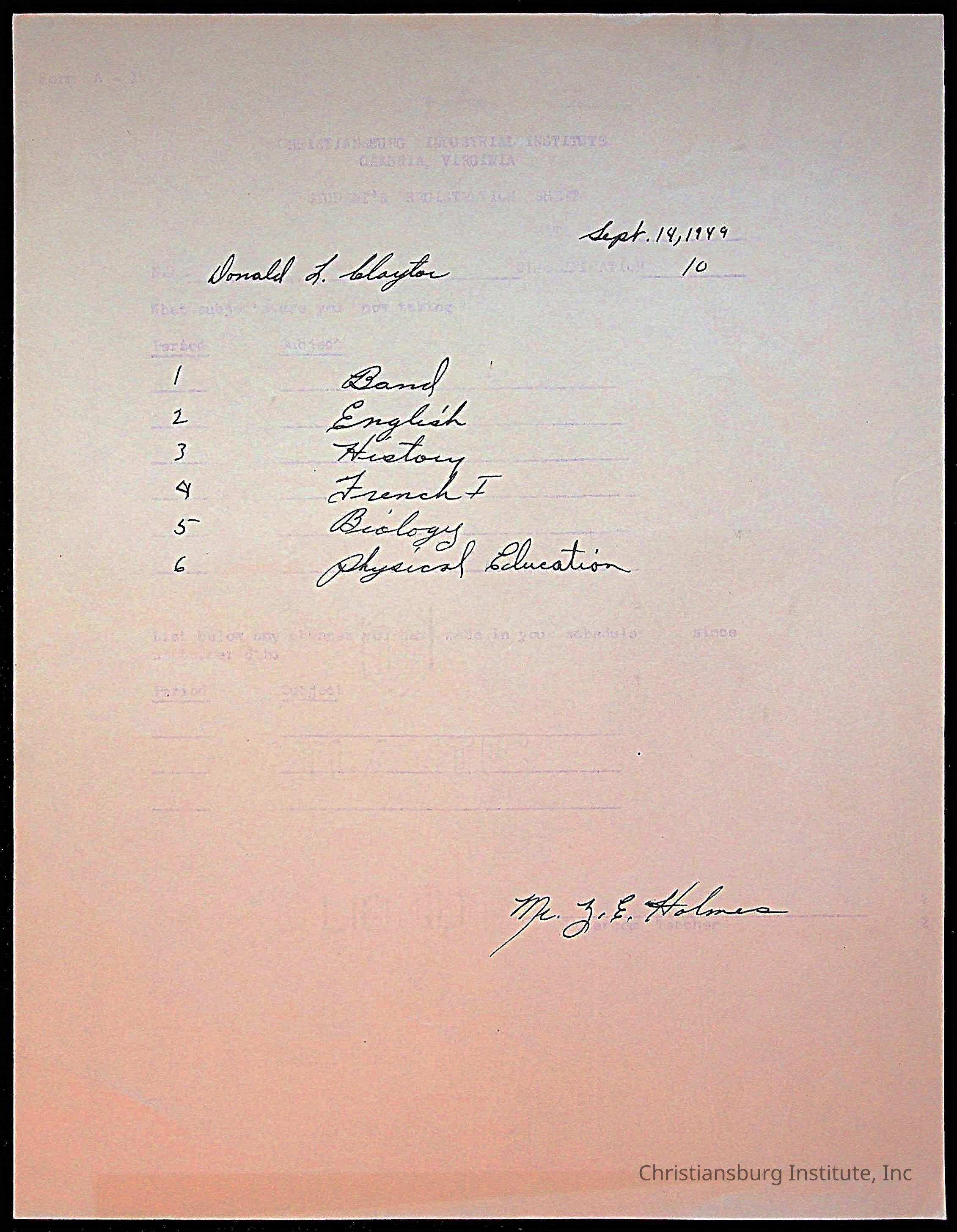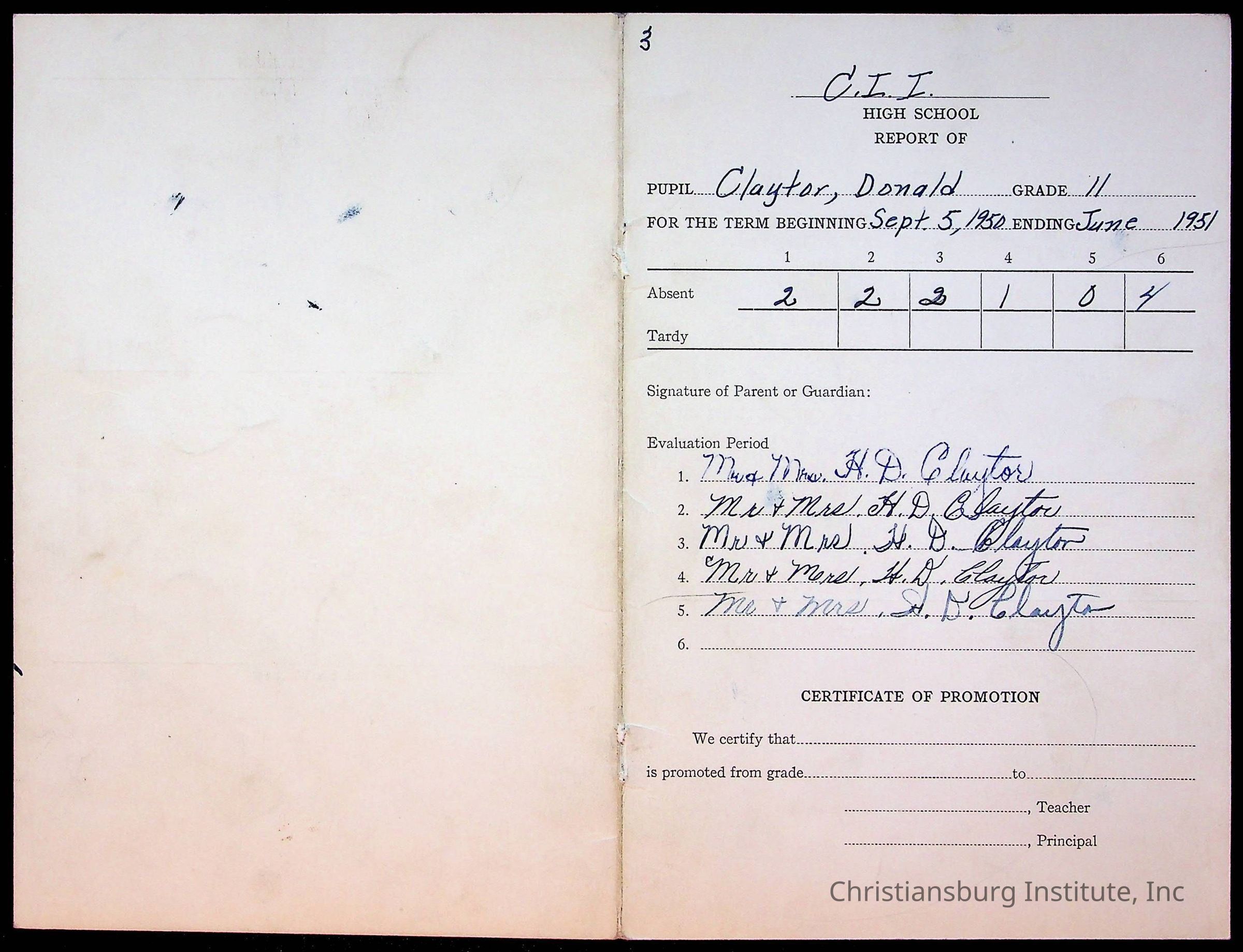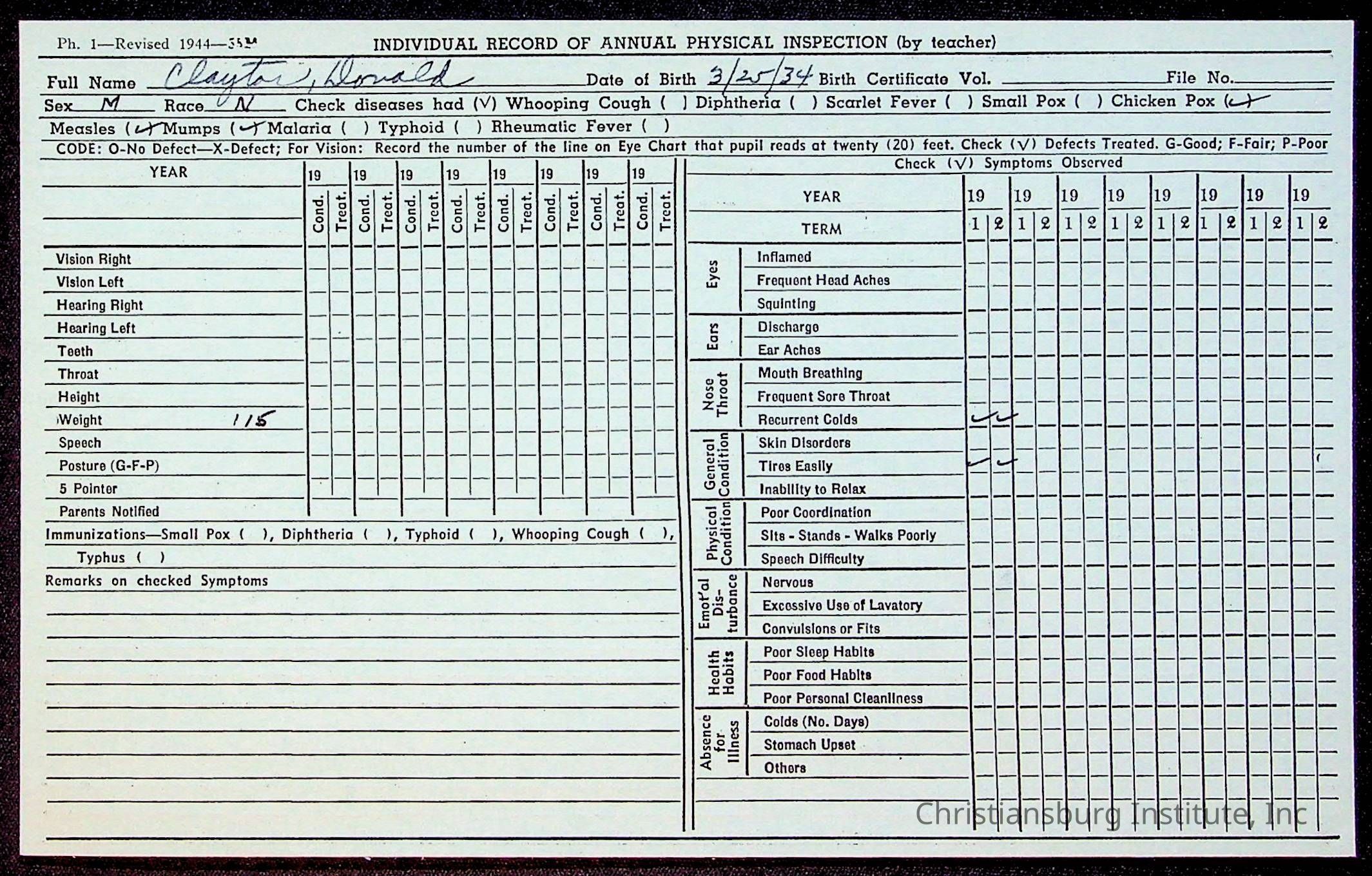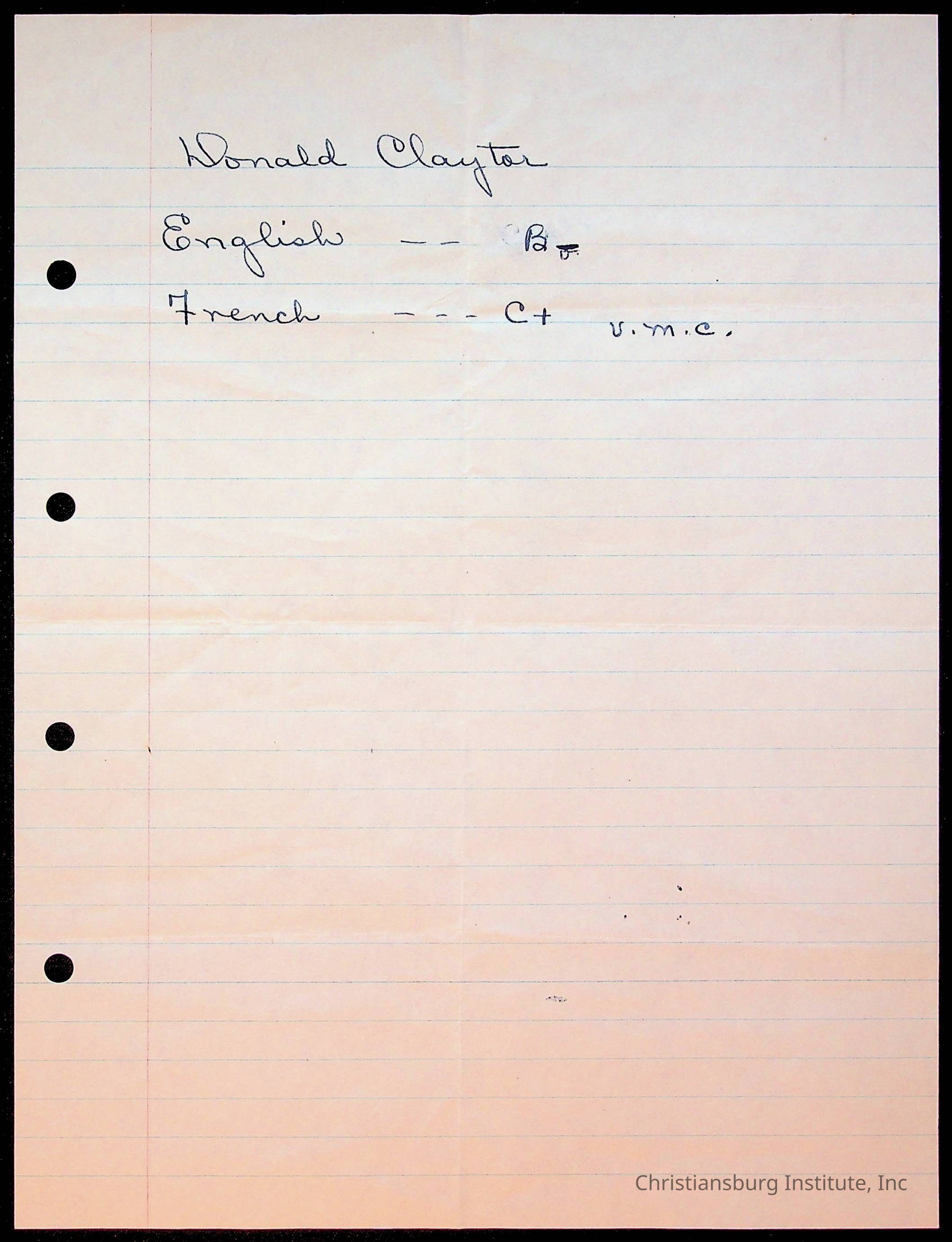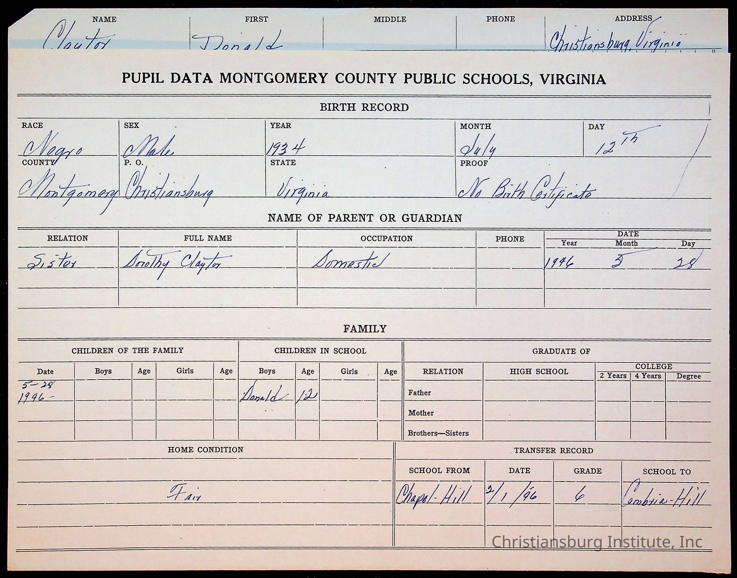 The student file for the Christiansburg Institute student, Donald L. Claytor circa 1940s.