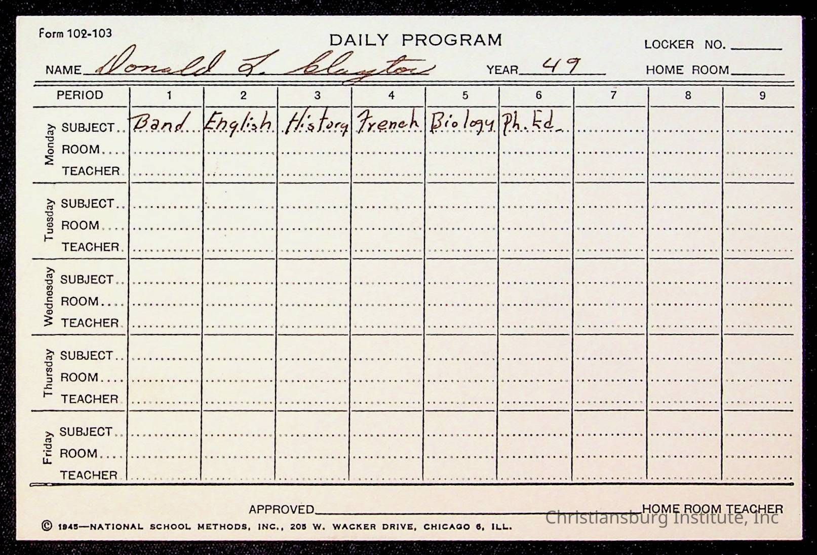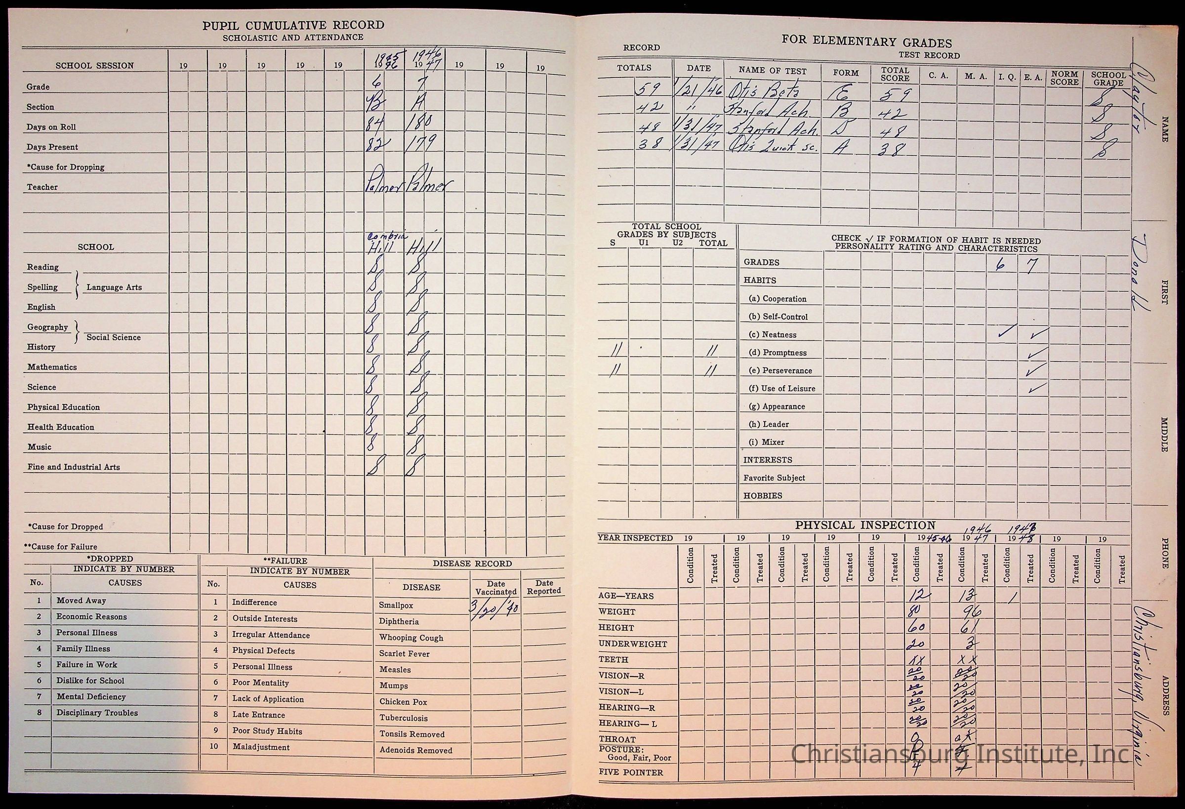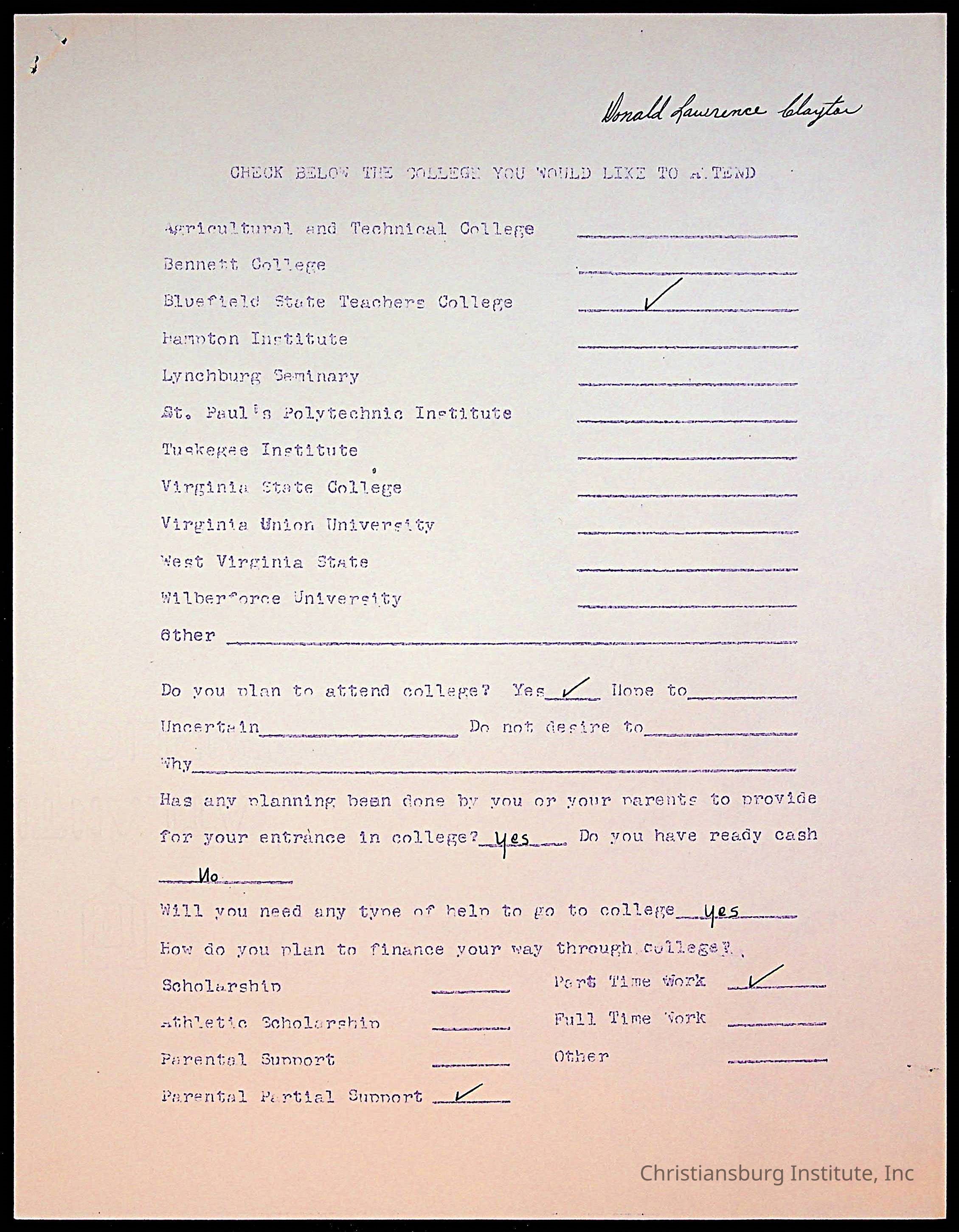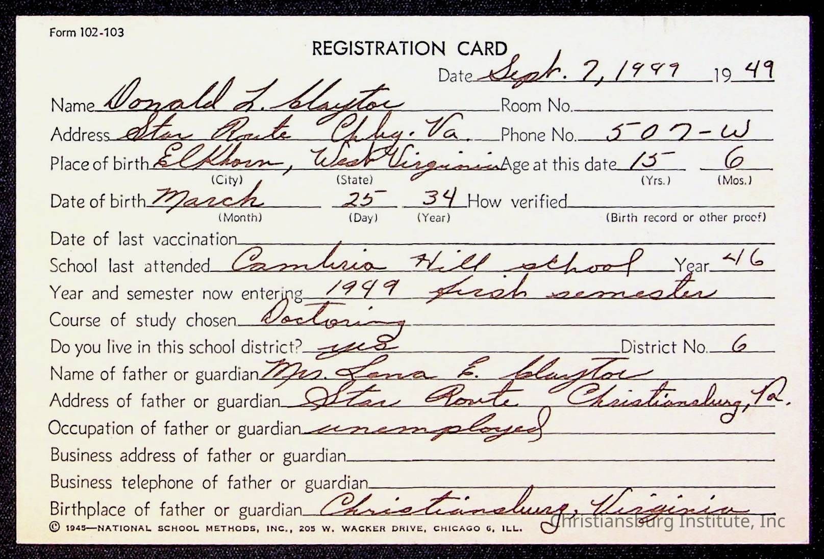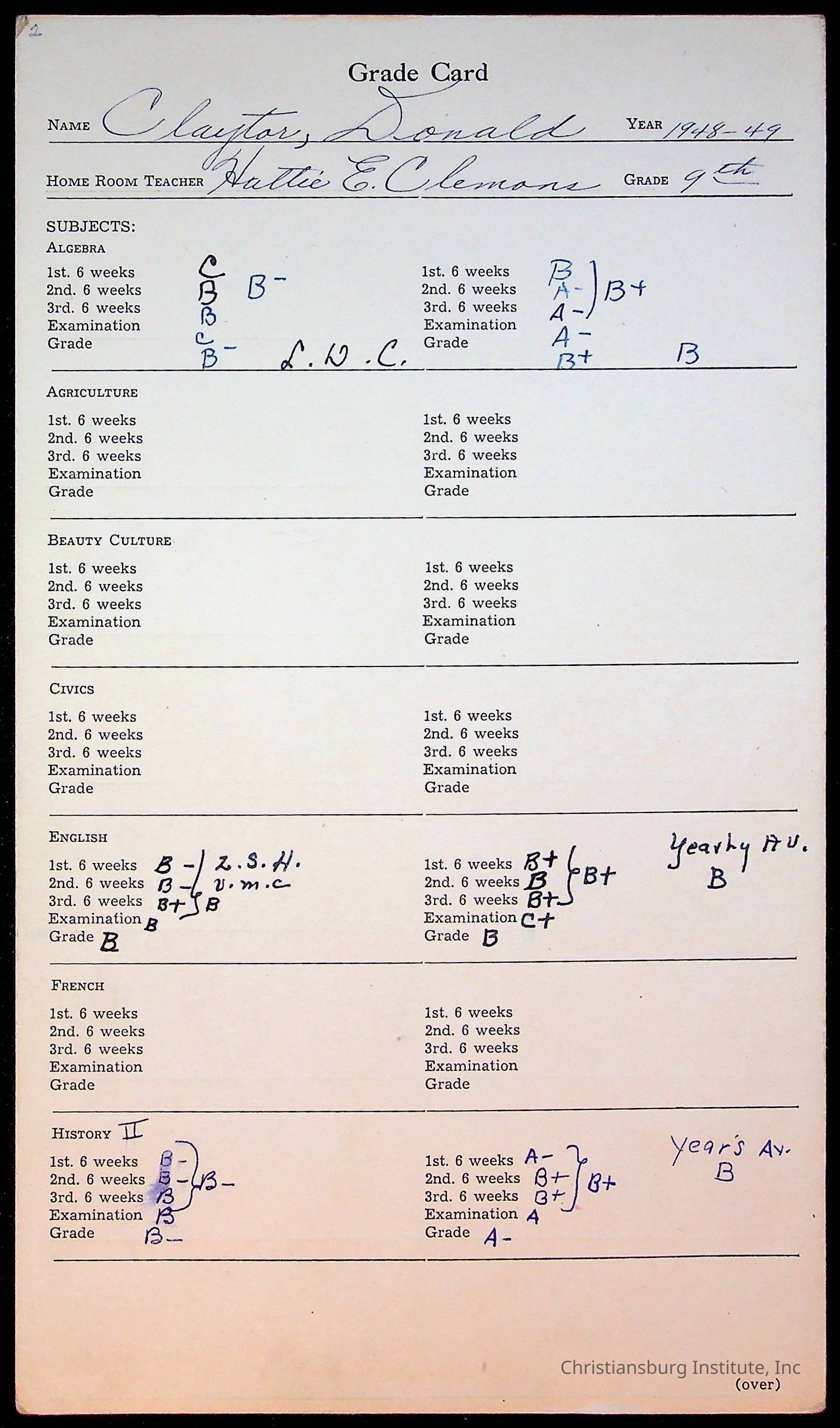 The student file for the Christiansburg Institute student, Donald L. Claytor circa 1940s.