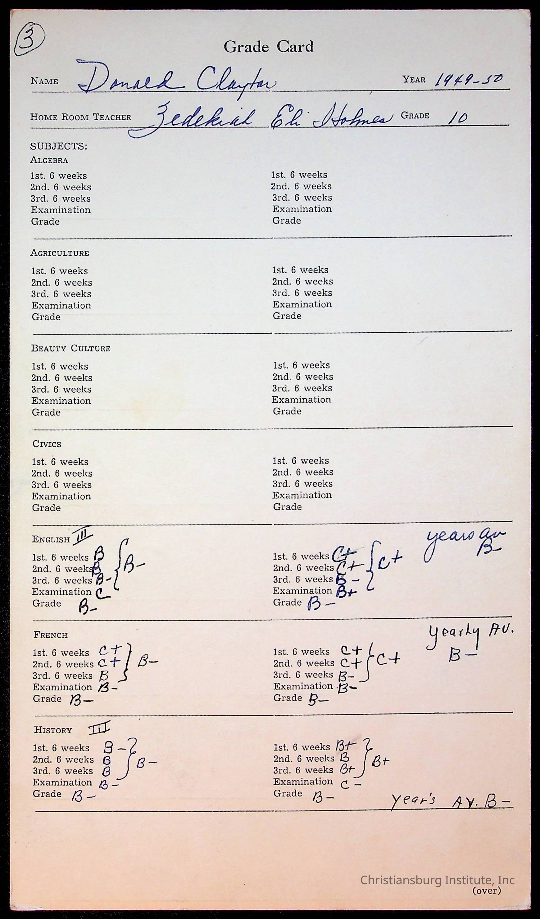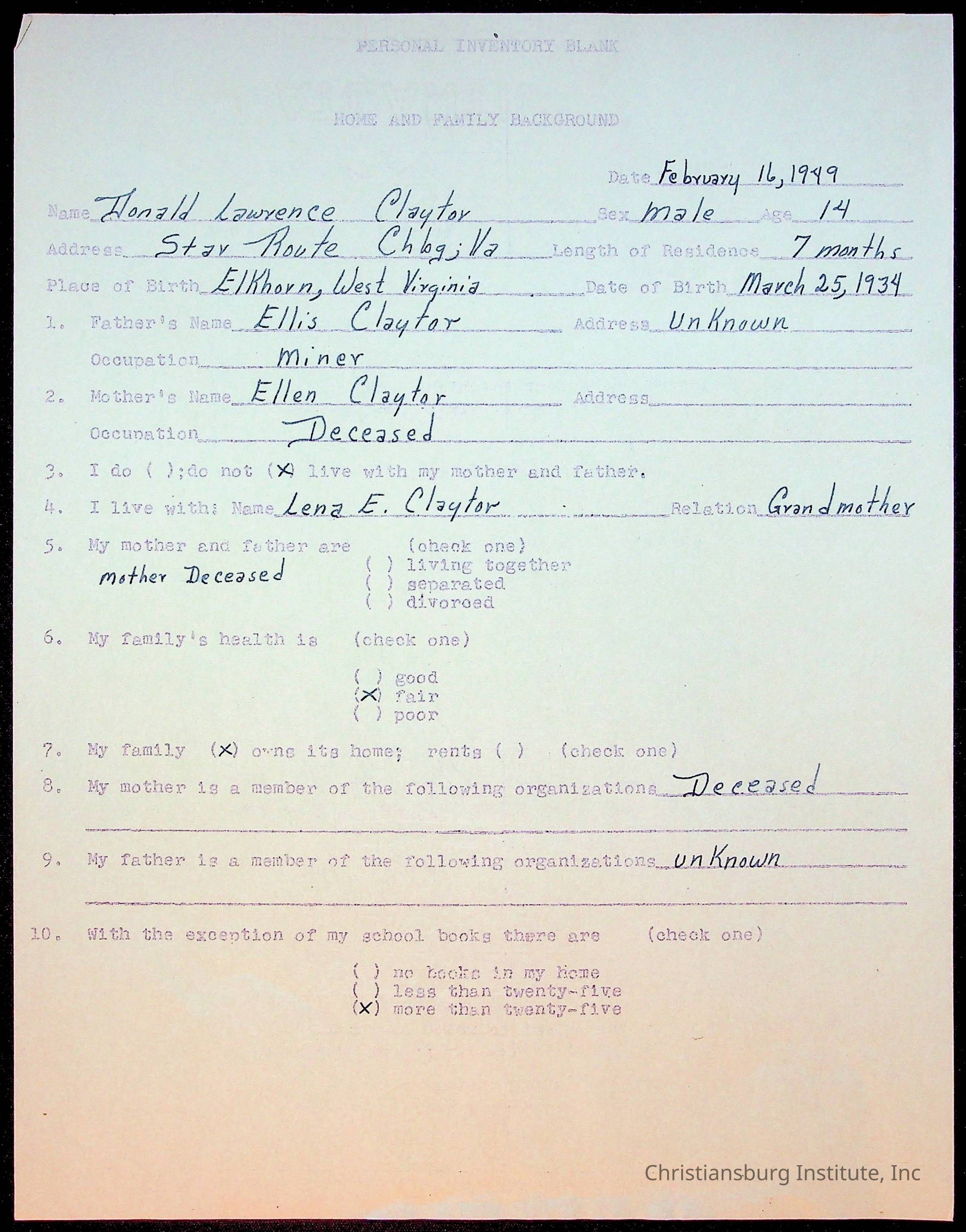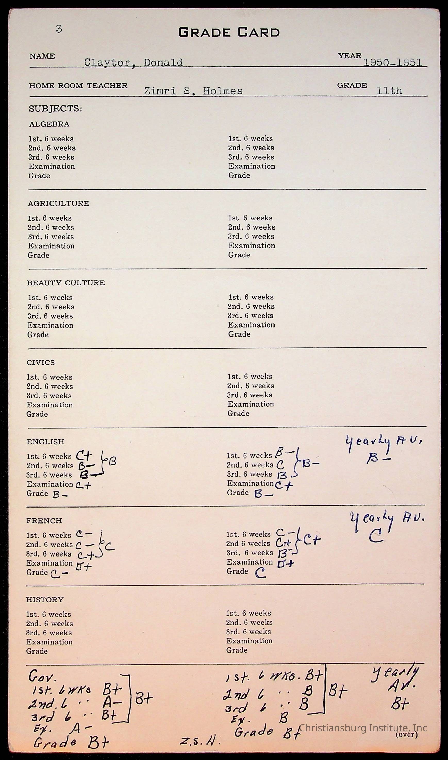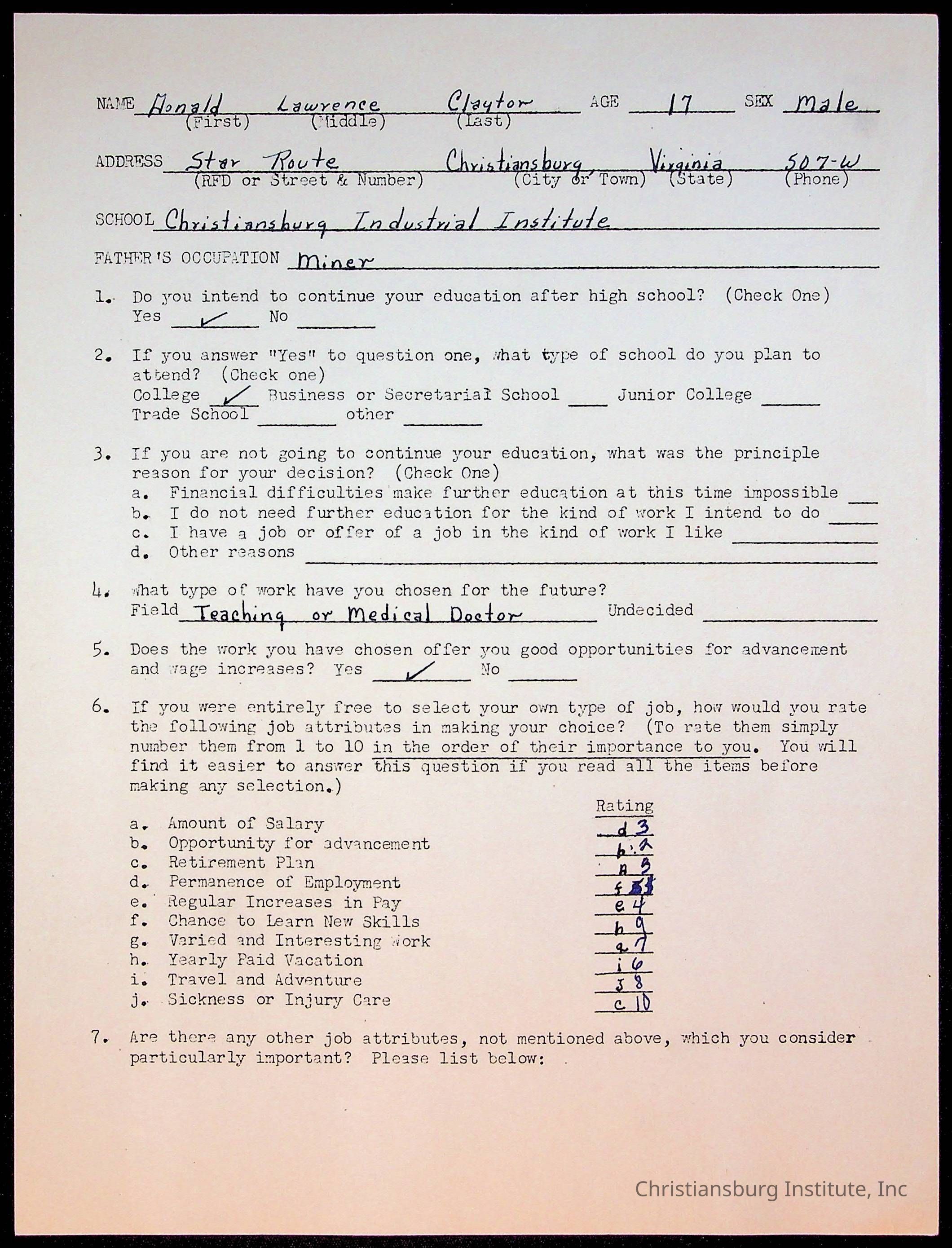 The student file for the Christiansburg Institute student, Donald L. Claytor circa 1940s.