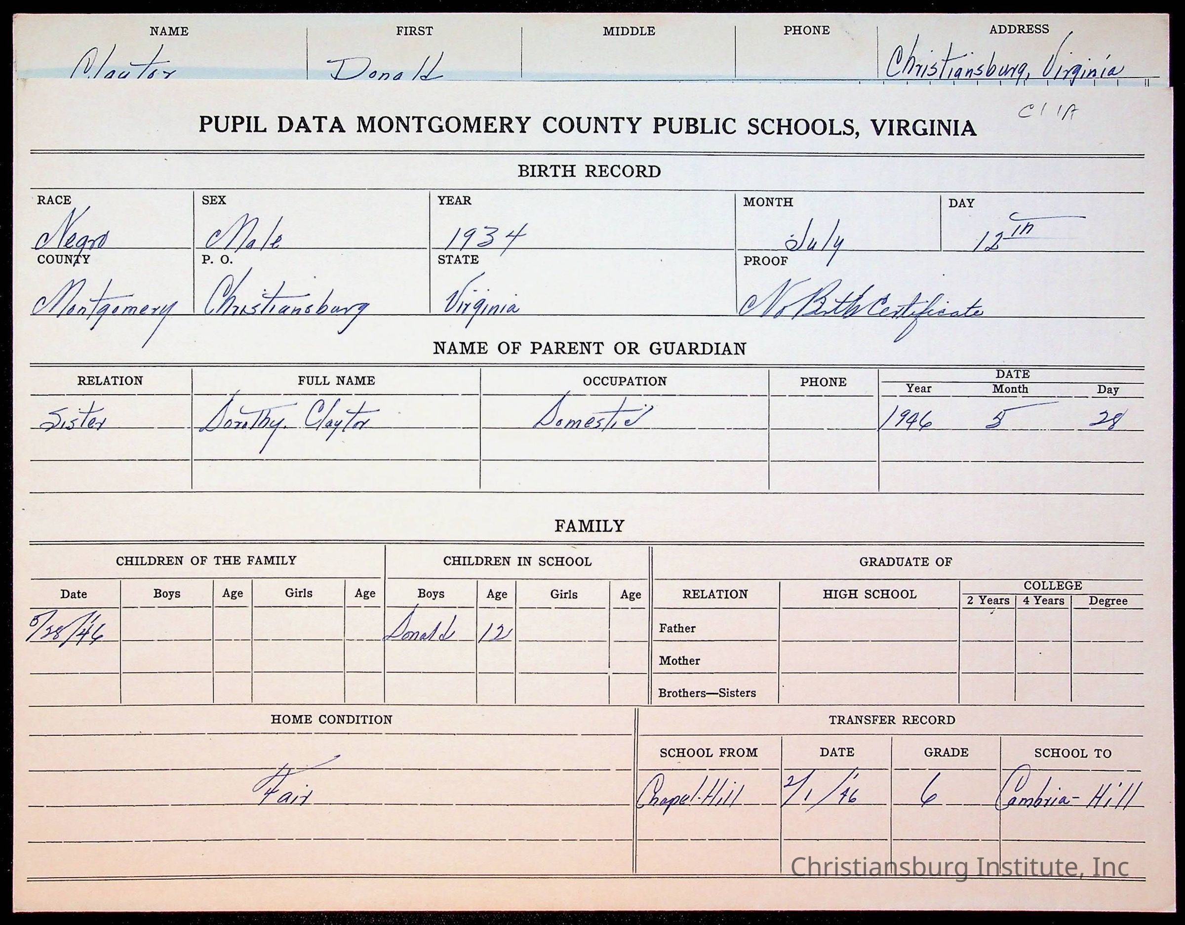 Montgomery County Public Schools, Christiansburg Institute, Claytor, Donald L.