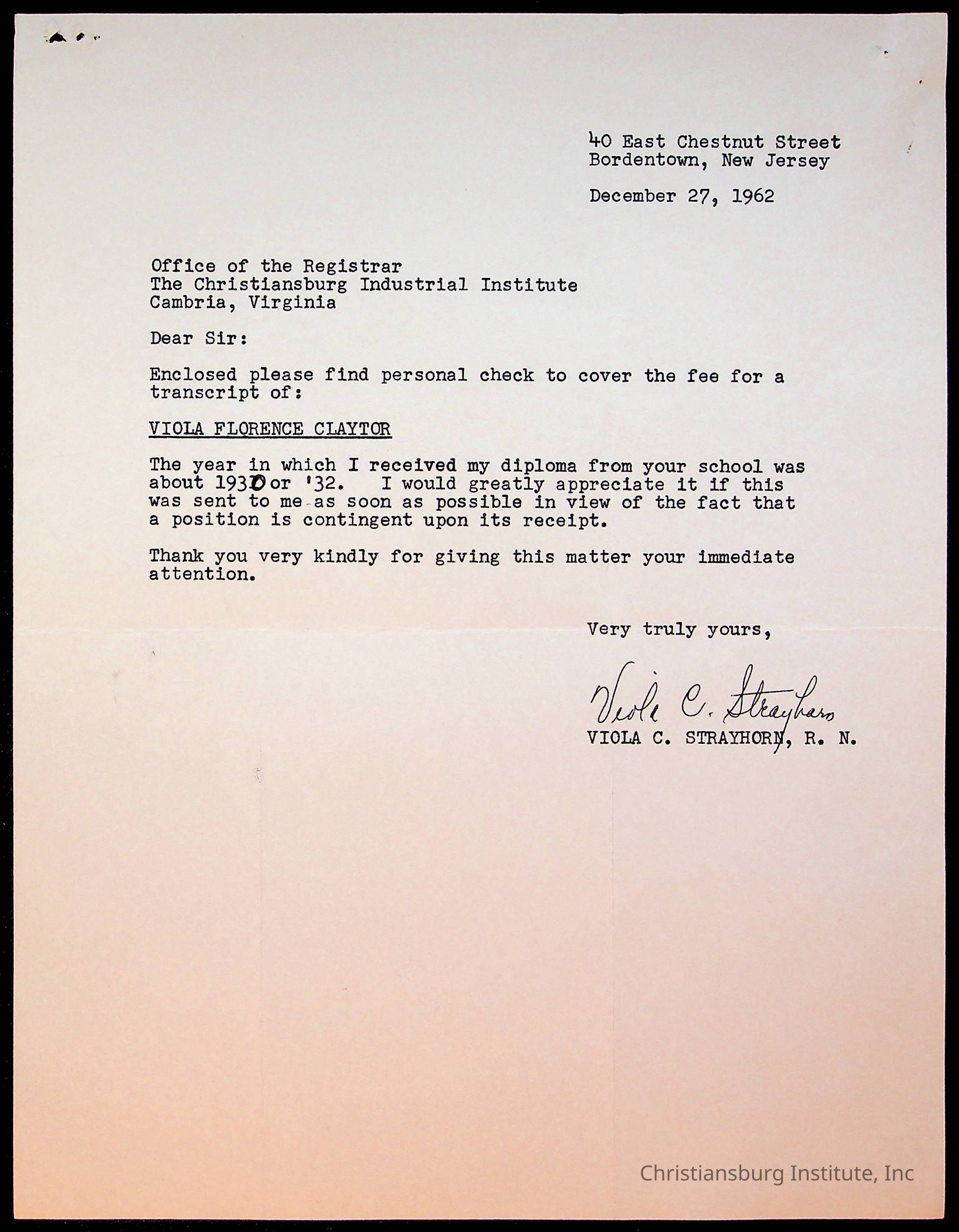 The student file for the Christiansburg Institute student, Viola Florence Claytor circa 1920s.
