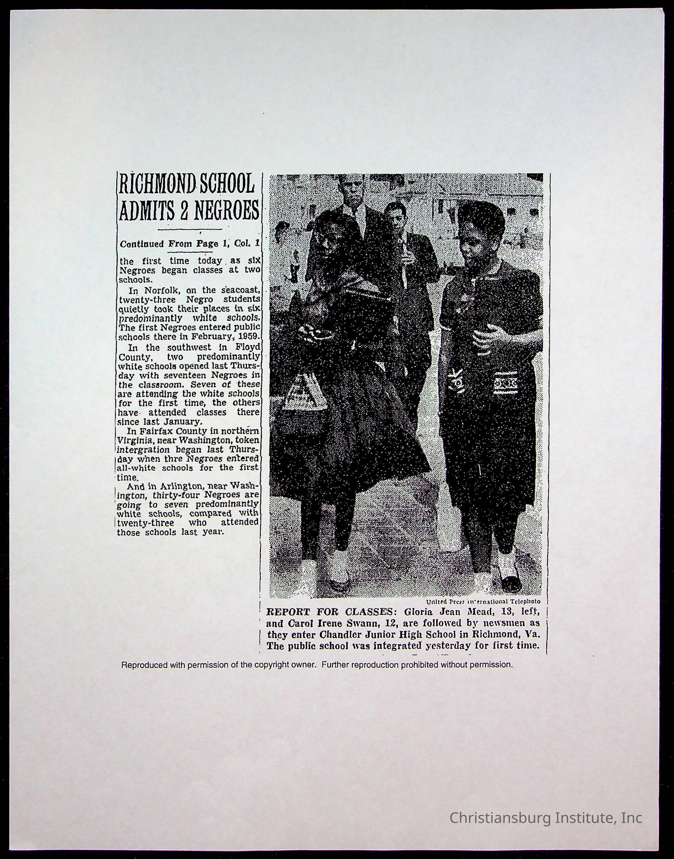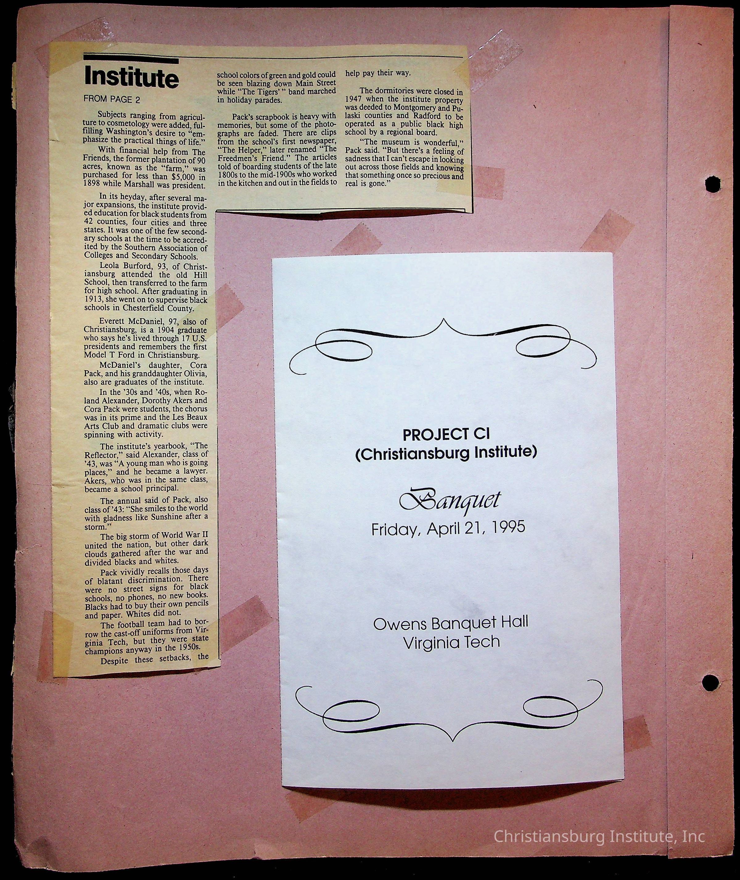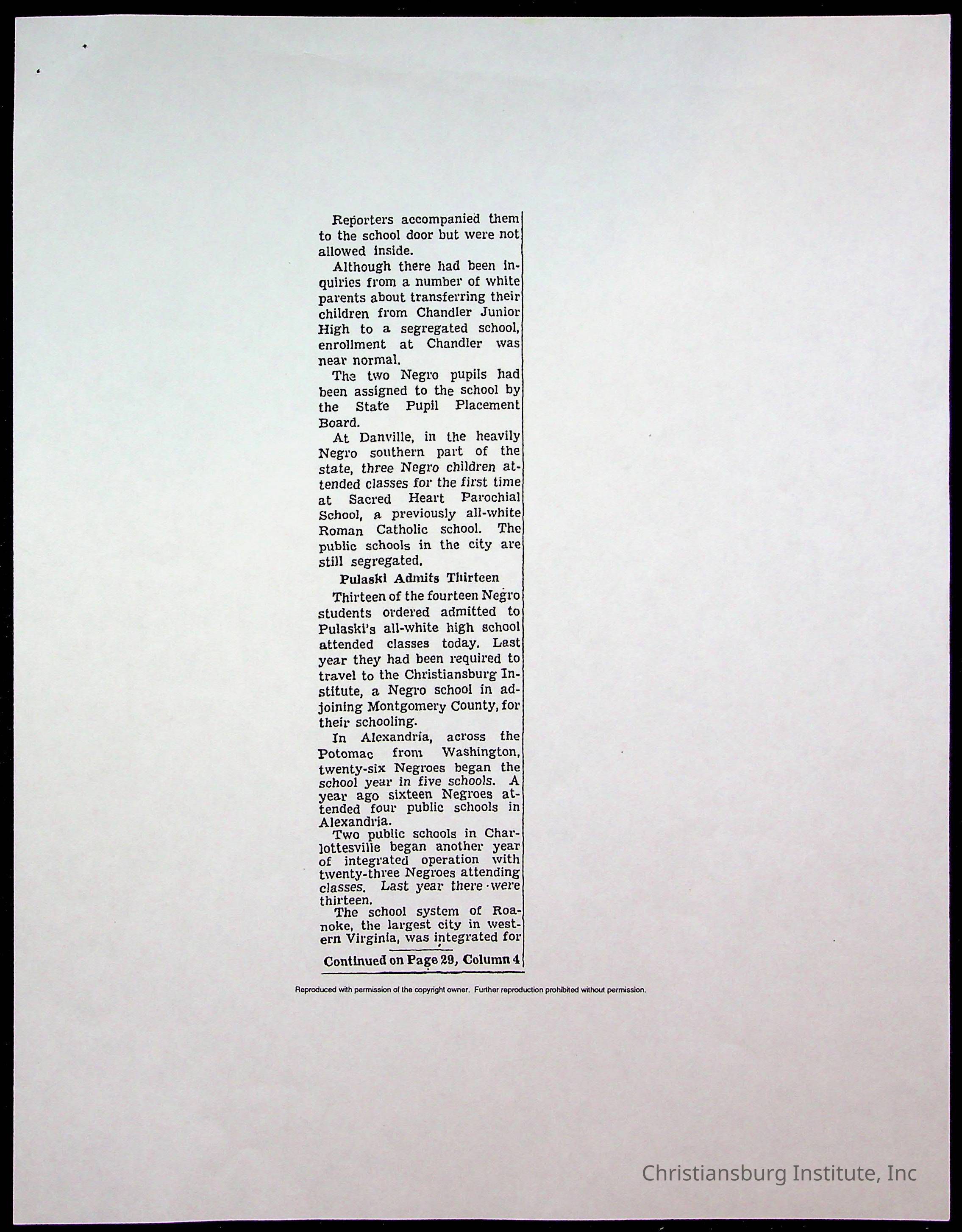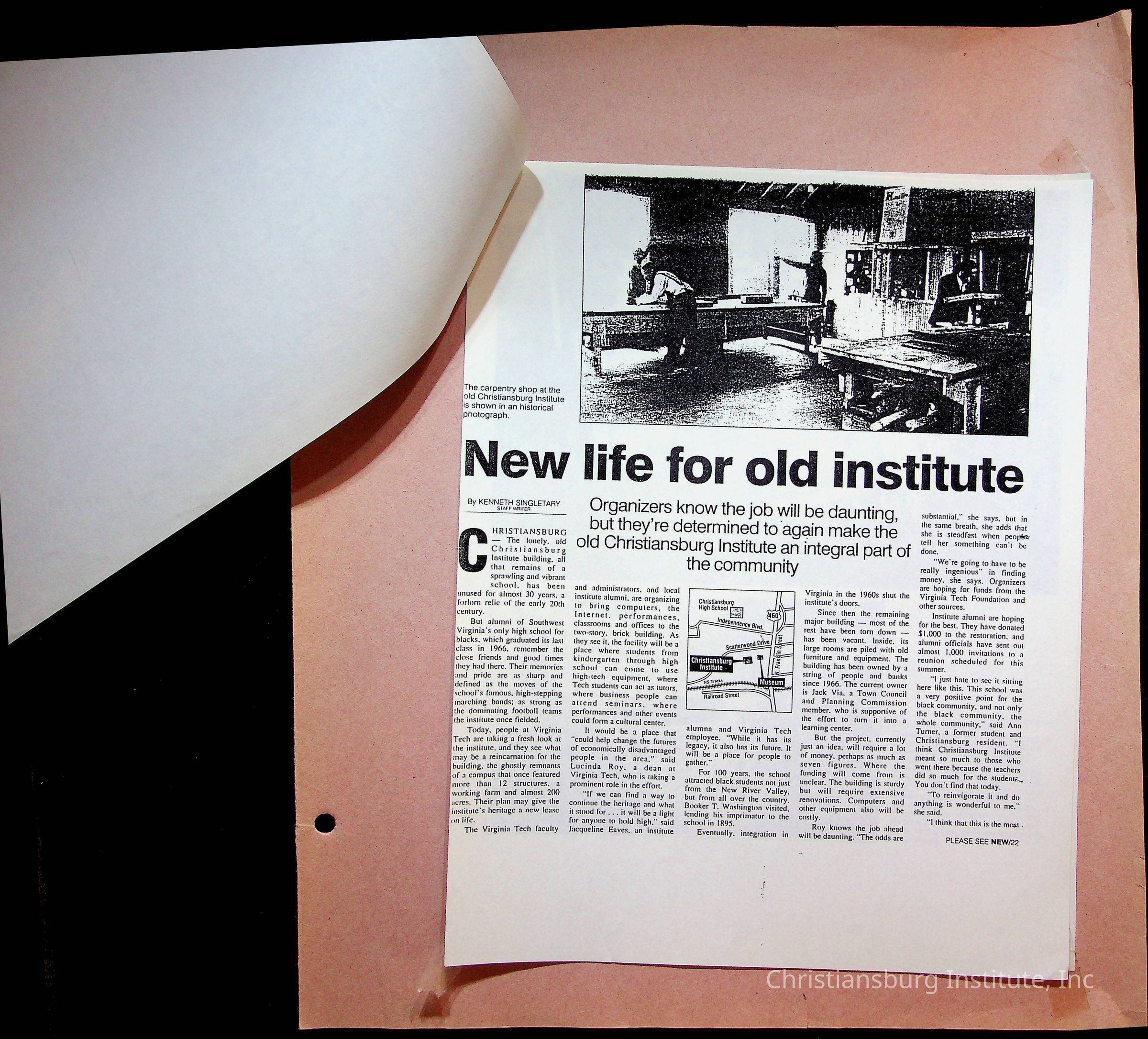 An archive of publications and materials that discuss the closure and sale of Christiansburg Institute in the year 1966 as well as articles about desegregation in Virginia, materials are dated 1951-1995.