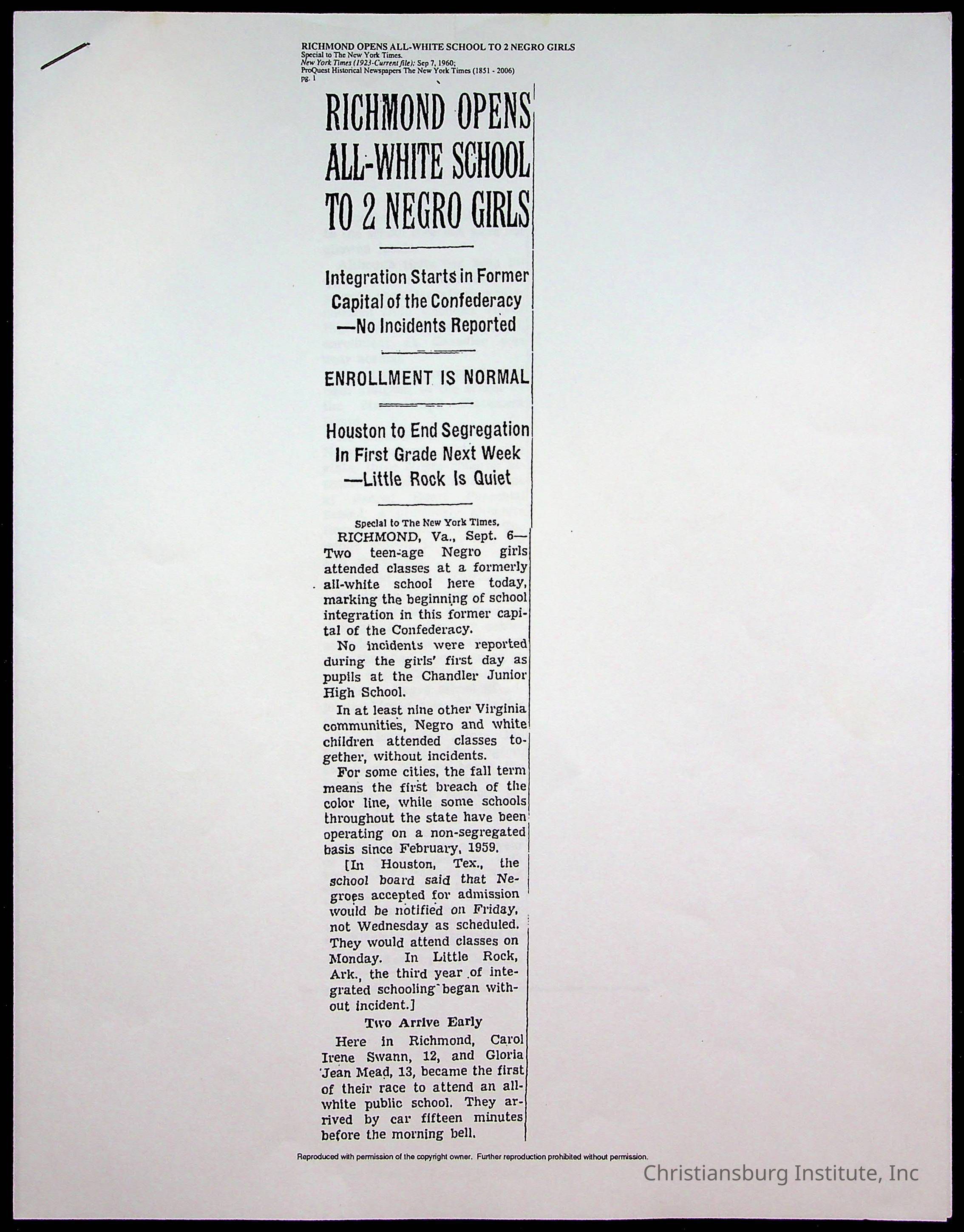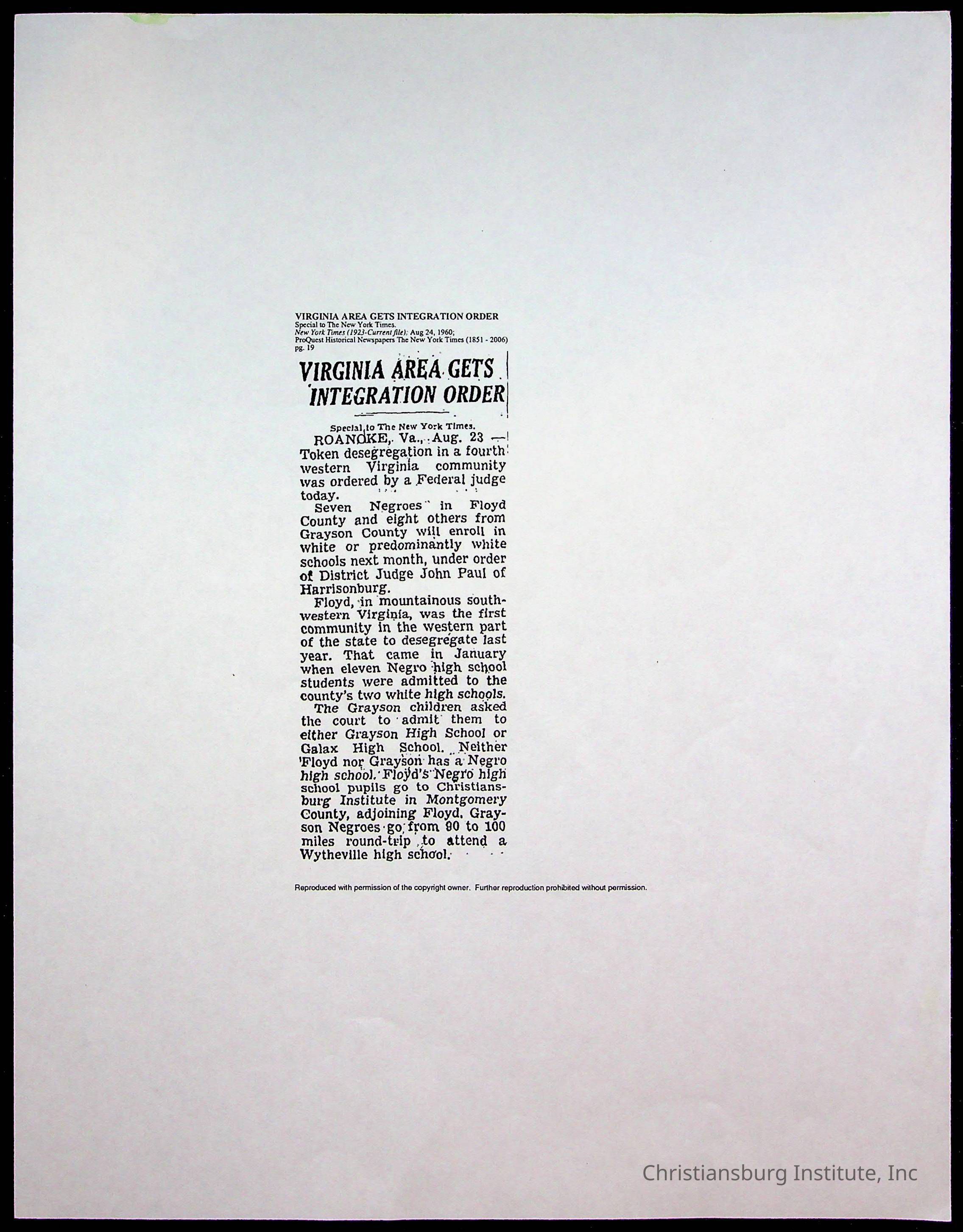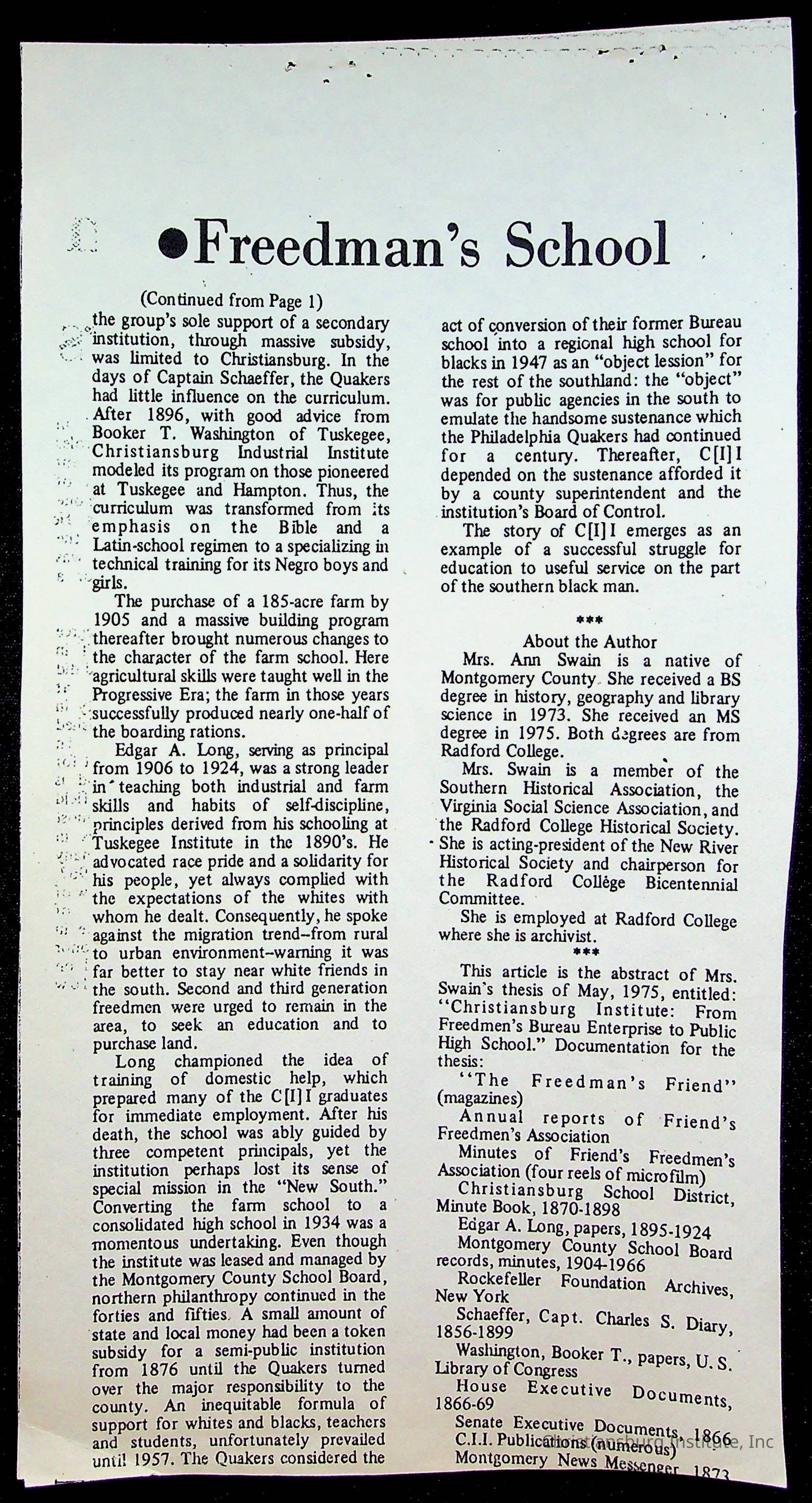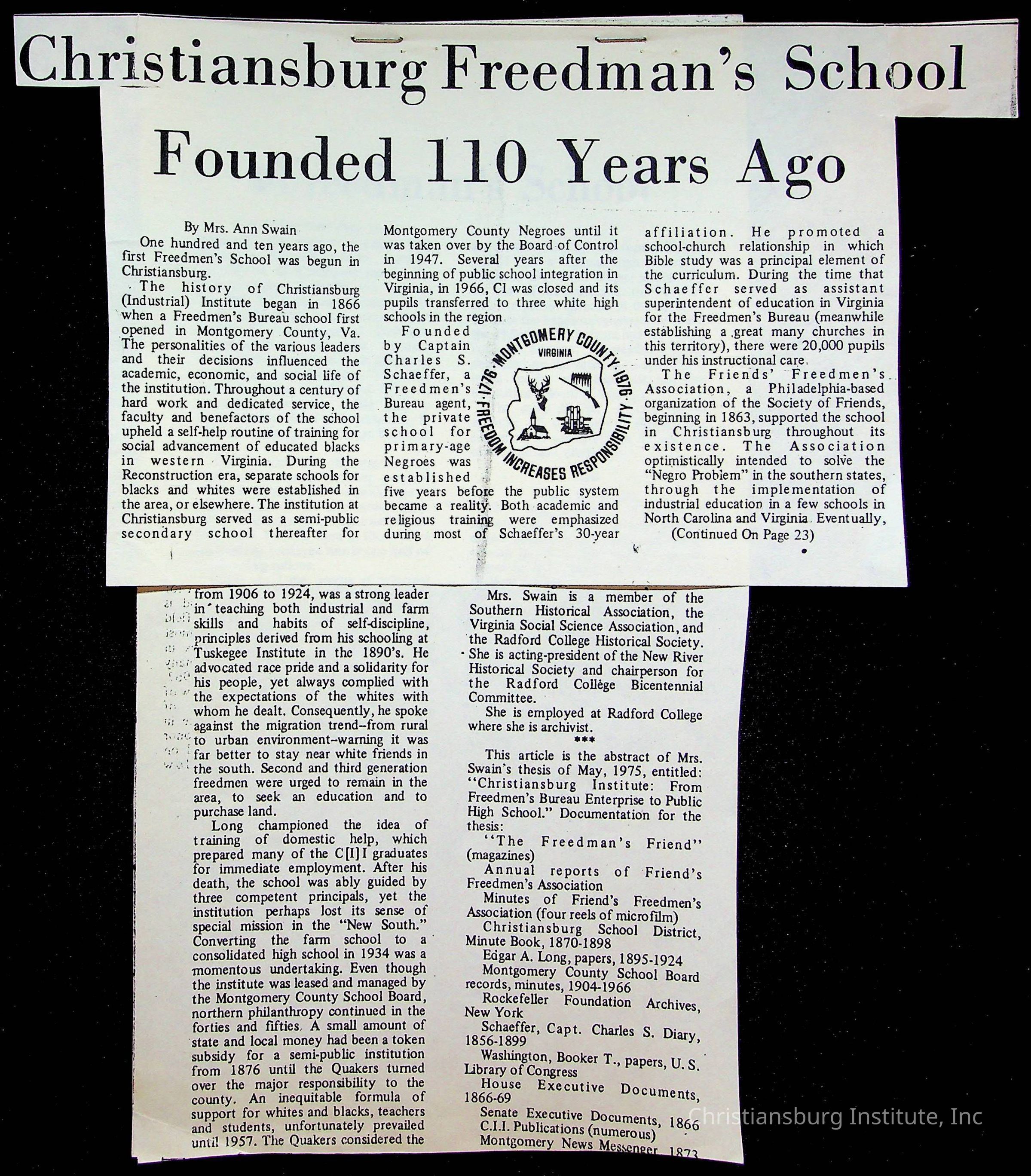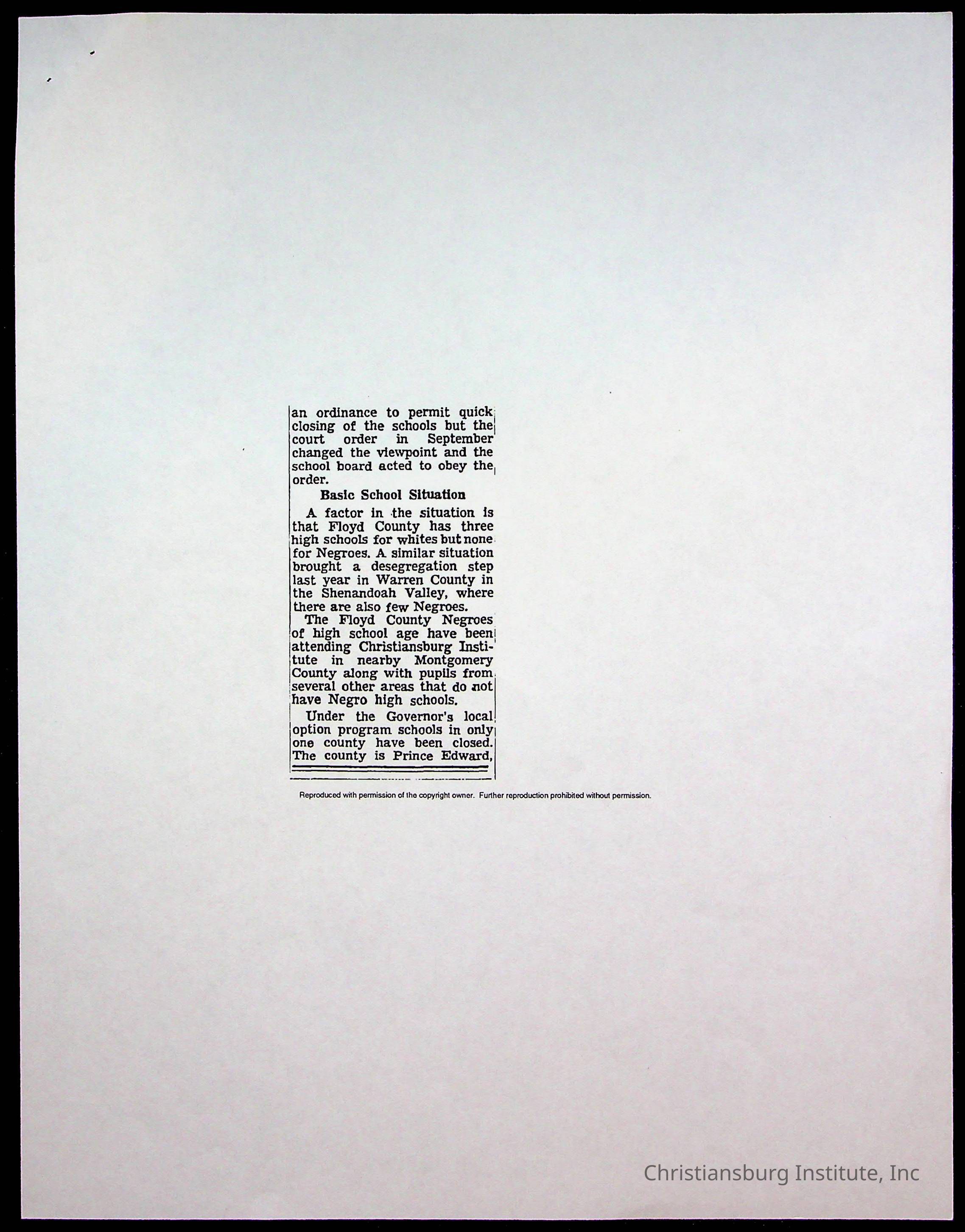 An archive of publications and materials that discuss the closure and sale of Christiansburg Institute in the year 1966 as well as articles about desegregation in Virginia, materials are dated 1951-1995.