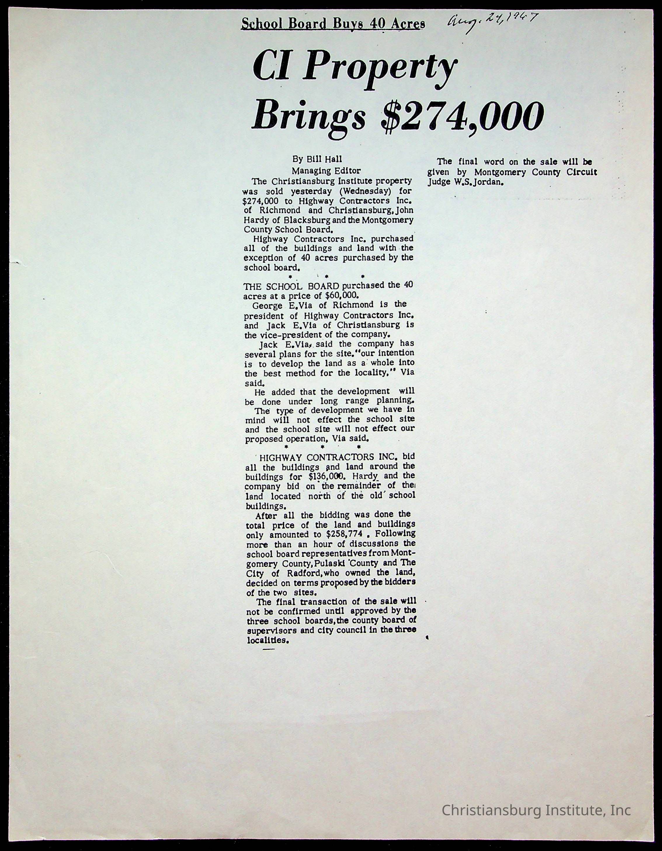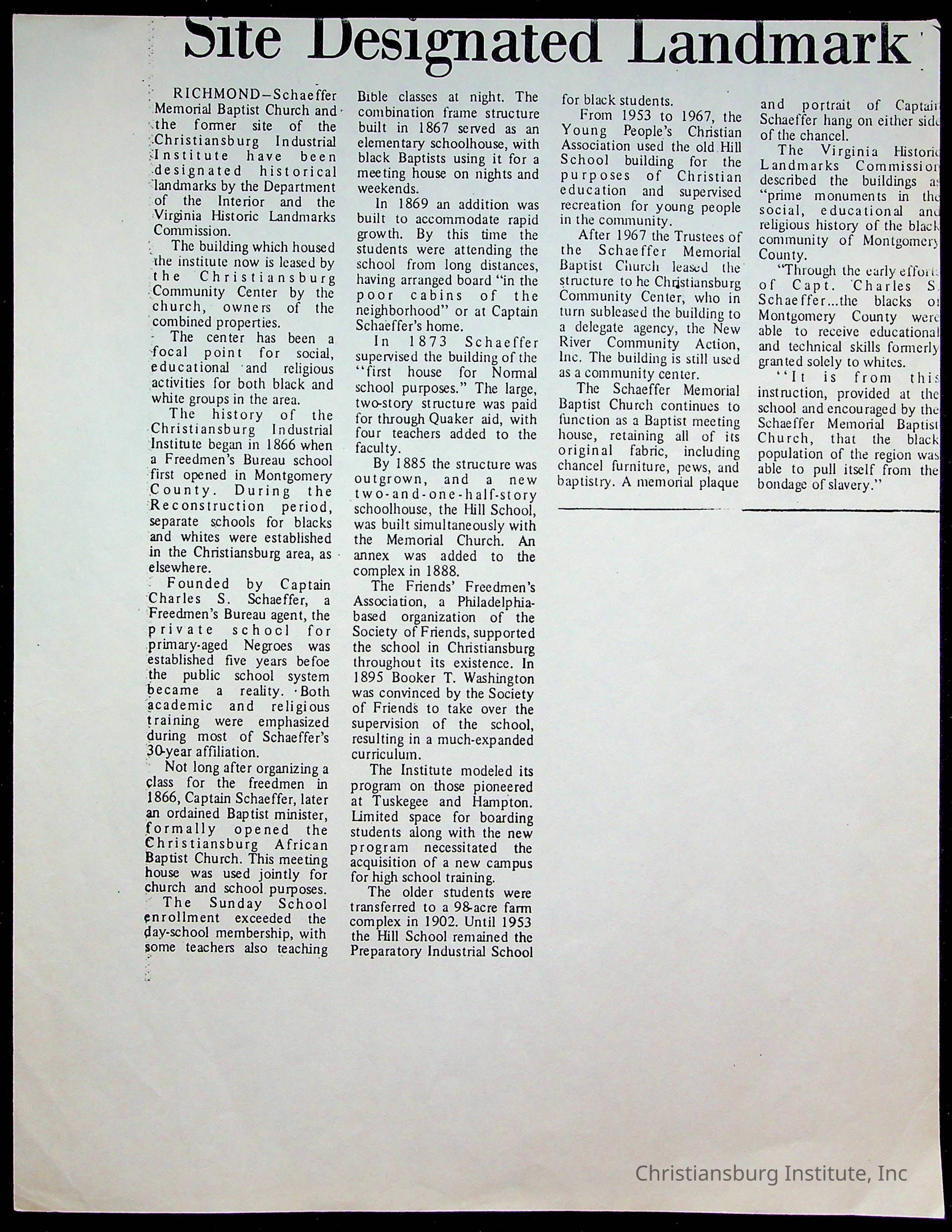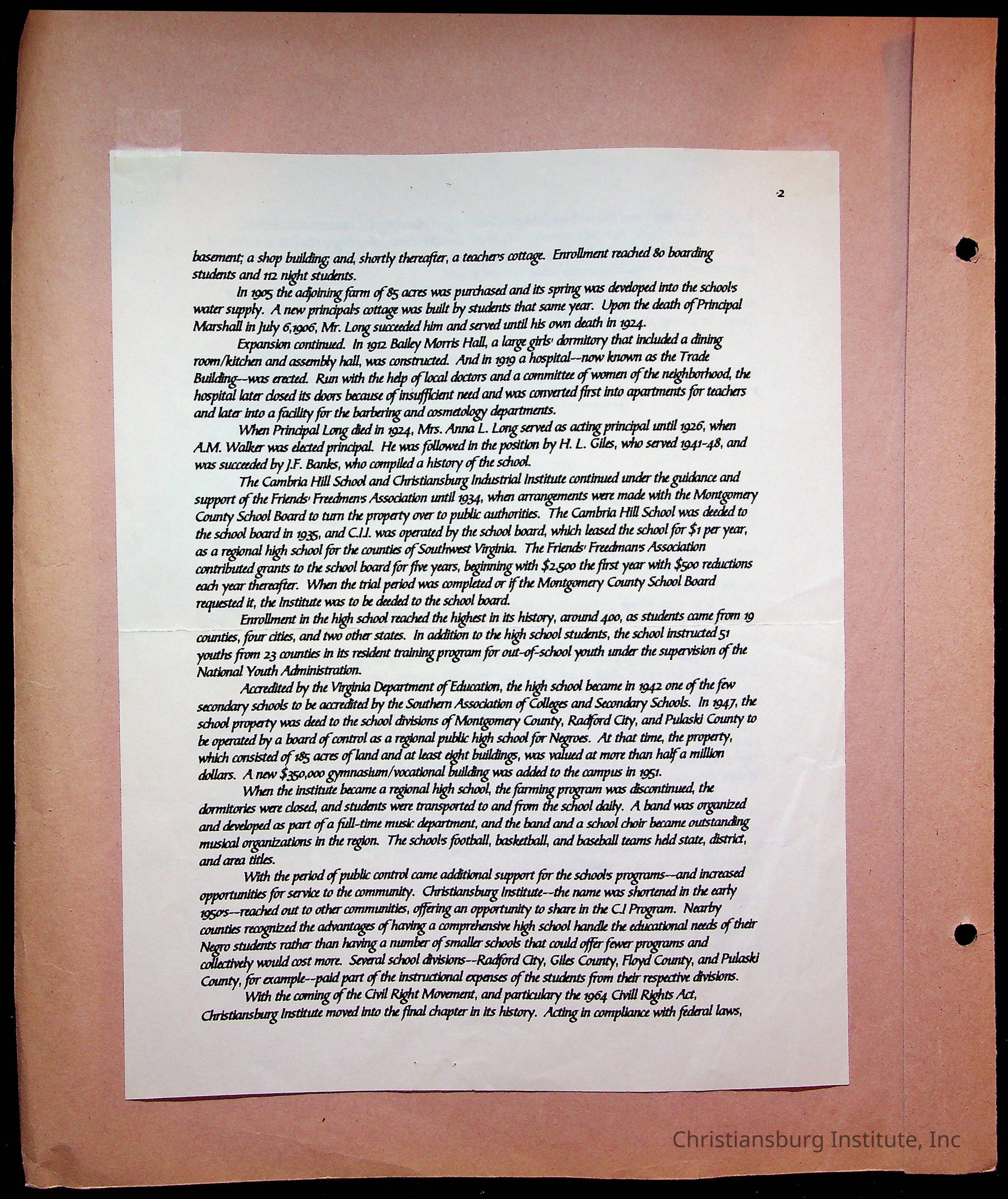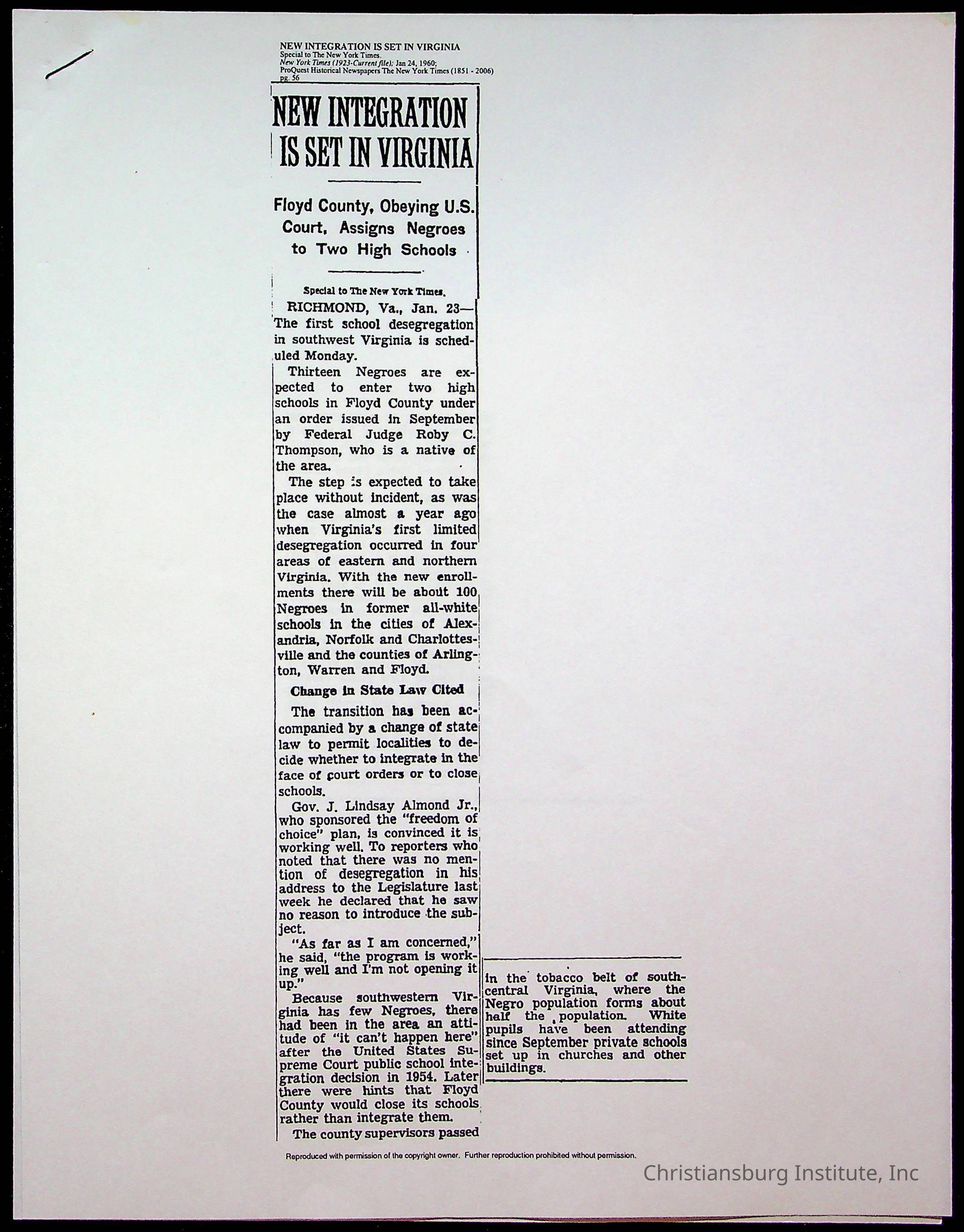An archive of publications and materials that discuss the closure and sale of Christiansburg Institute in the year 1966 as well as articles about desegregation in Virginia, materials are dated 1951-1995.