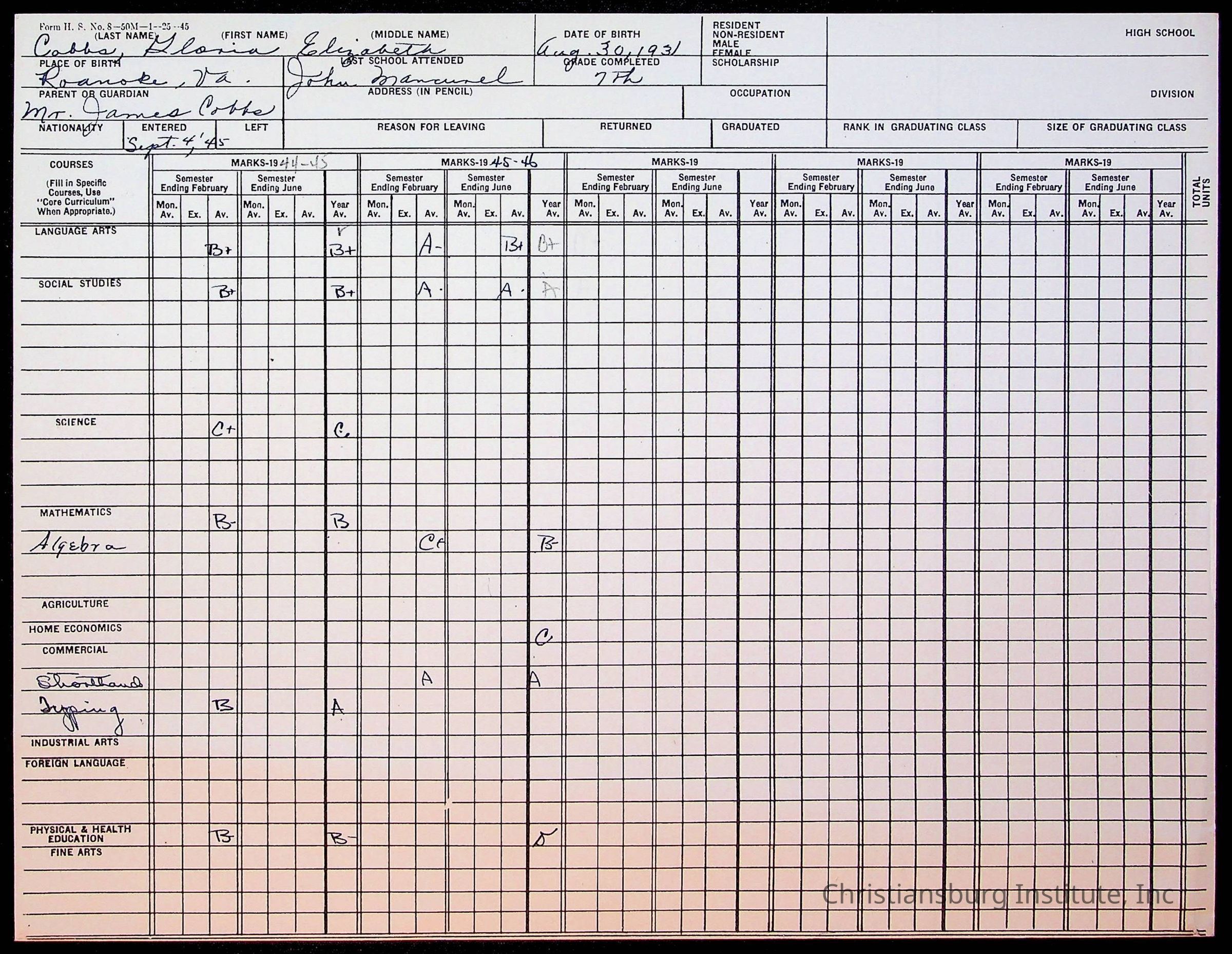 The student file for the Christiansburg Institute student, Gloria E. Cobbs circa 1940s.
