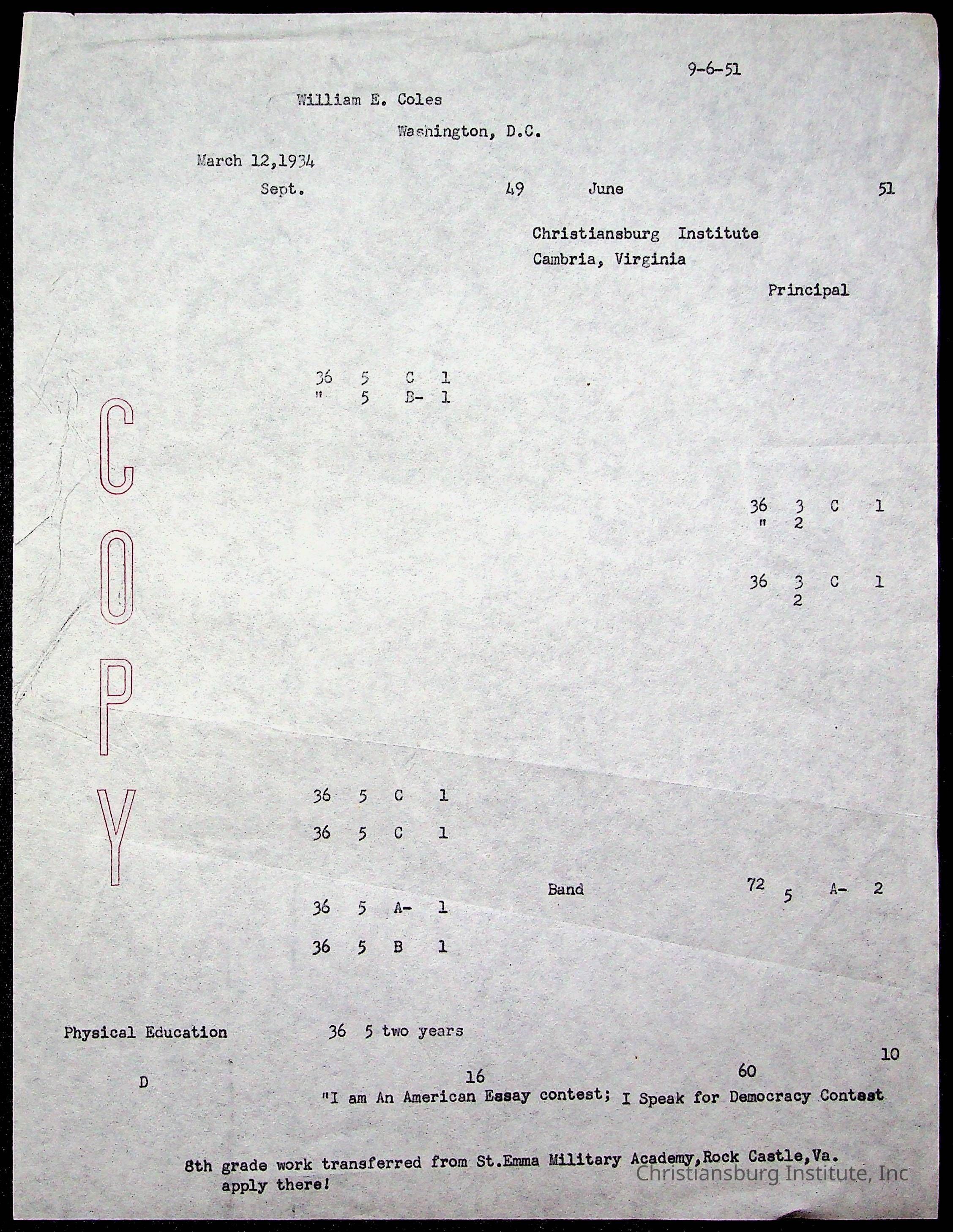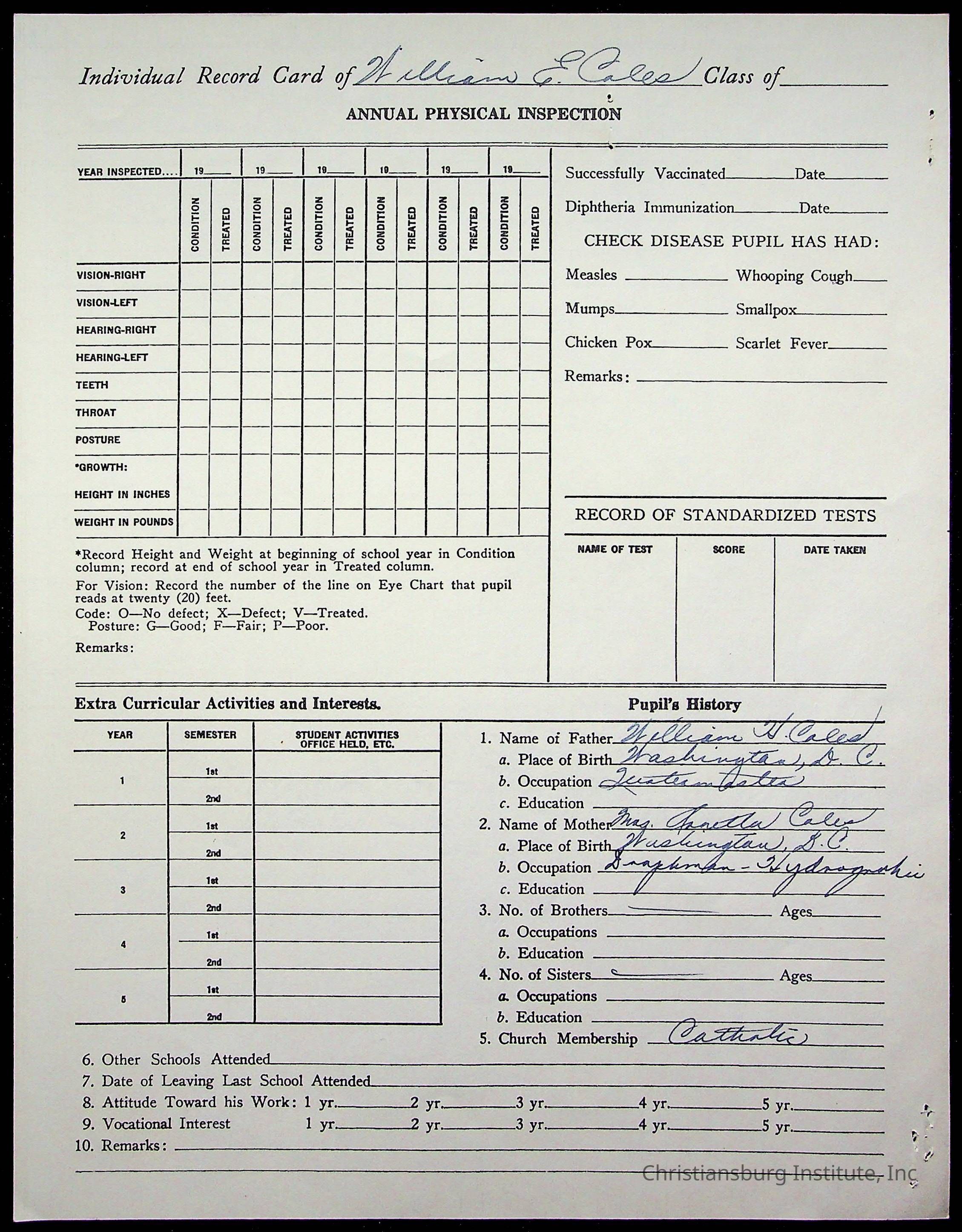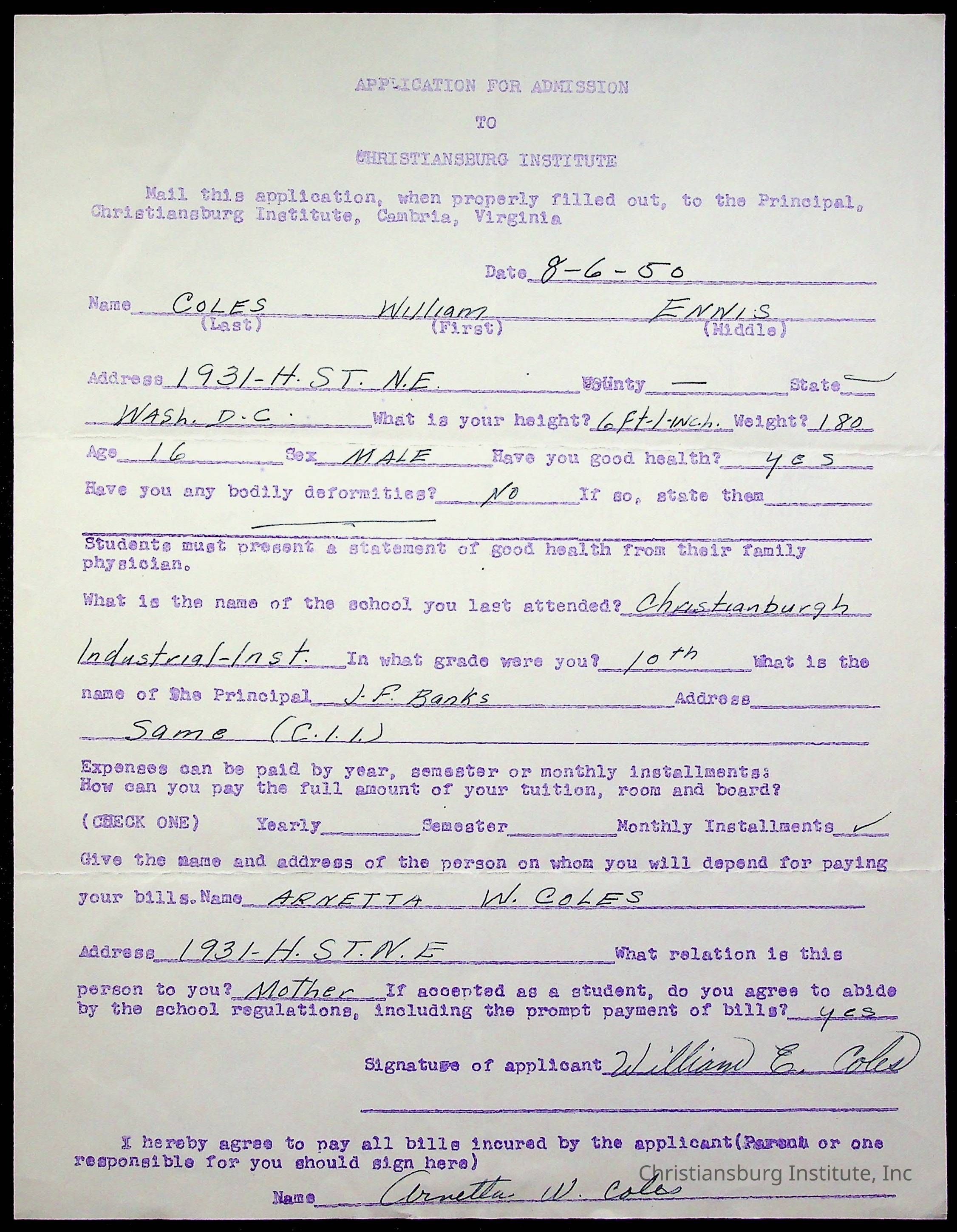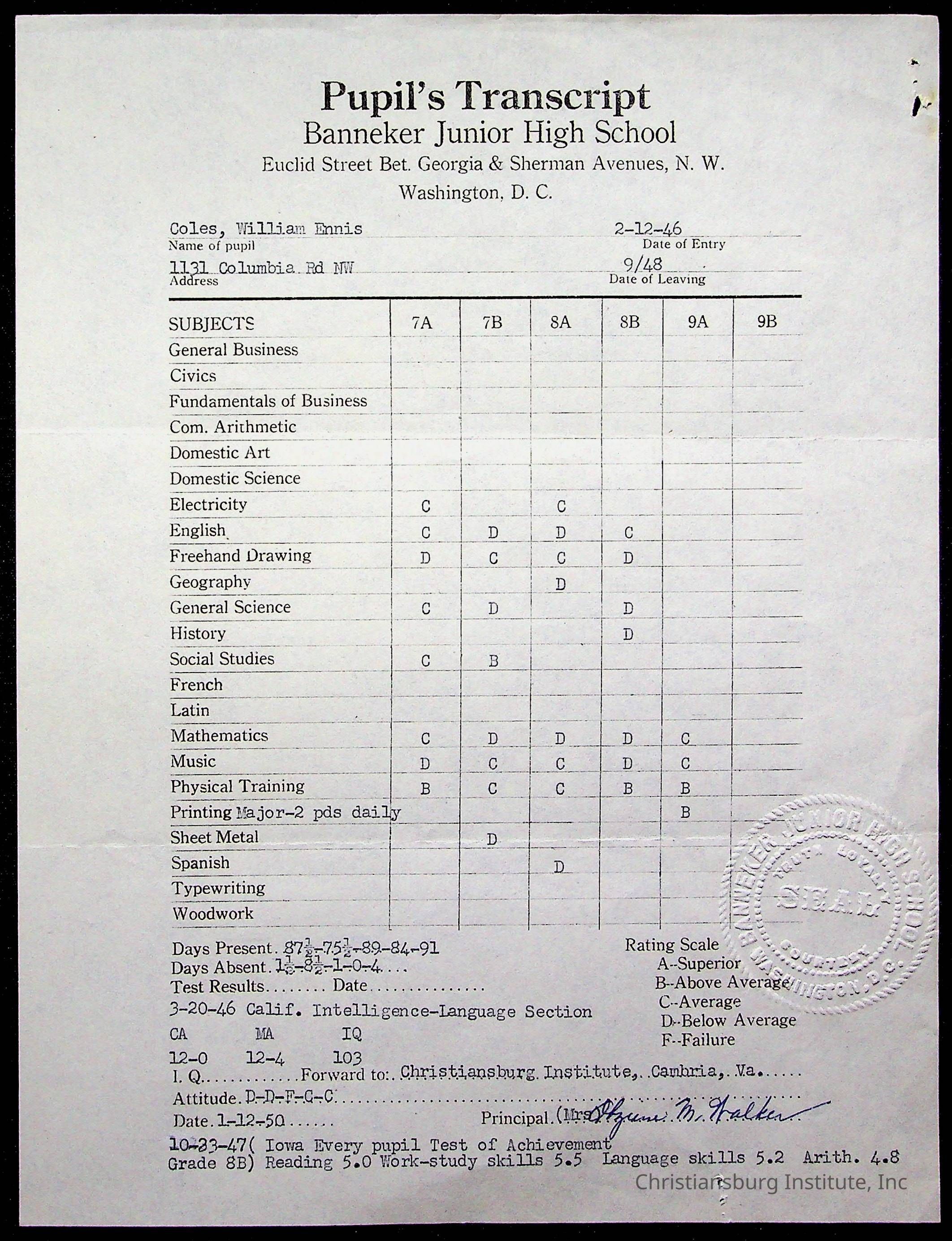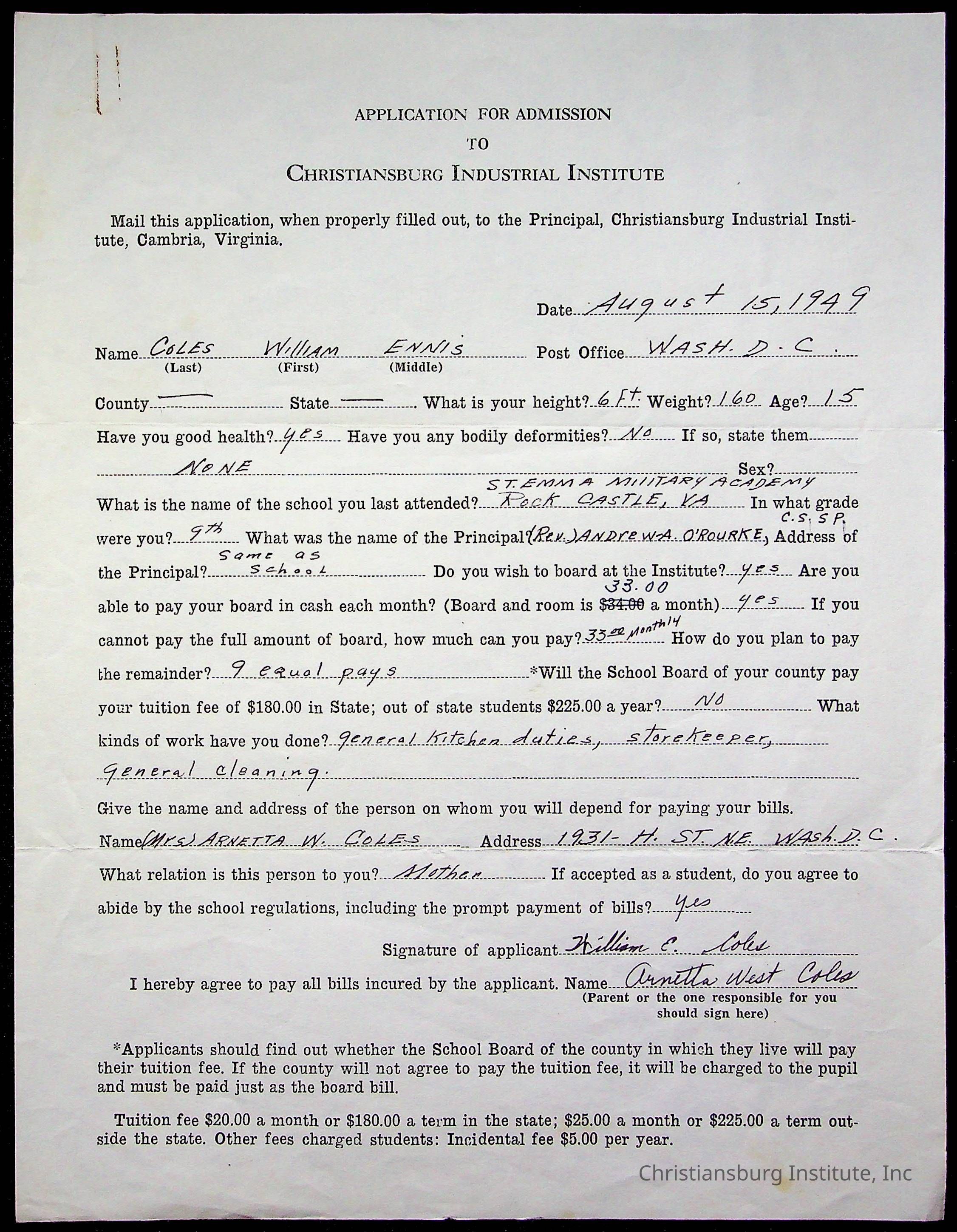 The student file for the Christiansburg Institute student, William Ennis Coles circa 1940s-1950s.