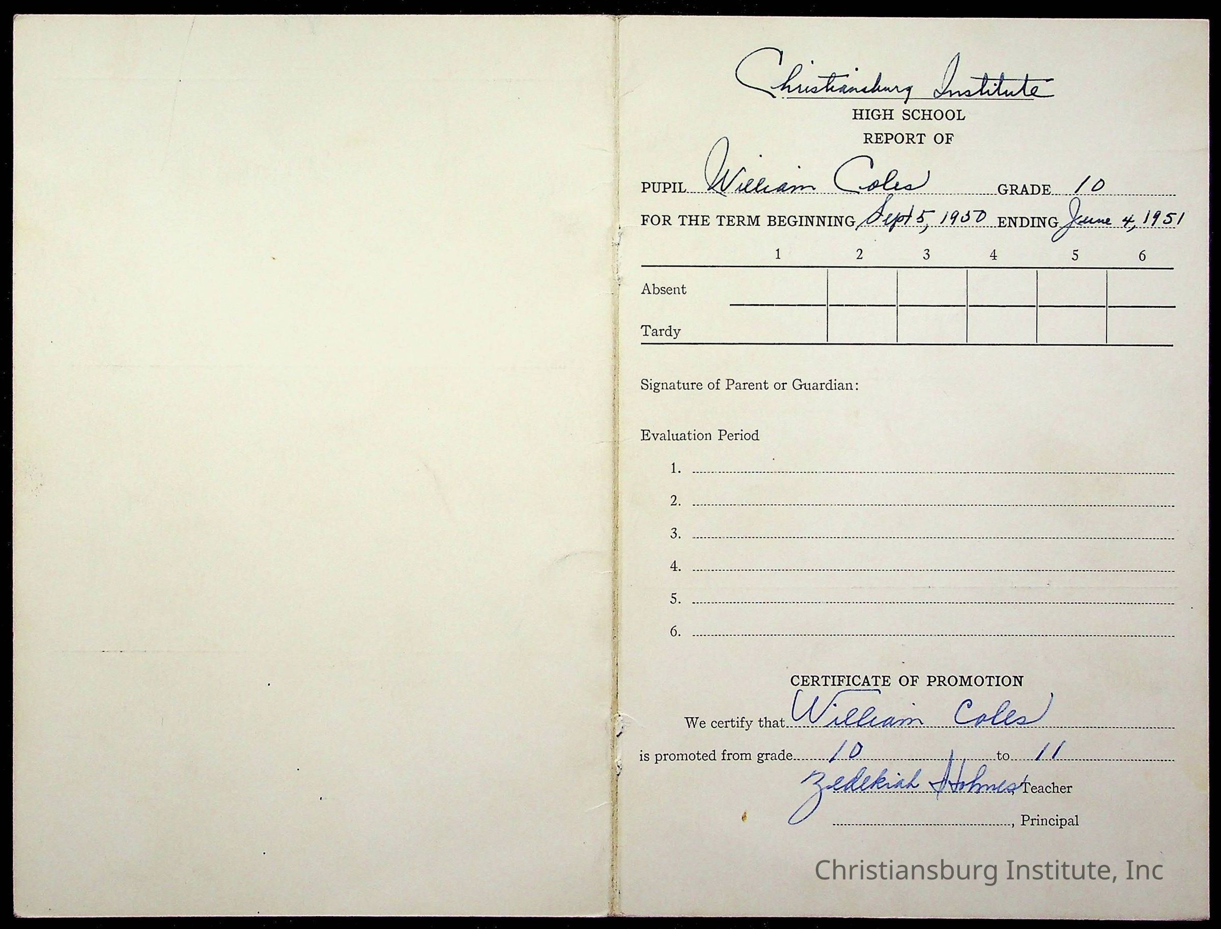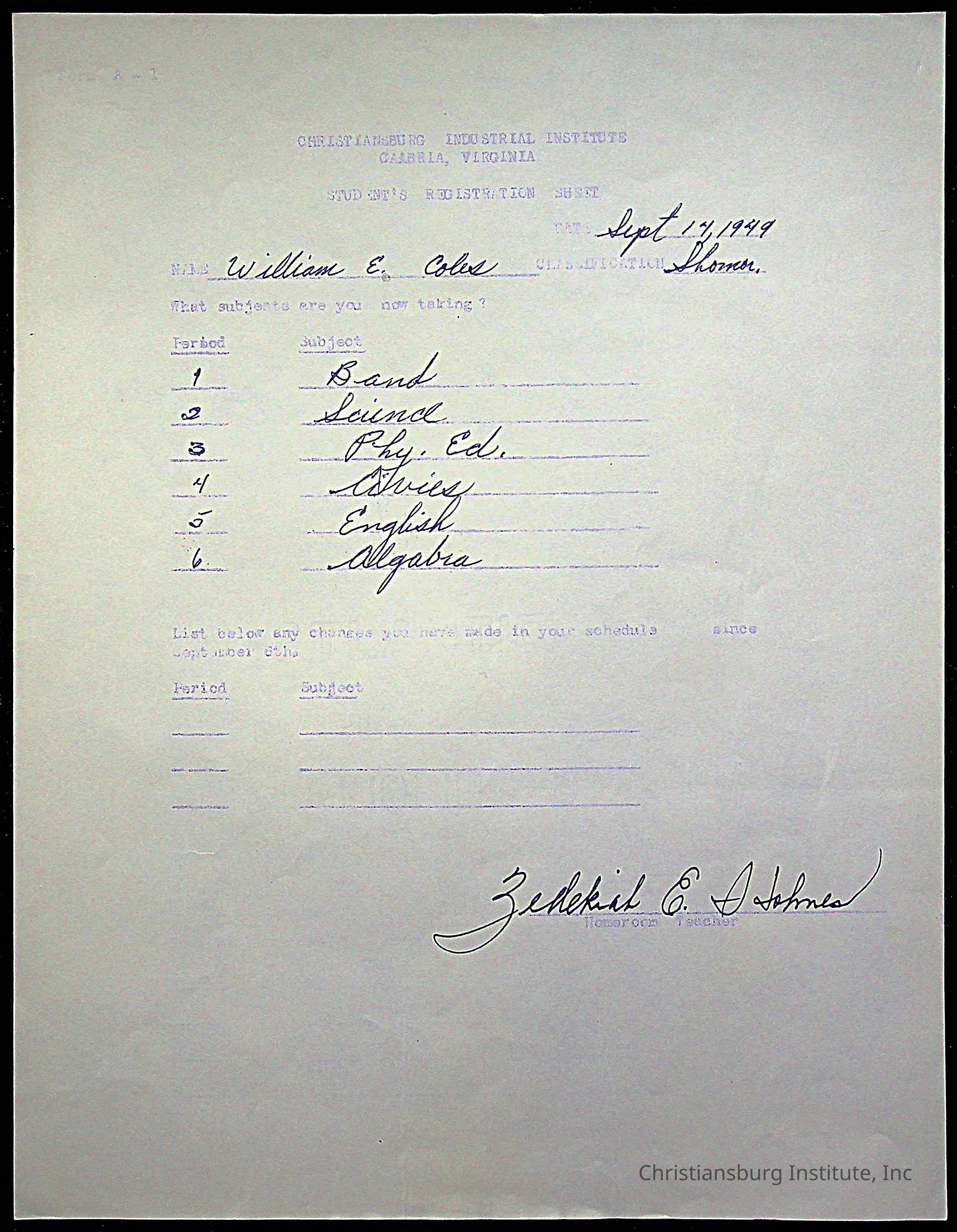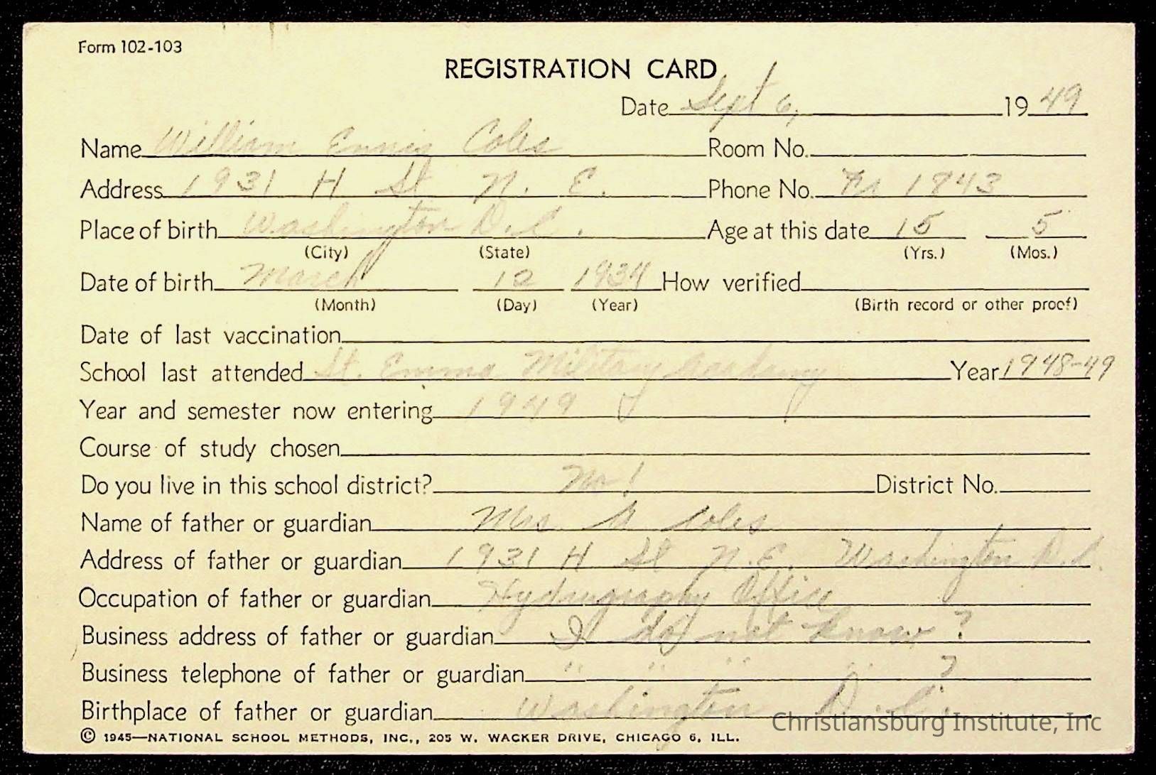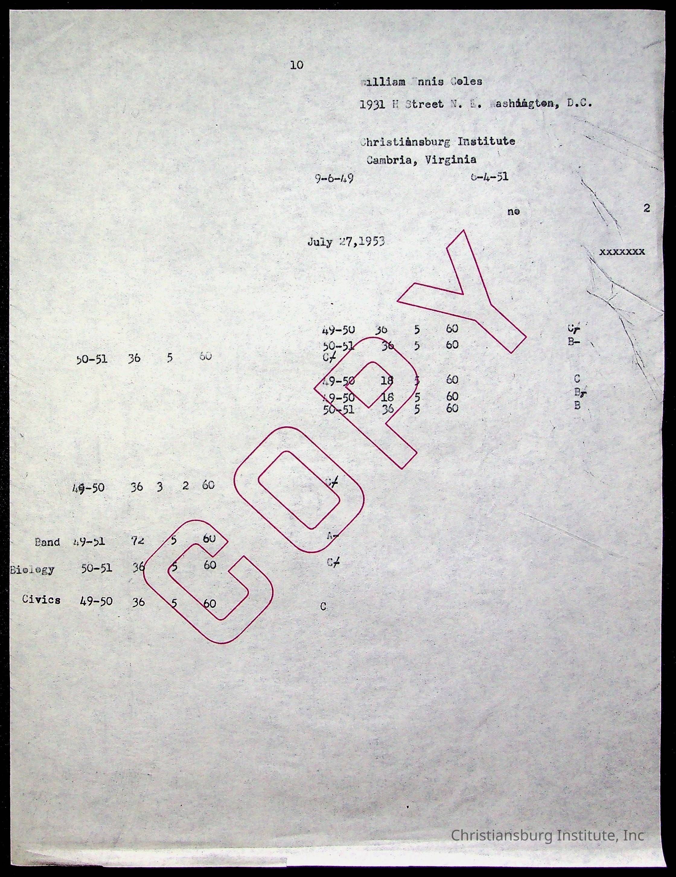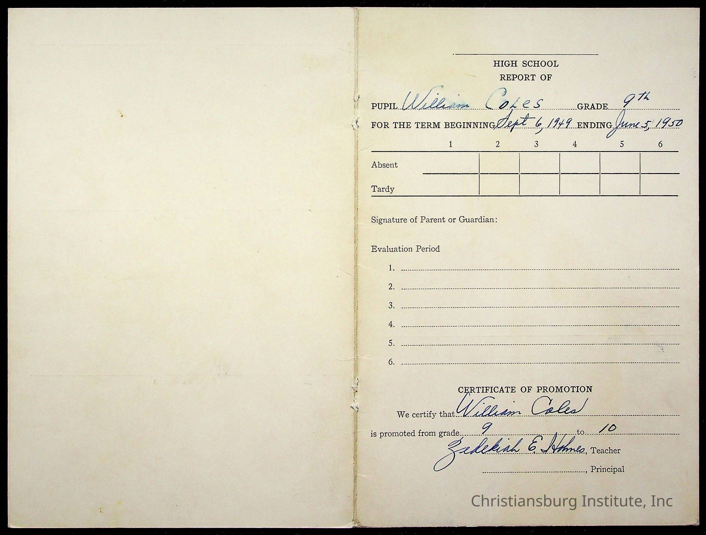 The student file for the Christiansburg Institute student, William Ennis Coles circa 1940s-1950s.