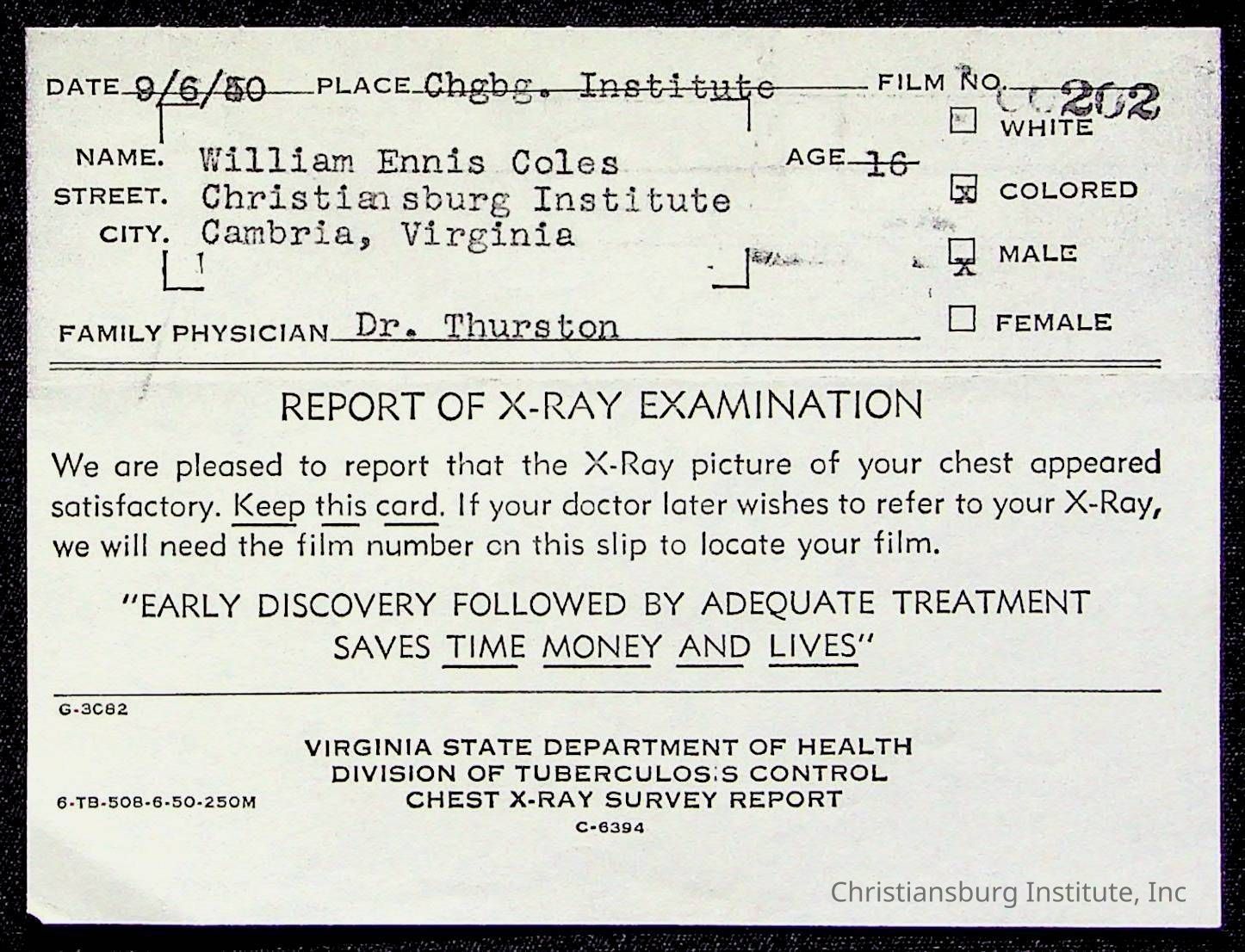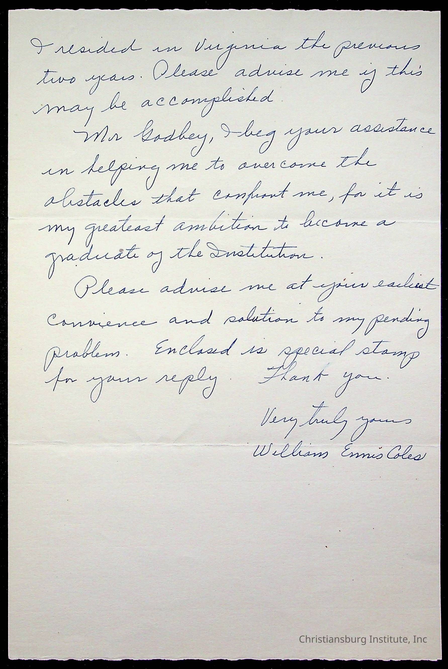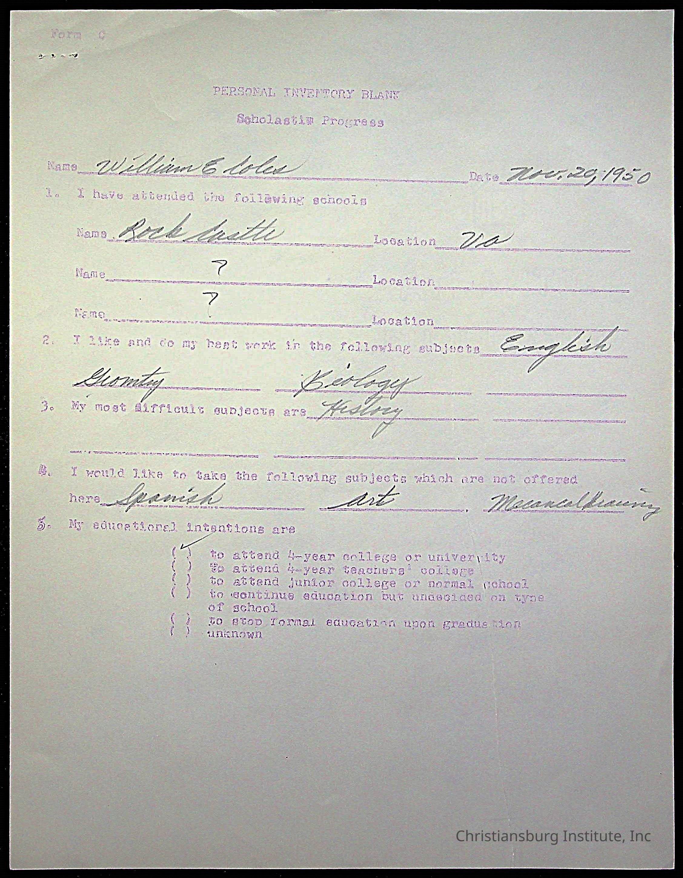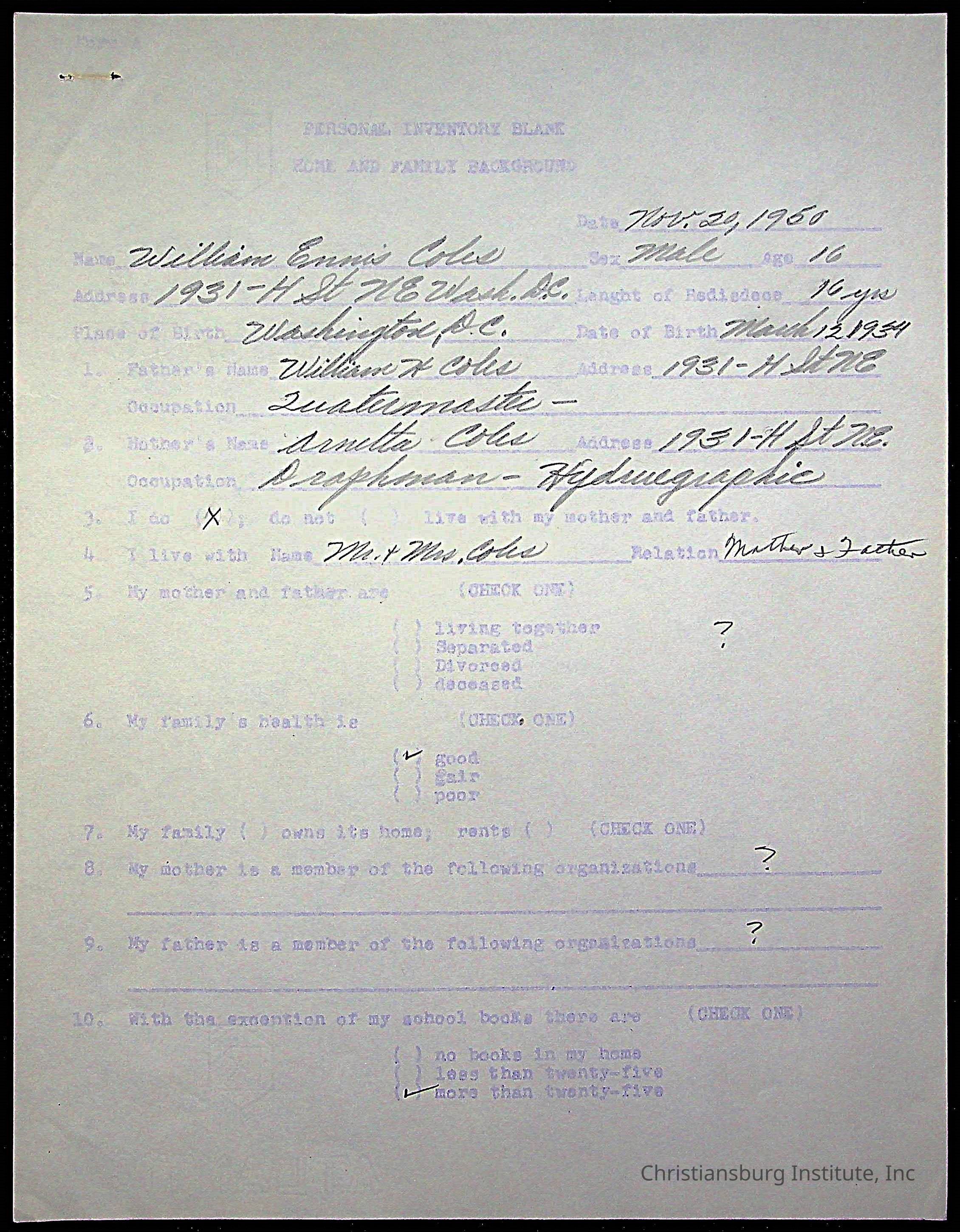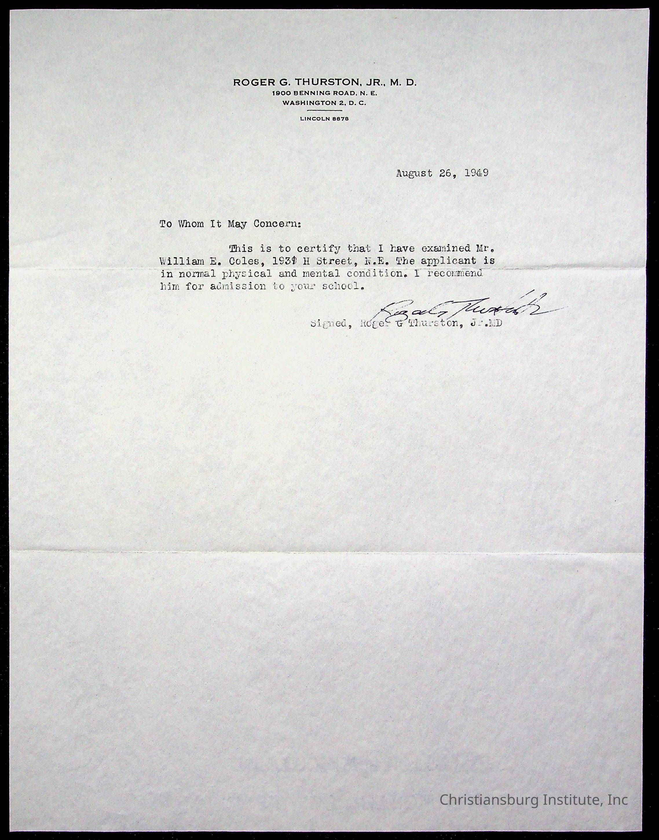The student file for the Christiansburg Institute student, William Ennis Coles circa 1940s-1950s.