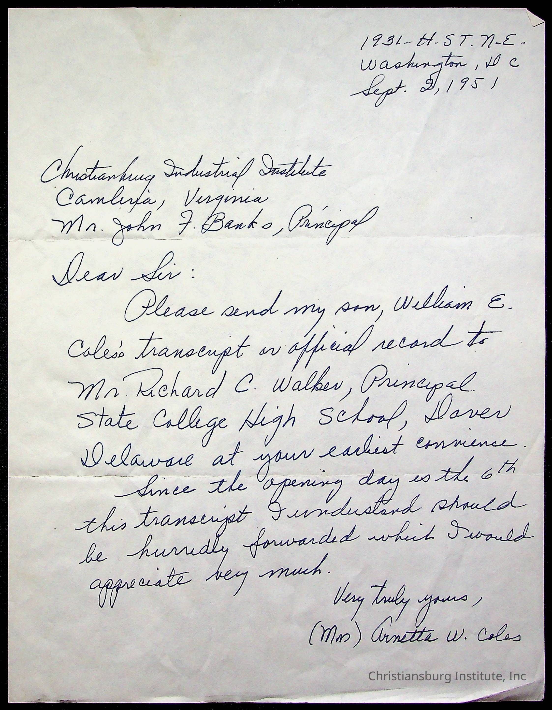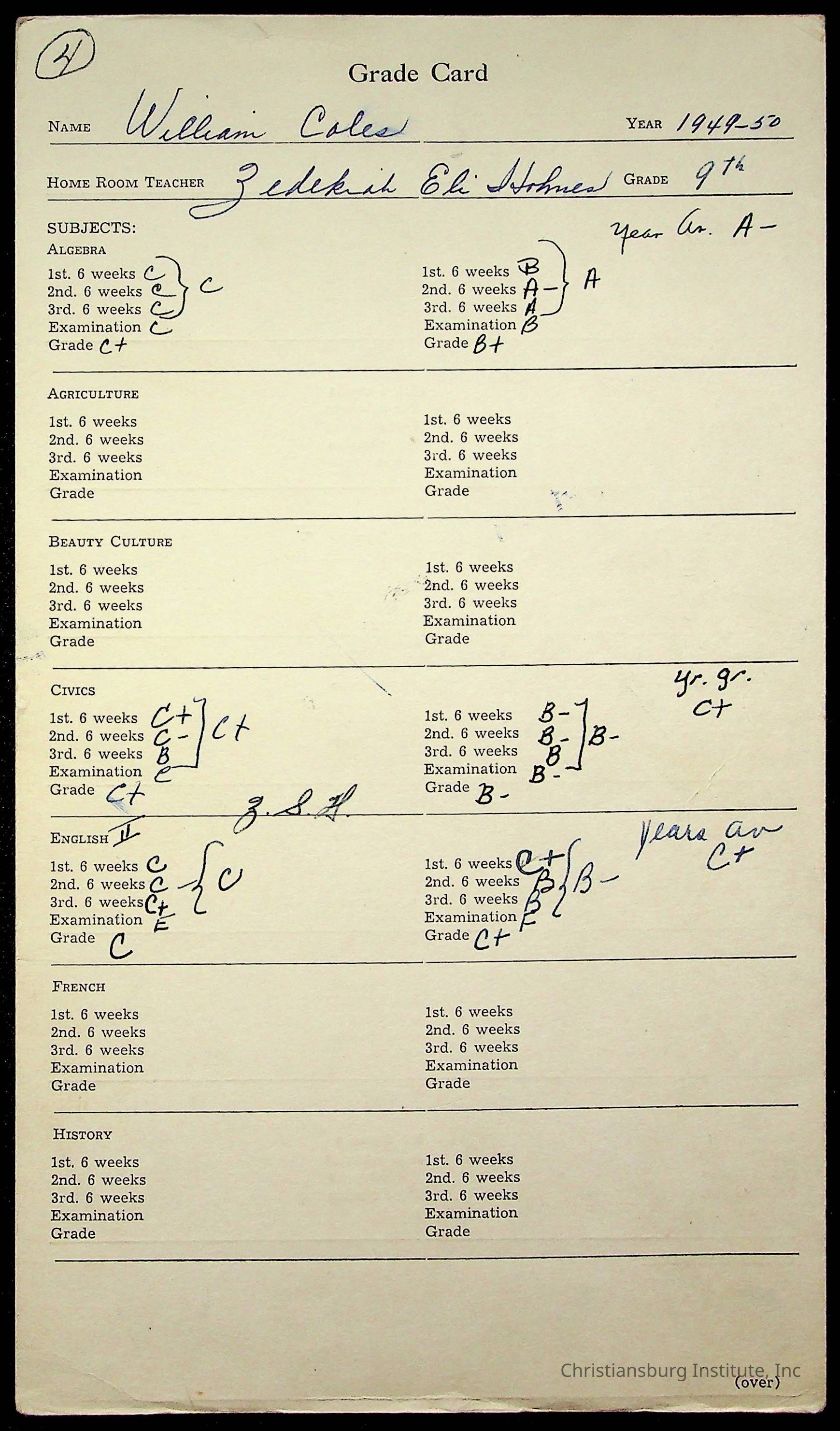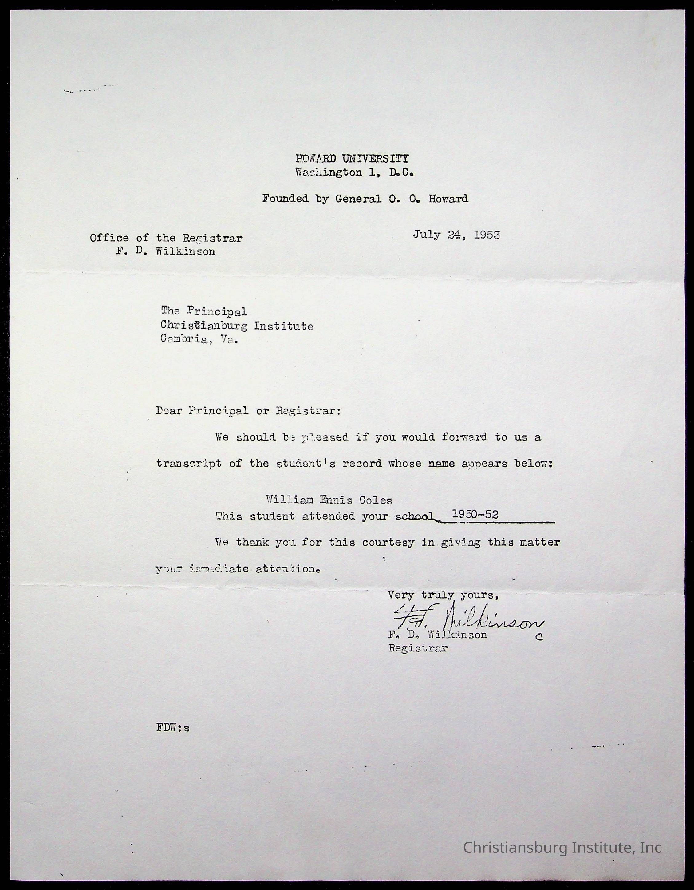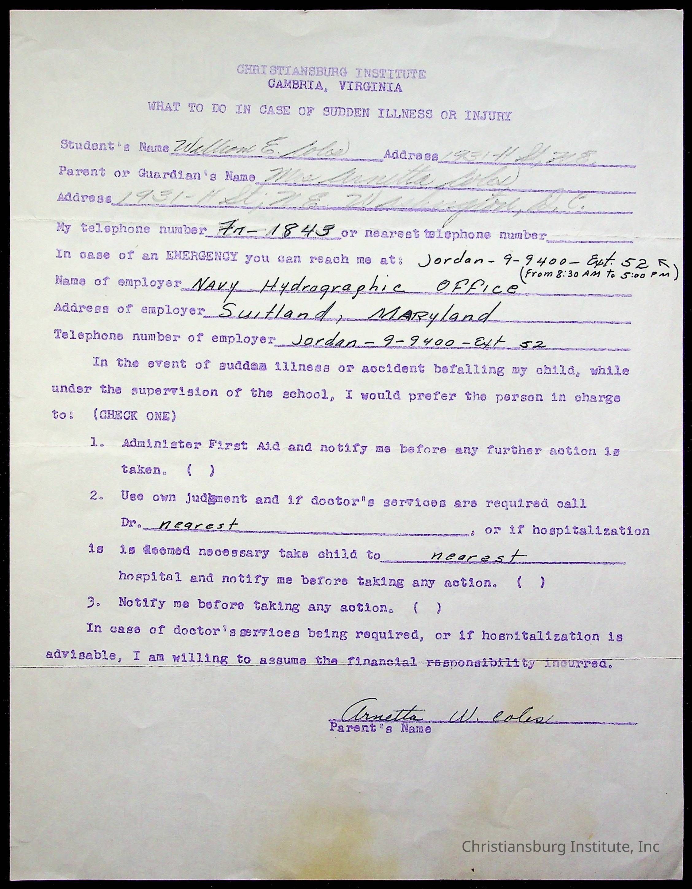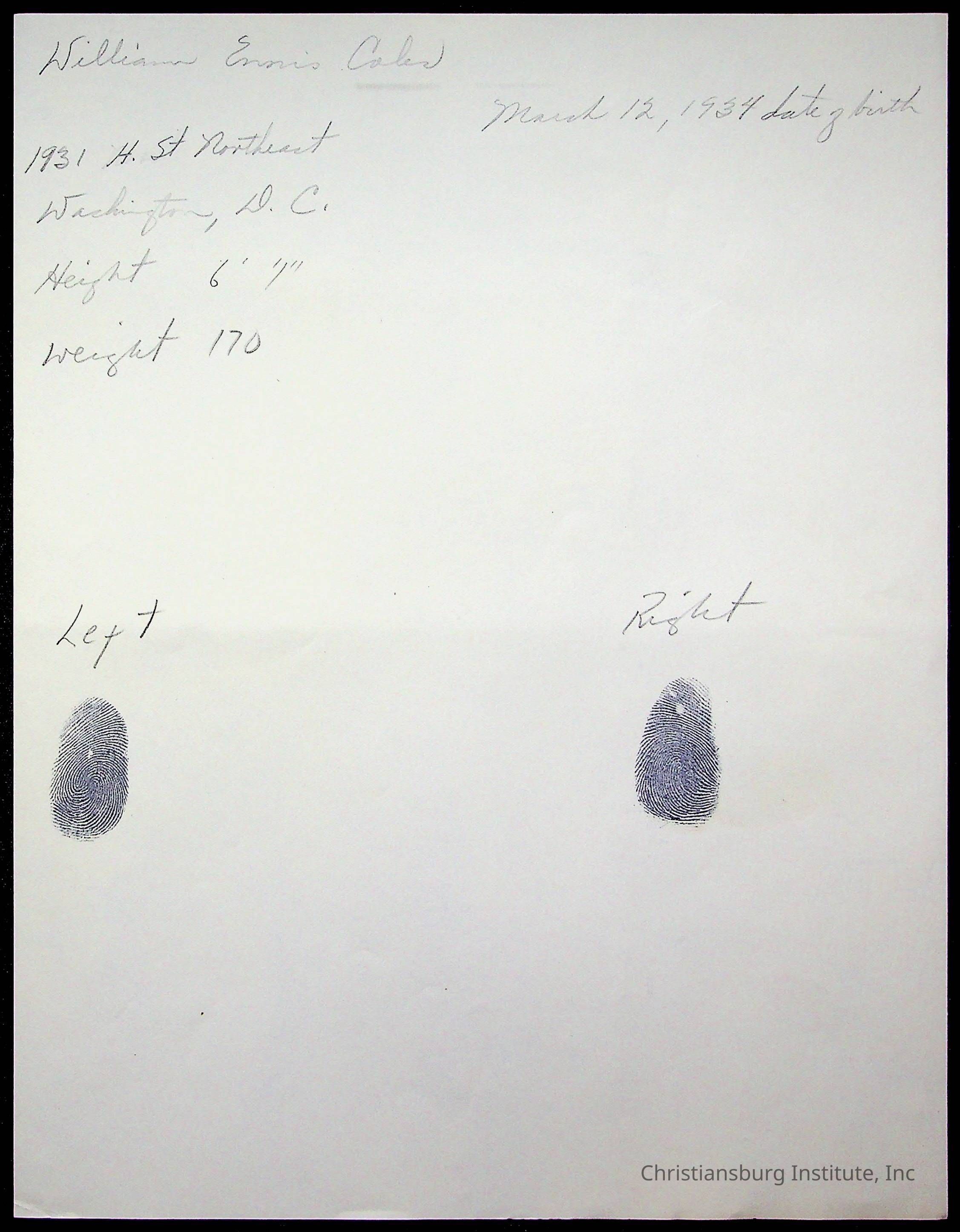 The student file for the Christiansburg Institute student, William Ennis Coles circa 1940s-1950s.