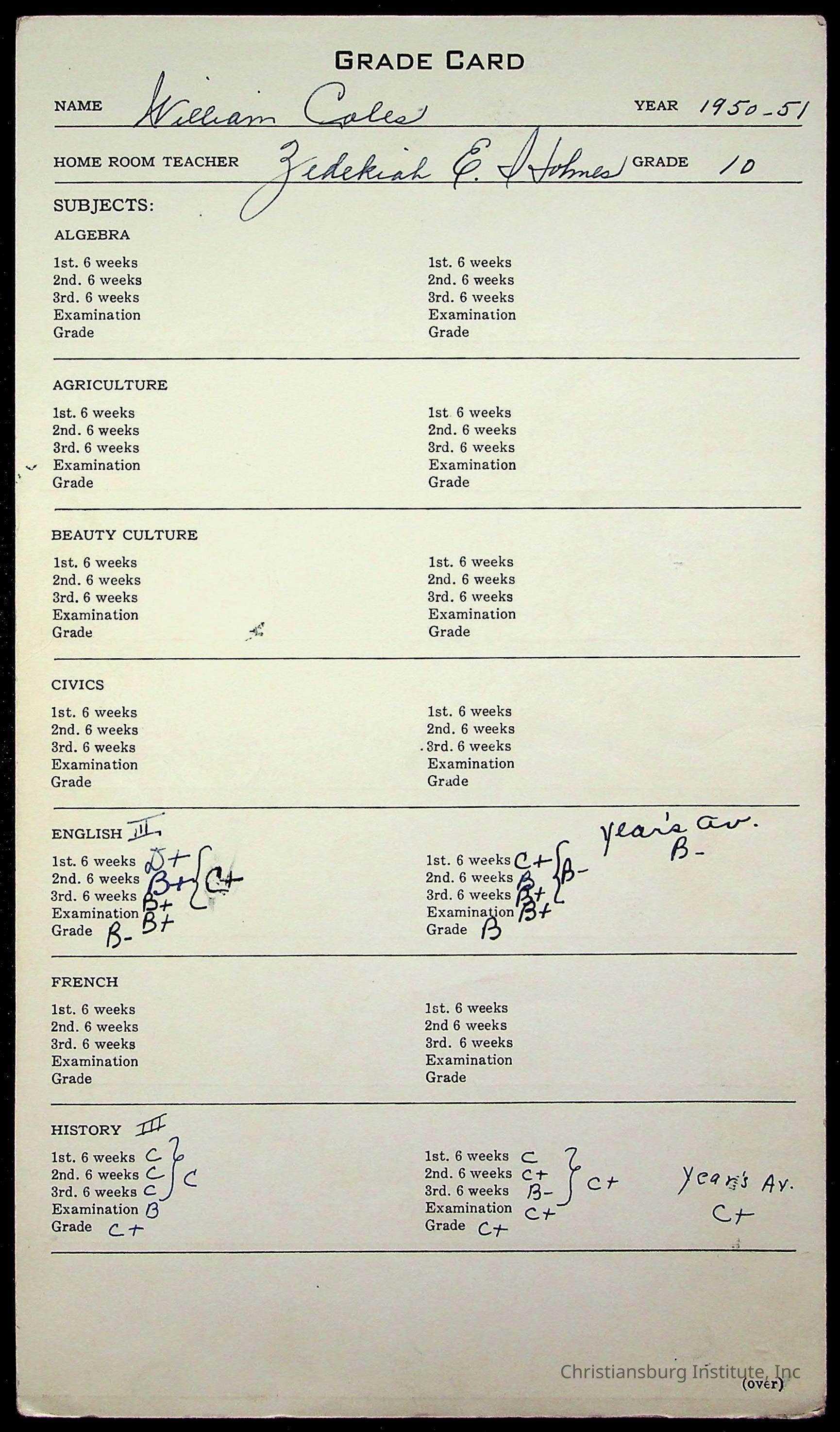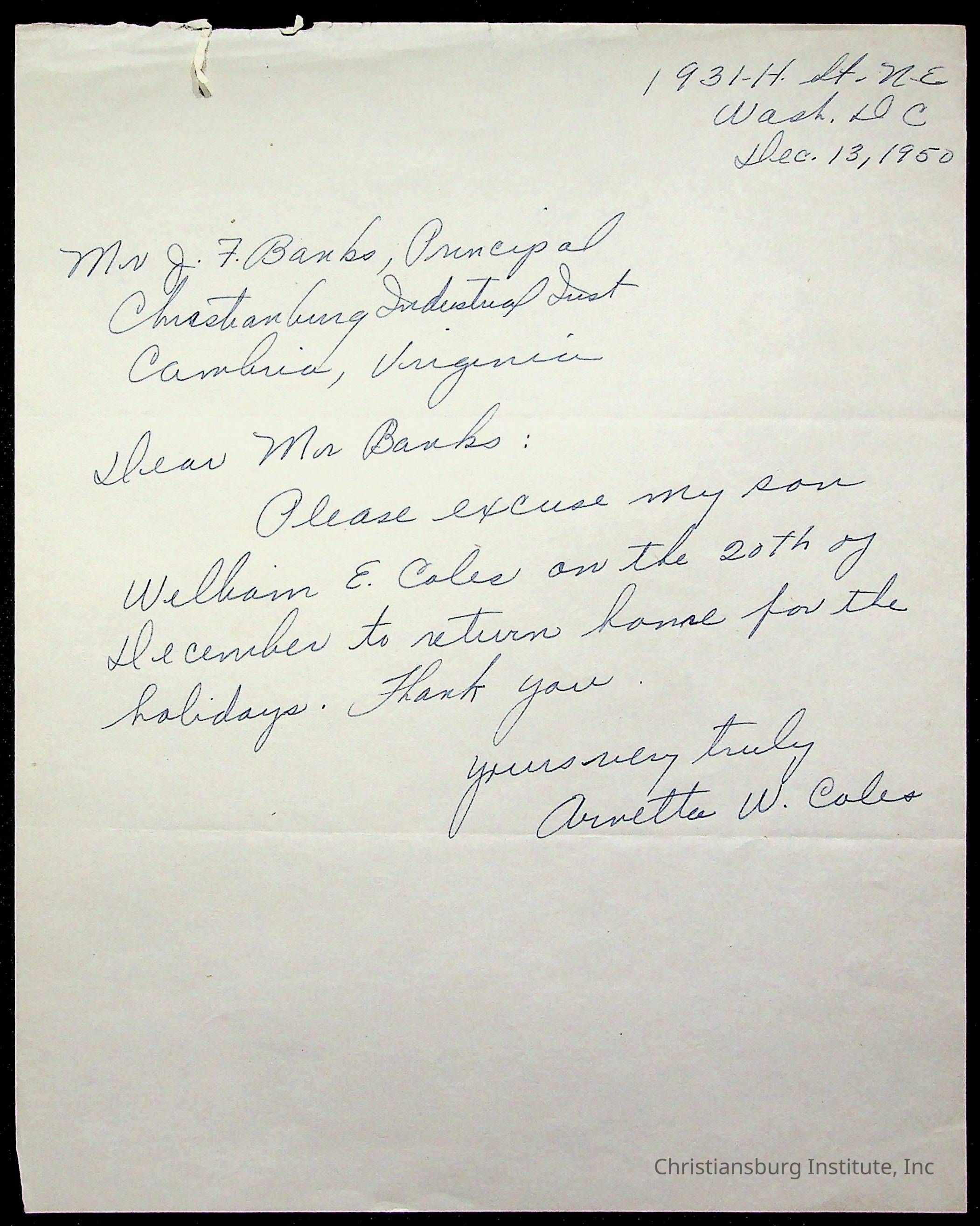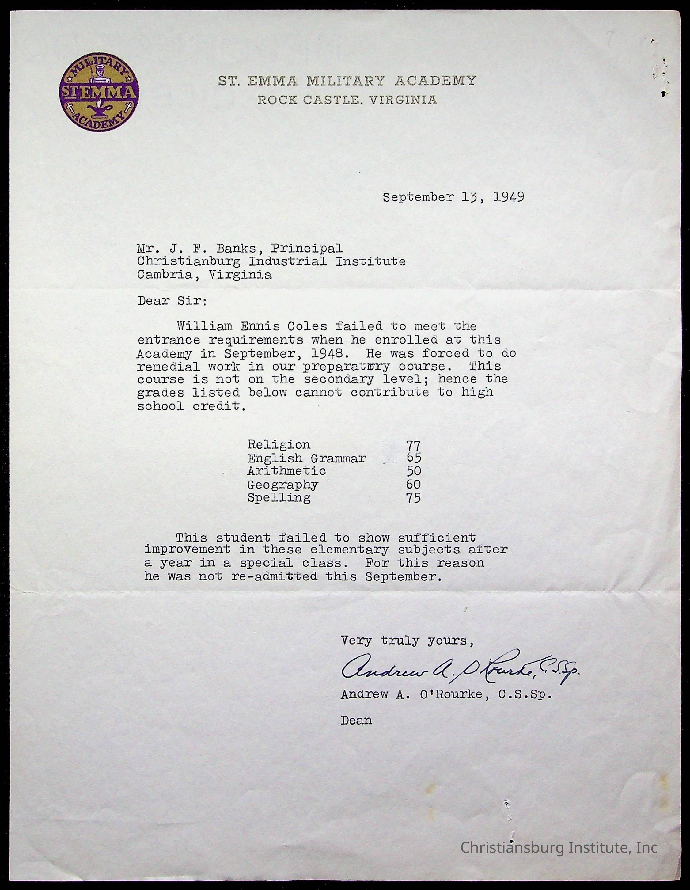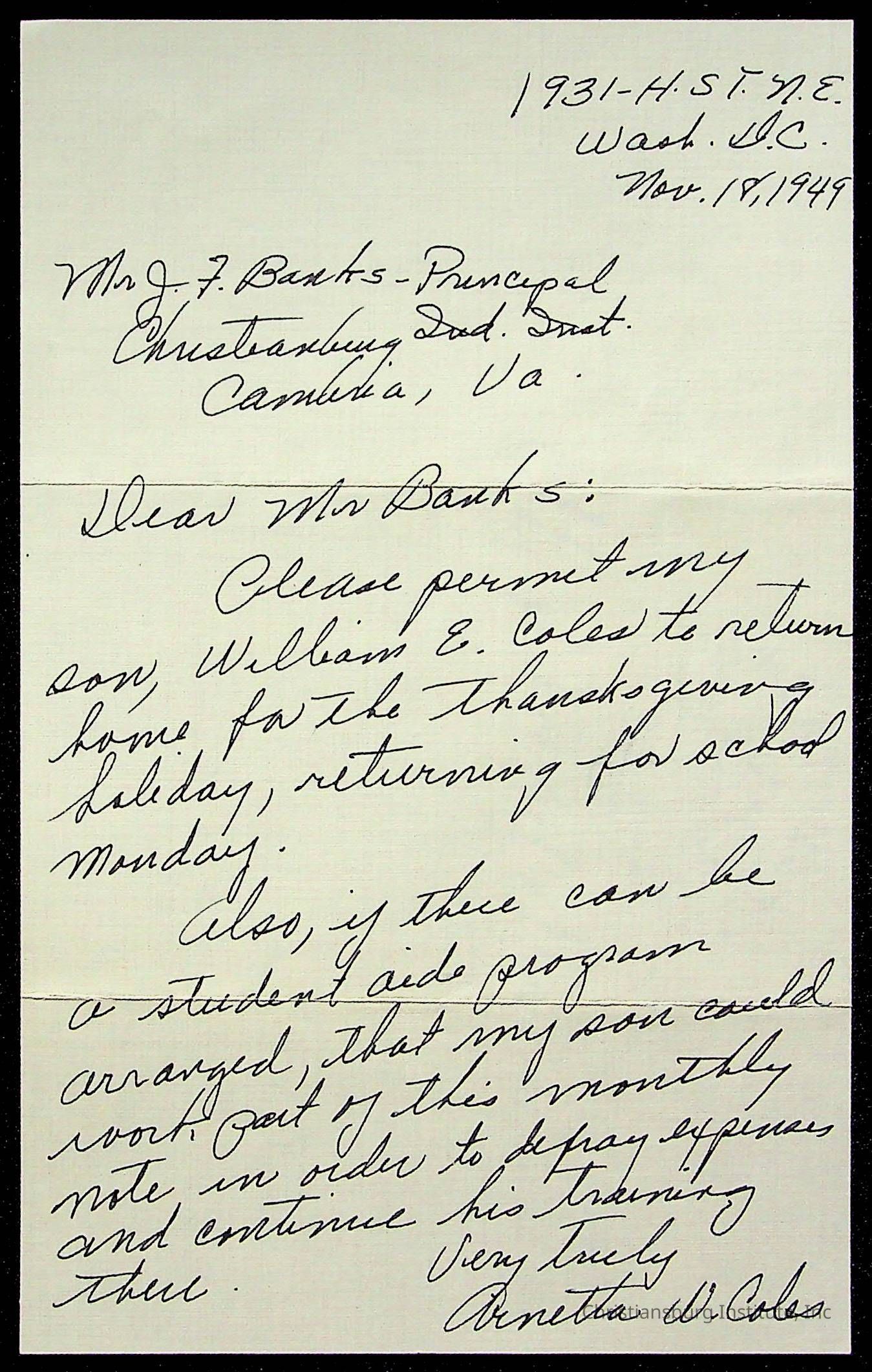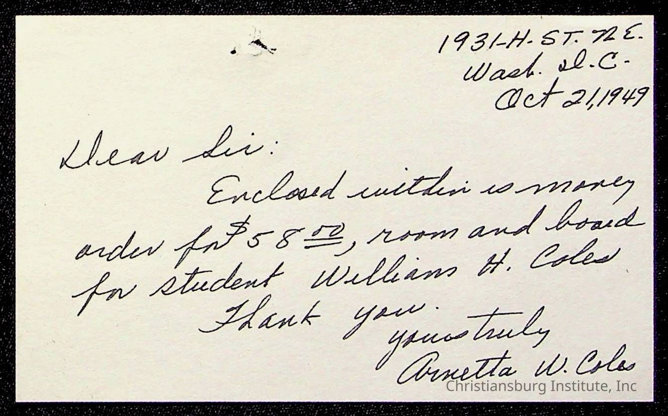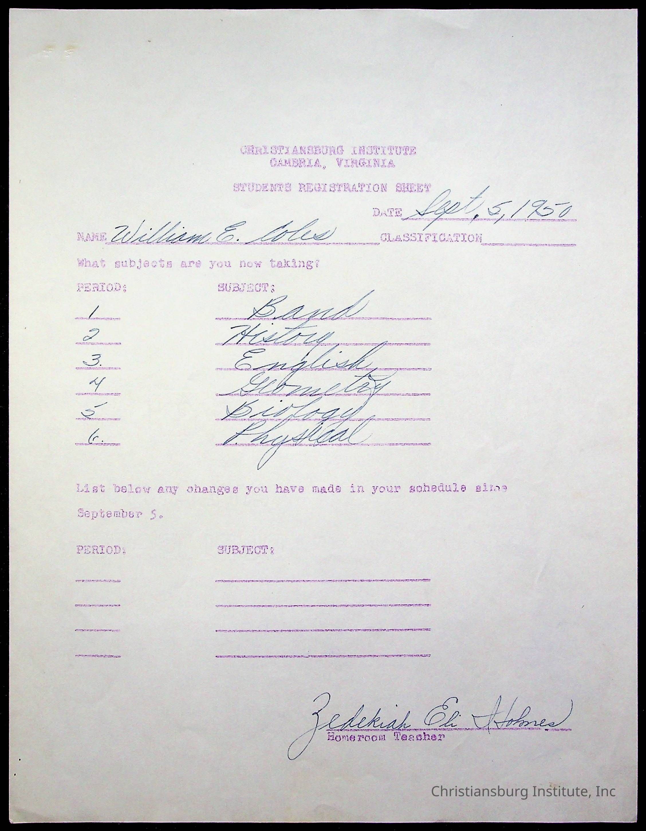 The student file for the Christiansburg Institute student, William Ennis Coles circa 1940s-1950s.
