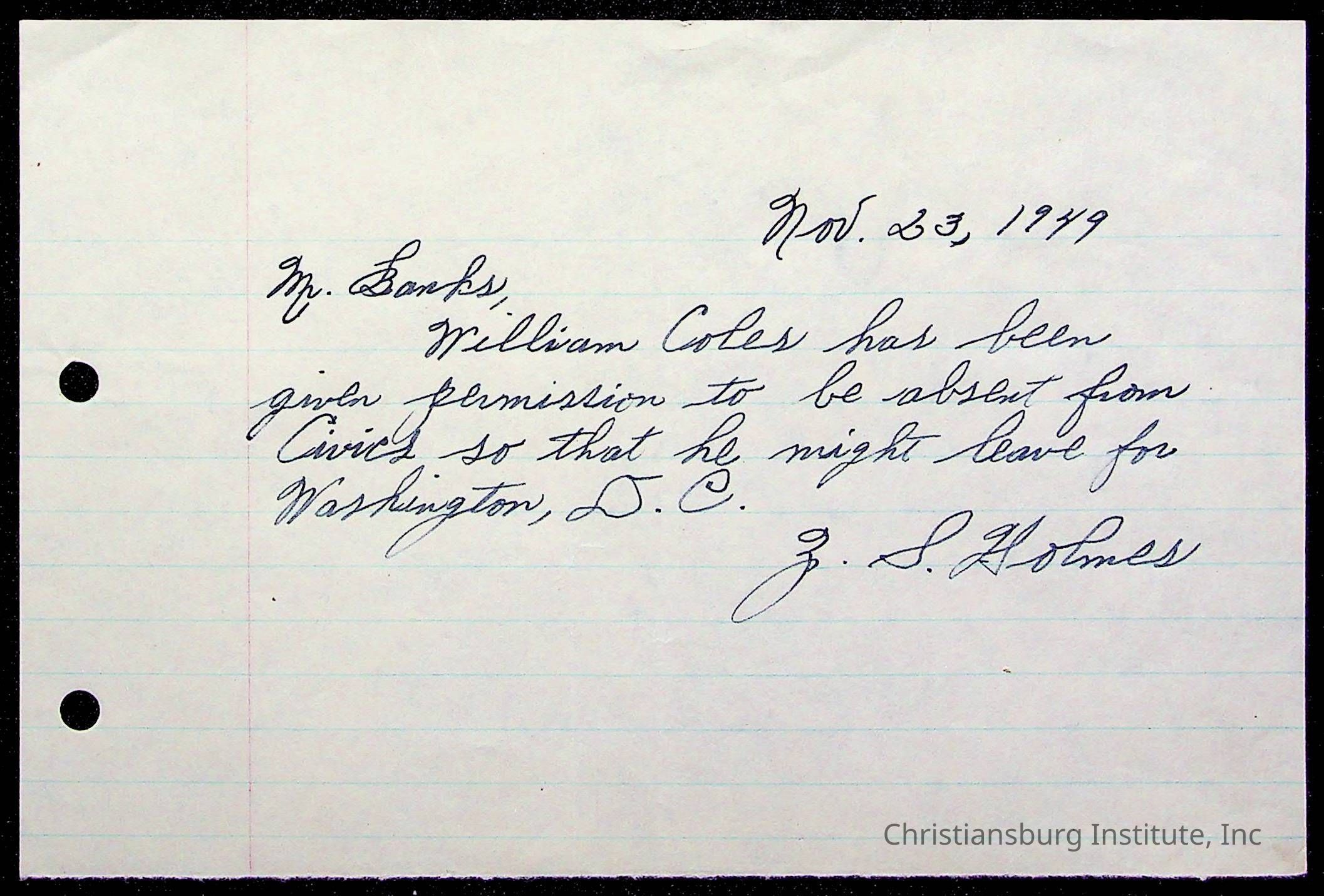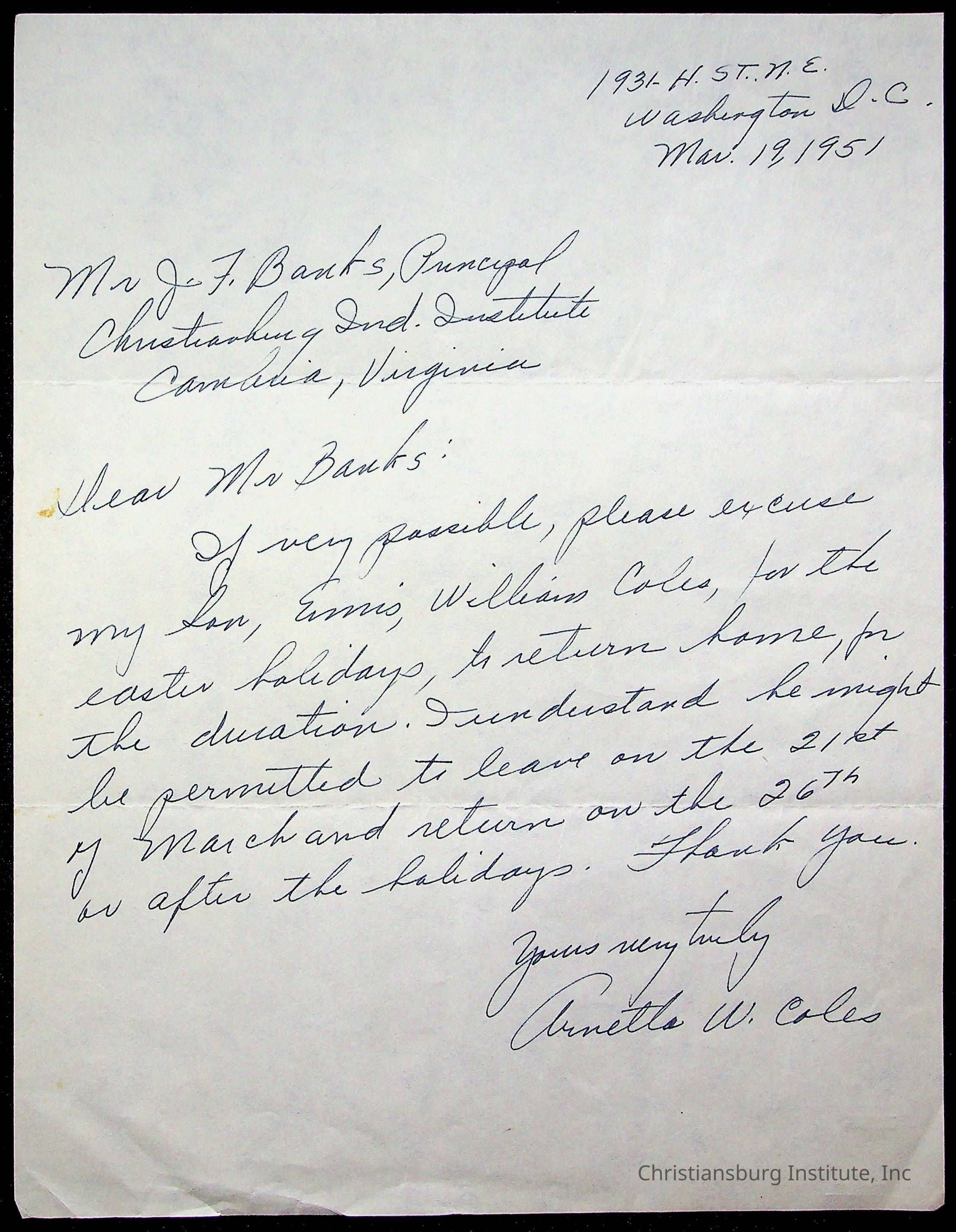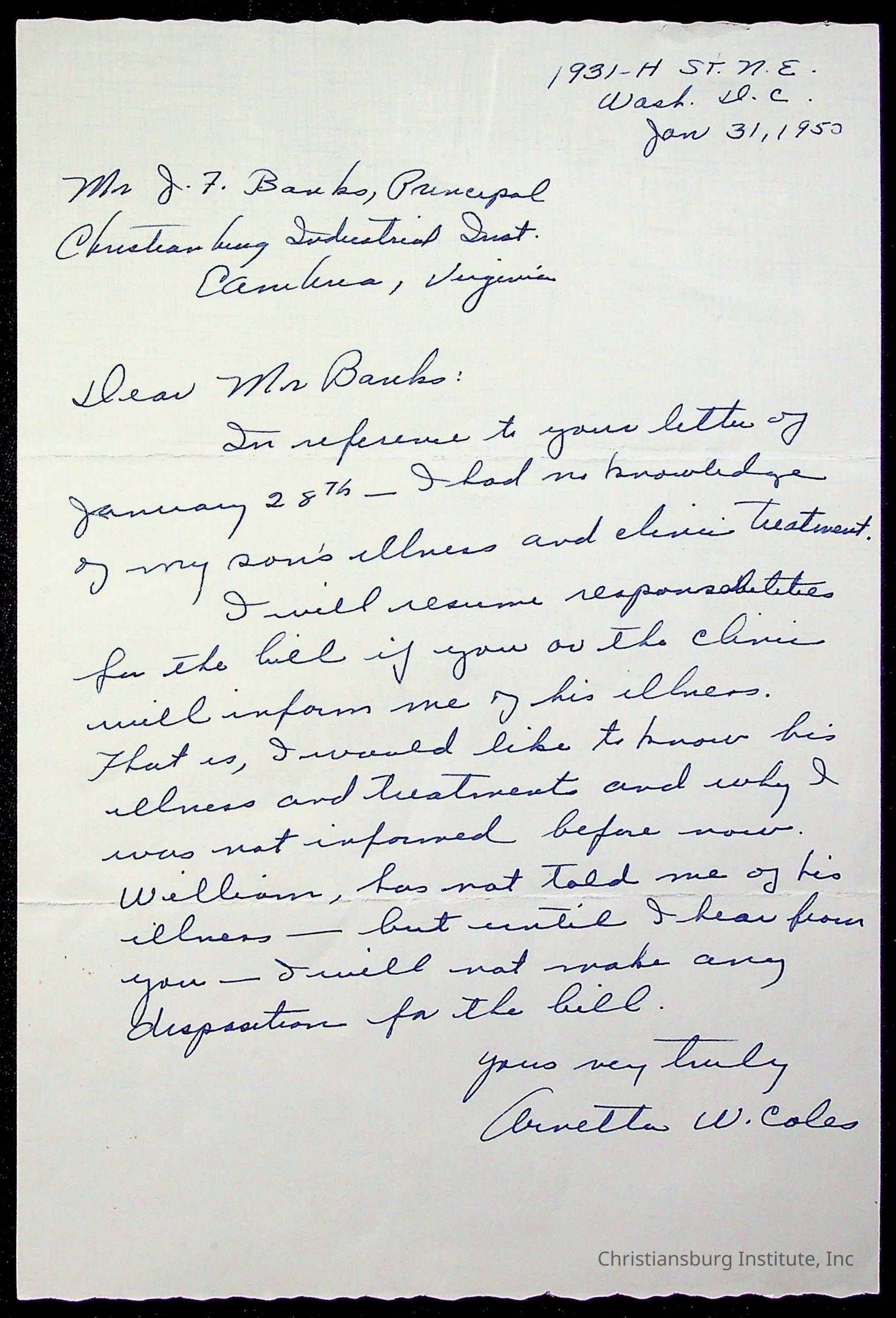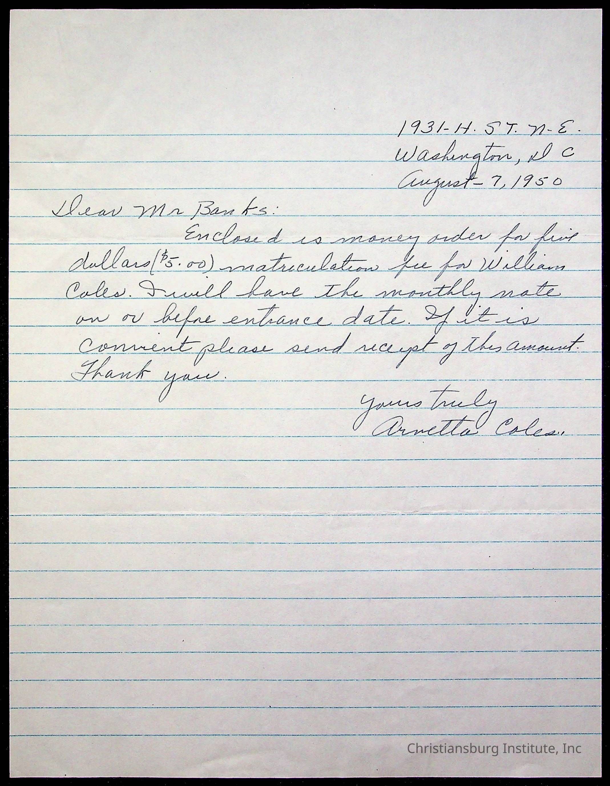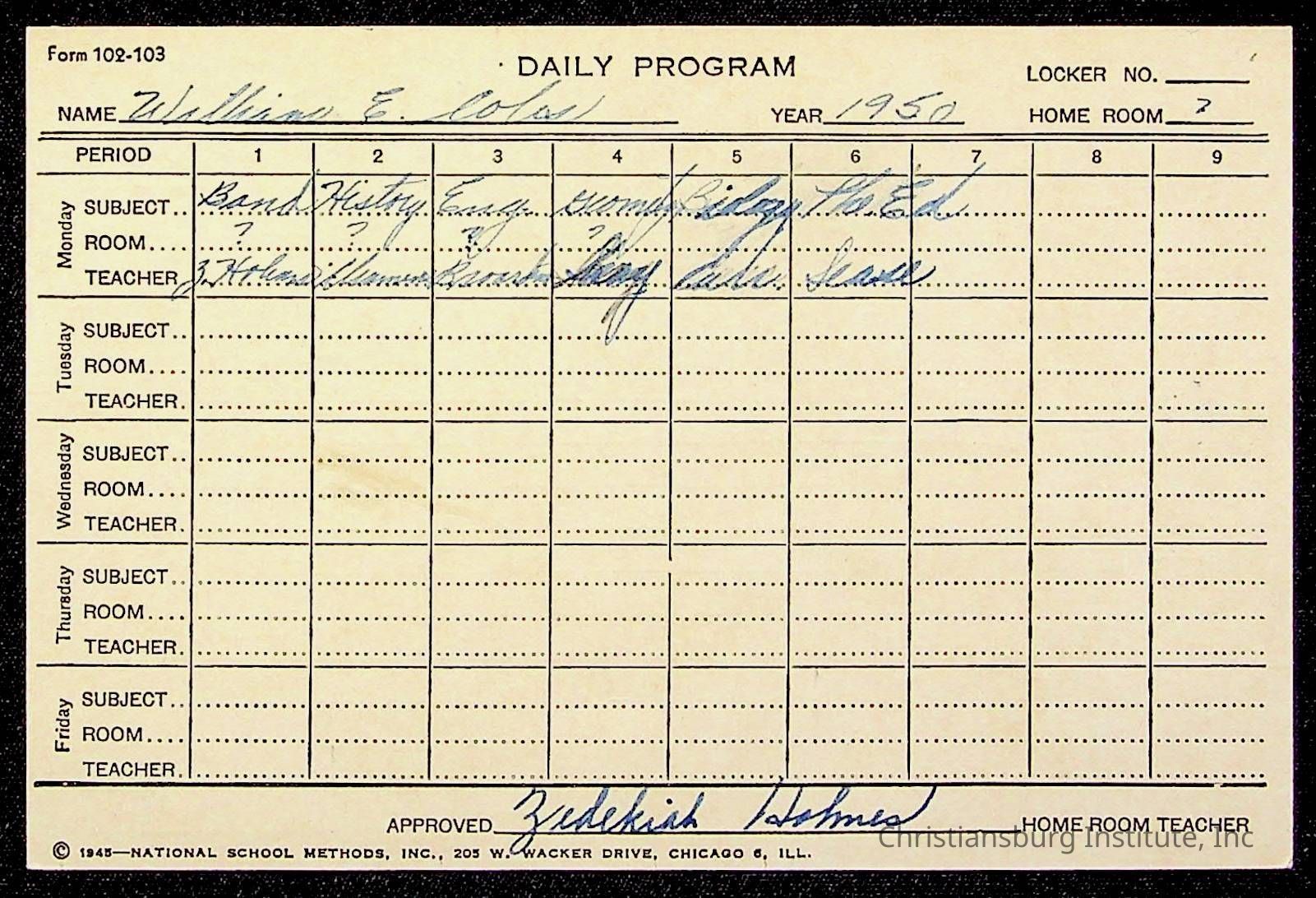 The student file for the Christiansburg Institute student, William Ennis Coles circa 1940s-1950s.