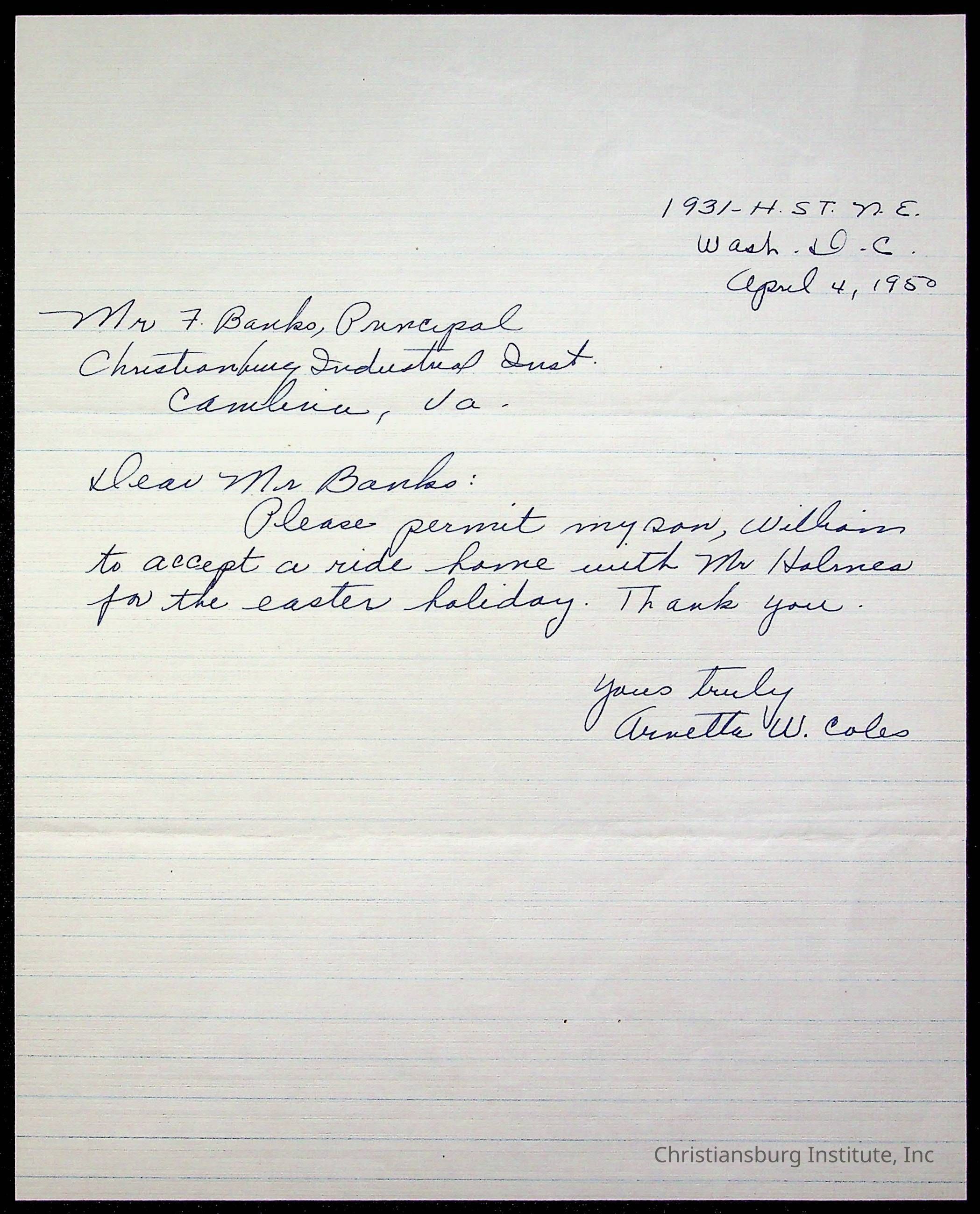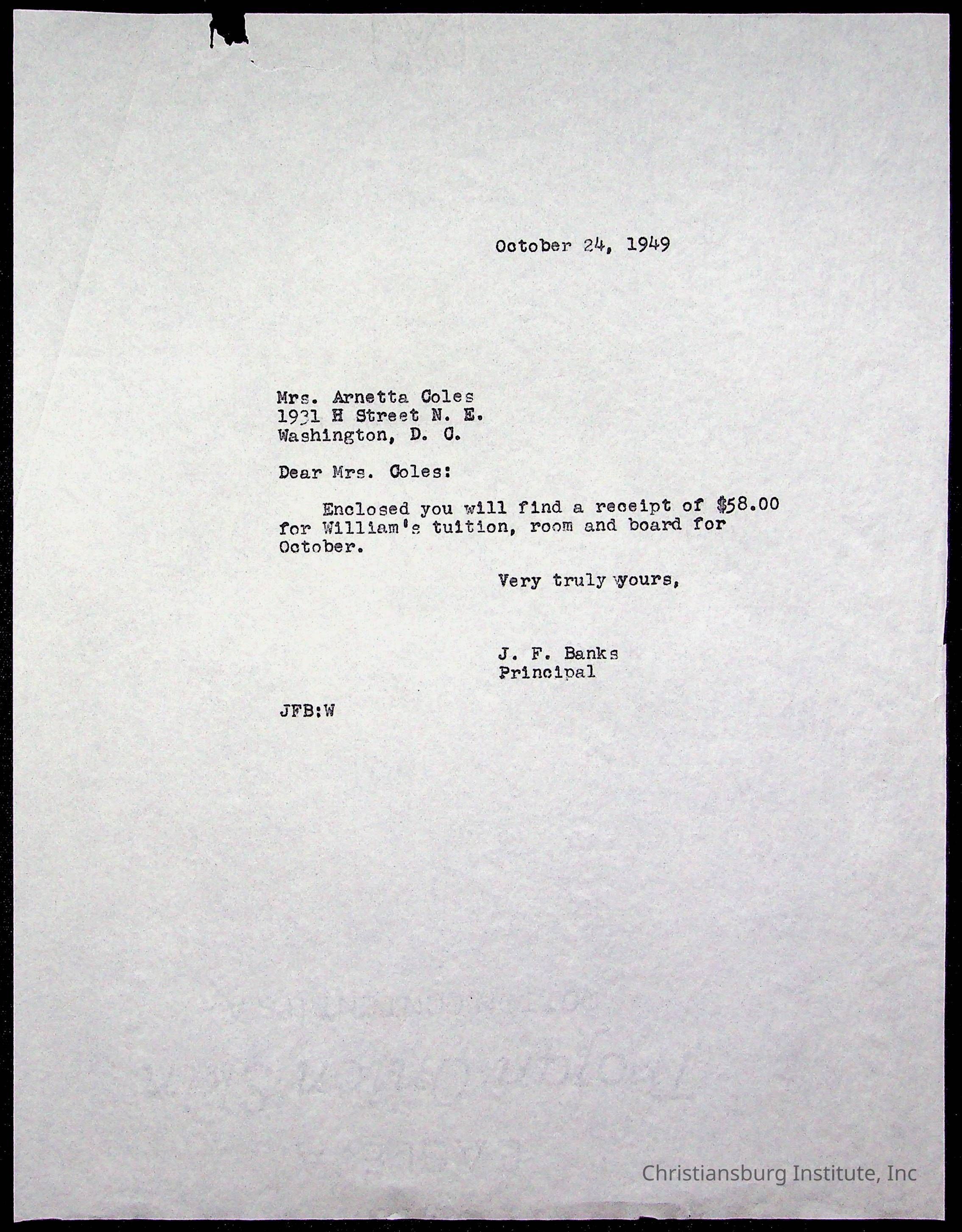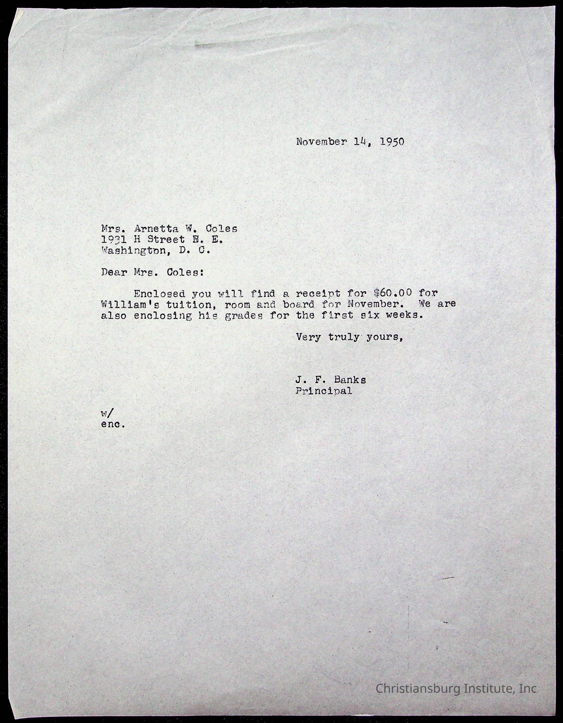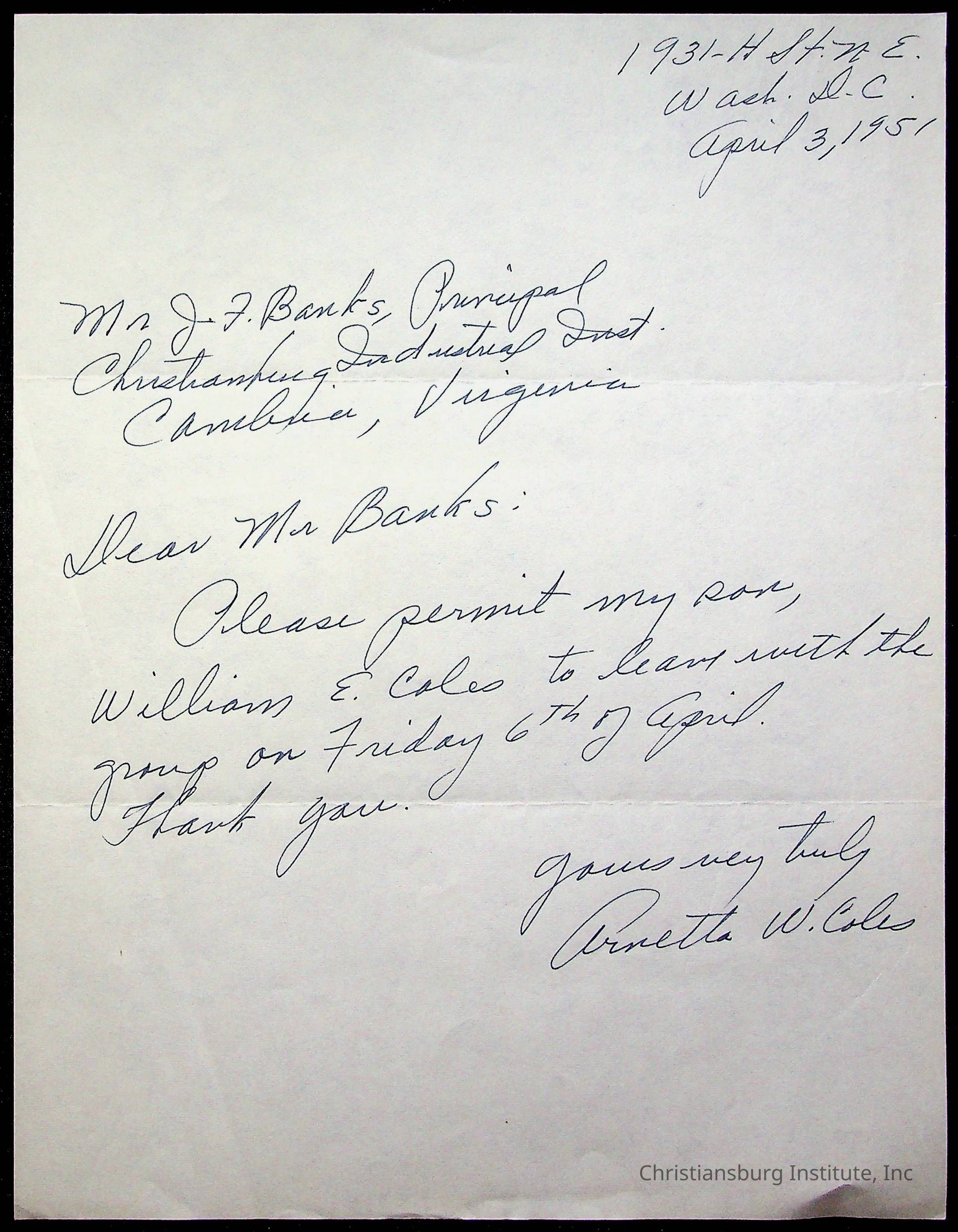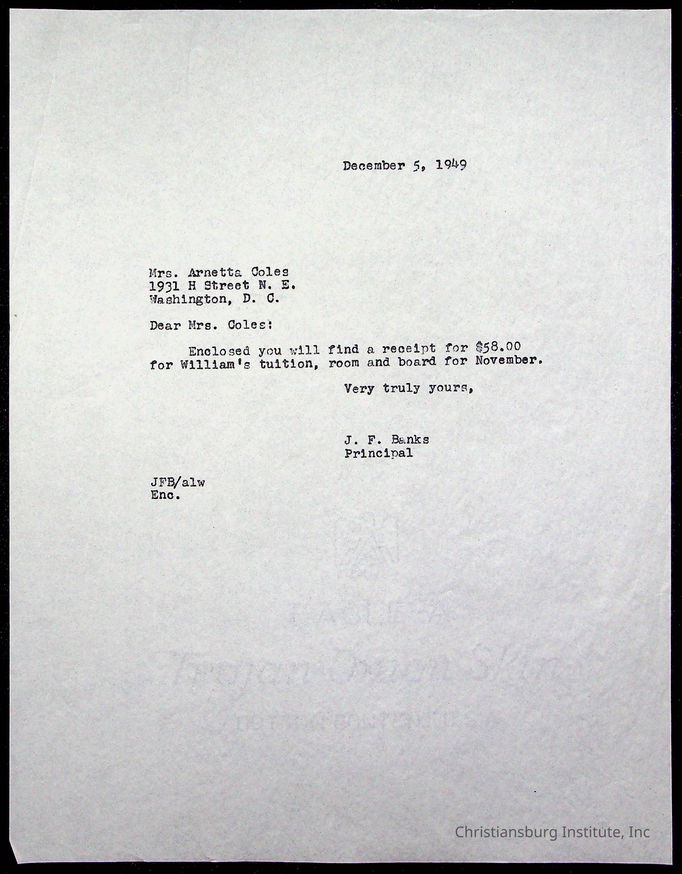The student file for the Christiansburg Institute student, William Ennis Coles circa 1940s-1950s.