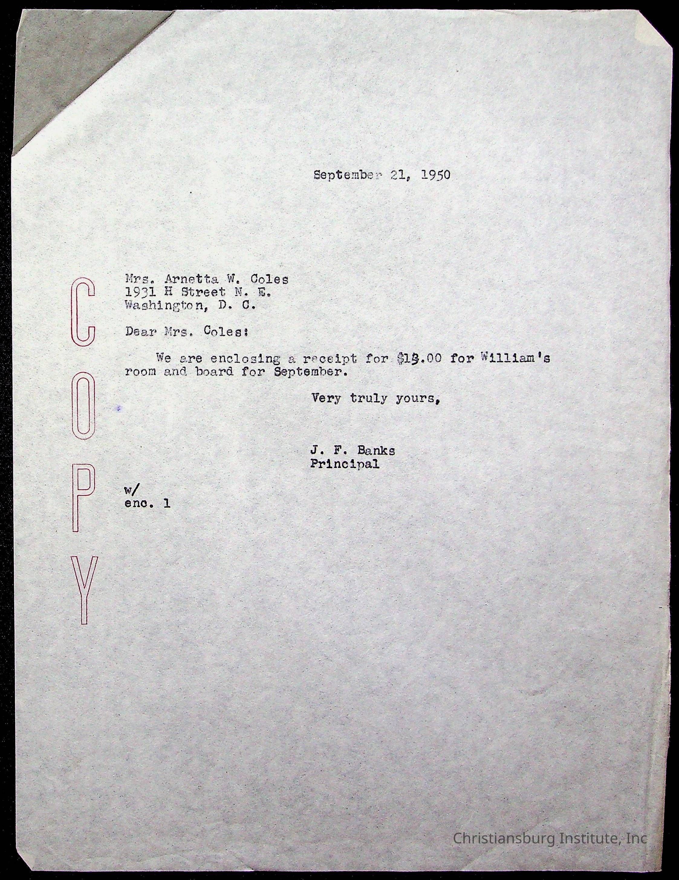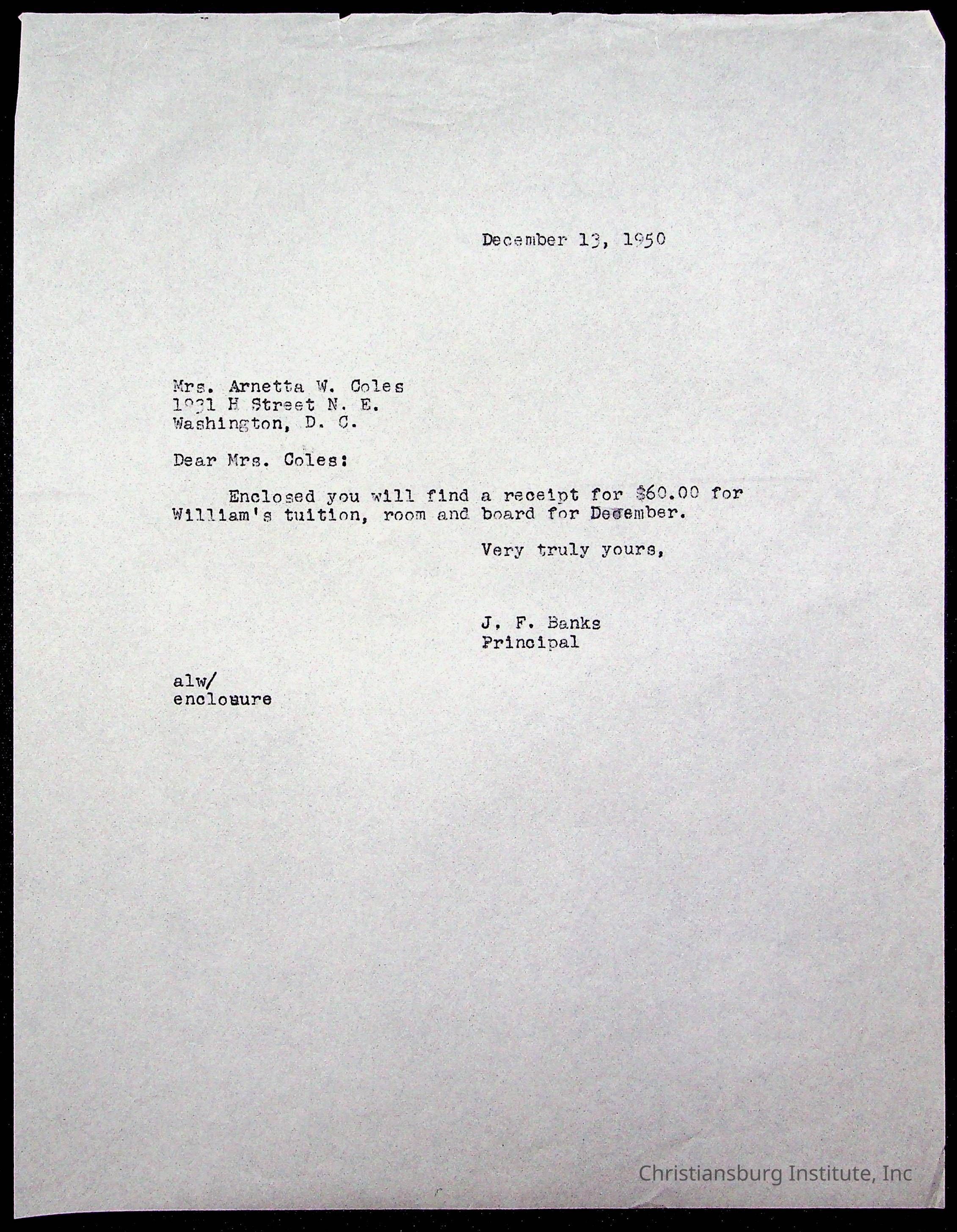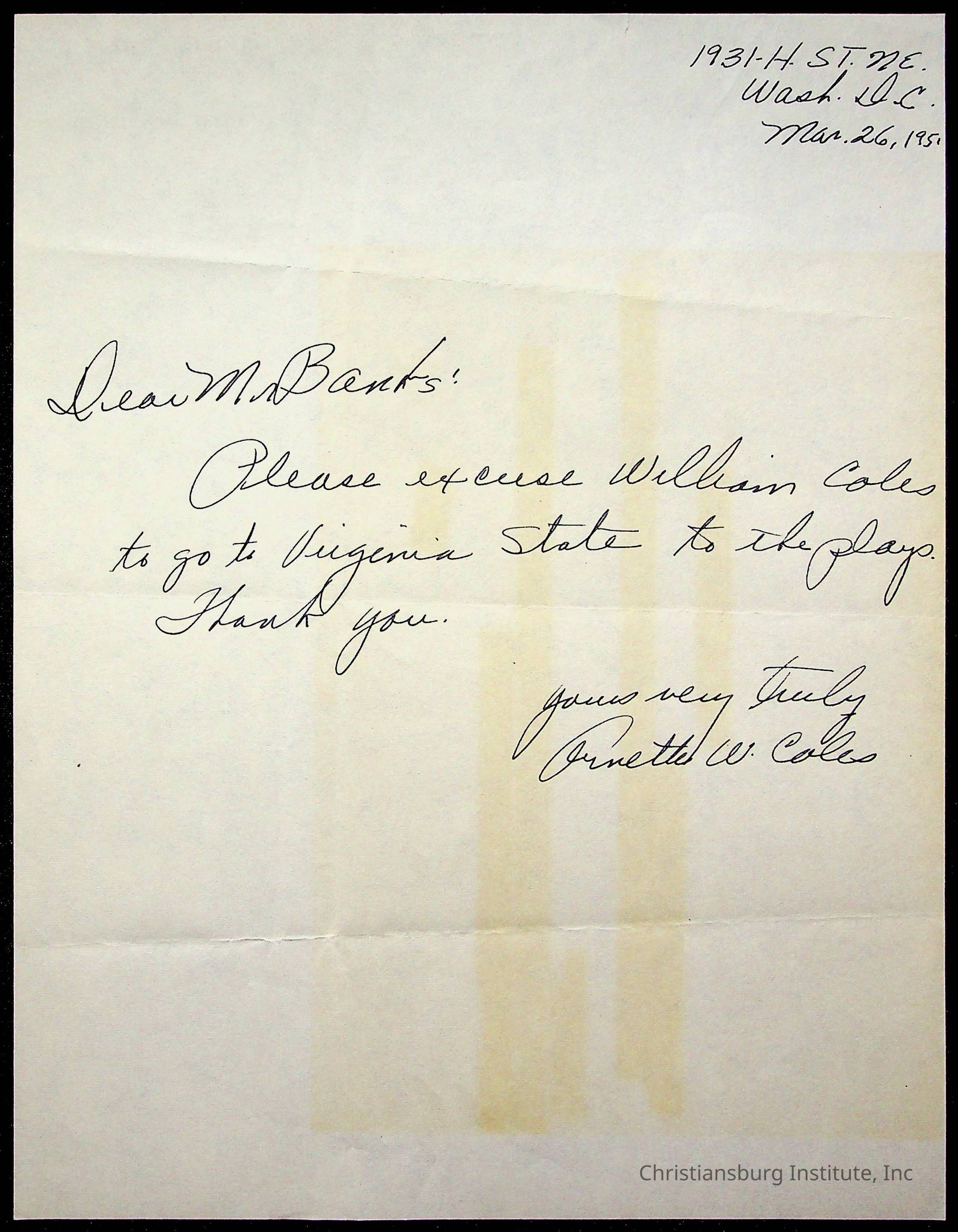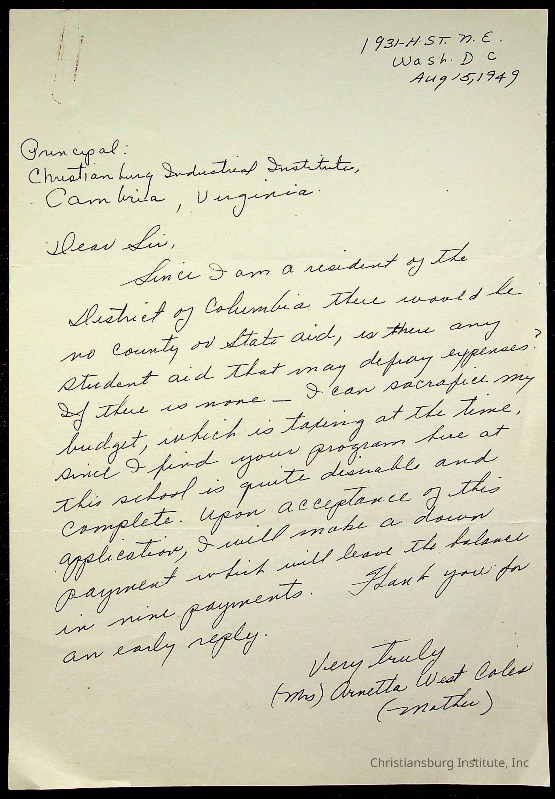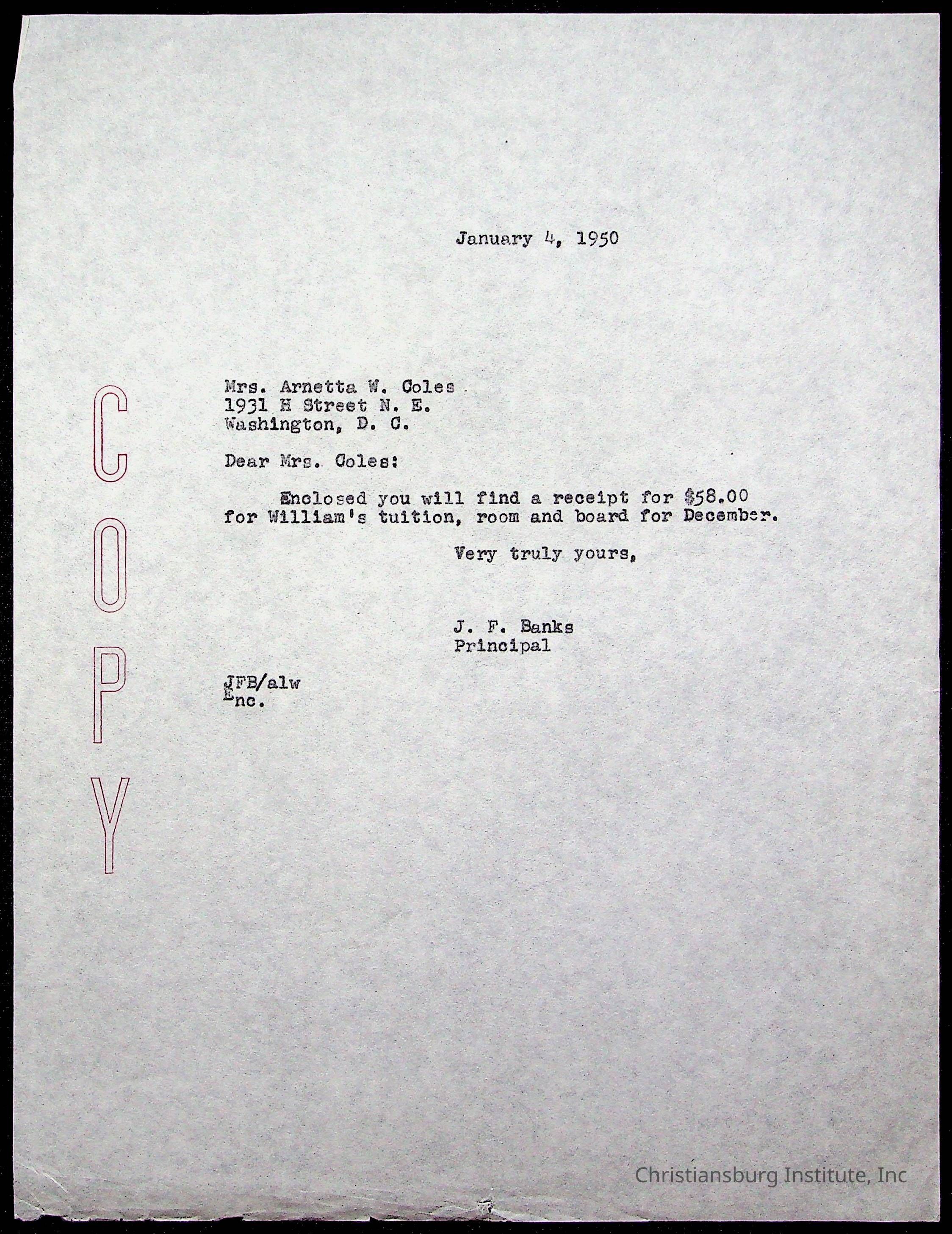 The student file for the Christiansburg Institute student, William Ennis Coles circa 1940s-1950s.