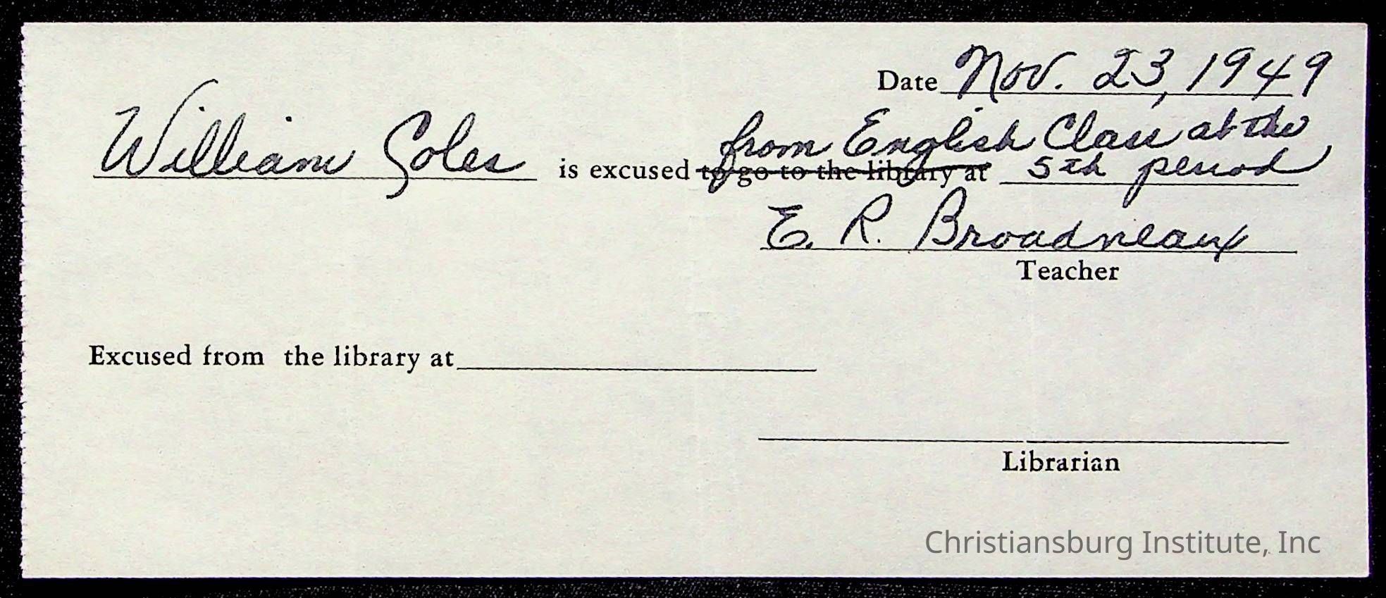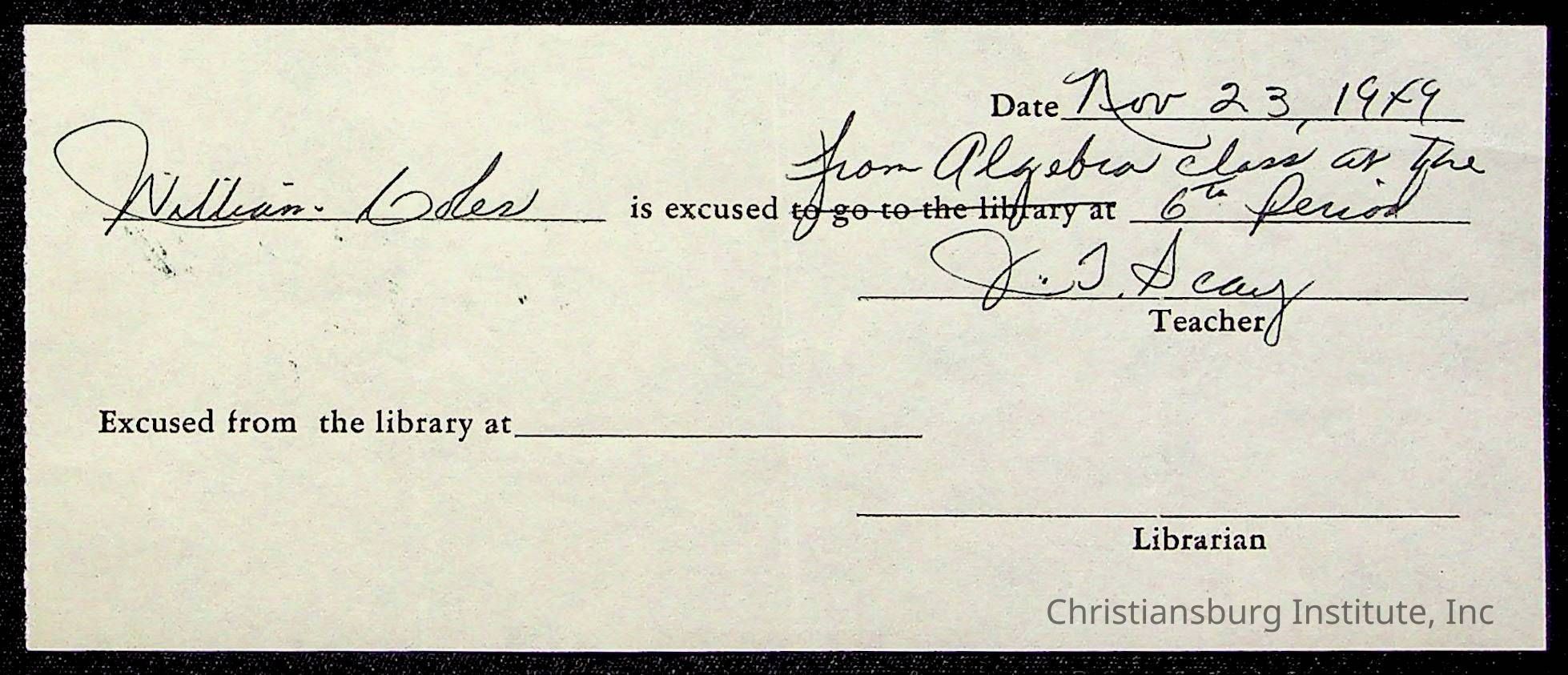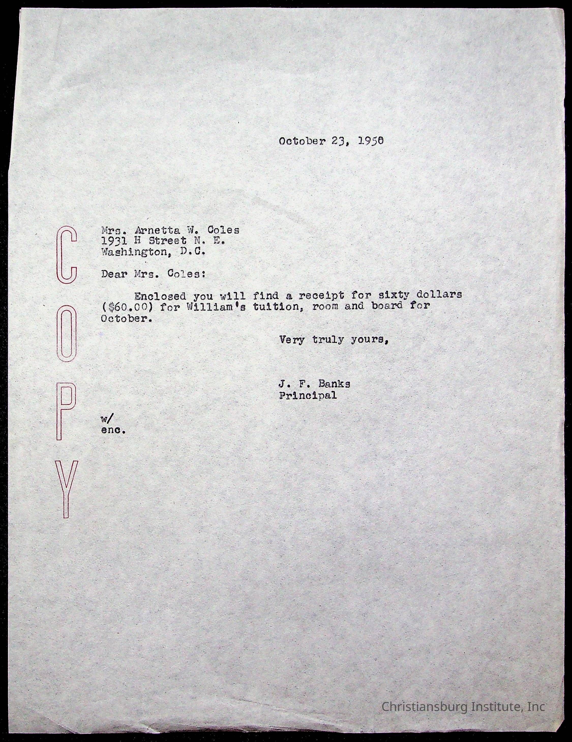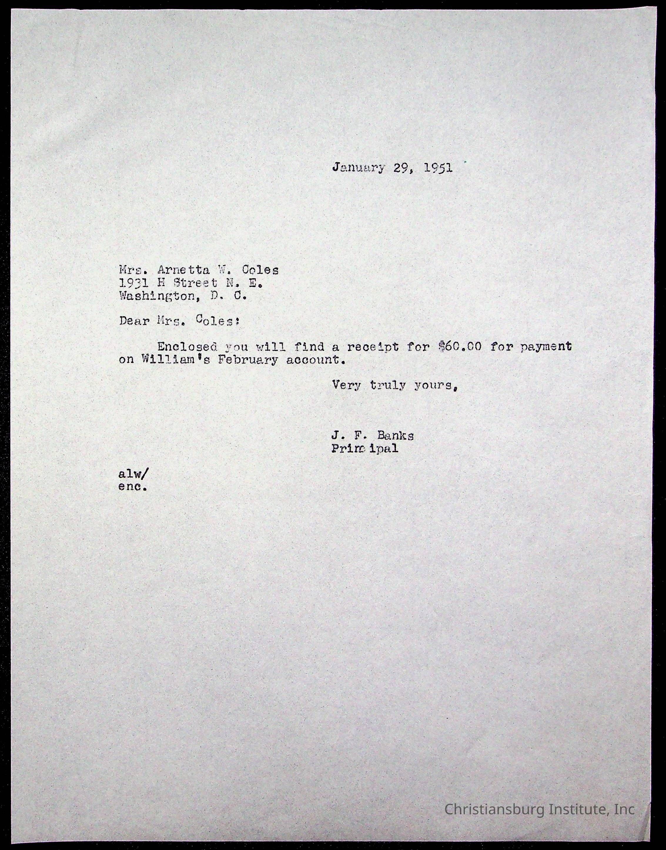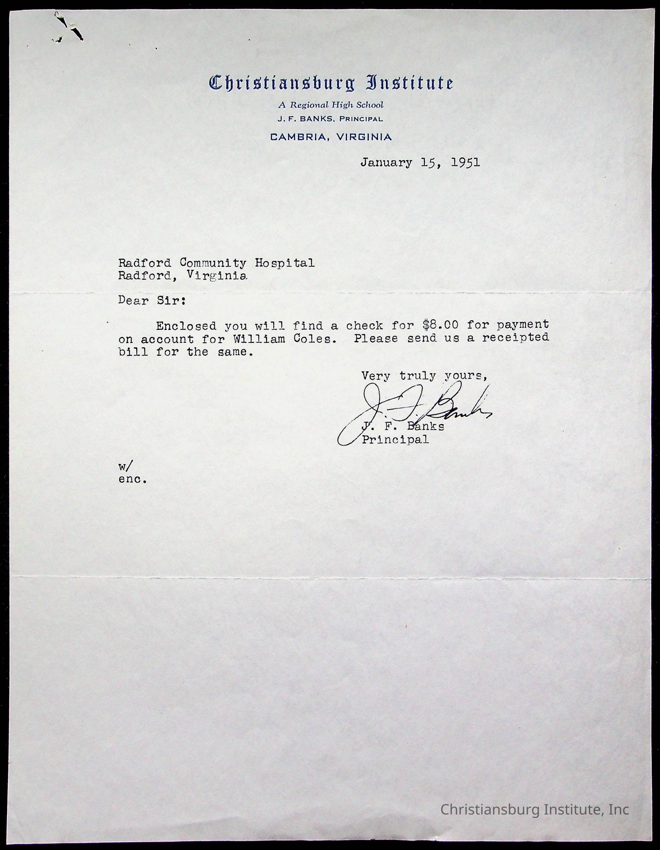 The student file for the Christiansburg Institute student, William Ennis Coles circa 1940s-1950s.