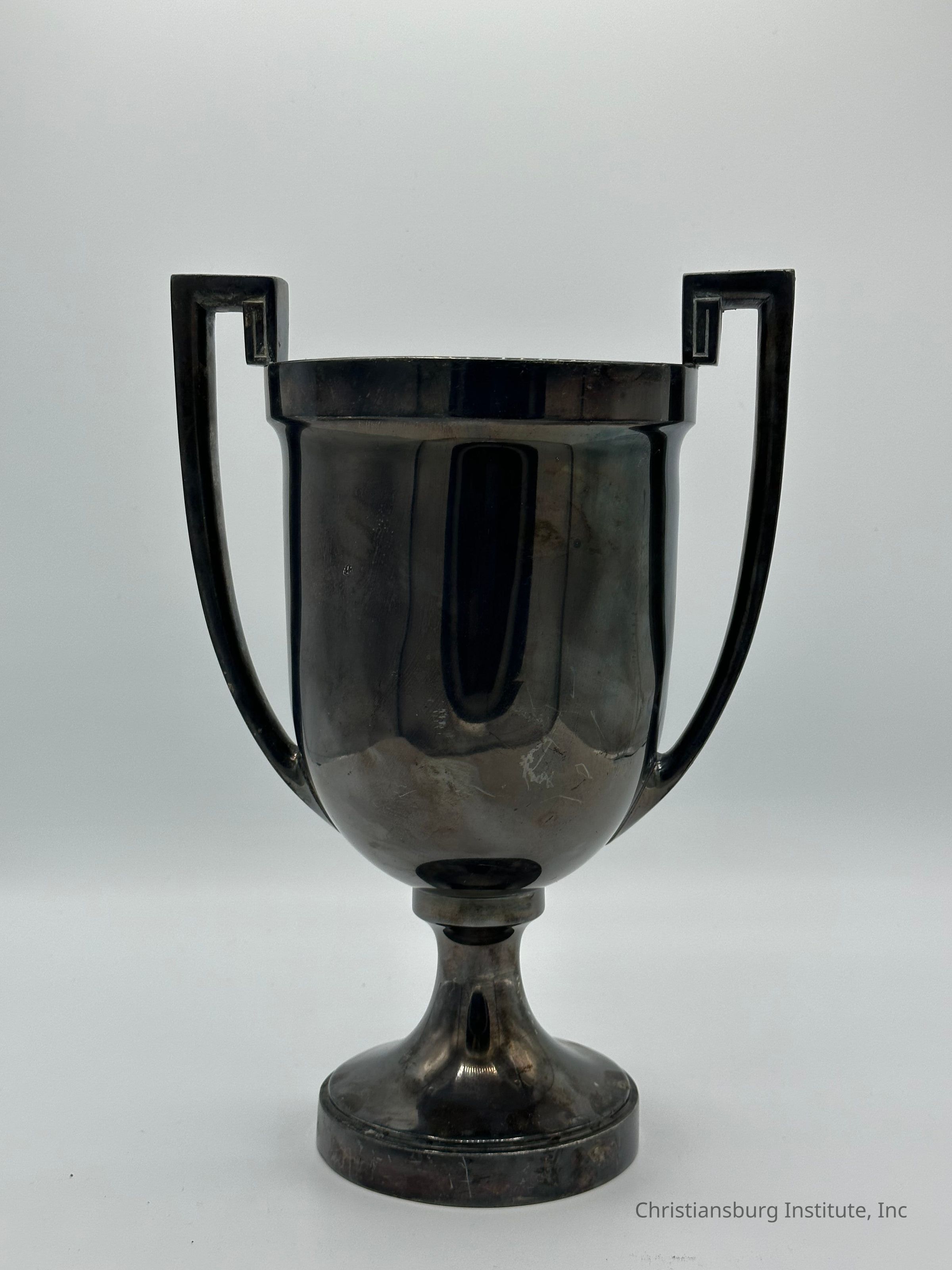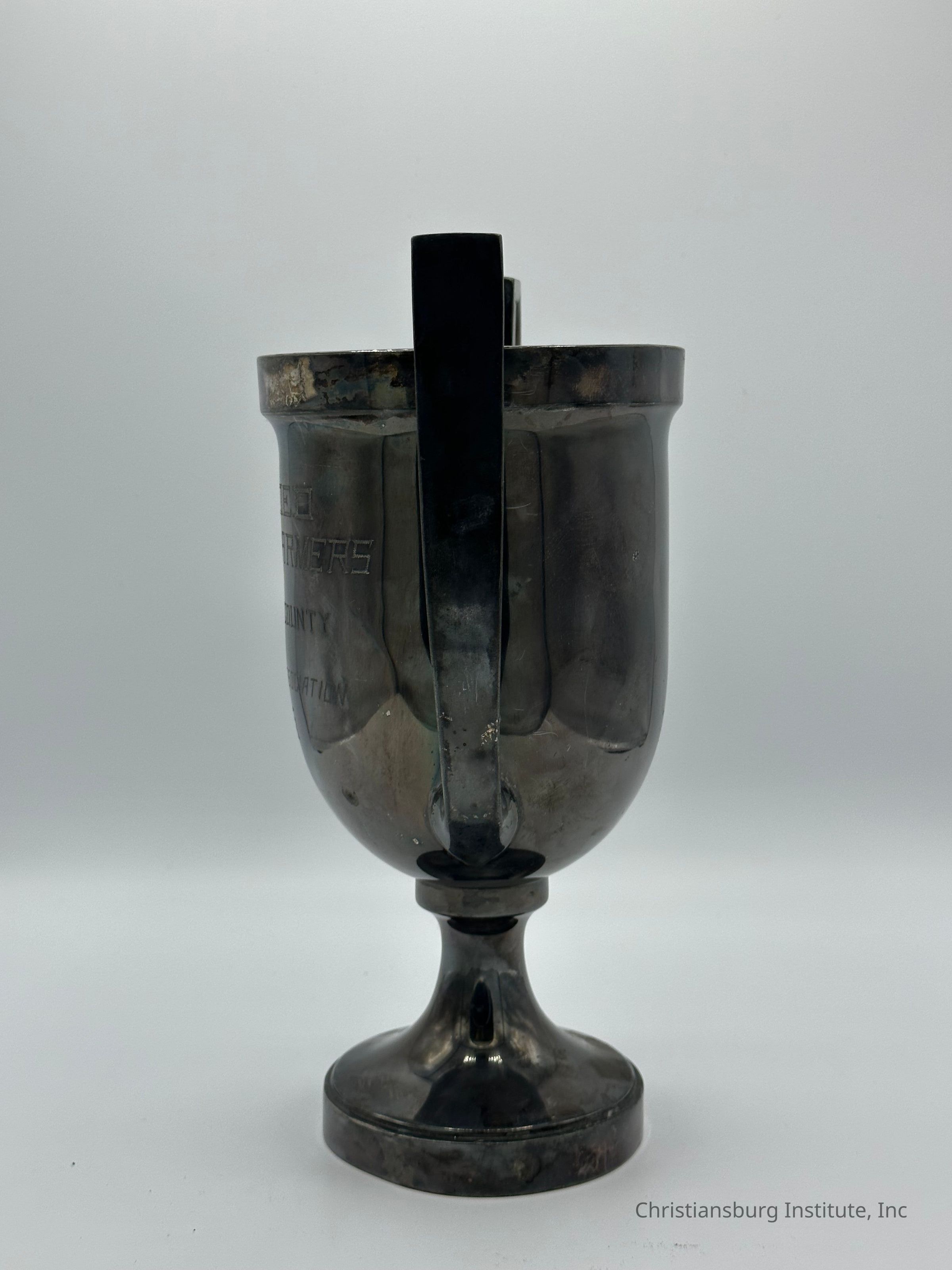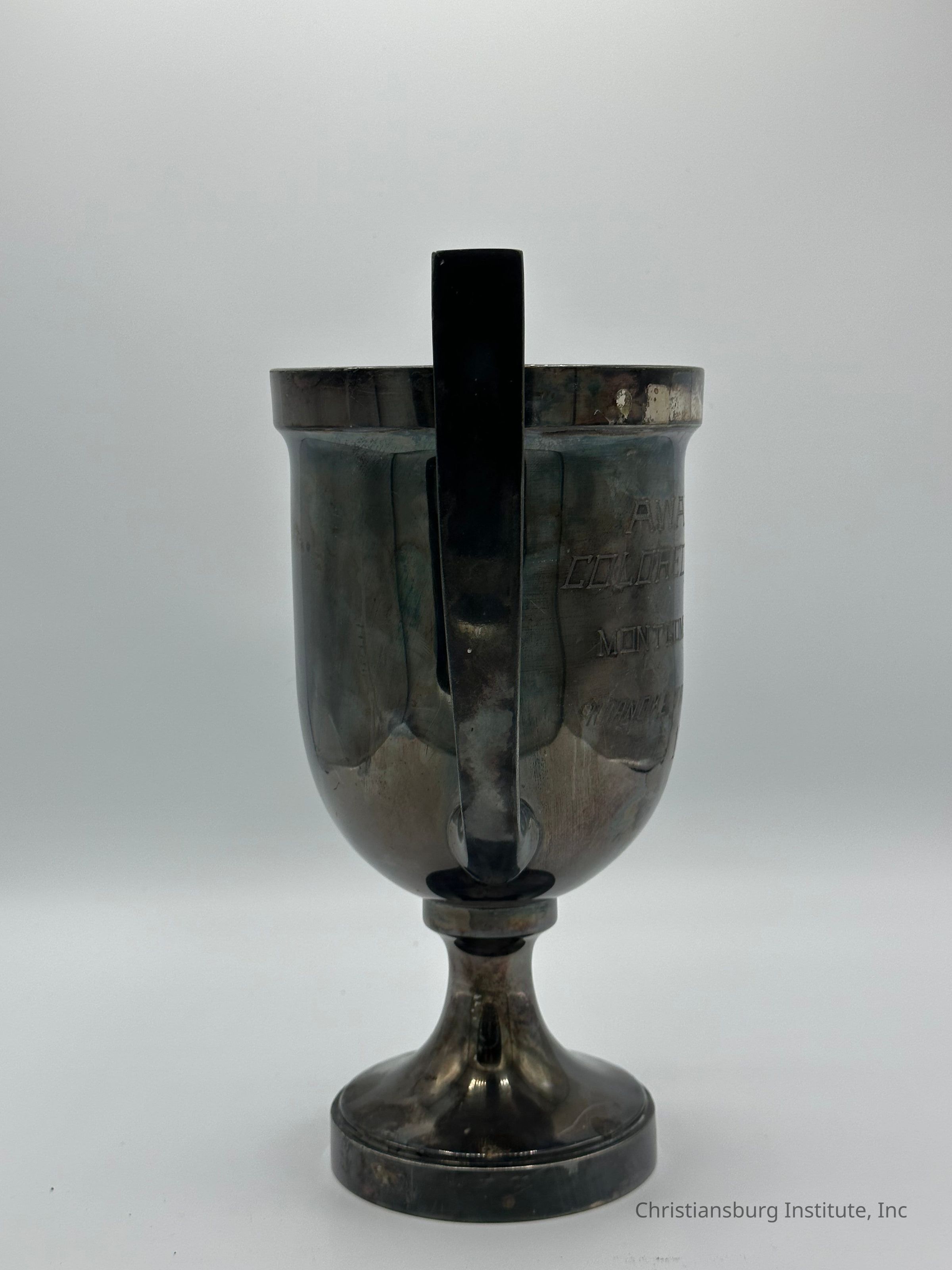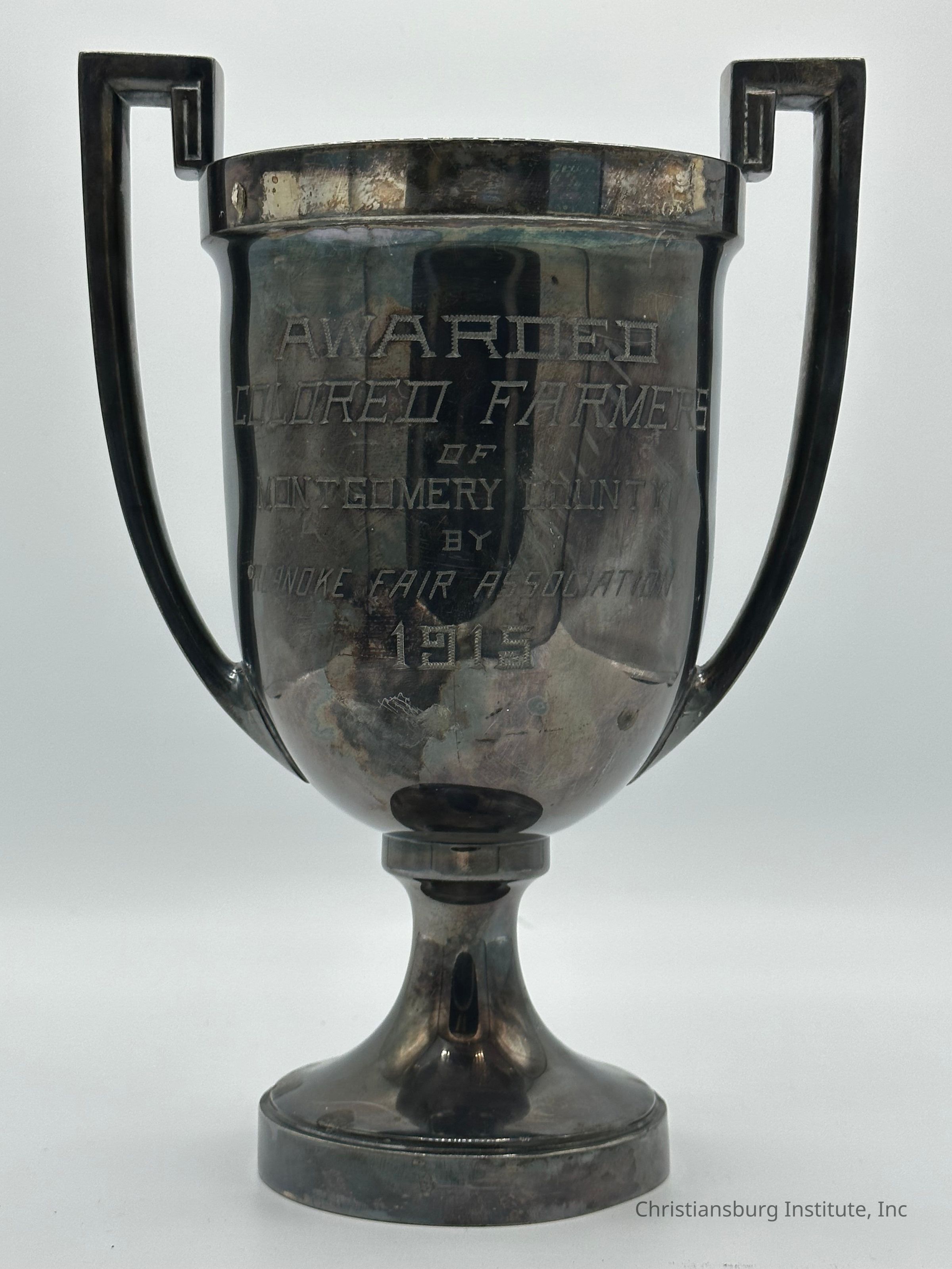 This artifact is a silver-plated trophy cup awarded to the Colored Farmers of Montgomery County in 1915 by the Roanoke Fair Association. Standing approximately 10.5 inches tall, the trophy is finely crafted, featuring a classic cup design with ornate handles and an engraved inscription on its front surface. The text reads: "Awarded Colored Farmers of Montgomery County – Roanoke Fair Association, 1915"
