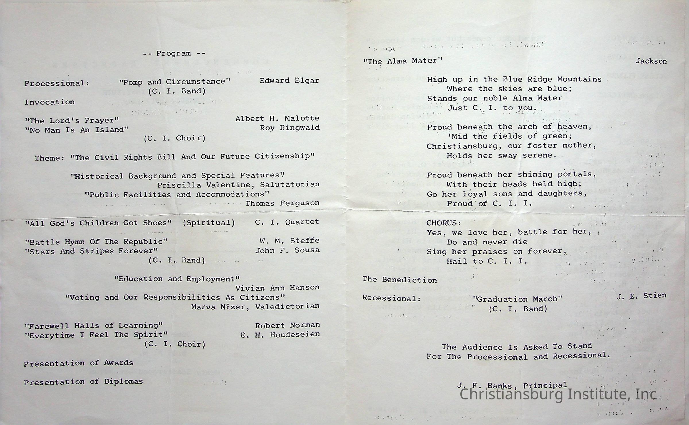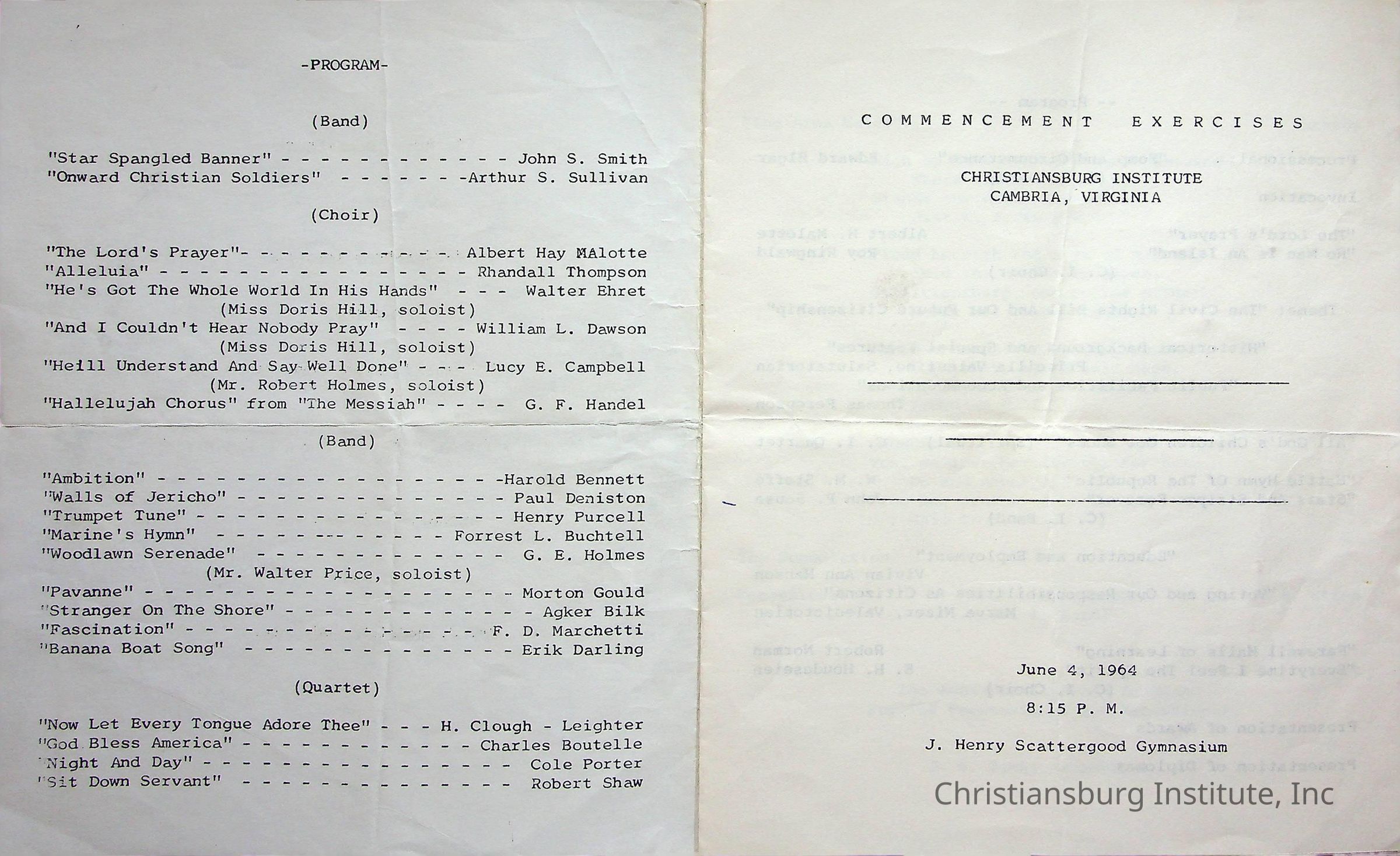 A commencement program for Christiansburg Institute commencement that took place on June 4th, 1964 at 8:15 pm at the J. Henry Scattergood Gymnasium.Creator