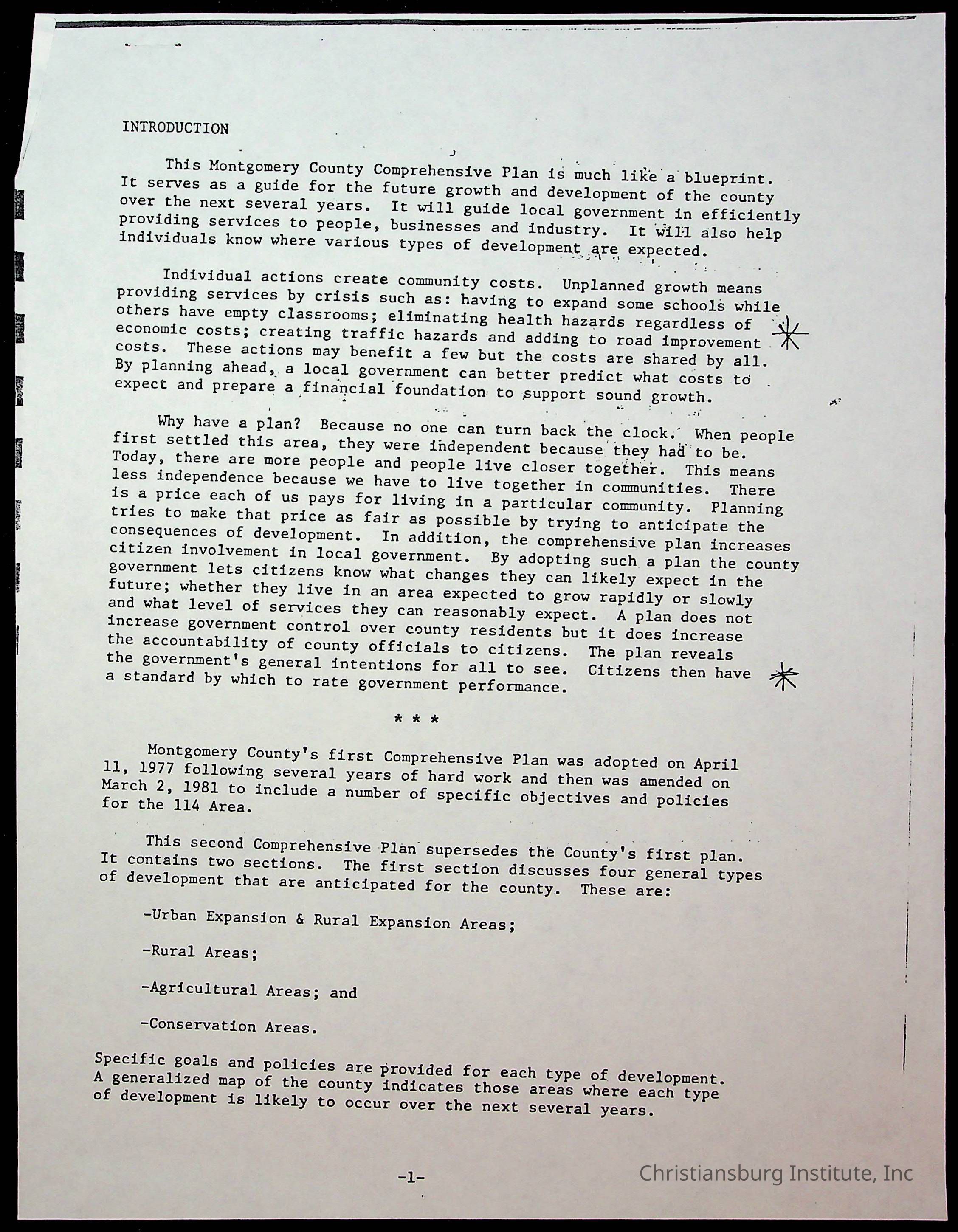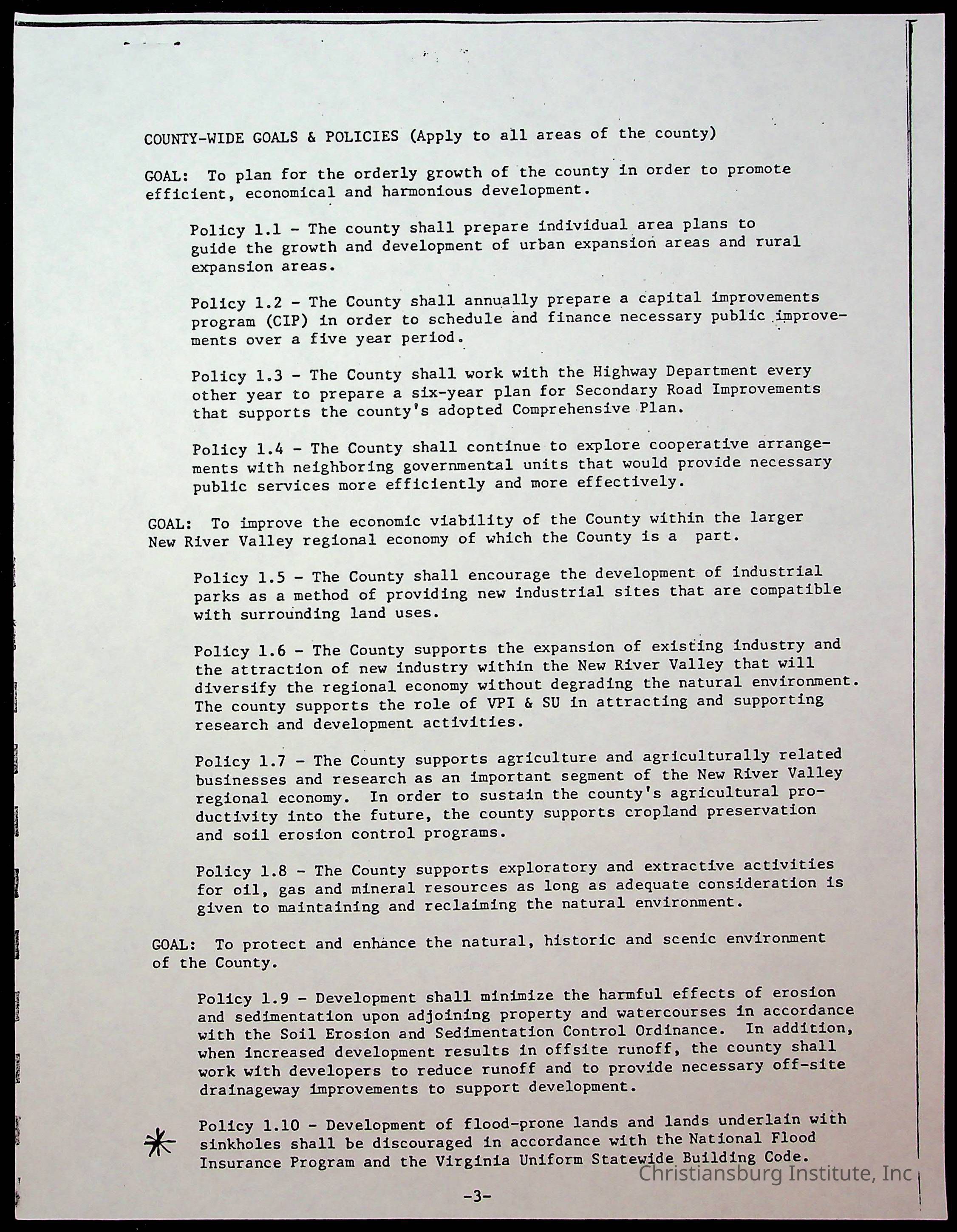 A copy of excerpts from the comprehensive plan for Montgomery County, Virginia undated. Copies made by Elizabeth Fine.