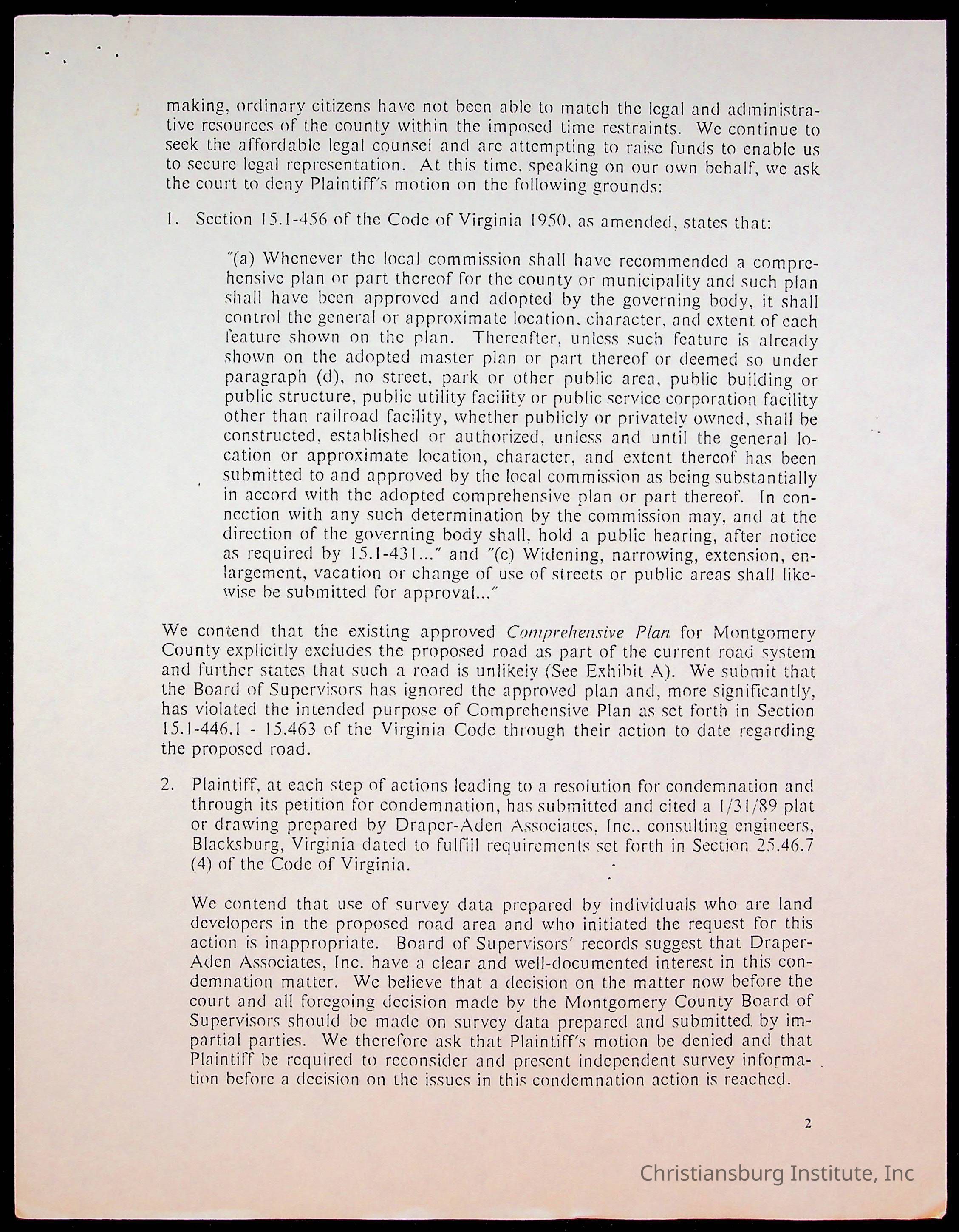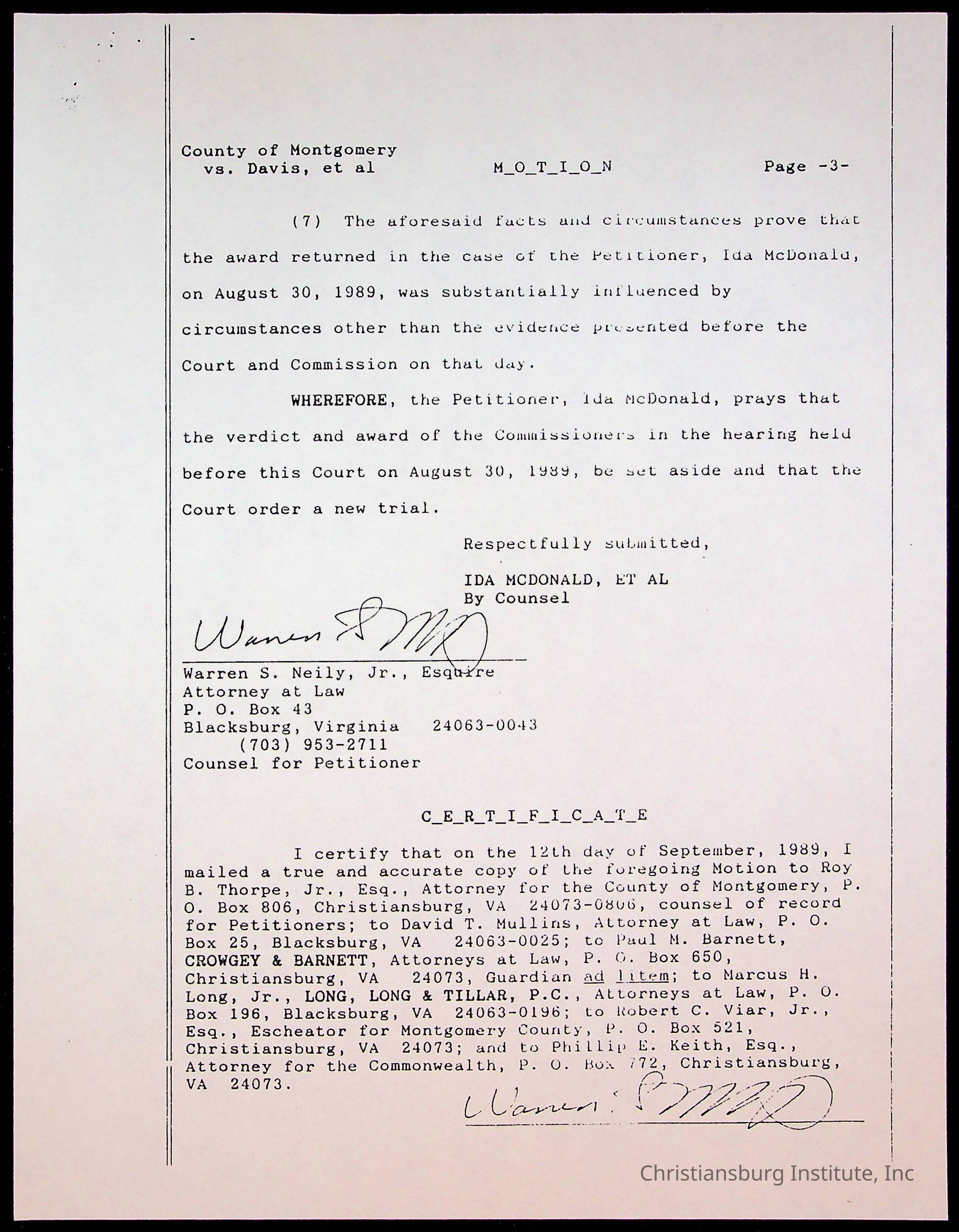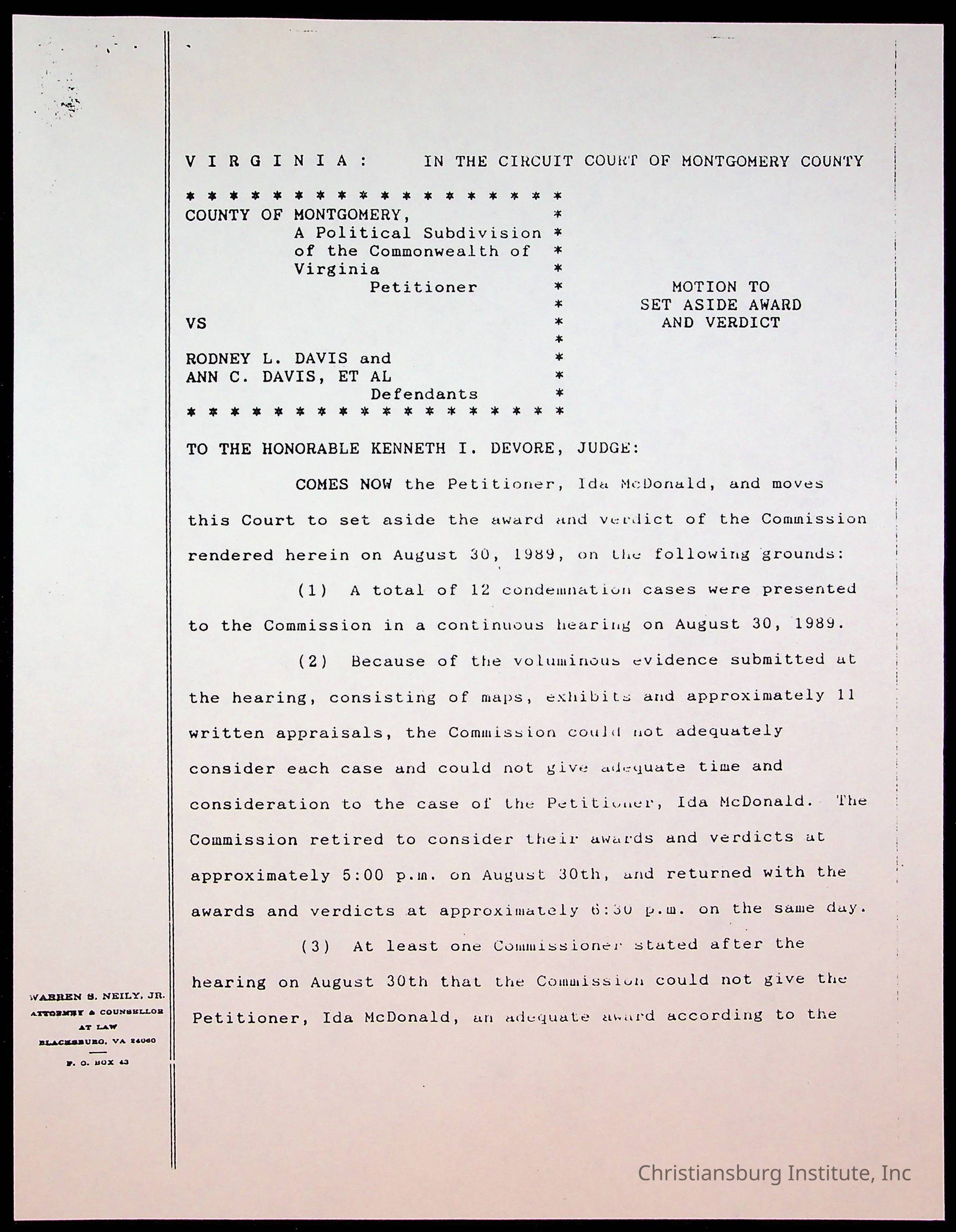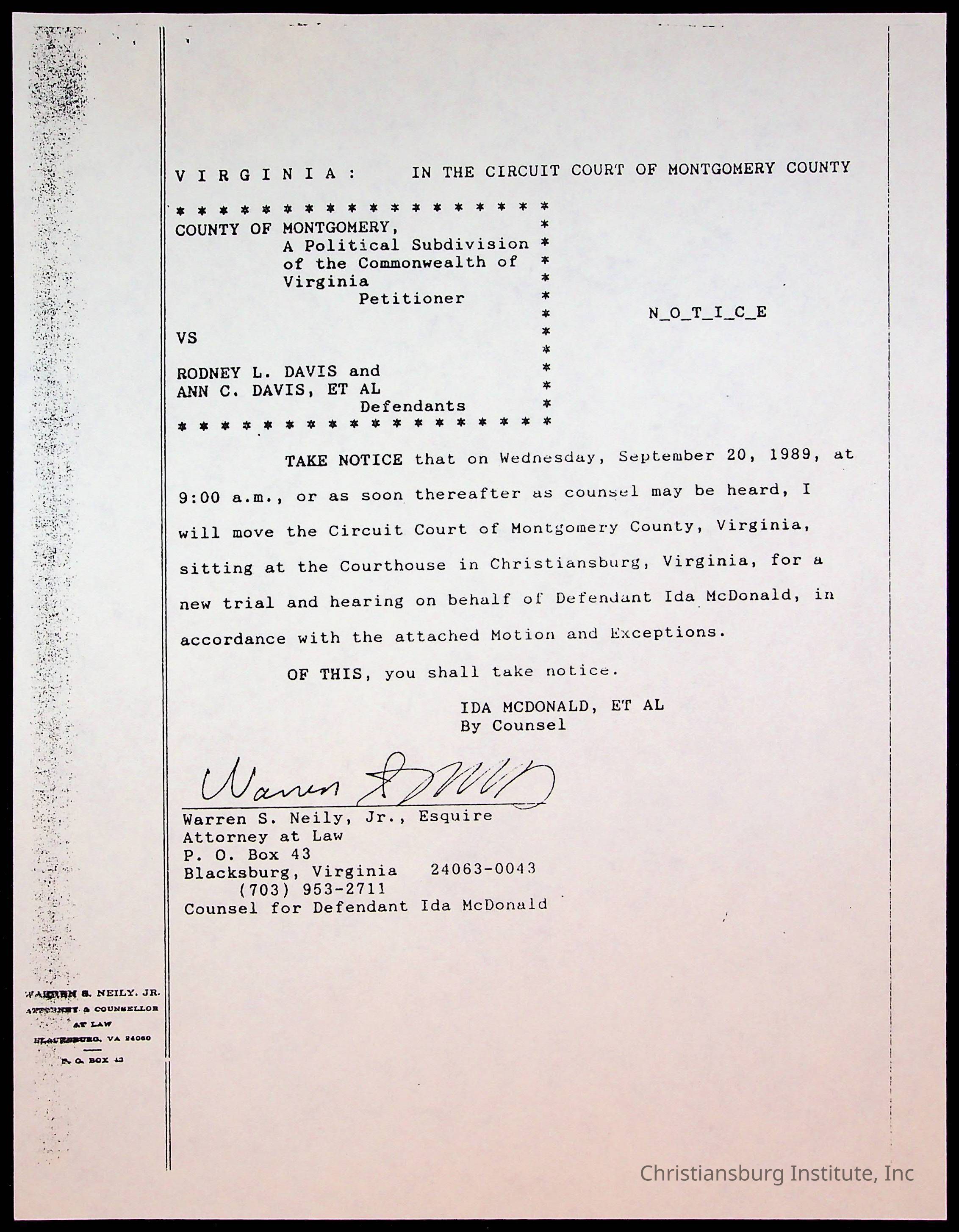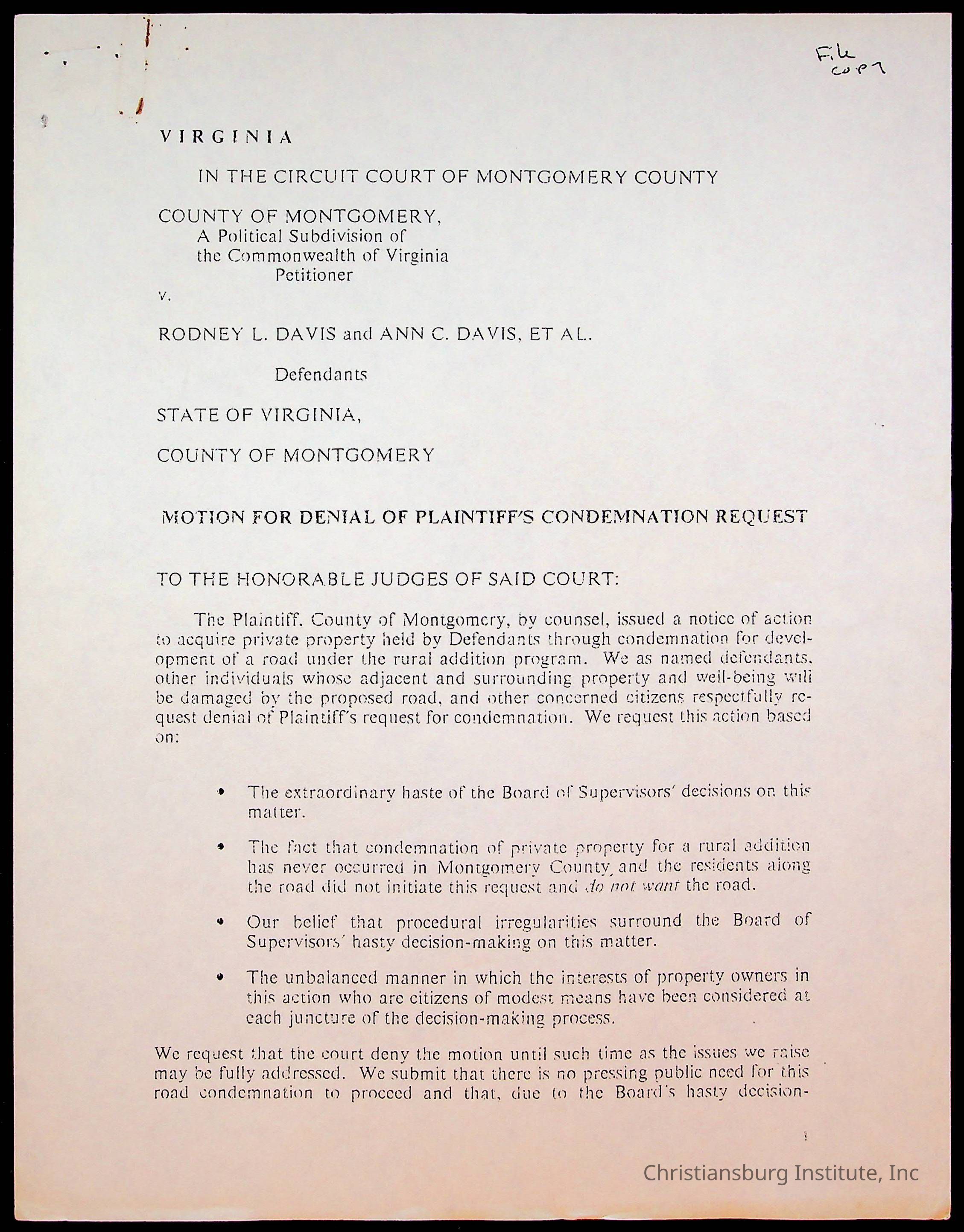 An archive of documents that detail a motion for denial of the plaintiff's condemnation request between the County of Montgomery and Rodney L. Davis and Ann C. Davis, et al. Dated 1989.