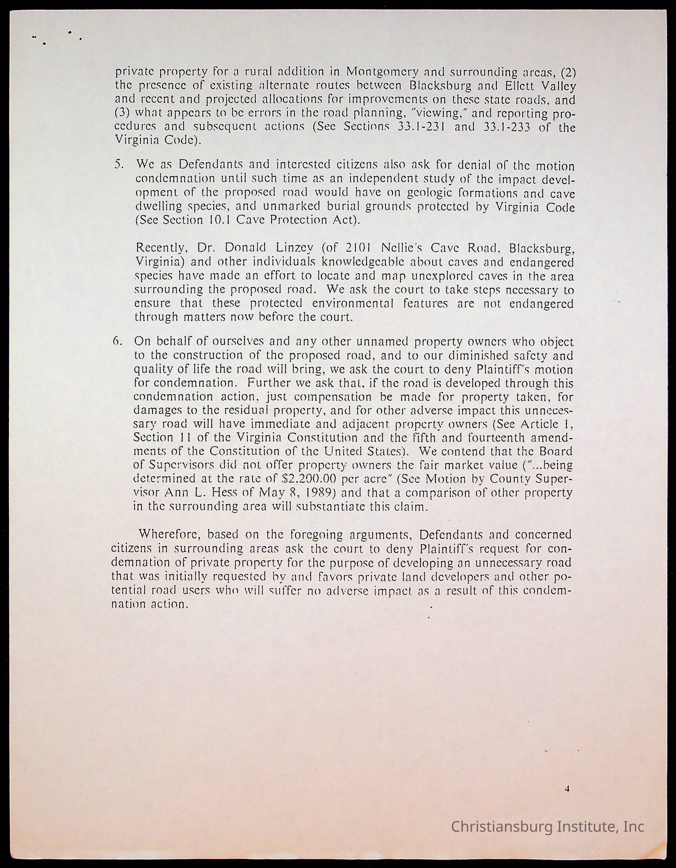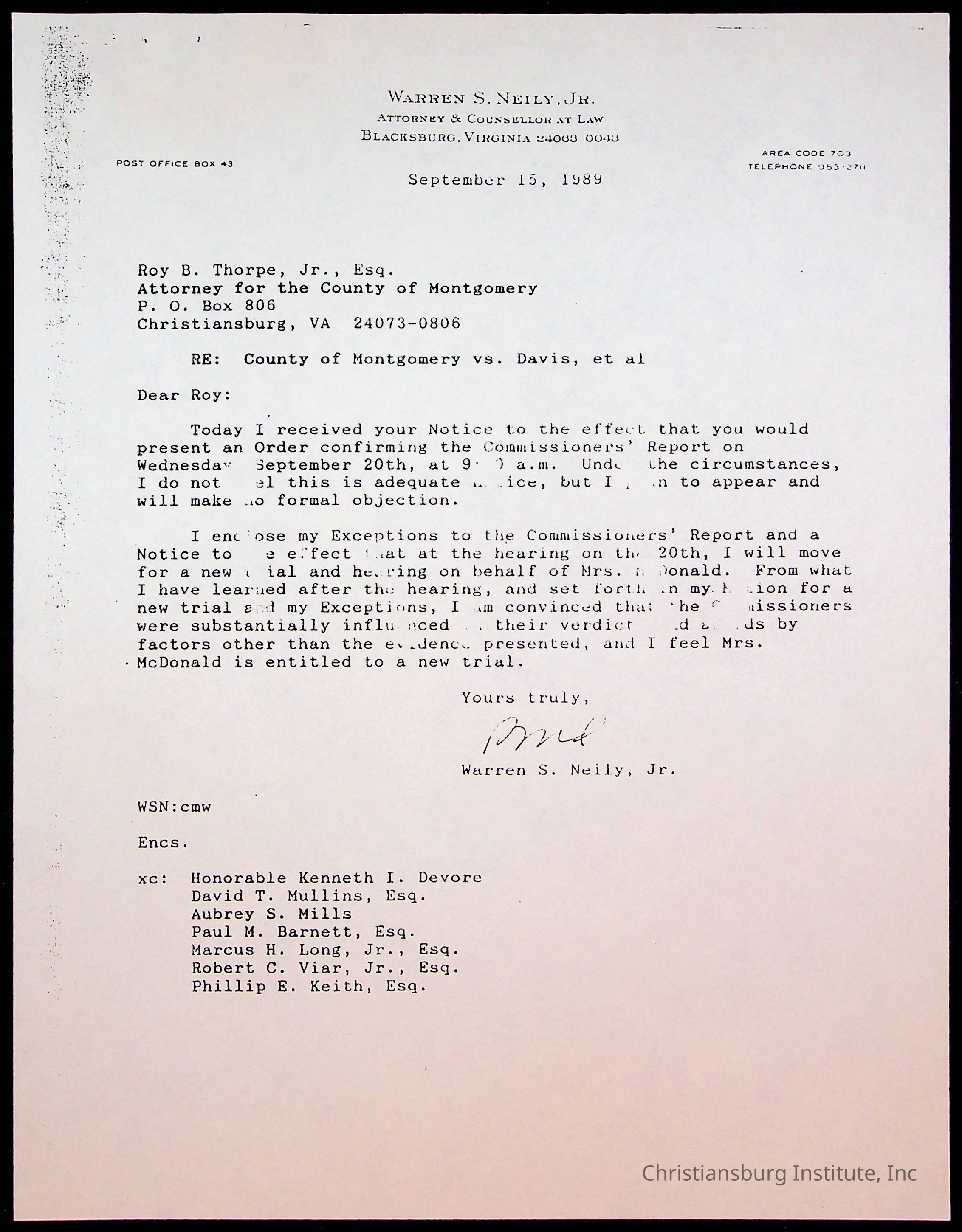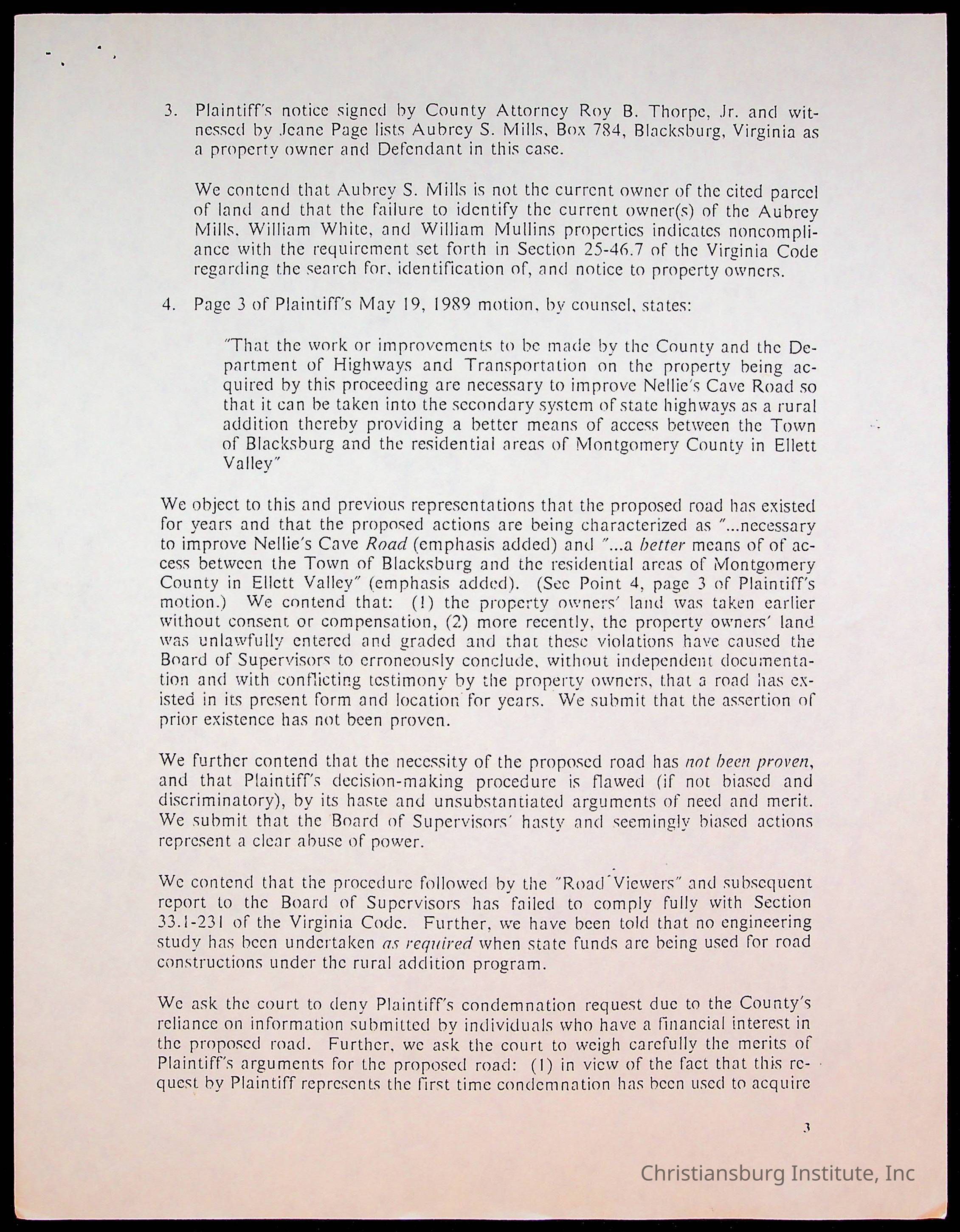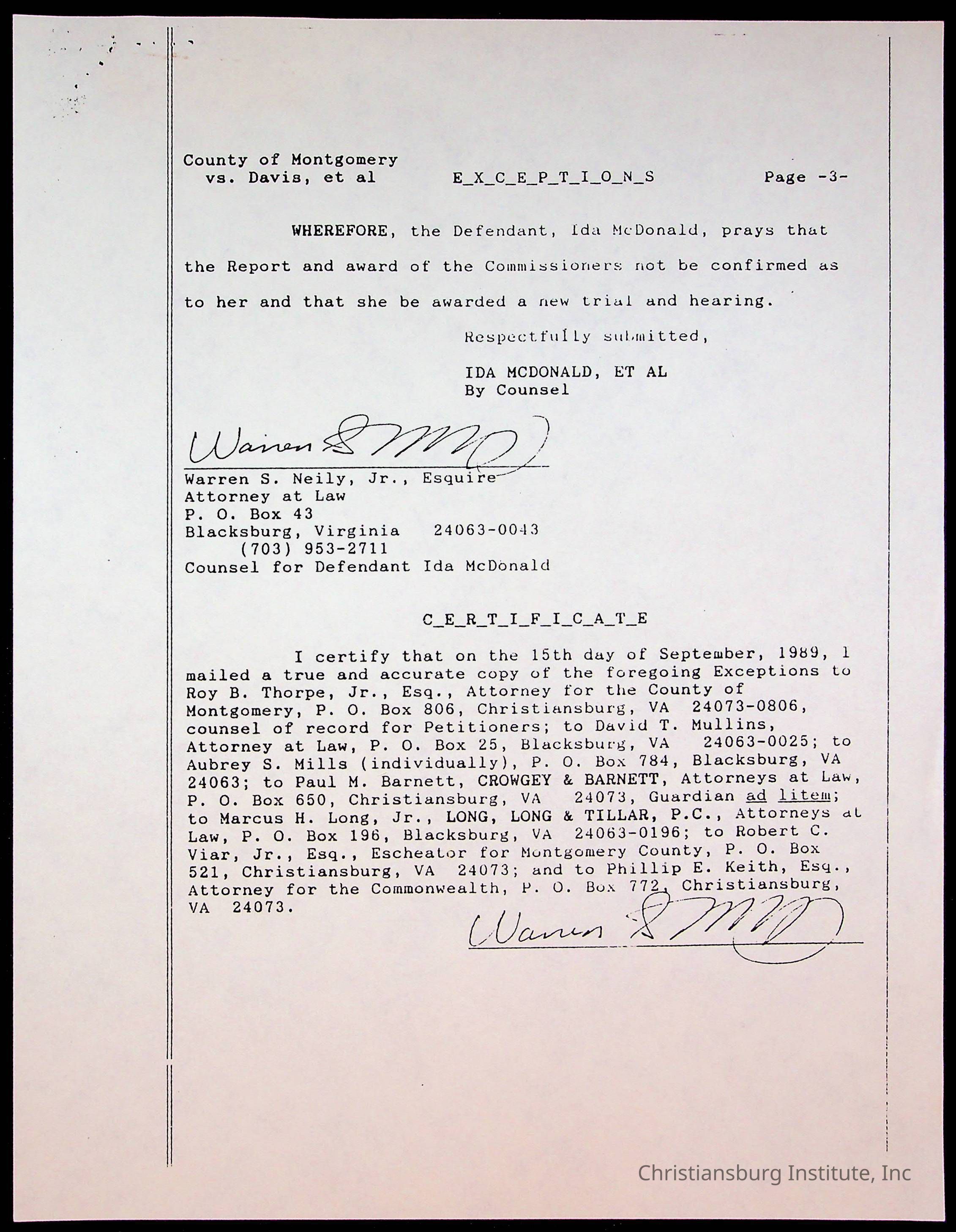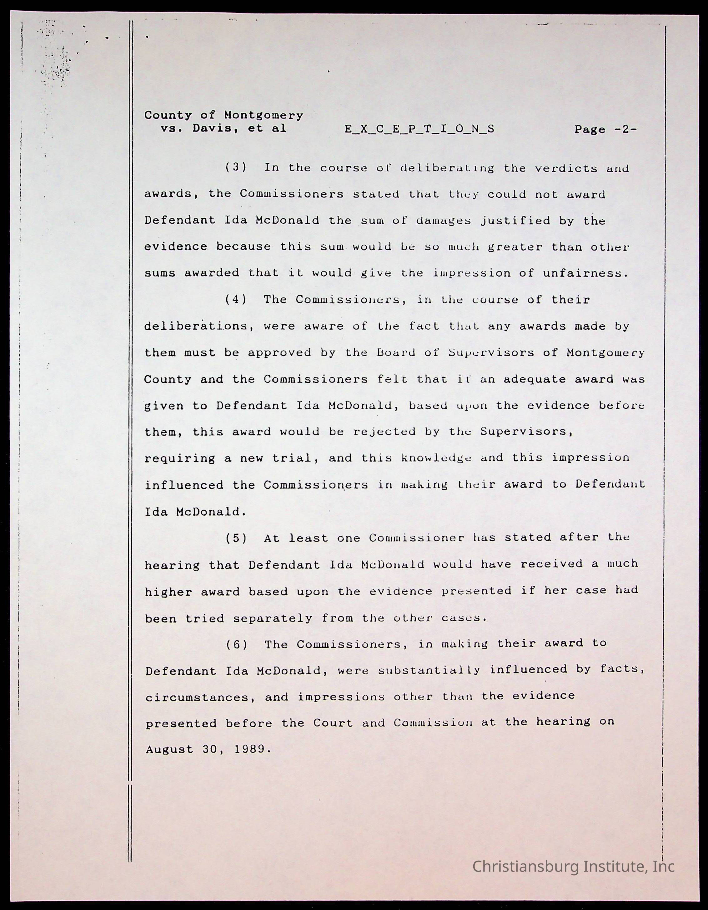 An archive of documents that detail a motion for denial of the plaintiff's condemnation request between the County of Montgomery and Rodney L. Davis and Ann C. Davis, et al. Dated 1989.