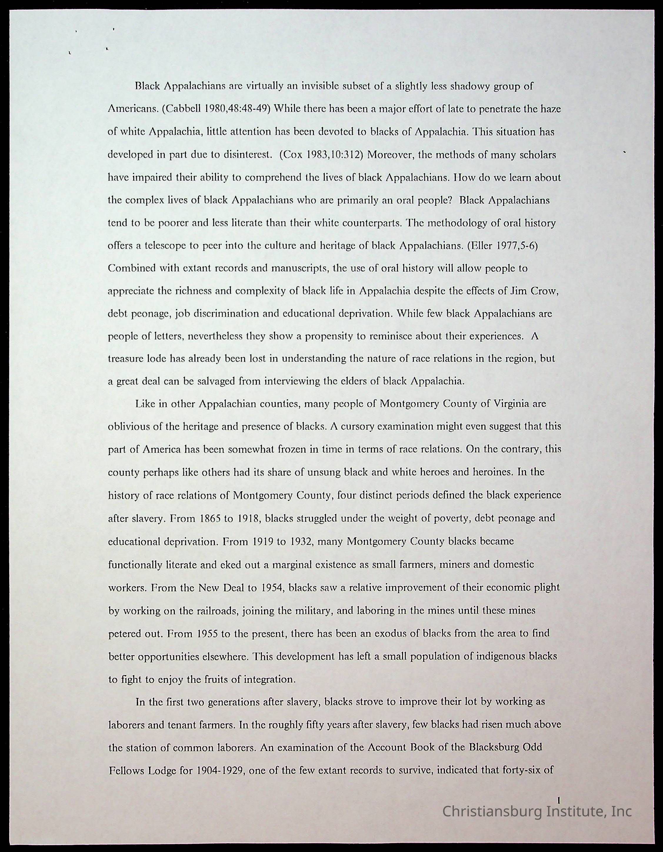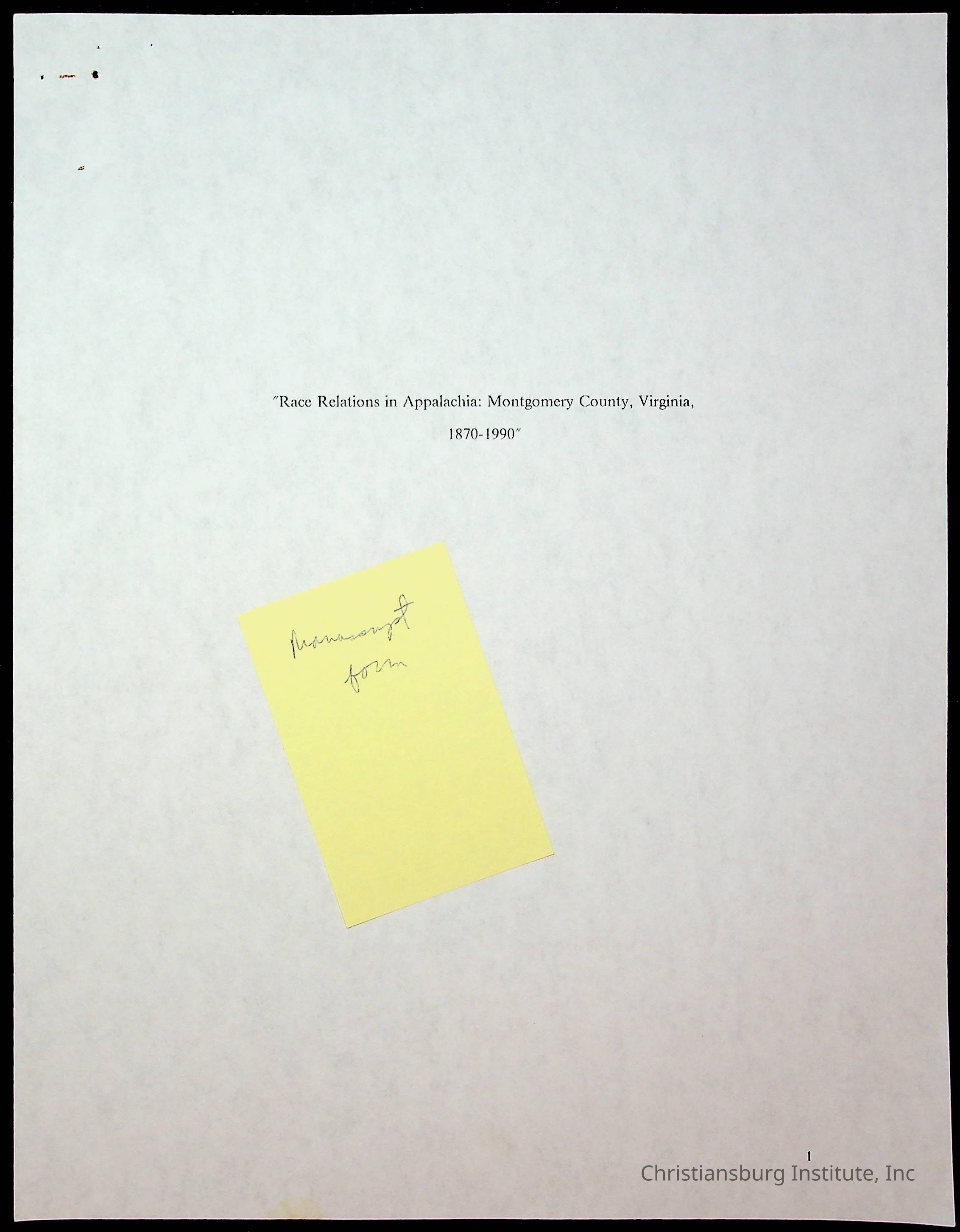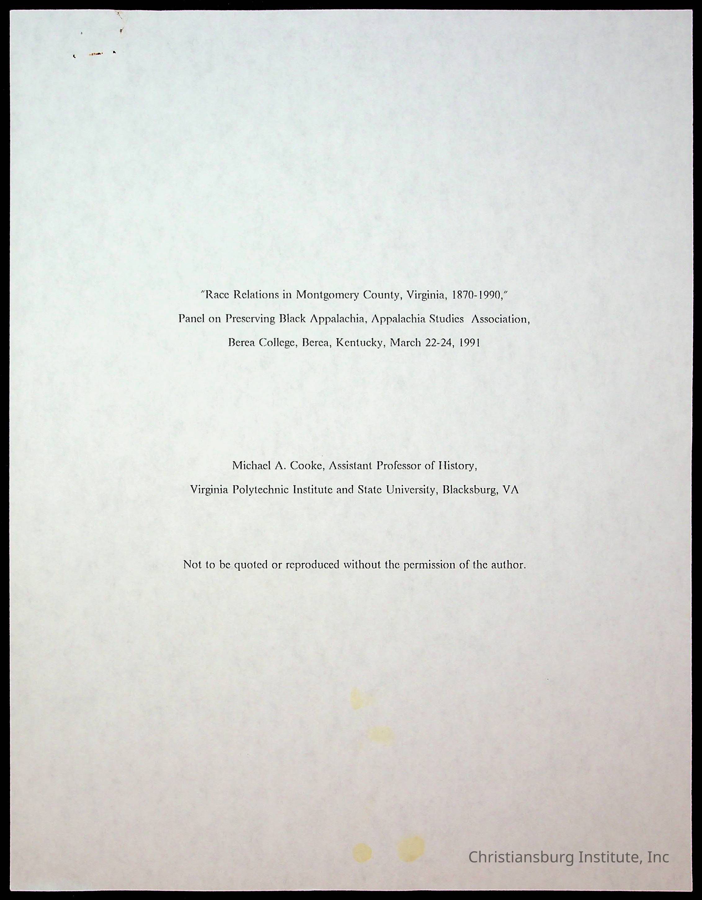 An academic paper titled 'Race Relations in Montgomery County, Virginia, 1870-1990' written by Michael A. Cooke, assistant professor of history at Virginia Tech, dated March 1991.Collection