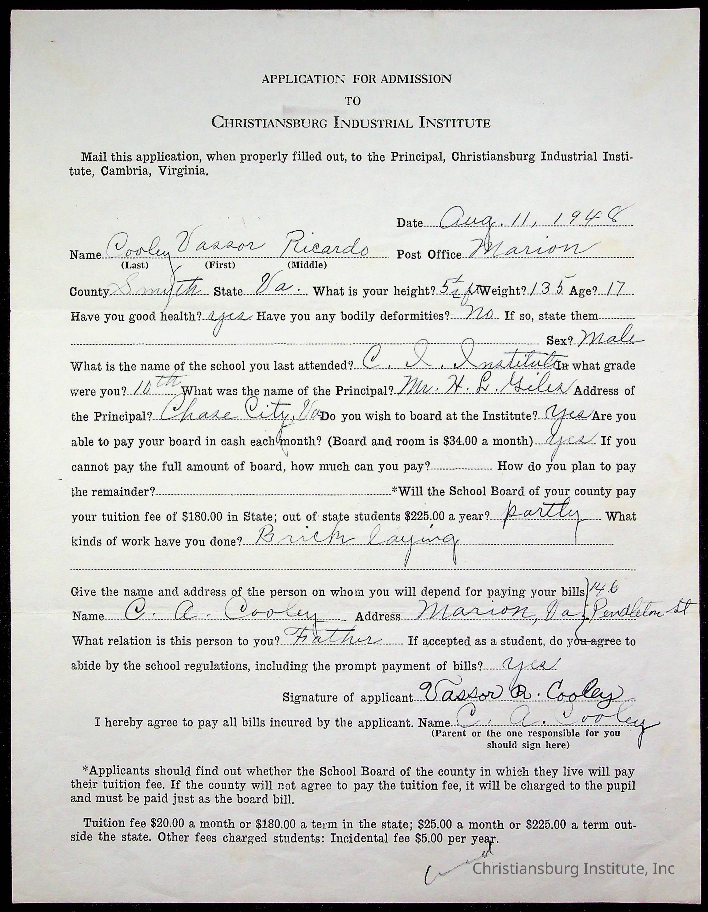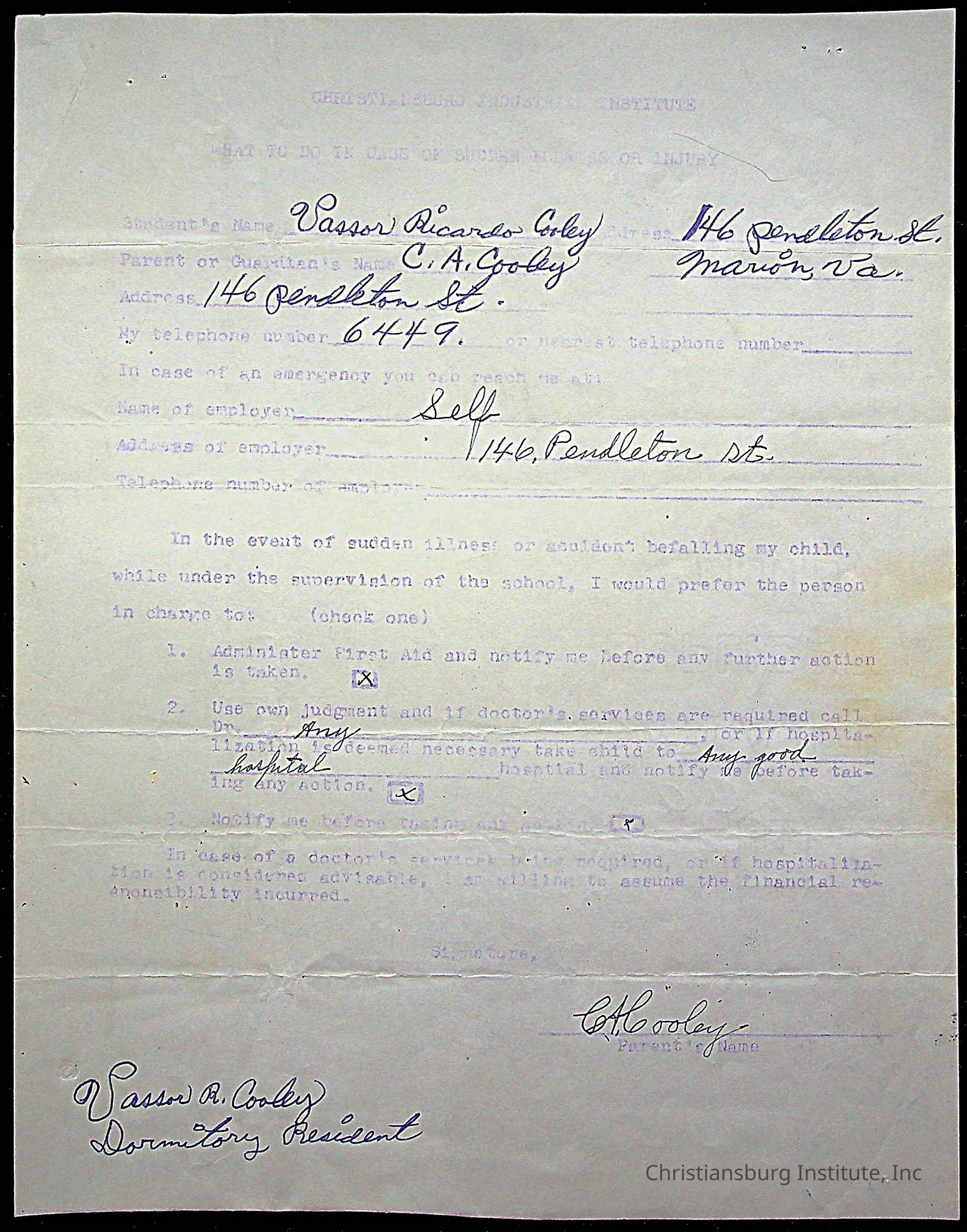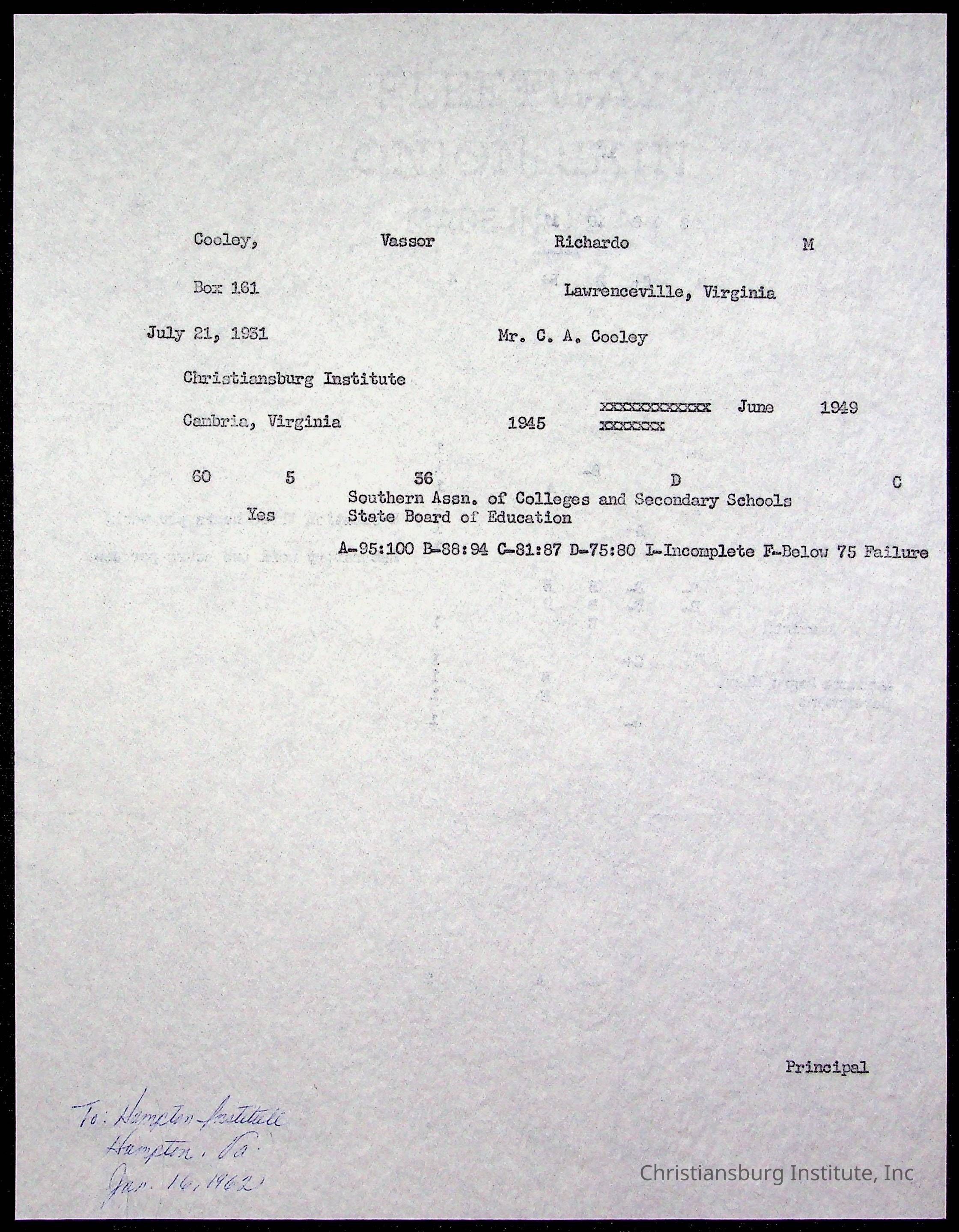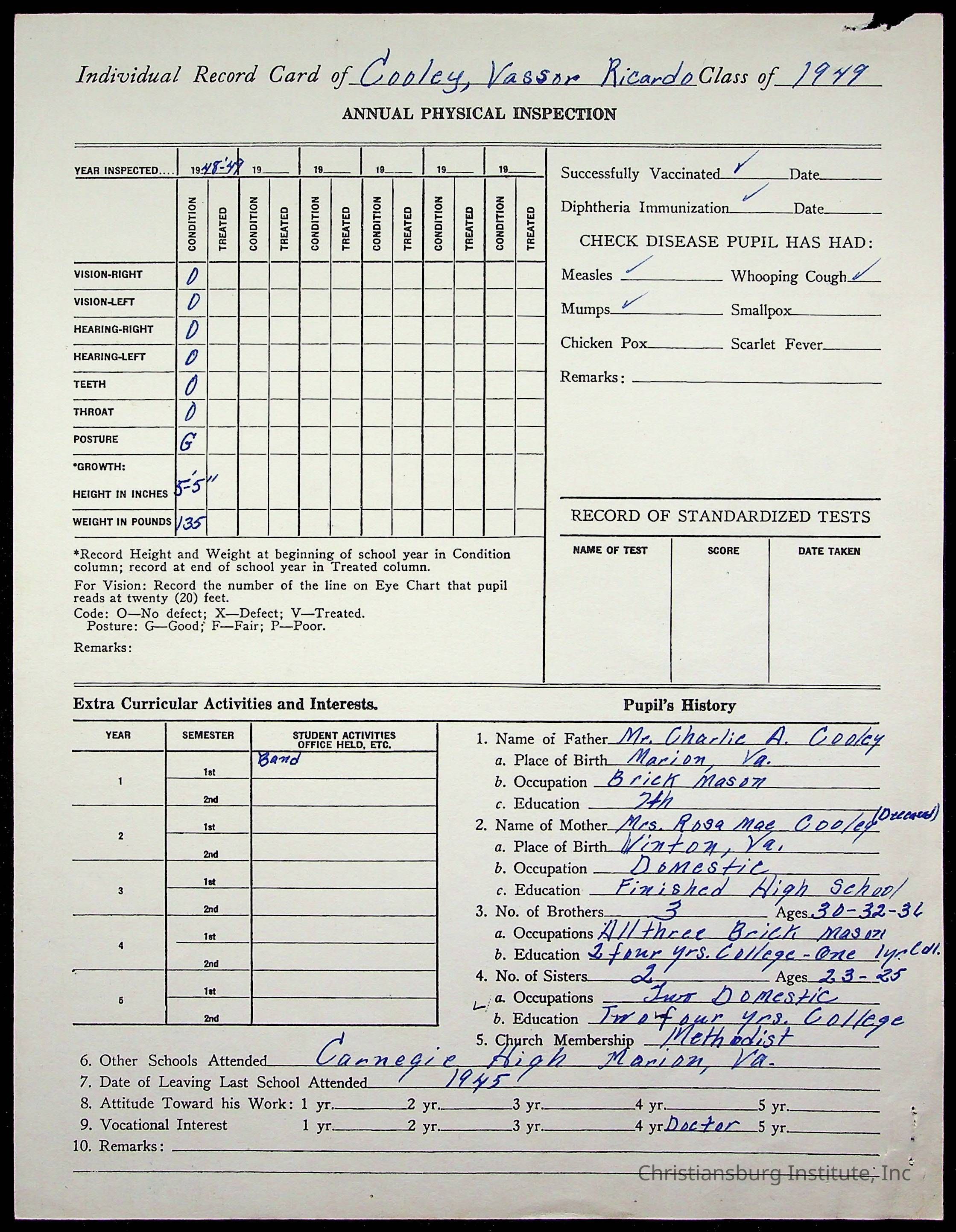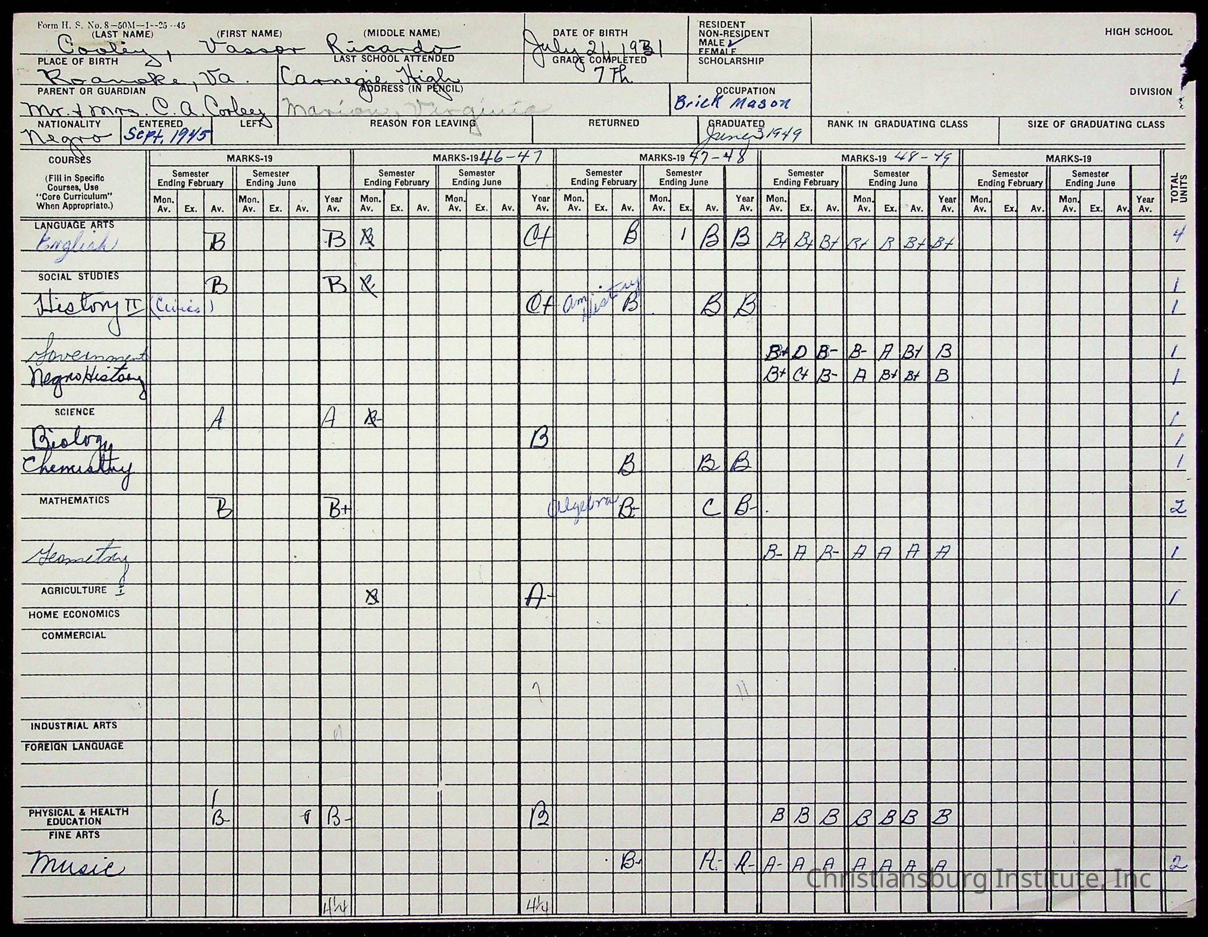The student file for the Christiansburg Institute student, Vassor R. Cooley circa 1940s.