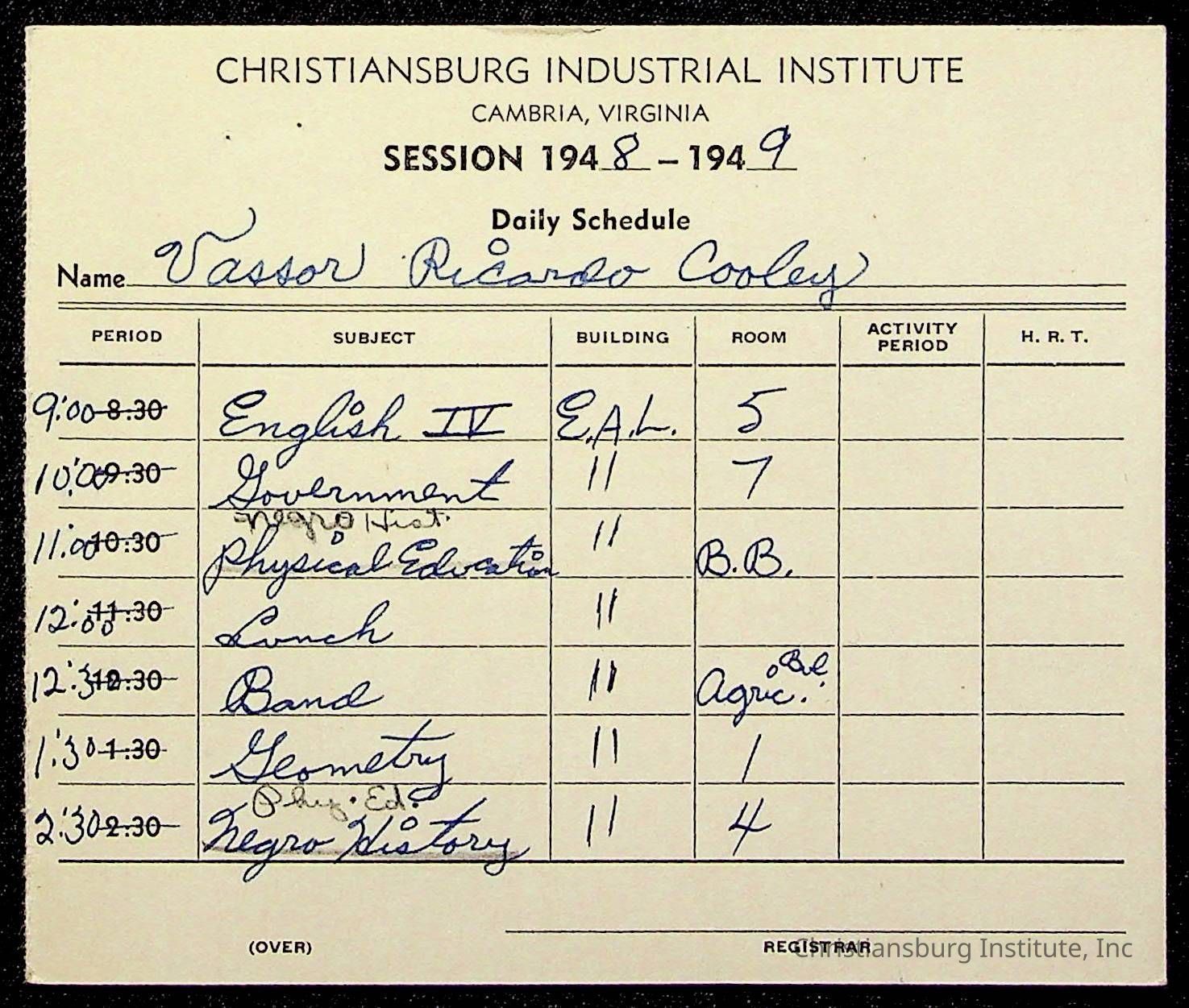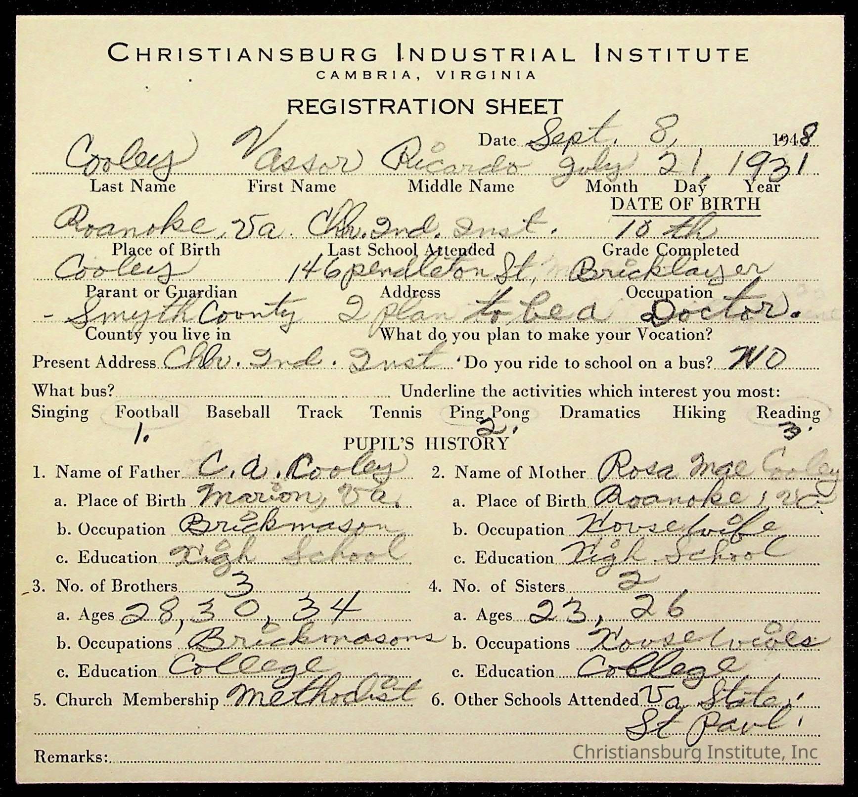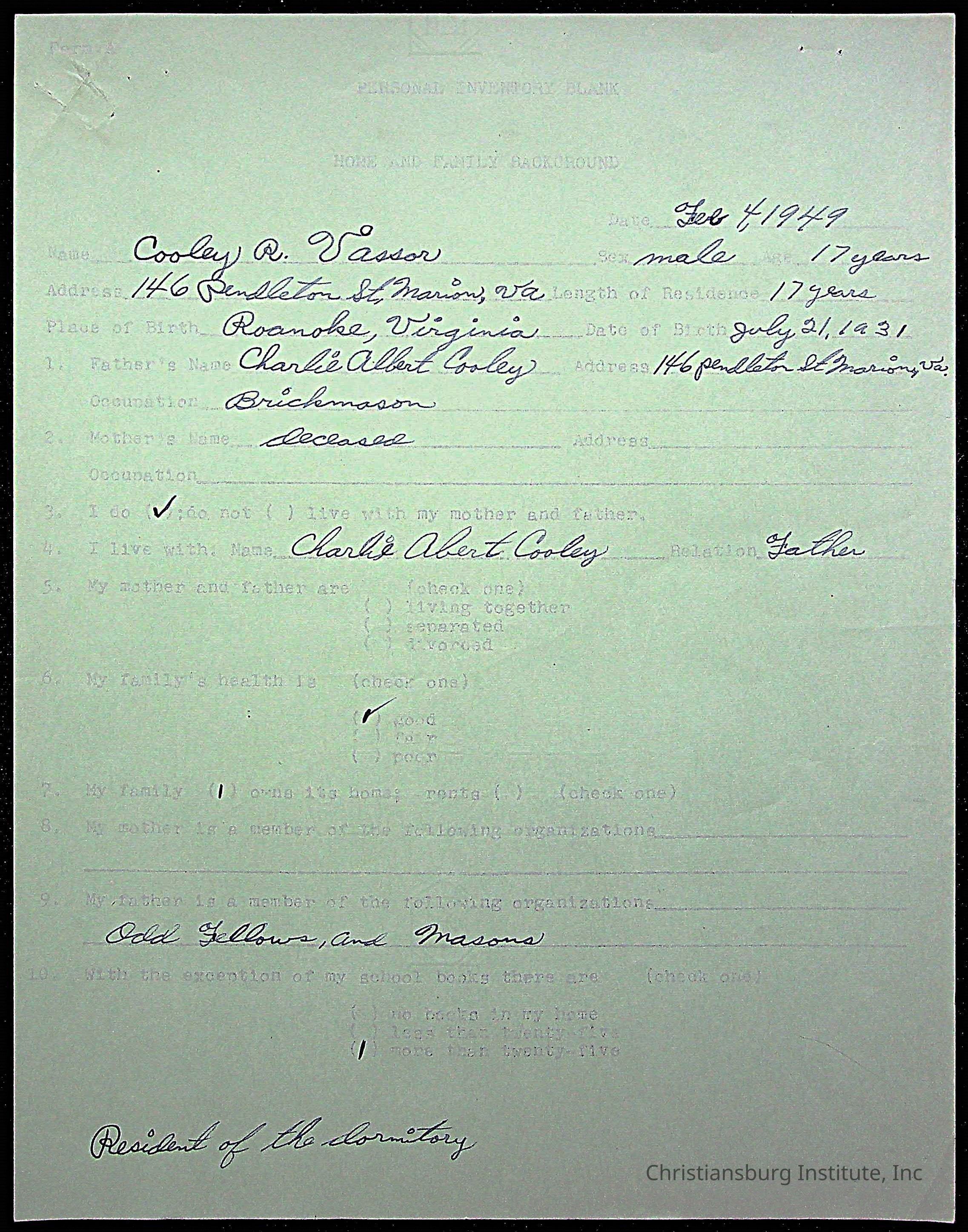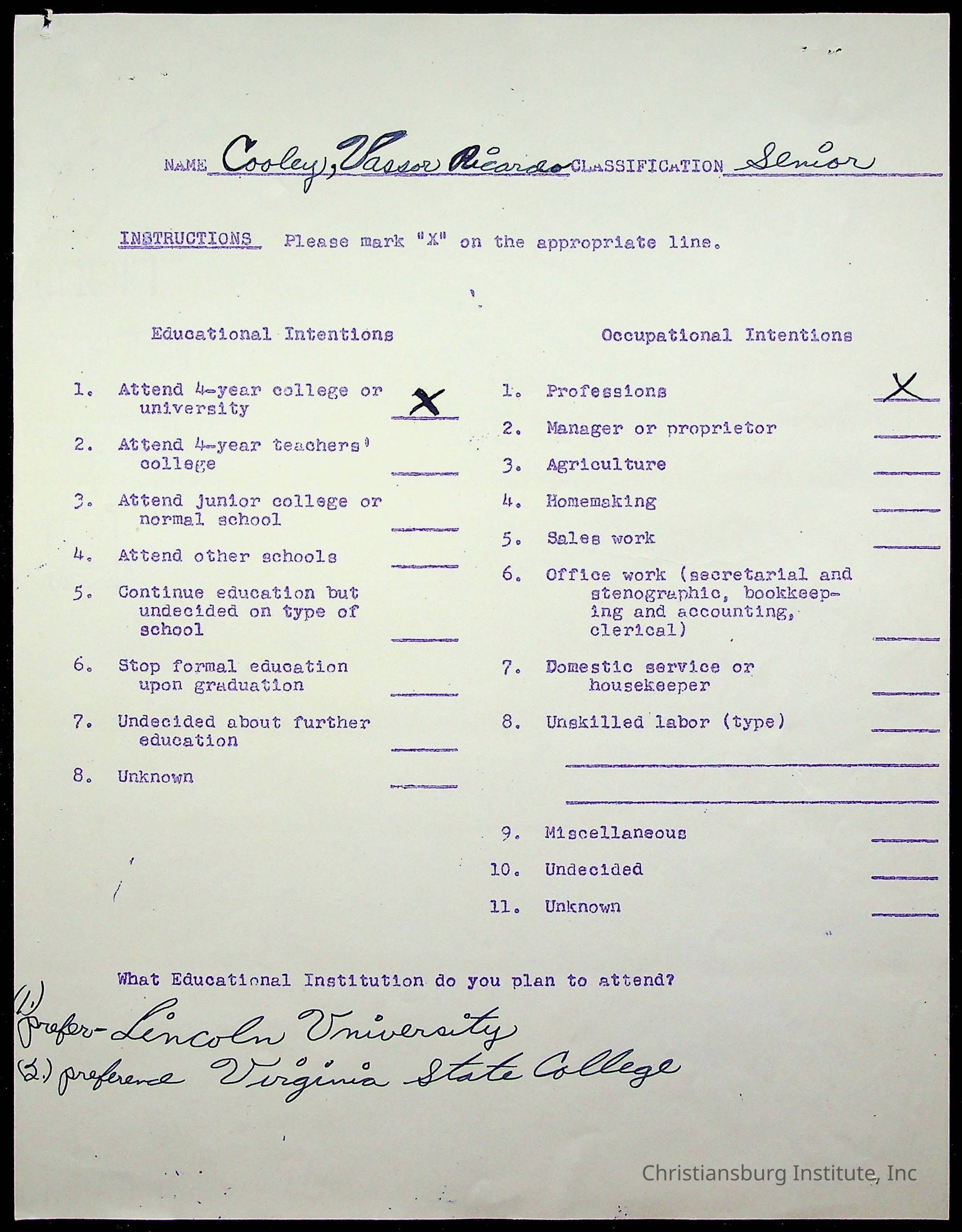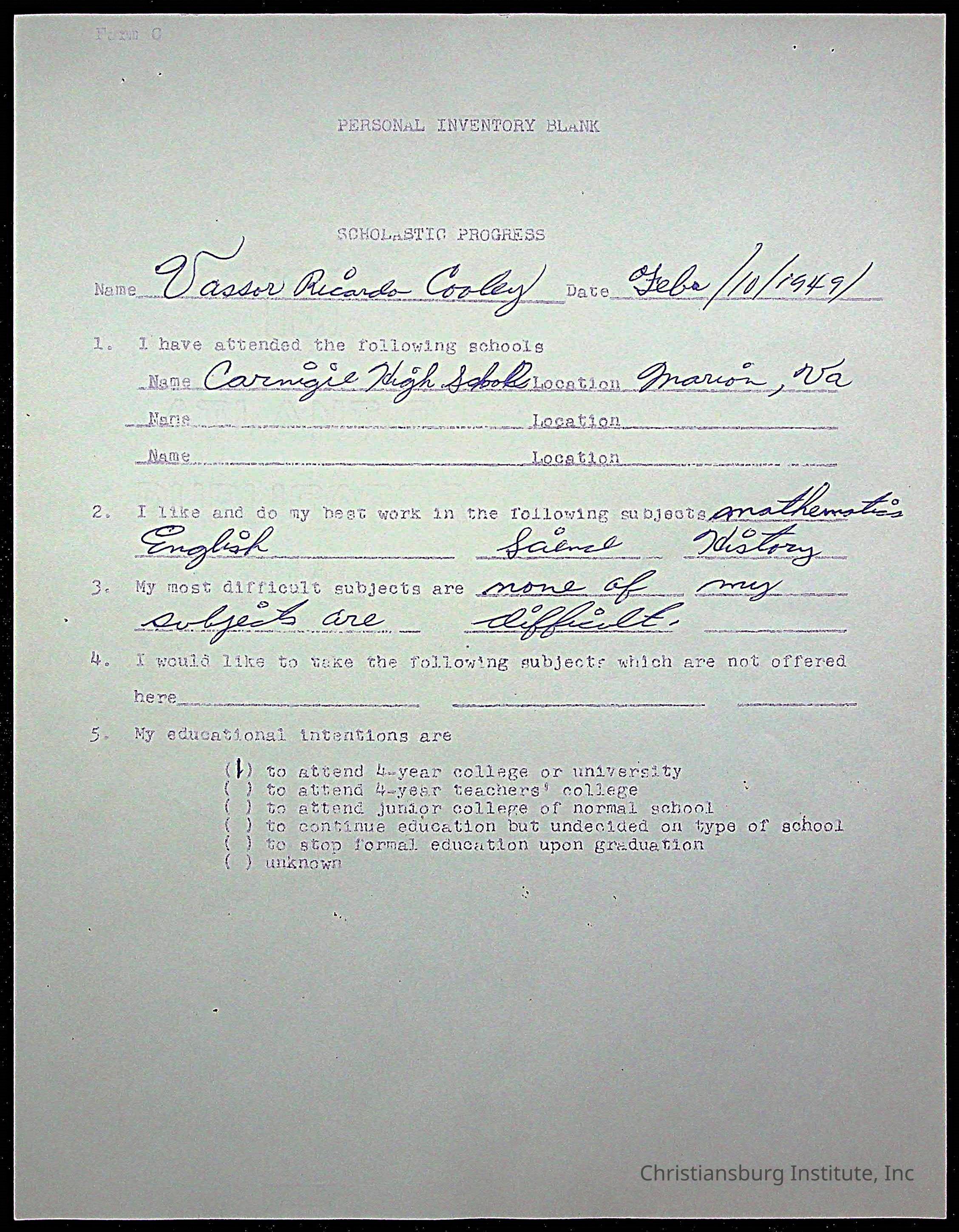 The student file for the Christiansburg Institute student, Vassor R. Cooley circa 1940s.