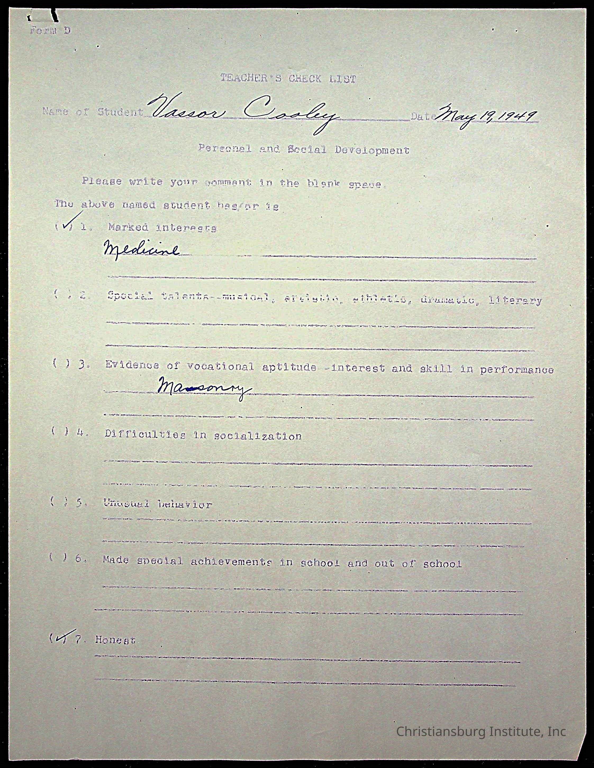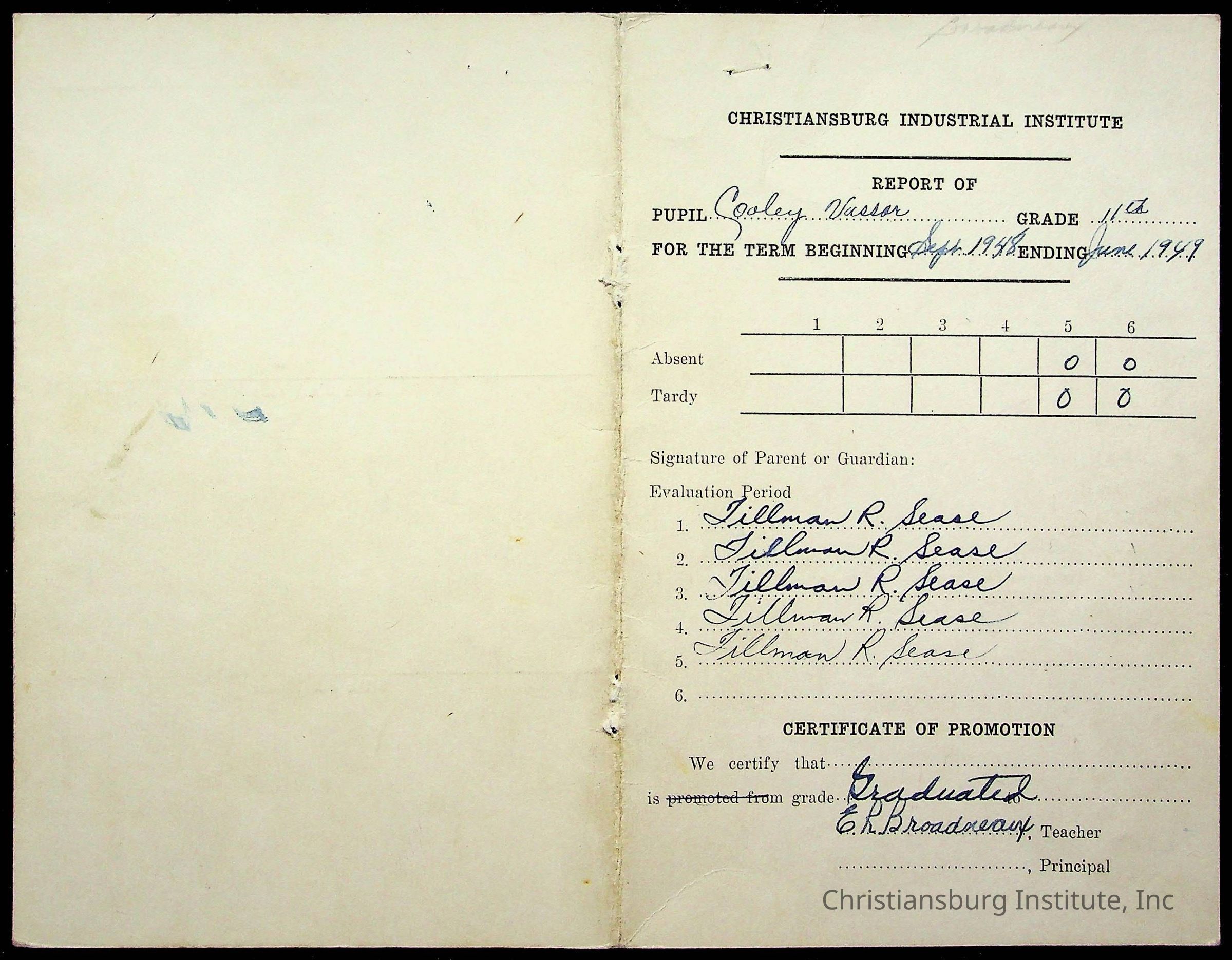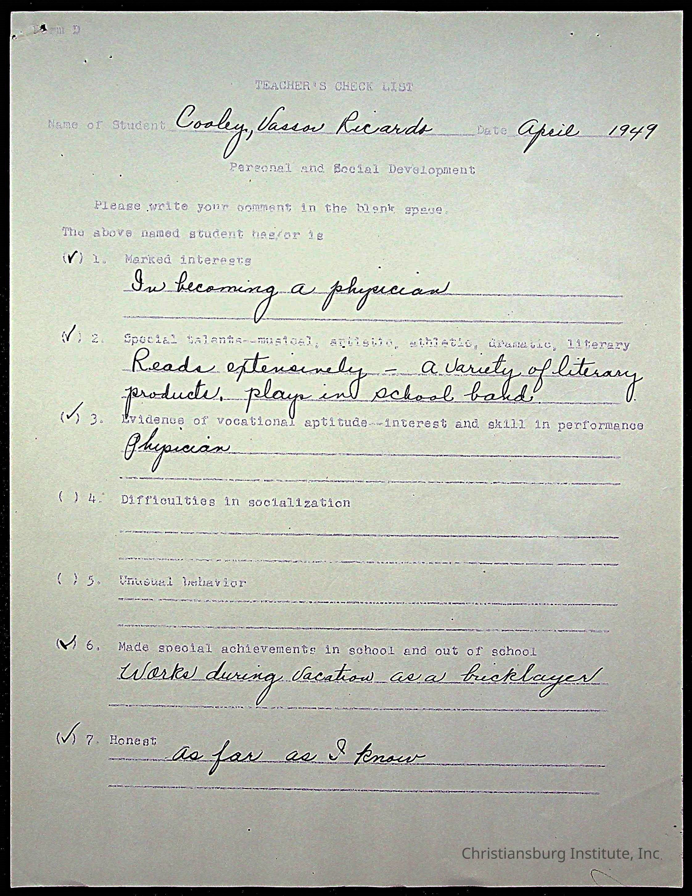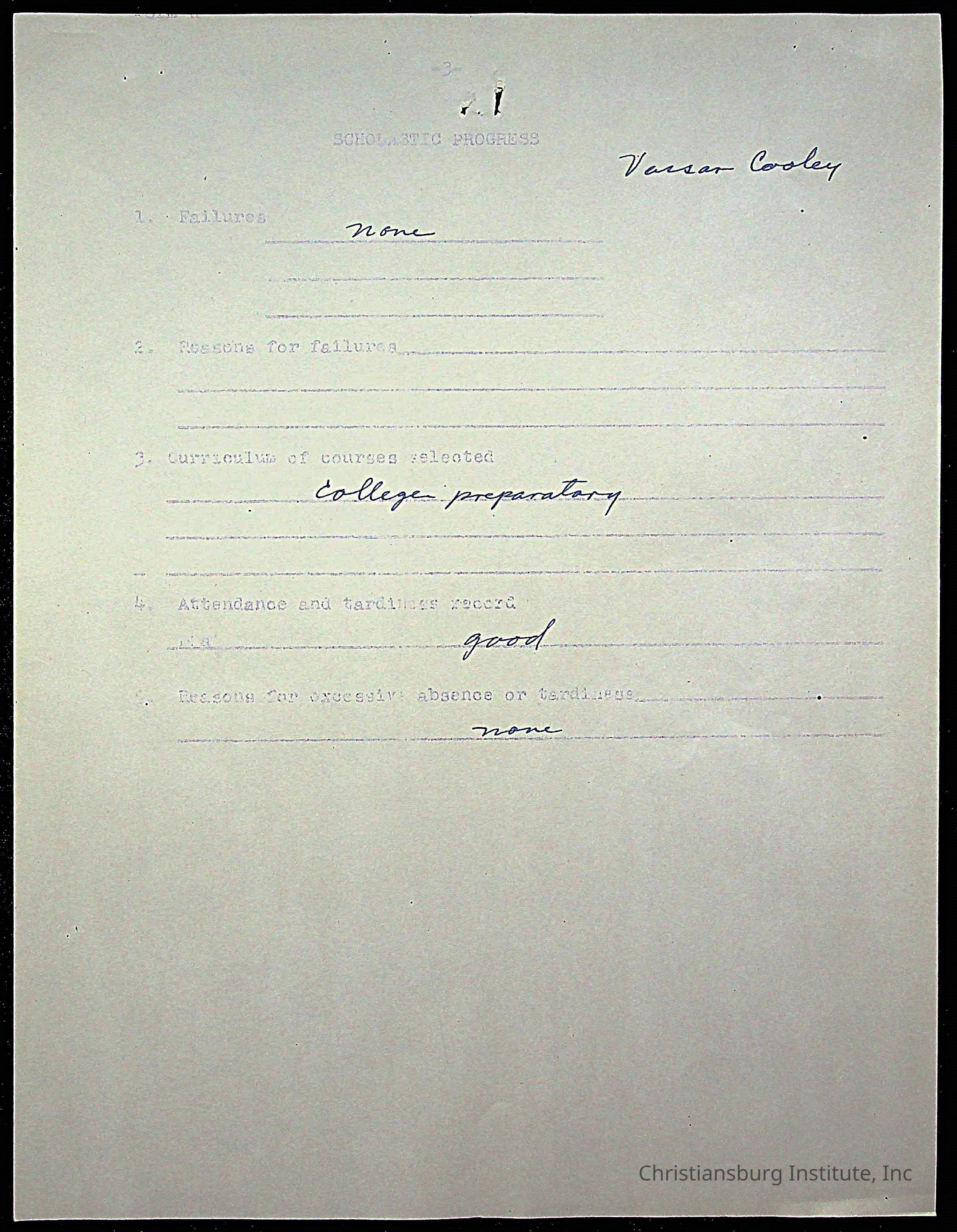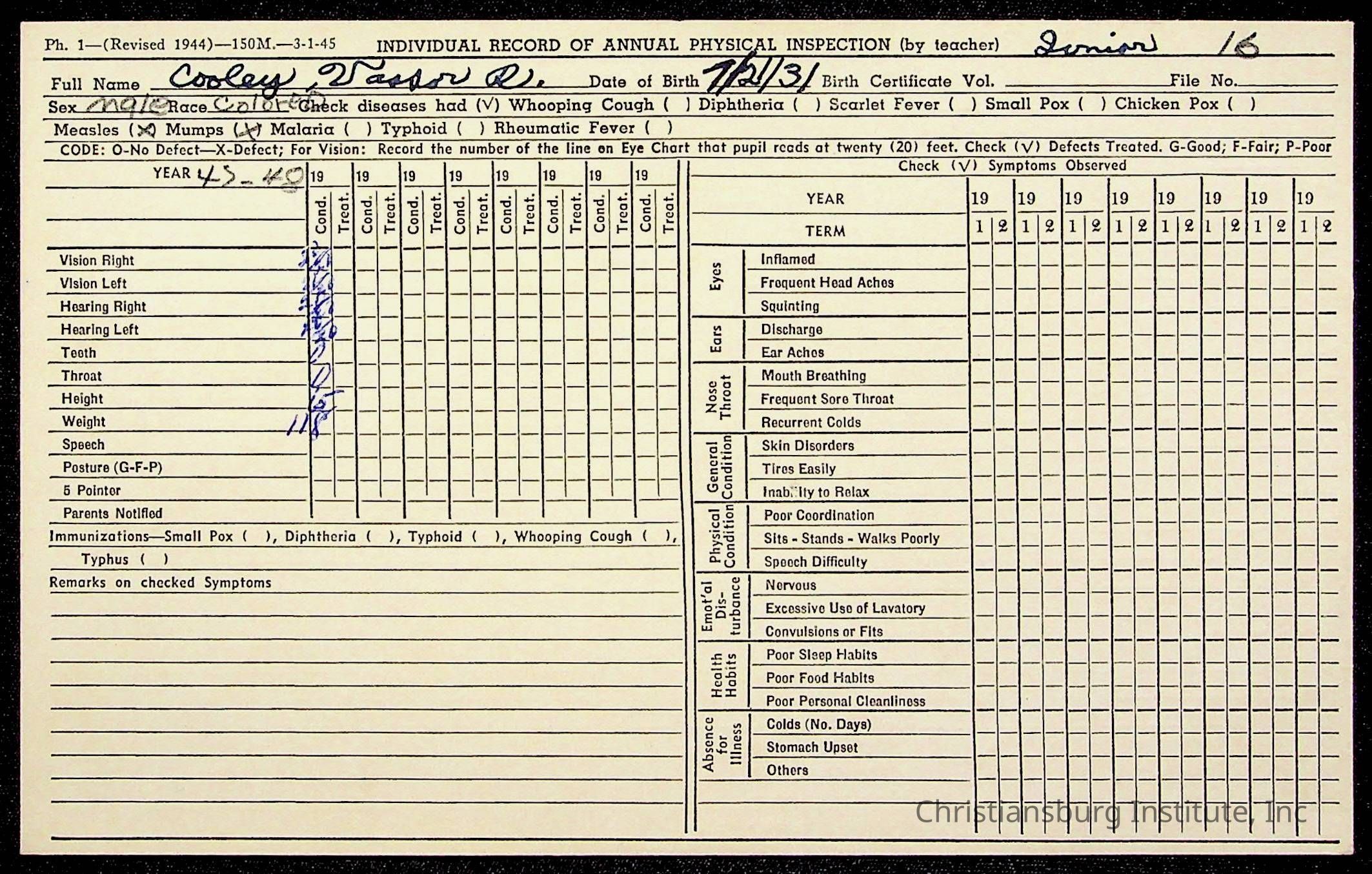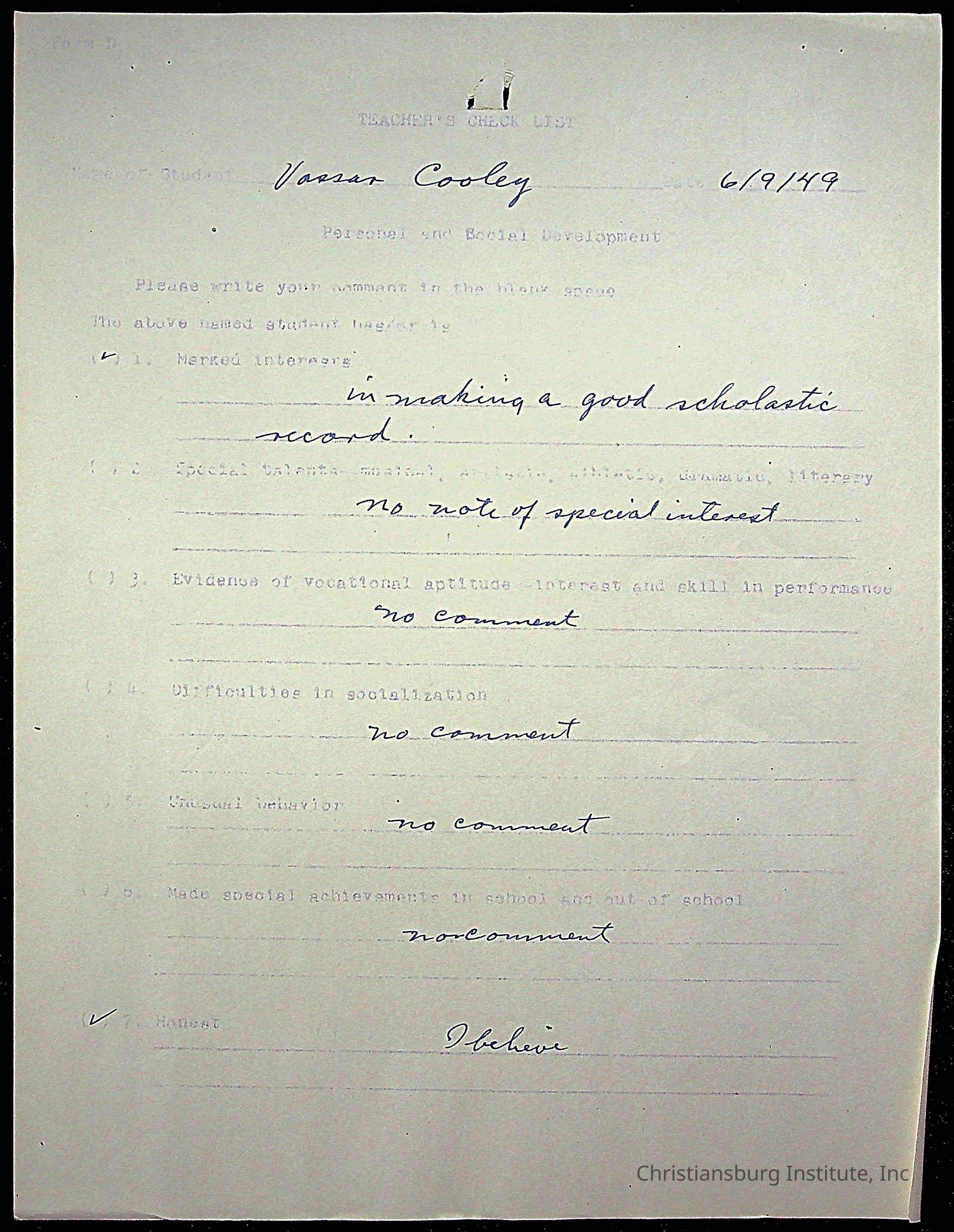 The student file for the Christiansburg Institute student, Vassor R. Cooley circa 1940s.