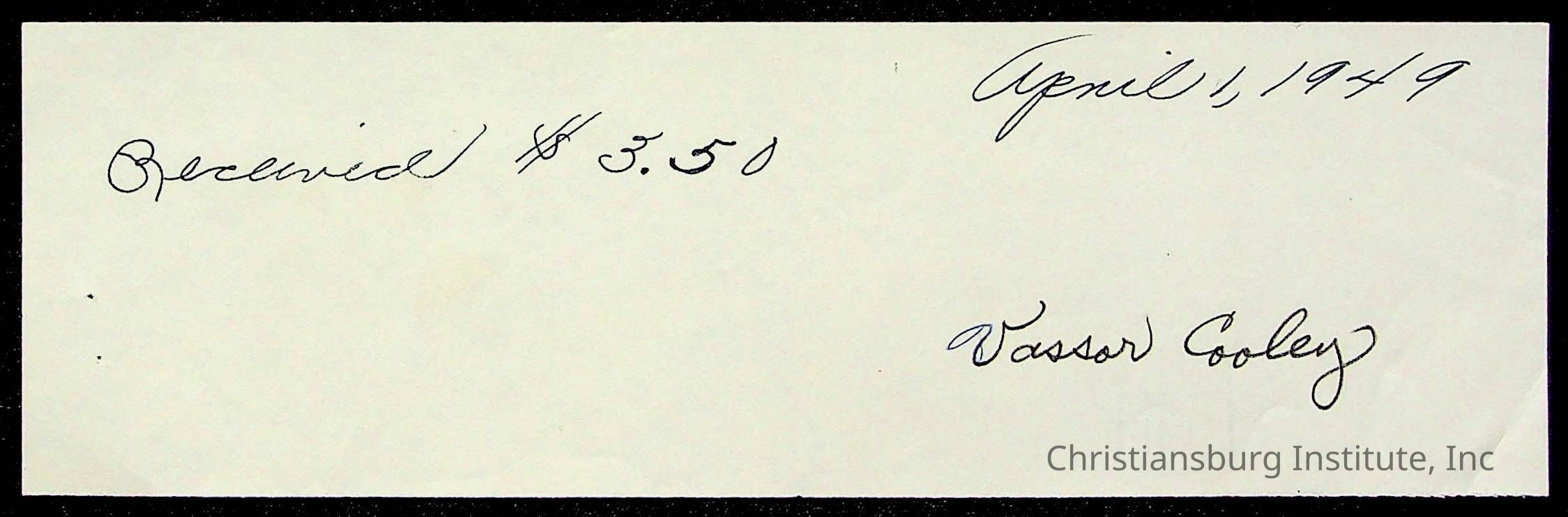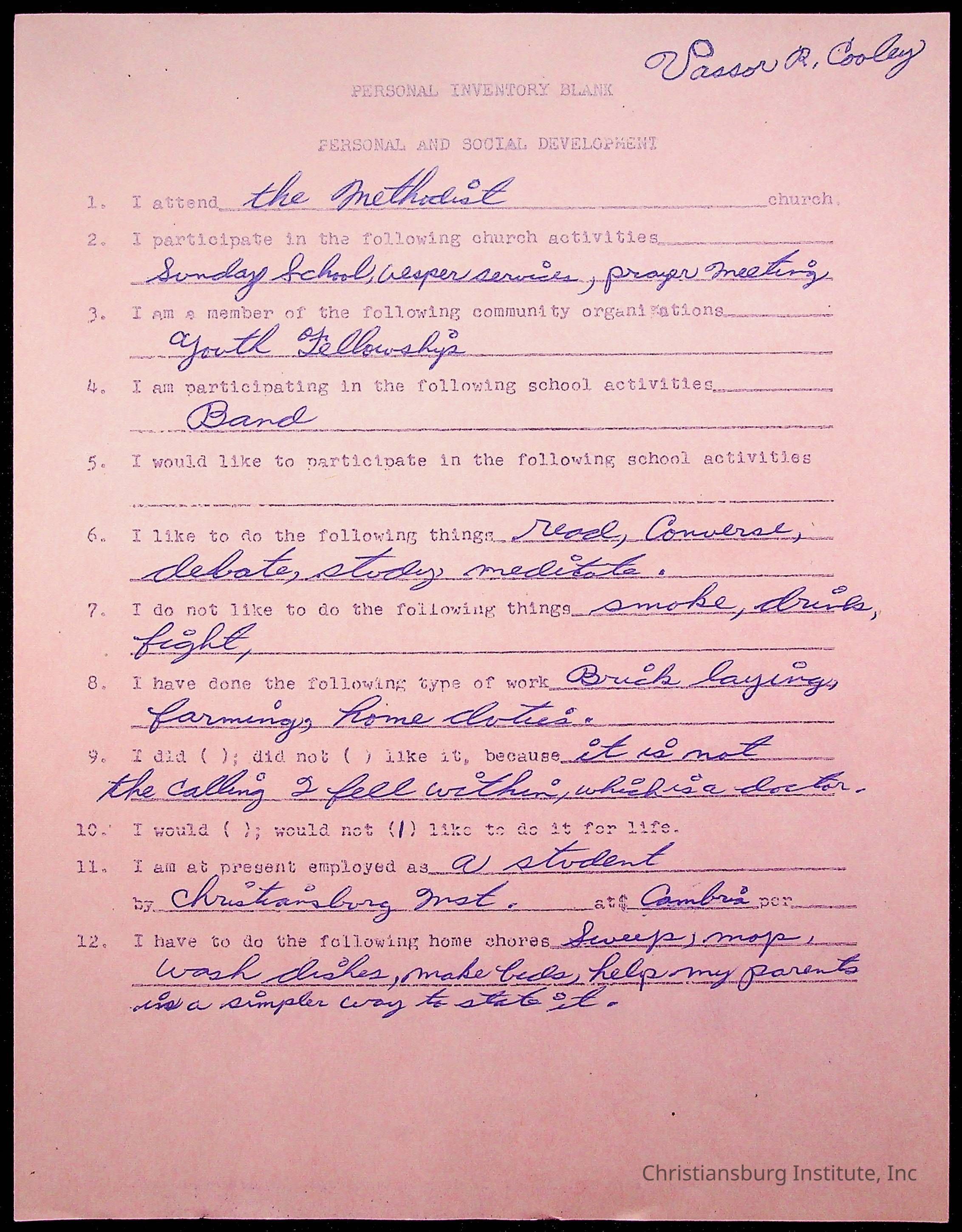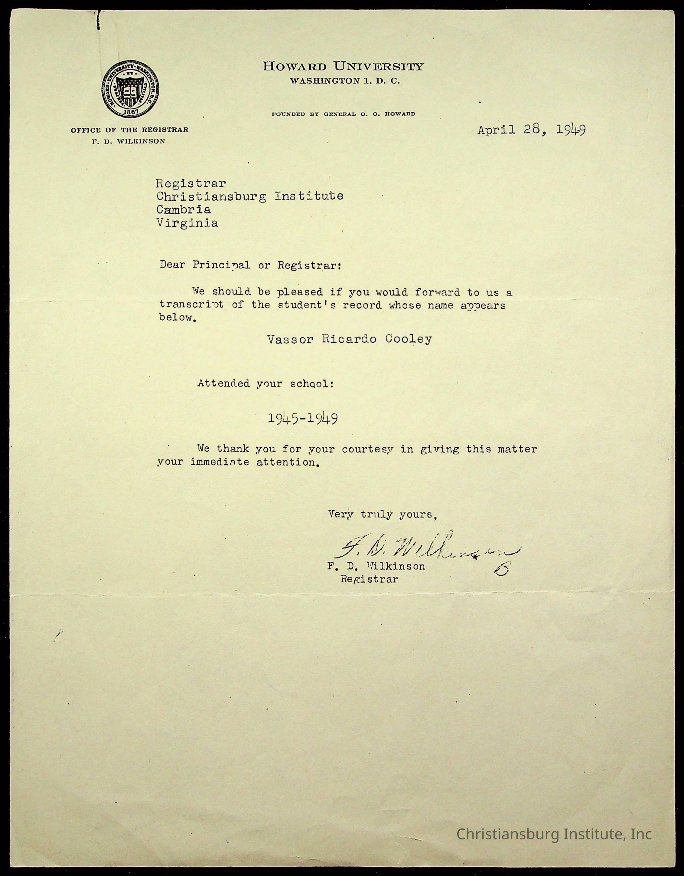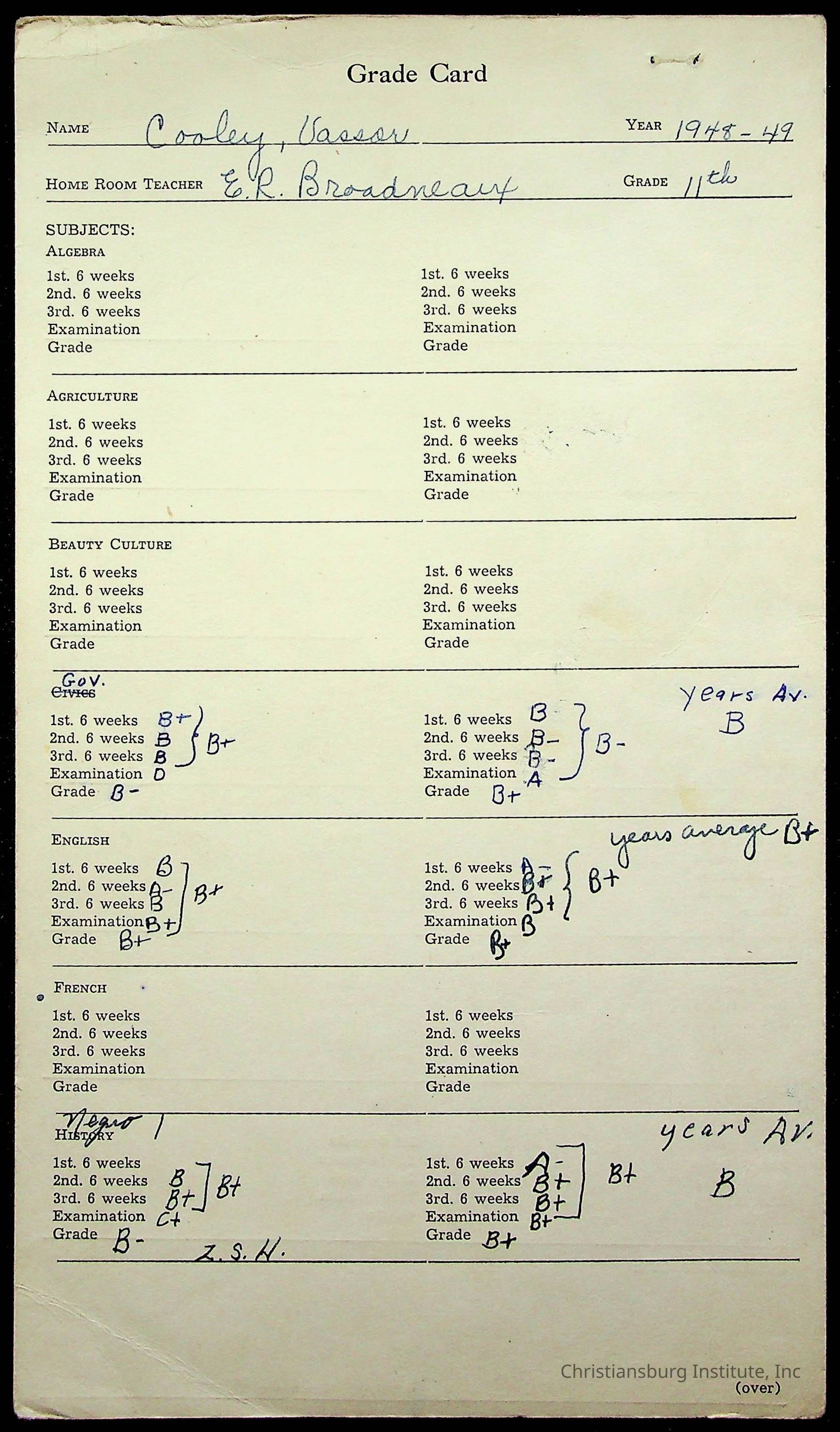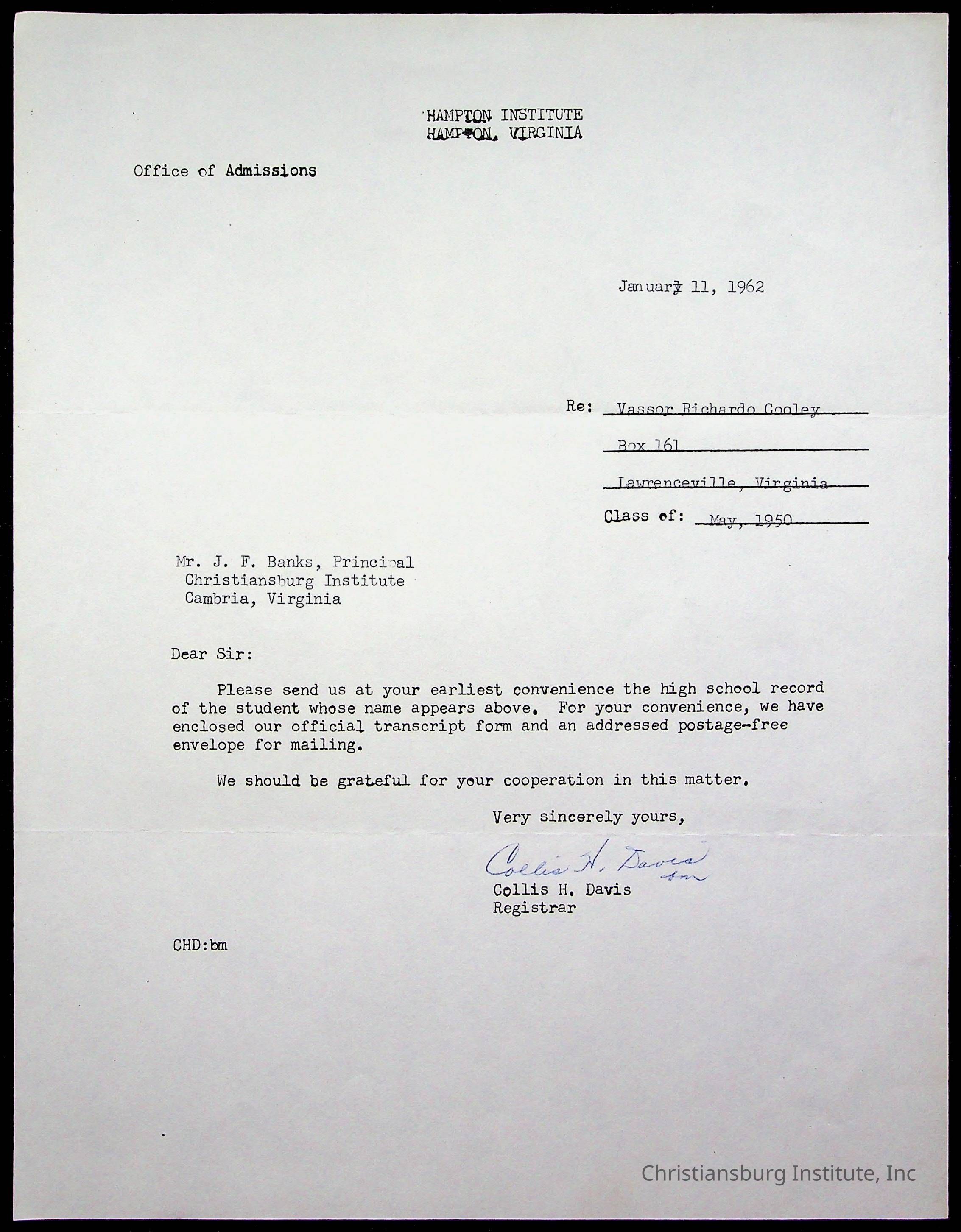 The student file for the Christiansburg Institute student, Vassor R. Cooley circa 1940s.
